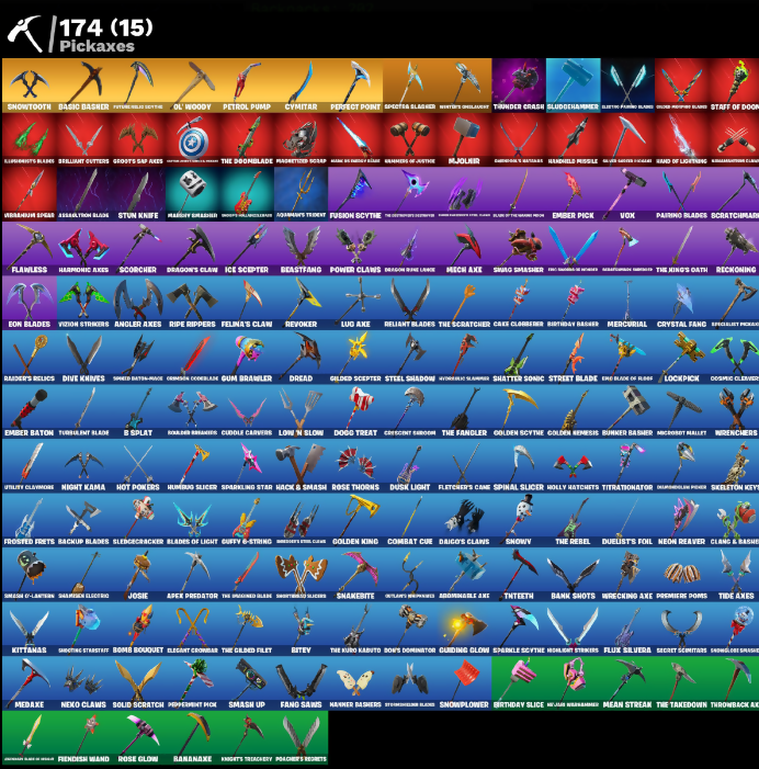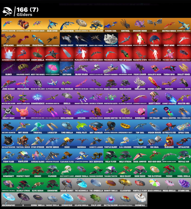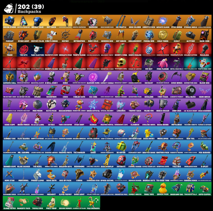 ! Declare!, (Shhitty), 10 Field Flyer, 2020, 2020 Kickflip, 8-Ball Janky, 8-Ball Vs Scratch, Abominable Axe, Adira, Adventure's Pack, Agent Peely, Air Shredder, Alpha Trophy, Altitude, Ancestral Bloom, Angler Axes, Antidote, Aperture Lake Wings, Apex Predator, Aquaman, Aquaman's Trident, Arcana, Arcane Etherglove, Arctic Adeline, Arroyo Pack, Assaultion Blade, Astronox Cyclone, Auto Clutch, Avengers Quiet, B-Ba, B-Splat, Back Board, Backup Blades, Ball Bling, Bamboozle Dodge, Banana Bomber, Banana Brigade, Bananaxe, Bank Shots, Banner Cape, Baron's Word, Base Jumper, Basecamp Bag, Basic Basher, Battle Bloom, Battle Call, Battle Prep, Battle Prep Super, Baymax Wings, Beach Umbrella, Beachcomber, Beastfang, Beep Beep, Big Haul, Birthday Basher, Birthday Cake, Birthday Slice, Bitev, Black One X-Wing, Blackbird Shield, Blackheart, Blade Bag, Blade Raven, Blades of Light, Blindside Lights, Blizzard Bomber, Blowin' Bubbles, Blowin' Up, Blue Viper, Blurred Text (could be "Express In... or something similar"), Boardwalk Board, Bobo, Boing!, Bomb Bouquet, Bombs Away!, Boogie Down, Boogin, Booty Buoy, Boss Dominator, Boss Team Leader, Boulder Breakers, Bounty Brella, Brain Freeze, Breakfast Bunny, Breaking Point, Breakneck, Brella, Brilliant Cutters, Brite Moves, Brite Raider, Bubbloon, Bullet Rider, Bunker Basher, Bunker Jonesy, Burning Crates House, Burnish Backburner, Burst Big Gumper, Cake Clobberer, Cake!, Calamity, Call Me, Camofrog Chic, Captain America's Shield, Captain Cabrinca, Captain Jones, Captain's Glider, Card Drop, Cassidy Quinn, Cat Flip, Catalyst, Catwing, Chainstick Pack, Chaos Agent, Chaos Director, Chaotic Crawler, Choiceknit, Chomp Jr, Chon, Cinder, Clang & Bashers, Classified, Clawback, Claws Retro, Clean Sweep, Cliffside Soarer, Clocky Clokabunga, Cluboo's Giftblade, Cluck Strut, Clutch, Cobra, Coin Up, Combat Cue, Combat Wreath, Comet Crasher, Competitor's The Bella, Conba, Convergence, Coral Realm Glider, Cosmic Cleaver, Covered Crusader, Crazy Eight, Crescent Swords, Crimson Codblan, Crossfire, Cryptic Coaster, Cryptic Sund-Set, Crystal Fang, Cuddle Carvers, Cuddlepool, Curved Paramite, Cyberoval Salute, Cyclo Curl, Cymtian, D The Arctic Blade, Dabstand, Dago, Daigo's Claws, Dark Chancer, Dark Side, Dark Vanguard, Dark Void, Deadpool, Deadpool's Katana, Deadpool's Katanas, Deadpool's Kneepads, Dealer's Deck, Deck Ducky, Deep Dive, Deeplend, Delirium, Demi, Diamond Throne, Diamondolm Pick, Dieselback Pack, Disassemble, Dive Knives, Dj Yonder, Do The Split, Doctor Doom, Dogg Treat, Dole Clap, Doom, Doom Brella, Doom Chalice, Doom's Cloak, Doom's Cowl, Doomlord's Blades, Door's Domain, Downpour, Downshift, Dozedar, Dozy Commander, Dragon Rider, Dragon Rune Lance, Dragon Stance, Dragon's Claw, Dragongrest, Dragonward Brella, Dread, Drone Drifter, Droop!, Duelist's Foil, Dusk Light, Dusk Wings, Dying Light, Dynamo Doggy-Built, Dynamo Tntina, ELF Blade of Ross, Eagle's Form, Eclipse Brella, Edilithon's Qualder, Electro Plasma Lance, Elegant Crowbar, Elite Servo, Ember, Ember Baton, Ember Pick, Emergency Raft, Emma Frost, Eon Blades, Equalizer, Eternal Banner, Eternal Knight, Eternal Shield, Eternal Voyager, Evie, Excaliforge Sword, Expedition Bag, Fable, Fabled Cape, Fade, Fancy Footwork, Fang Saws, Featherweight, Felina, Felina's Claw, Feline Dagger, Feline Fun, Field Flyer, Fiendish Wand, Fierce!, Fire Show, Fireworks Salvo, Fishstick Janey, Fishy Flier, Fist Bump, Fist of Doom, Fixer, Fizz-ical Gamma, Flapjack Flyer, Flawless, Fletcher Kane, Fletcher's Cane, Flippin' Away, Flux Silvera, Focused, Foil Flex, Foreman Doomjin, Fortilla Flier, Founder's Glider, Founder's Umbrella, Free Flow, Frostburn, Frosted Frets, Full Tilt, Fusion, Fusion Coil, Fusion Orb, Fusion Scythe, Gas Up Pack, Gathering Storm, Gentleman's Dab, Get Funky, Get Griddy, Get Lost, Ghost King Cape, Ghostfly's Cloakwing, Giddy-Up, Giga Sword Pickaxe, Gilded Scepter, Given-Step, Glided Mongoose Blade, Glidrurr, Go Bag, Godmother's Trophy, Godzilla's Old Spine, Gold Brutus, Gold Dagger Pack, Gold Midas, Gold Token, Golden King, Golden Nemesis, Golden Scythe, Gorilla Grodd, Grand Salute, Griffin's Talon, Grind, Groot, Groots Sap Axes, Guff-E-String, Guffy & String, Guiding Glow, Gum Brawler, Gwenpool, HK Sky Net Uplink, Hack & Smash, Hallowed Strikers, Hammers of Justice, Hand of Lightning, Handheld Missile, Hanner Bashers, Har-Har-Har!, Harmonic Axes, Hawkeye's Cloak, Hellfire Dance, Hello Friend, Hench Hauler, Herald's Star, Hero Baymax, High Caliber, High Five, High Strafe Ramp, Hog Society Glider, Holiday Boxt, Holly Hatchets, Holographic, Hoop Master, Hope, Hope Star, Horse's War Wheel, Hot Pokers, Hot Wings, Hula Boombay, Humbug Slicer, Hunter's Gridiron, Hunter's Revelade, Hybrid, Hydraulic Slammer, Hyena's Catpaw, I'm A Mystery, Ice Cube, Ice Gobzilla Strike, Ice Mantle, Ice Scepter, Ignition Pack, Illusion Rune, Indiana Jones, Infinite Bloom, Introducing..., Invisible Cut, Iron Man Backplate, It Is Finished, It's Chemistry!, It's Go Time!, It's...?, Jade, Jaywalking, Jennifer Walters, Jet Signals, Josie, Joss, Journey Vs Hazard, Jubilation, Jules, Jump Jets, Jun-Hwan, Junk Bucket, Junker Brella, Kata-Pack, Keep It Hello, Kendo, Keyed Up, Kit, Kittanas, Knife Sharpener, Knight's Treachery, Kobaga, Krisabelle, Lady Rags, Legend's Monkey, Lemacodon Express, Lil Slurp, Lil' Battle Robot, Lil' Black Heart, Lil' Longboat, Lil' Prancer, Lina Scorcha, Load Saber's Bag, Lockpick, Lockstep, Lone Wolf Holster, Low N' Slow, Lowcost, Lt. Evergreen, Lug Axe, Lullghost's Blades, Lunarios, Luxe, Lynx, M.O. Cruiser, Mach as Mercy Blade, Madshy Smasher, Magnetic Steps, Magnetized Scrap, Magneto's Cape, Majolnir's Path, Make A Seat, Make No Light Pack, Malik, Mancake, Mandalorian, Mask of Balance, Master Key, Master Mix, Master Portal, Masterbrand Blades, Mave, Mean Streak, Mech Axe, Medaxe, Media-Brella, Megabot, Megalo Don, Megalopak, Meowscles, Meowsdas, Mercurial, Messenger's Gift Class, Metal Gear Pal, Metal Lady Ag