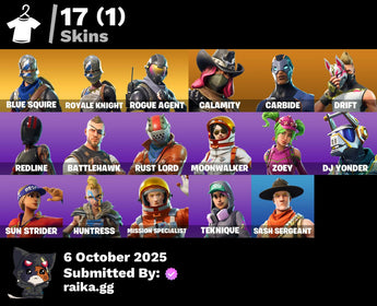 [PC/PSN/XBOX] 17 skins | Blue Squire | Royale Knight | Rogue Agent | Calamity | Carbide | Drift | Redline | Battlehawk | Rust Lord | Moonwalker | Zoey | 150 VB / FN