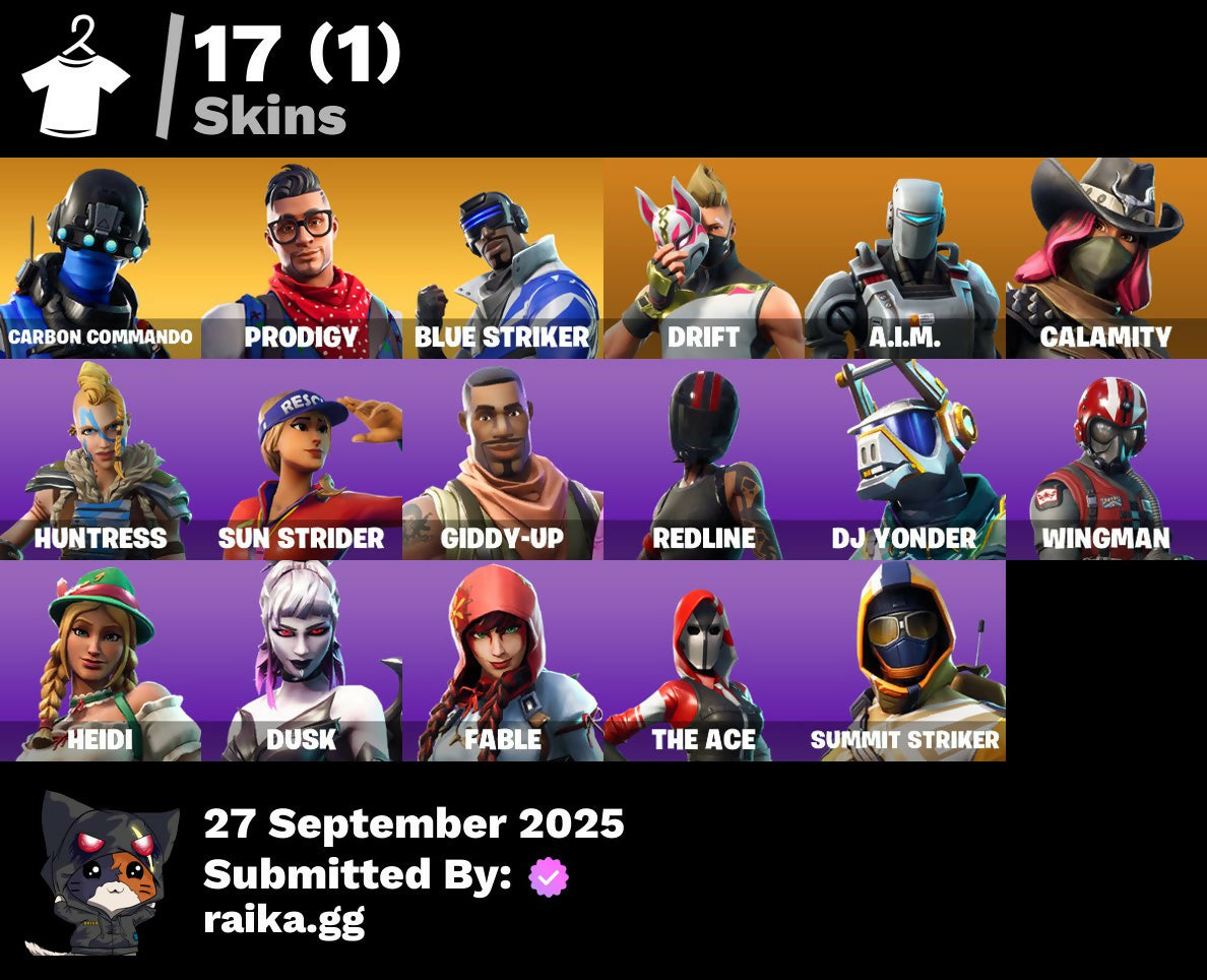 [PC/PSN/XBOX] 17 skins | Carbon Commando | Prodigy | Blue Striker | Drift | A.I.M. | Calamity | Huntress | Sun Strider | Giddy-up | Redline | DJ Yonder | 600 VB / FN