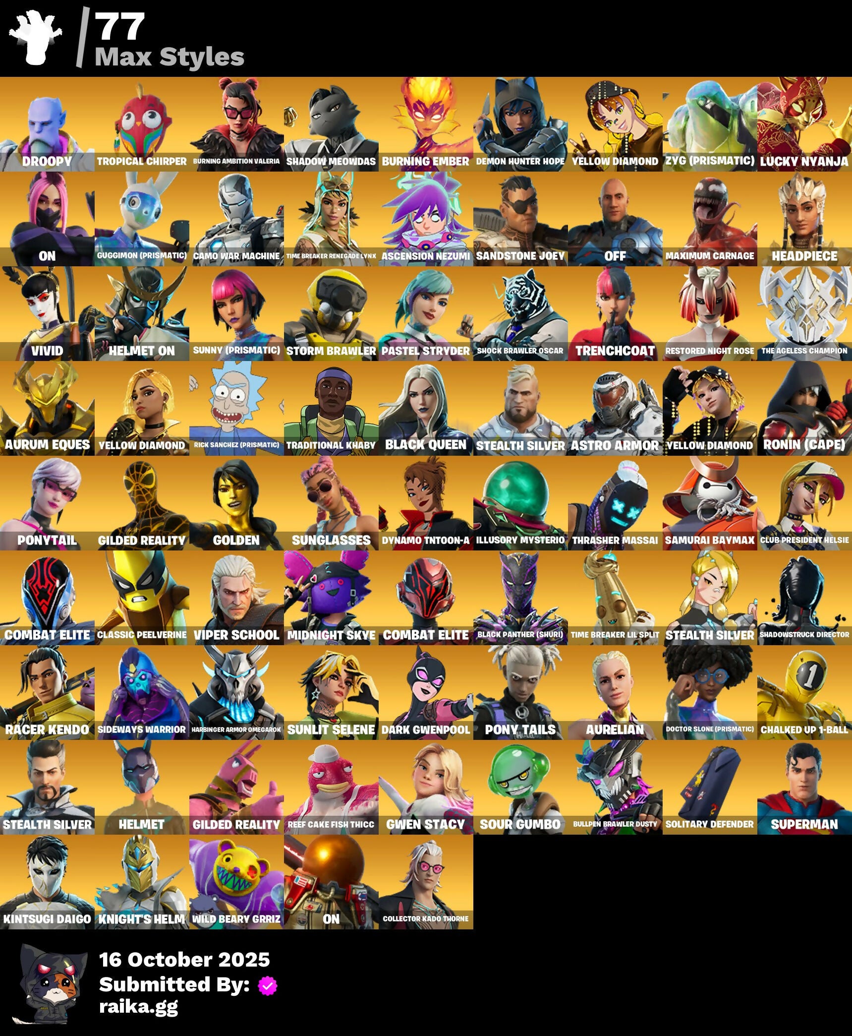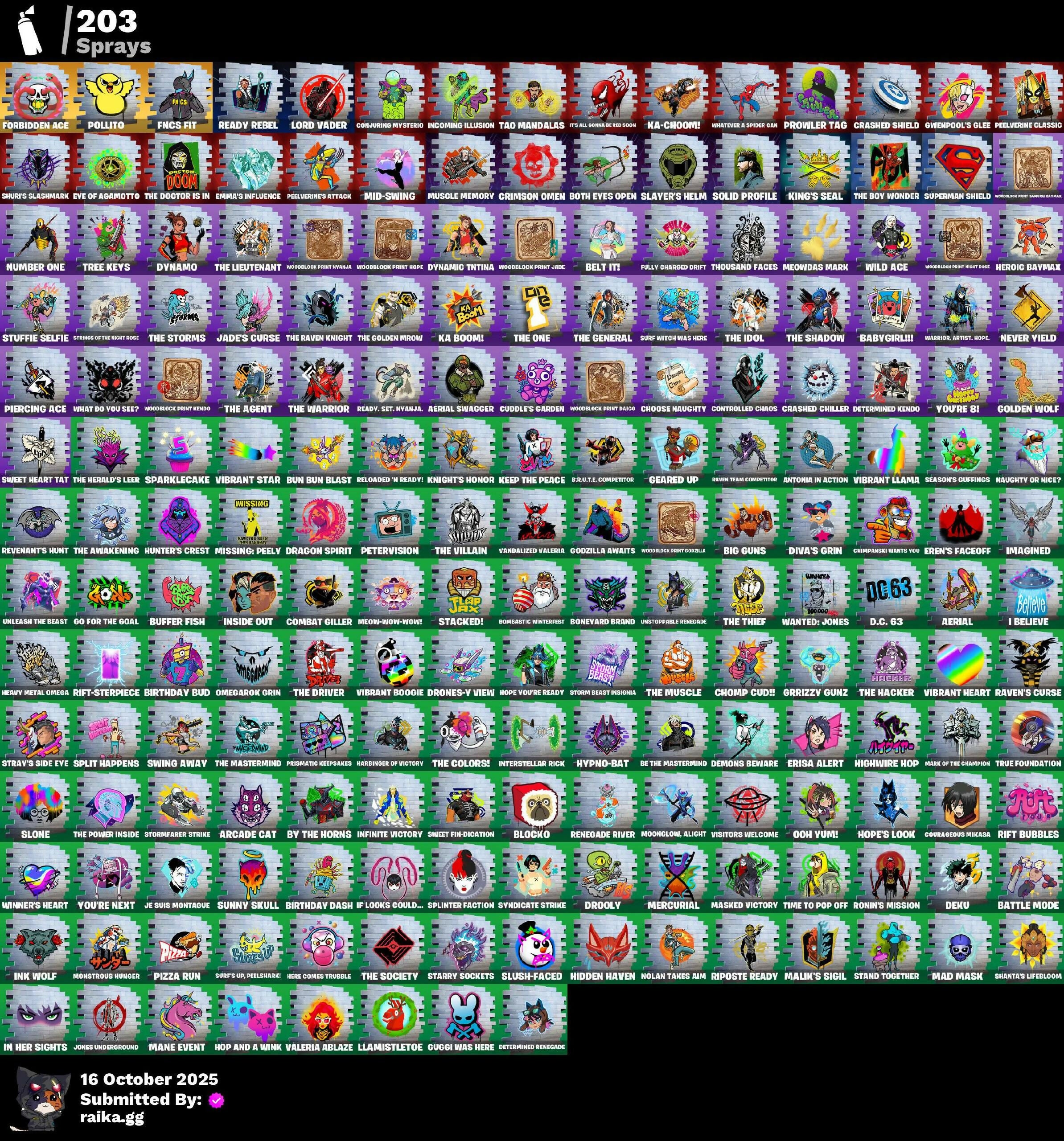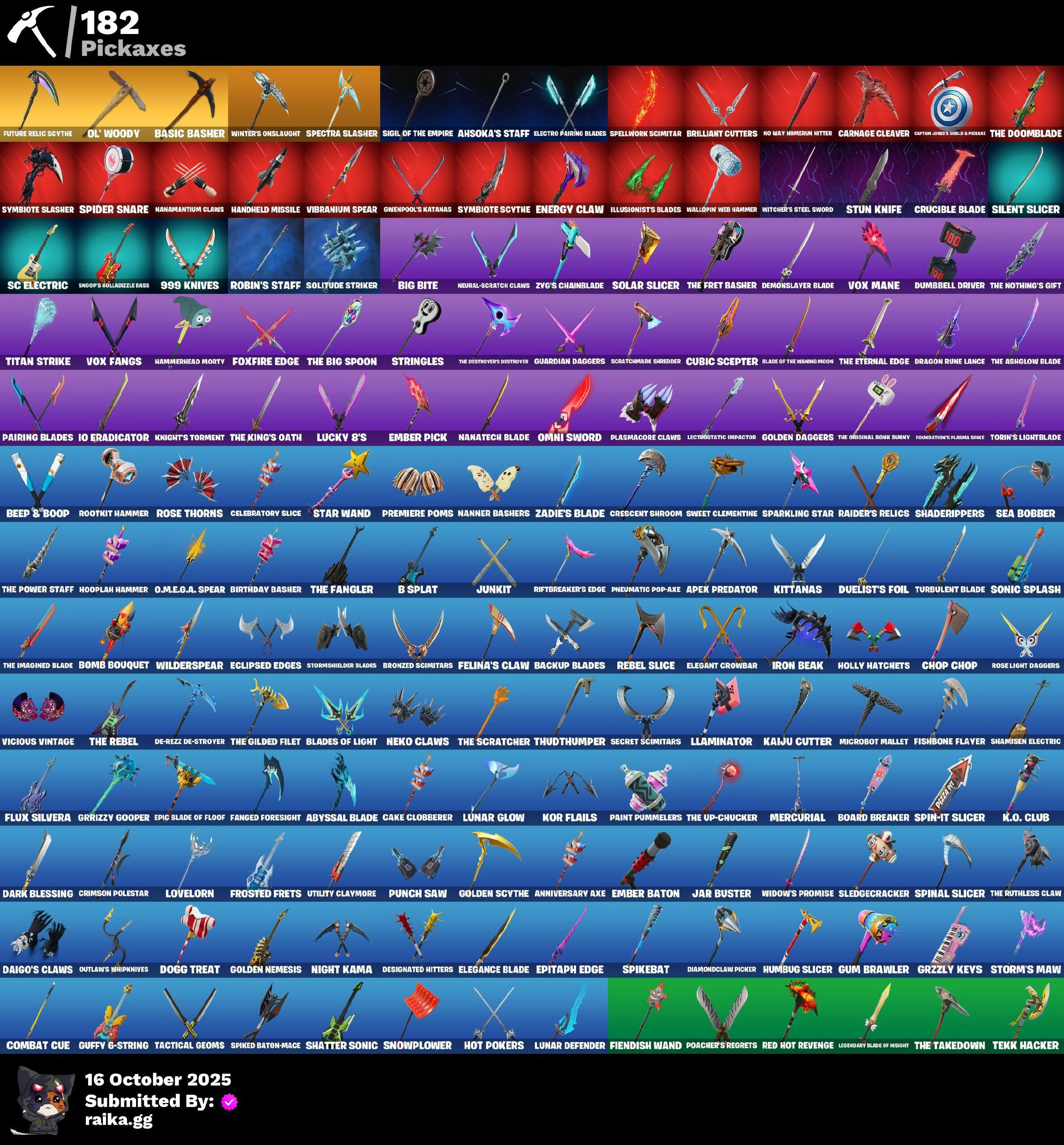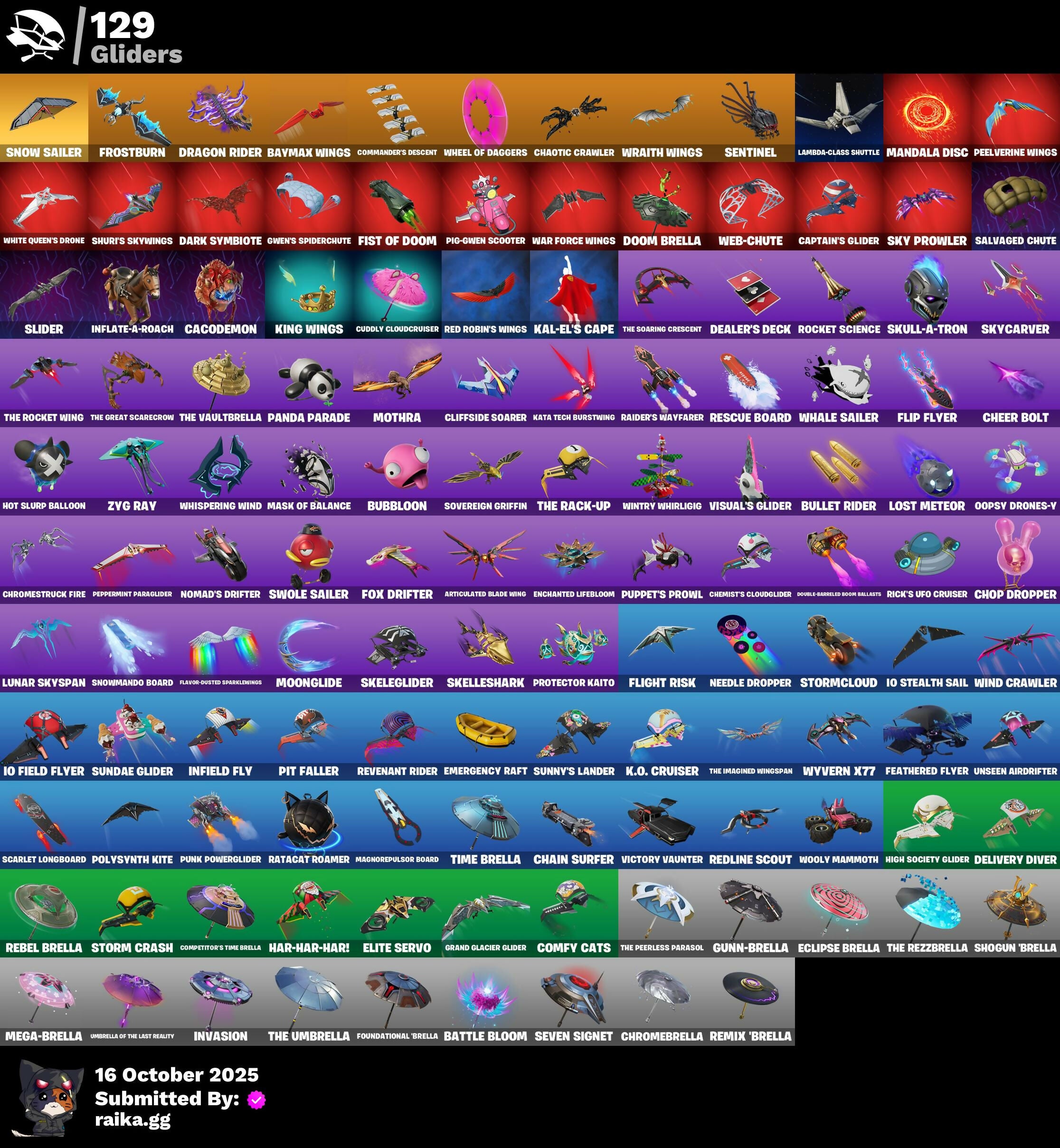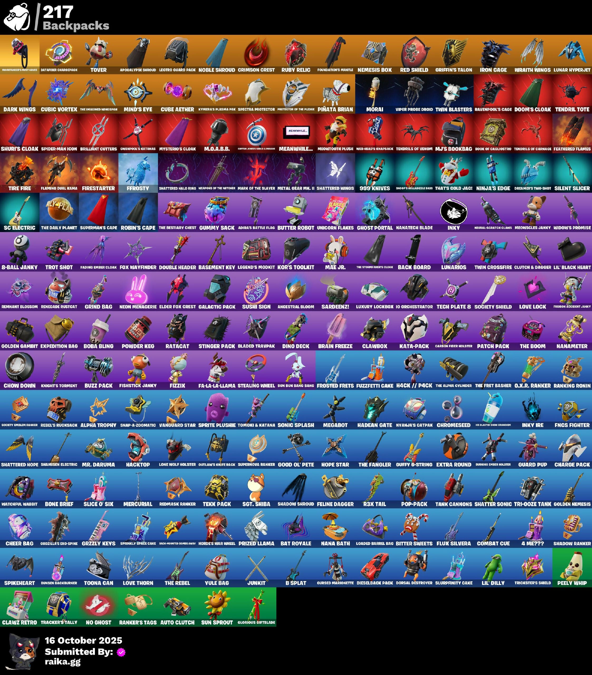 (Snikt!), 1-Ball, 2.O'S Revenge, 2022, 4 Me???, 8-Ball Janky, 999 Knives, Abduction, Absenz, Abyssal Blade, Adira, Adira'S Armor, Adira's Battle Flag, Aerial, Aerial Classic, Aerial Swagger, Agent Jones, Ahsoka Tano, Ahsoka's Staff, All-Nighter, Alpha Trophy, Ancestral Bloom, Anniversary Axe, Antonia, Antonia In Action, Apex Predator, Apocalypse Shroud, Arachrobatics, Arcade Cat, Arctic Adeline, Articulated Blade Wing, Ascension Nezumi, Astro Armor, Auntie Dot, Aura, Aurelian, Aurum Eques, Auto Clutch, B Splat, Babygirl!!, Back Board, Back-Mounted Dumbo Arms, Backup Blades, Balance Board, Banner Icon, Baron's Hoard, Baseball, Basement Key, Basic Basher, Bat Royale, Battle Blessing, Battle Bloom, Battle Mode, Baymax Wings, Be The Mastermind, Beamers, Beatzbunny, Beep & Boop, Belt It!, Big Bite, Big Guns, Bike To Go, Birdarang Flourish, Birthday Basher, Birthday Bud, Birthday Dash, Bitter Sweets, Black Hole, Black Panther (Shuri), Black Queen, Blade Of The Waning Moon, Bladed Trapvak, Blades Of Light, Blaze, Blizzard Bomber, Blocko, Blowin' Up, Board Breaker, Boba Bling, Boba Snack, Bomb Bouquet, Bombastic Winterfest, Bone Brief, Boneyard Brand, Boogie Down, Book Of Cagliostro, Both Eyes Open, Brain Freeze, Brilliant Cutters, Bring It Around, Bronzed Scimitars, Brute. Competitor, Bruteball, Bubbloon, Buffer Fish, Bullet Rider, Bullpen Brawler Dusty, Bullseye, Bun Bun Bang Bang, Bun Bun Blast, Bunsen Backburner, Burning Ambition Valeria, Burning Ember, Burning Ember Holster, Bushie Bright, Butter Robot, Buttoned Up, Buzz Pack, By The Horns, Bytes, Bytes' Sigil, C3S2 Contender I, Cacodemon, Cake Clobberer, Called Shot, Camo War Machine, Cap K.O., Captain Jones, Captain Llamerica, Captain's Glider, Carbon Fiber Holster, Carbon Scarlet, Carnage, Carnage Cleaver, Cauldron Chill, Celebratory Slice, Cerberus, Chain Surfer, Chalked Up 1-Ball, Chaos Directive, Chaos Director, Chaotic Crawler, Charge Pack, Charlotte, Charlotte's Logo, Checks And Scratches, Cheer Bag, Cheer Bolt, Chef's Special, Chemist's Cloudglider, Chigusa, Chimpanski Wants You, Choice Knit, Chomp Cud!!, Choose Naughty, Chop Chop, Chop Dropper, Choppy, Chow Down, Chrome Marked, Chrome Punk, Chromebrella, Chromeseed, Chromestruck Fire, Clark Kent, Classic Peelverine, Clawbox, Clawz Retro, Clean Sweep, Cliffside Soarer, Club President Helsie, Clutch & Dagger, Collector Kado Thorne, Combat Cue, Combat Elite, Combat Giller, Comfy Cats, Commander's Descent, Competitor's Time Brella, Conjure Weapon, Conjuring Mysterio, Contract Giller, Controlled Chaos, Coral Crush, Courageous Mikasa, Crack It, Crackdown, Crashed Chiller, Crashed Shield, Crescent Shroom, Crimson Crest, Crimson Omen, Crimson Polestar, Crowning Achievement, Crucible Blade, Crypten Jones's Shell & Beacon, Cryptic Sigil, Crystal, Crz-8, Cube Aether, Cubed, Cubic Scepter, Cubic Vortex, Cuddle's Garden, Cuddly Cloudcruiser, Curling Iron, Cursed Marionette, Cyclo Curl, D'ark, D.C. 63, Dagger Dance, Daigo, Daigo's Claws, Daisies, Dark Blessing, Dark Doggo, Dark Gwenpool, Dark Symbiote, Dark Wings, Darth Shader, Darth Vader, Datafiber Chargepack, De-Rezz De-Stroyer, Dealer's Deck, Deep Future, Deku, Delivery Diver, Demon Hunter Hope, Demons Beware, Demonslayer Blade, Designated Hitters, Destroyer Signature, Determined Kendo, Determined Renegade, Diamond Throne, Diamondclaw Picker, Dice Roll, Dieselback Pack, Dimensional Camo, Dino Deck, Dirtbike Challenge, Diva's Grin, Division, Dizzie, Do The "Split, Doctor Slone, Doctor Slone (Prismatic), Doctor Strange, Dogg Treat, Doggo, Doom, Doom Brella, Doom Slayer, Doom's Cloak, Doom's Domain, Dorsal Destroyer, Double Header, Double-Barreled Boom Ballasts, Doze Dab, Dragon Rider, Dragon Rune Lance, Dragon Rune Lances, Dragon Spirit, Dreamer's Two-Shot, Drones-V View, Drooly, Droopy, Drummies, Duelist's Foil, Dumbbell Driver, Dumbell Driver, Dusk Knight, Dusty, Dyna-Boom!, Dynamic Tintina, Dynamo, Dynamo Tntina, Dynamo Tntoon-A, Eclipse Brella, Eclipsed Edges, Eddie Brock, Elder Fox Crest, Electro Pairing Blades, Electrostatic Impactor, Elegance Blade, Elegant Crowbar, Elite Servo, Ember Baton, Ember Pick, Emergency Raft, Emma Frost, Emma's Influence, Enchanted Lifebloom, Energy Claw, Ensnared, Epic Blade Of Floof, Epitaph Edge, Eren Jaeger, Eren's Faceoff, Erisa, Erisa Alert, Erisa'S Crest, Escapees, Evie, Evolved Heat Ray, Exile'S Emblem, Expedition Bag, Expressionism, Extra Round, Eye Of Agamotto, FNCS Fighter, Fa-La-La-Llama, Fabio Sparklemane, Fading Ember Cloak, Fanged Foresight, Feathered Flames, Feathered Flyer, Felina, Felina's Claw, Feline Dagger, Ffrosty, Fiendish Wand, Final Eclipse, Final Harbinger, Firestarter, Fireworks Salvo, Fish Thicc, Fishbone Flayer, Fishstick Janky, Fist Bump, Fist Of Doom, Fizzik, Fizzix, Flaky Feast, Flaming Dual Kama, Flashback Breakdown, Flavor-Dusted Sparklewings, Flight Risk, Flip Flyer, Flux Silvera, Fncs 3:1 Champion, Fncs Fit, Foil Flex, Follow The Butterfly, Forbidden Ace, Foundation's Mantle, Foundation's Plasma Spike, Foundational, Foundational 'Brella, Fox Clan Future, Fox Drifter, Fox Wayfinder, Foxfire Edge, Freshly Forged, Frostburn, Frosted Frets, Fully Charged Drift, Fusion Accident Janky, Future Relic Scythe, Fuzzfetti Cake, Galactic Pack, Geared Up, Geralt, Geralt of Rivia, Get Griddy, Gg Cuddlez, Ghost Portal, Gila Classic, Gilded Reality, Gingerbread Raider, Glorious Giftblade, Glory To Latveria, Go For The Goal, Godzilla & Exo-Gpine, Godzilla Awaits, Godzilla Evolved, Goku Black, Golden, Golden Daggers, Golden Gambit, Golden Grin, Golden Nemesis, Golden Scythe, Golden Wolf, Goochy Emblem Ranker, Good Guy, Good Ol' Pete, Grand Glacier Glider, Griffin's Talon, Grind Bag, Gringle Gift, Grriz, Grrizzy Gooper, Grrizzy Gunz, Grzzly Keys, Guard Pup, Guardian Daggers, Gucci Was Here, Guffy 6-String, Guffy G-String, Guggimon, Guggimon (Prismatic), Gugmon, Gum Brawler, Gumbo, Gummy Sack, Gunn-Brella, Gunnar, Gunnar'S Special, Gwen Stacy, Gwen's Spiderchute, Gwen-Step, Gwendoole's Katanas,