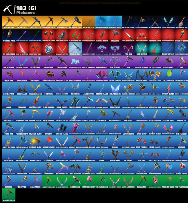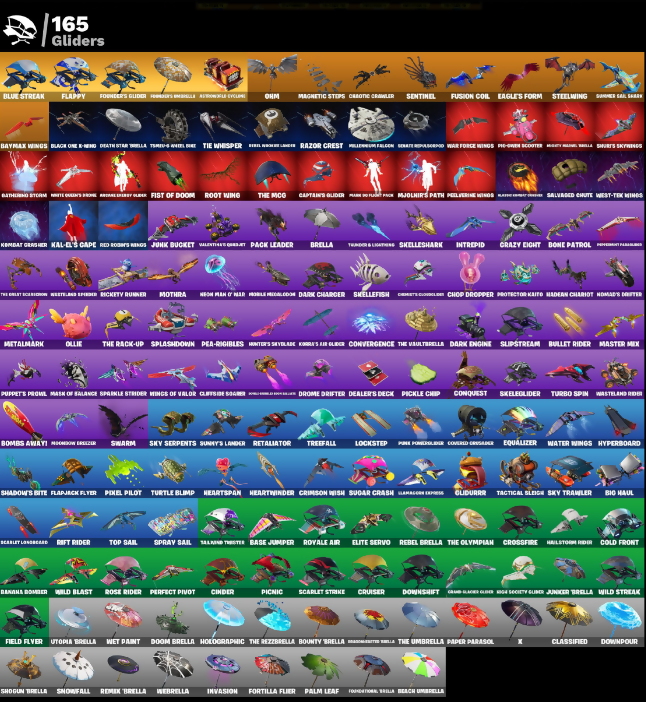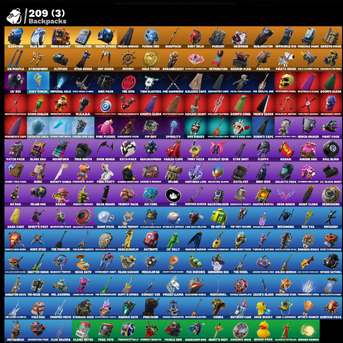 1-Ball, 2020 Kickflip, 6-Carat Cutter, 8-Ball VS Scratch, 999 Knives, AWR Pack, Abominable Axe, Adventure Pack, Agent Jones, Agent Peely, Air Shredder, Alpha Trophy, Altitude, Ancestral Bloom, Angler Axes, Antidote, Aphrodite, Apprentice Evie, Apricorn Axe, Arcane Energy Glider, Arid of Lightning, Arroyo Pack, Artemis, Atmosphere, Automobile Cyclone, Avatar's Flourish, Back Board, Backtracker, Backup Plan, Baggy Outlaw Pants, Ball Bling, Balloon Axe, Banana Bomber, Banana Briefcase, Bananaxe, Bank Shots, Barbecue Bonnet (floating), Baron's Hoard, Base Jumper, Basecamp Bag, Battle Blessing, Battlehawk, Baymax Wings, Beach Umbrella, Beachcomber, Beastfang, Bedside Banner, Beep Beep, Berserker Claw, Betrayal, Big Bull, Big Haul, Birthday Cake, Birthday Slice, Bitey, Black One O-Wing, Blackened Shield, Blackheart, Blade Bag, Blades of Light, Blowing Bubbles, Blue Sire, Blue Streak, Blue Striker, Blue Team Leader, Bobo, Boing!, Bolt Blades, Bomb Bouquet, Bombs Away!, Bone Patrol, Boogie Down, Boomin', Boss Dominator, Boulder Breakers, Bounty Brella, Breakdown, Breakfast Bunny, Breakneck, Brella, Brief Moves, Brilliant Cutters, Brite Raider, Brutus, Bullet Rider, Bunker Basher, Bunker Jonesy, Calamity, Calculated, Call Me, Cameo VS Chic, Captain Blamarion (Shirts), Captain Jones, Captain's Glider, Carbide, Card-Glider Glider, Carry Clobberin, Cassidy Quinn, Cat Flip, Catalyst, Cauldron Chill, Cerberus, Chainsaur, Chairmission Pack, Chaos Director, Chaotic Cavalier, Charlotte, Chill-Axe, Choice Knit, Chop Chop, Chop Dropper, Chumptos Katanas, Cinder, Clang & Bashir, Classified, Claws Retro, Clean Sweep, Cliffside Soarer, Cloud Striker, Cluck Strut, Clutchfang Blade, Cobra, Coin Flip, Cold Front, Combat Cue, Combat Wreath, Conch Call, Conga, Conquest, Controller, Convergence, Cosmetic Collection, Cosmic Cleavers, Cosmohype Clump, Countdown, Covered Crusader, Cozy Conga, Crazy Eight, Crescent Shroom, Crimson Wish, Criss Cross, Crossfire, Crowbar, Cruiser, Crystal Fang, Cursed Mandrketti, DJ Yonder, Dabstand, Daigo, Daigo’s Claws, Dark Charger, Dark Engine, Dark Specialist Marvel, Darvel's Knives, Daryl Dixon, Deadpool, Deadpool's Katana, Dealer's Deck, Death Star Shuttle, Deck Ducky, Deep Dive, Deep End, Demi, Diamond Diva, Diamond Electric, Dilly With It, Dire, Dirt Rider, Disassemble, Dive Knives, Doctor Doom, Doggo Treat, Doom, Doom Brella, Doom Chalice, Doom's Cloak, Doom's Cowl, Doom's Domain, Double Cleavers, Doubles Up Card Trick, Downpour, Downshift, Dragon Stance, Dragon's Claw, Dragoncrest (Mythical Hakama PM), Drift, Drome Drifter, Droop, Dunkle's Backpack, Dusk, Dusk Wings, Dynamo Don't Quit, Dynamo TNTina, Eagle's Form, Elevation, Elite Servo, Ember Pick, Emma Frost, Emperor Palpatine, Enforcer, Eon Blades, Epic Blade of Dogs, Epic Swords of Wonder, Equalizer, Eternal Voyager, Eva, Fable, Fabled Cape, Face Palm, Fade, Fang Saws, Featherweight, Feel The Force, Felina, Felina’s Claw, Feline Dagger, Feline Fun, Field Flyer, Fire Show, Fireworks Salvo, Fishstick Jakey, Fist Bump, Fist Of Doom, Fixer, Flamenco, Flapjack Flyer, Flappy, Fletcher Kane, Flippin' Away, Floppy, Fluteroon's Cane, Flux Silvera, Flux Silvers, Foil Flex, Force Lightning, Fortilla Flier, Foundation Brella, Founder's Glider, Founder's Umbrella, Free Flow, Freestone Point, Freestylin', Frostbite, Frosted Frets, Frozen Axe, Frozen Iron Cage, Frozen Love Wings, Frozen Raven, Frozen Red Shield, Frozen Shroud, Frozon Freakout, Fusion, Fusion Coil, Fusion Orb, Fusion Scythe, Galactic Pack, Gale Force, Gathering Storm, General Grievous, Gentleman’s Dab, Get Funky, Giddy-Up, Glidurra, Go Bag, Godzilla Evolved, Gold Midas, Gold Token, Golden King, Golden Nemesis, Golden Scythe, Golf Clap, Good Guy, Goodie Bag, Gordon's Eggs, Groot, Groot's Sap Axes, Groove Jam, Guffy G-String, Guggimon, Guiding Glow, Gwen-Step, Gwenpool, Hack & Smash, Hadean Chariot, Hadean Gate, Hadean Key, Hades, Halston Birky, Hammered Missile, Hark Em Ebony Edge, Harmonic Axes, Havoc, Heart's Carver, Heart's Rest, Heartspan, Heartwinder, Hellfire Dance, Hello Friend, Hench Hauler, Hero Baymax, High Five, Hog Society Glider, Hold-Boot Pack, Holiday Bow, Holly Hatches, Holographic, Hope Star, Hot Marat, Hot Rokers, Hot Wings, Hula Hooroh!, Humble Slicer, Hunter's Sevlabe, Hunting Quiver, Huntress, Huntress Livre, Hvpe, Hybrid, Hydroshock Staff's Fang, Hyperboard, I Declare!, Ice Cube, Ice Mantle, Ice Scepter, Ignition Pack, Illuminant's Blades, Imperial Hold (Pets HoLo & Home), Inkv, Instigator, Intrepid, Invasion, Invasive Maneuvers, Invisible Cut, Iron Man, Iron Man's Backplate, Ironmaster Scars, It's Chemistry!, It's Go Time!, Jack-o-lantern, Jade, Jagged Wand, Jar Buster, Javwalking, Jennifer Walters, Jet Signals, Jones' Field Pack, Josie, Joss, Journey VS Hazard, Jules, Jump Jets, Junk Bucket, Junkier Brella, Kabagi, Kal-El's Cape, Kalessh Cape, Karas Fight Owner, Kata-Pack, Katana Staff, Kawsas's Cottage, Keep It Mello, Keisha Cross, Kendo, Kittanas, Kombat Gnasher, Kondor, Korra, Korra's Air Glider, Krang, Krisabelle, Kymera, Laguna, Laid Back Shuffle, Lara Croft, Legends Rocket, Lexa, Lil Billy, Lil' Beach Heart, Lil' Godzilla Attack, Lil' Kev, Lil' Saucer, Llamargon Express, Loaded Barrel Bag, Lockpick, Lockstep, Lollipopper, Lone Wolf Mul-Tor, Low ‘N Slow, Lt. Evergreen, Lug Axe, Lynx, Macgroot Mallet, Magnetic Steps, Magneto's Cape, Make A Seat, Mancake, Mandalorian, Manifested Scepter, Mark 80 Flight Pack, Martyrturn Claws, Mask Of Balance, Master Mix, Master Portal, Masters Of Fiesta, Mave, Mean Streak, Mecha Axe, Mega, Mega Lodon, Megabot, Megalopak, Menace, Meowdas, Meowscles, Mercurial, Metahalead, Metal Team Regroup, Metalmark, Micro Drop, Mighty Marvel Vanilla, Millenium Falcon, Mime Time, Mini Dogfight, Mistylanders Cloak, Mjolnir, Mjolnir's Path, Mobile Medeolog, Mogroboic Brezzer, Molten Scythe, Monsoon Axes, Moonlight Strikes, Moonlit Mystery, Mothra, Mr. Daruma, Mr. Stone's Cloak, Mr. Stone's Skull, Mutiny, Mysterio, Mystique,