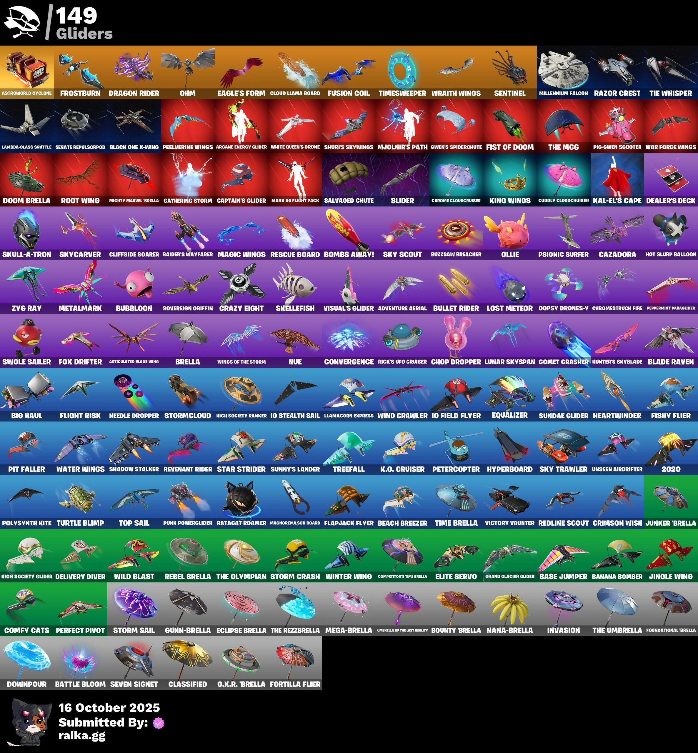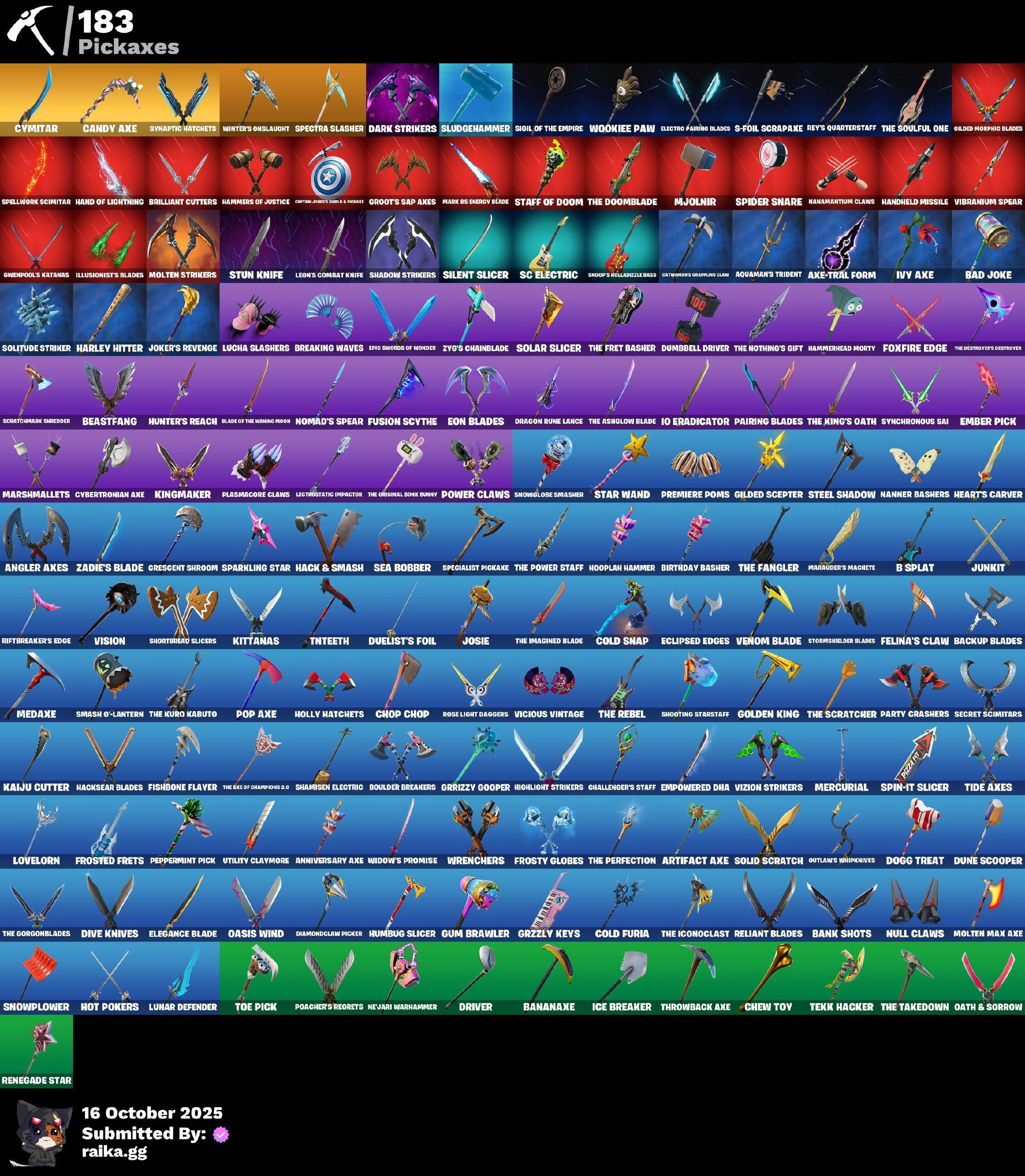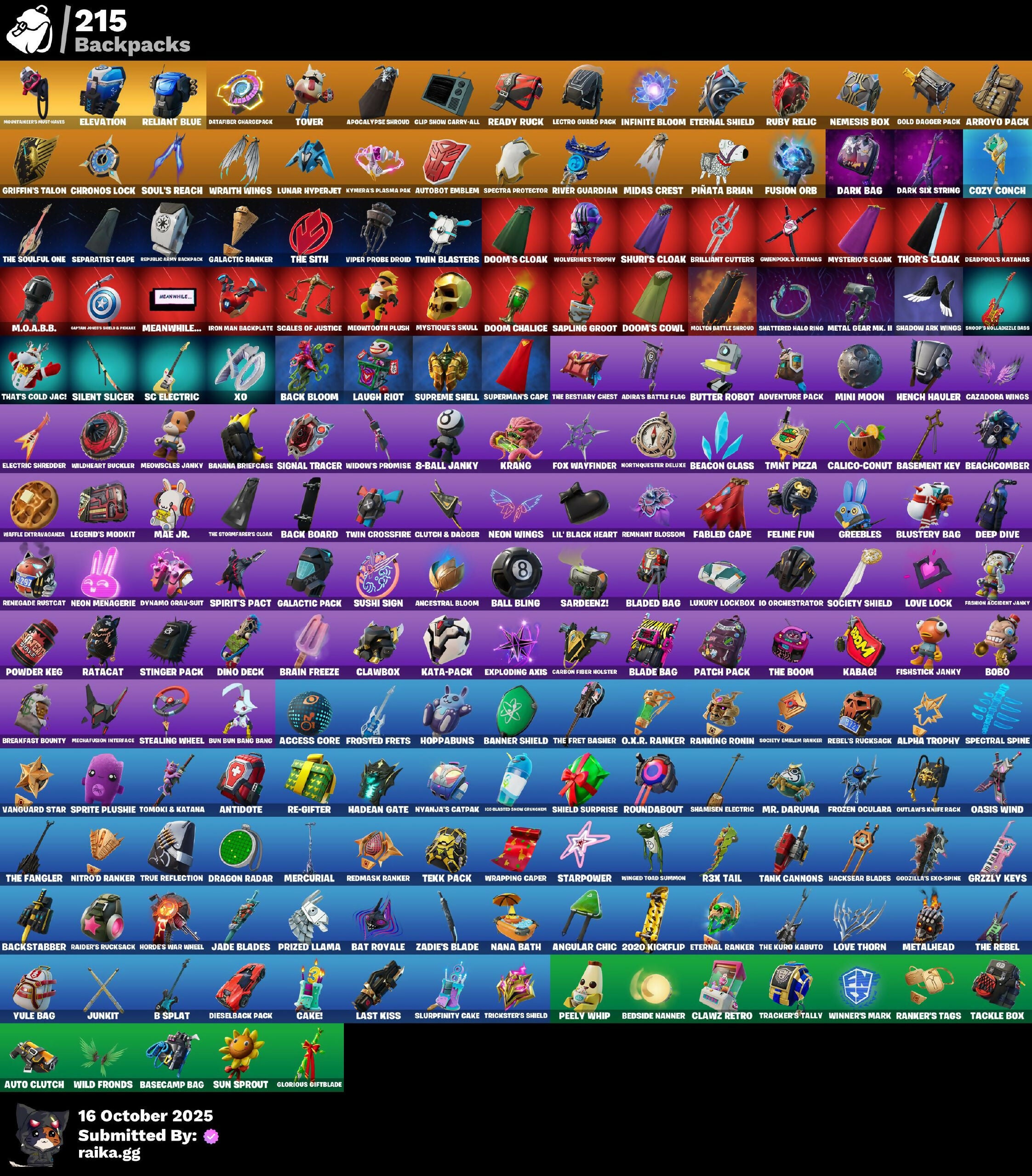 (Snikt!), 10 Stealth Sail, 2020, 2020 Kickflip, 8-Ball, 8-Ball Janky, 8-Ball Vs Scratch, A.L.T.E.R., Abduction, Access Core, Adeline, Adira, Adira's Battle Flag, Adira’s Armor, Adventure Aerial, Adventure Pack, Afterparty, Agent Jones, Agent Nana, Agent Peely, Ahsoka Tano, Air Shredder, Ali-A Was Here, All-Nighter, Alpha Trophy, Ancestral Bloom, Angler Axes, Angular Chic, Anniversary Axe, Antidote, Antonia, Antonia in Action, Apocalypse Shroud, Aquaman, Aquaman's Trident, Arachnrobatics, Arcade Cat, Arcane Energy Glider, Arcane Steel, Arroyo Pack, Arthur Curry, Articulated Blade Wing, Artifact Axe, Assault Trooper, Astro Antidote, Astro Jack, Astroworld Cyclone, Auntie Dot, Aura, Aurelian, Auto Clutch, Autobot, Autobot Emblem, Axe-Tral Form, B Splat, B.A.V.E. Competitor, Back Bloom, Back Board, Backlash, Backstabber, Backup Blades, Bad Joke, Ball Bling, Banana Bomber, Banana Briefcase, Bananaxe, Bank Shots, Banner Shield, Banner Trooper, Base Jumper, Basecamp Bag, Basement Key, Bat Royale, Batman, Battle Bloom, Battle Mode, Battle Ready Era, Battle-Tested, Be The Mastermind, Beach Breezer, Beachcomber, Beacon Glass, Beamers, Beast Boy & Raven, Beastfang, Beat Breaker, Beatzbunny, Bedside Nanner, Beep Beep, Bees!, Belt It!, Berserker Barrage, Big Fan, Big Guns, Big Haul, Bike To Go, Birthday Basher, Birthday Bud, Birthday Dash, Black Eternal Knight, Black Leader, Black One X-Wing, Black Panther (Shuri), Black Queen, Blade Bag, Blade Raven, Blade of the Waning Moon, Bladed Bag, Blasted, Blizzard Bomber, Blocko, Blowin' Up, Blustery Bag, Bobo, Boing!, Bombastic Winterfest, Bombs Away!, Boogie Down, Boomin', Both Eyes Open, Boulder Breakers, Bounty 'Brella, Brain Freeze, Break Point Ultra, Breakfast Bounty, Breaking Waves, Brella, Brilliant Cutters, Bring It, Brite Bomber, Brutus, Bubblegum Highwire, Bubloon, Buffer Fish, Bullet Rider, Bullseye, Bun Bun Bang Bang, Bun Bun Blast, Burn Bright, Burning Ambition Valeria, Bushie Bright, Butter Robot, Buttoned Up, Buzzsaw Breacher, By The Horns, Bytes, Bytes' Sigil, C3S2 Contender III, C3S3 Contender II, C3S4 Contender I, Cake!, Cakev, Calico, Calico Holiday, Calico-Coconut, Calico-Conut, Call Me, Cameo, Cameo Vs Chic, Candy Axe, Cap's Jones Bones & Picker, Caper, Captain Jones, Captain Jones's Shells P Pack, Captain L'America, Captain's Glider, Carbon Fiber Holster, Card Drop, Cash Grab, Castaway Jonesy, Catwoman's Grappling Claw, Cazadora, Cazadora Wings, Cerberus Bite, Challenger Cerberus, Challenger's Staff, Champion Kyra, Chaos Directive, Charlotte's Logo, Chef's Special, Chew Toy, Chibi, Chic, Chill Challenger, Chillshot, Chimpanski Wants You, Choice-Knit, Chomp Cudi, Choose Naughty, Chop Chop, Chop Dropper, Choppy, Chrome Cloudcruiser, Chrome Marked, Chromestruck Fire, Chronos Lock, Clark Kent, Classic Age, Classic Peelverine, Classic Wolverine, Classified, Clawbox, Clawz Retro, Clean Sweep, Cliffside Soarer, Clip Show Carry-All, Cloud Llama Board, Cloud Striker, Cloudburst, Clutch & Dagger, Cobalt Overdrive, Coin Flip, Cold Furia, Cold Snap, Collector Kado Thorne, Color Crush, Combat Giller, Combat Tech Jules, Comet, Comet Crasher, Comfy Cats, Competitor Medusa, Competitor's Time Brella, Conjuring Mystery, Console Cup, Contour Camo, Convergence, Coral Crush, Corrupted, Cosmic Sun, Count It!, Courageous Michas, Cowboy Chat, Cozy Conch, Crabby King, Crack It, Crashed Chiller, Crashed Shield, Crazy Castle, Crazy Eight, Crazy Feet, Crescent Shroom, Crimson Wish, Crowning Achievement, Cryptic, Crystal, Cubed, Cuddly Cloudcruiser, Cybertronian Axe, Cyclo Curl, Cymitar, D.C. 63, Dagger Dance, Daisies, Dark Angular Shift, Dark Bag, Dark Bomber, Dark Power Chord, Dark Side Rising, Dark Six String, Dark Strikers, Darth Shader, Darth Vader, Datafiber Chargepack, Daughter of Trigon, Dawn Duelist Nisha, Deadpool, Deadpool's Katanas, Dealer's Deck, Deep Dab, Deep Dive, Delivery Diver, Demons Beware, Denim Destiny, Destroyer Signature, Determined Renegade, Diamond Shapes, Diamond Throne, Diamondclaw Picker, Dice Roll, Dieselback Pack, Dino Deck, Dire Goat, Dirtbike Challenge, Diva's Grin, Dive Knives, Do The Split, Doctor Doom, Doctor Slone, Doctor Slone (Prismatic), Dogg Treat, Doggo, Dolphin, Doom, Doom Brella, Doom Chalice, Doom Dancer, Doom's Cloak, Doom's Cowl, Doom's Domain, Double Draw, Downpour, Doze Dab, Dragon Radar, Dragon Rider, Dragon Rune Lance, Dragon Rune Lances, Dragon Spirit, Dramatic Flares, Drift Face, Drippy Drift, Driver, Drones-y View, Drooly, Droop, Droopy, Drop Dee, Dropout, Drummies, Duelist's Foil, Dumbbell Driver, Dumbell Driver, Dune Scooper, Durrr Face, Dyed Breeze, Dynamic Fire, Dynamite, Dynamo, Dynamo Grab-Suit, E.G.O., Eagle's Form, Echo, Eclipse Brella, Eclipsed Edges, Electric Shredder, Electro Pairing Blades, Elegance Blade, Elevation, Eleven, Elite Servo, Ember Pick, Emma Frost, Emma's Influence, Empowered Dha, Empress Fan Dance, Ensnared, Eon Blades, Epic Swords of Wonder, Equalizer, Era, Eren Jaeger, Eren's Faceoff, Erisa Alert, Eternal Emblem, Eternal Knight, Eternal Ranker, Eternal Shield, Everything's Fine, Evie, Exploding Axis, Explorer Emilie, Expressionism, Eye of Agamotto, FNCS 3:1 Champion, Fabled Cape, Face Palm, Fade, Fade Out, Falling Leaf, Falling Snow, Fan Attack, Fancy Peter Griffin, Fang Dance, Fashion Accident Janky, Felina, Felina's Claw, Feline Fun, Ferocious, Final Eclipse, Final Harbinger, Finger Wag, Fireworks Salvo, Fish Hook, Fish Thicc, Fishbone, Fishbone Flayer, Fishstick Janky, Fishy Flier, Fist, Fist of Doom, Fixer, Fizzix, Fizzle, Flaky Feast, Flapjack Flyer, Flashback Breakdown, Flight Risk, Flippin' Away, Floating Island, Flood, Fncs Fit, Focused, Foil Flex, Fortilla Flier, Foundational 'Brella, Fox Drifter, Fox Wayfinder, Foxfire Edge, Frost Squad, Frostburn, Frosted Frets, Frosty Globes, Frozen Oculiara, Frozen Over, Frvangles, Fully Charged Drift, Furnidable Meowscles, Fusion, Fusion Coil, Fusion Orb, Fusion Scythe, Fusion!, Future Goat, G1 Optimus Prime, GG Ornament, GG Snakes, G