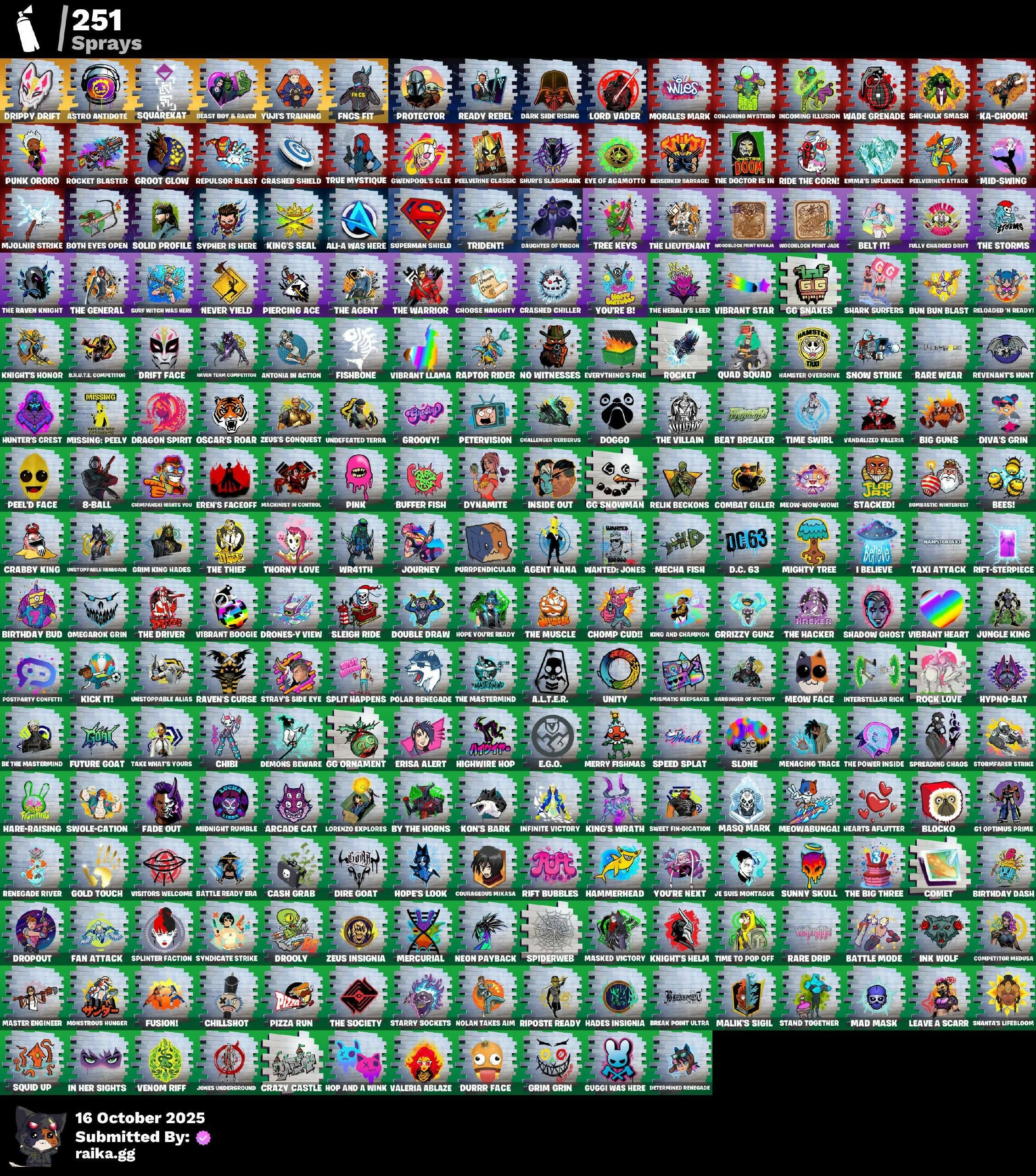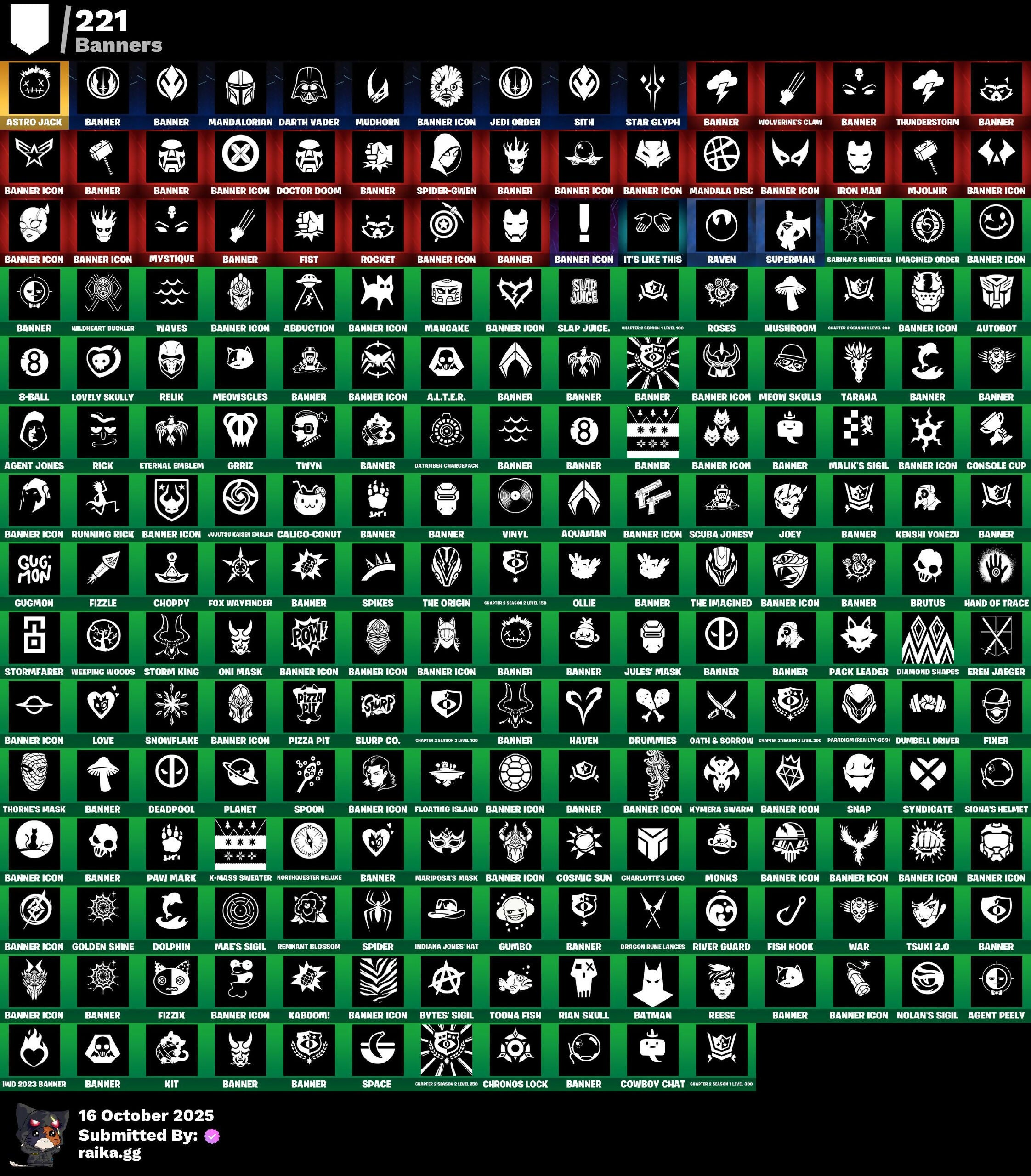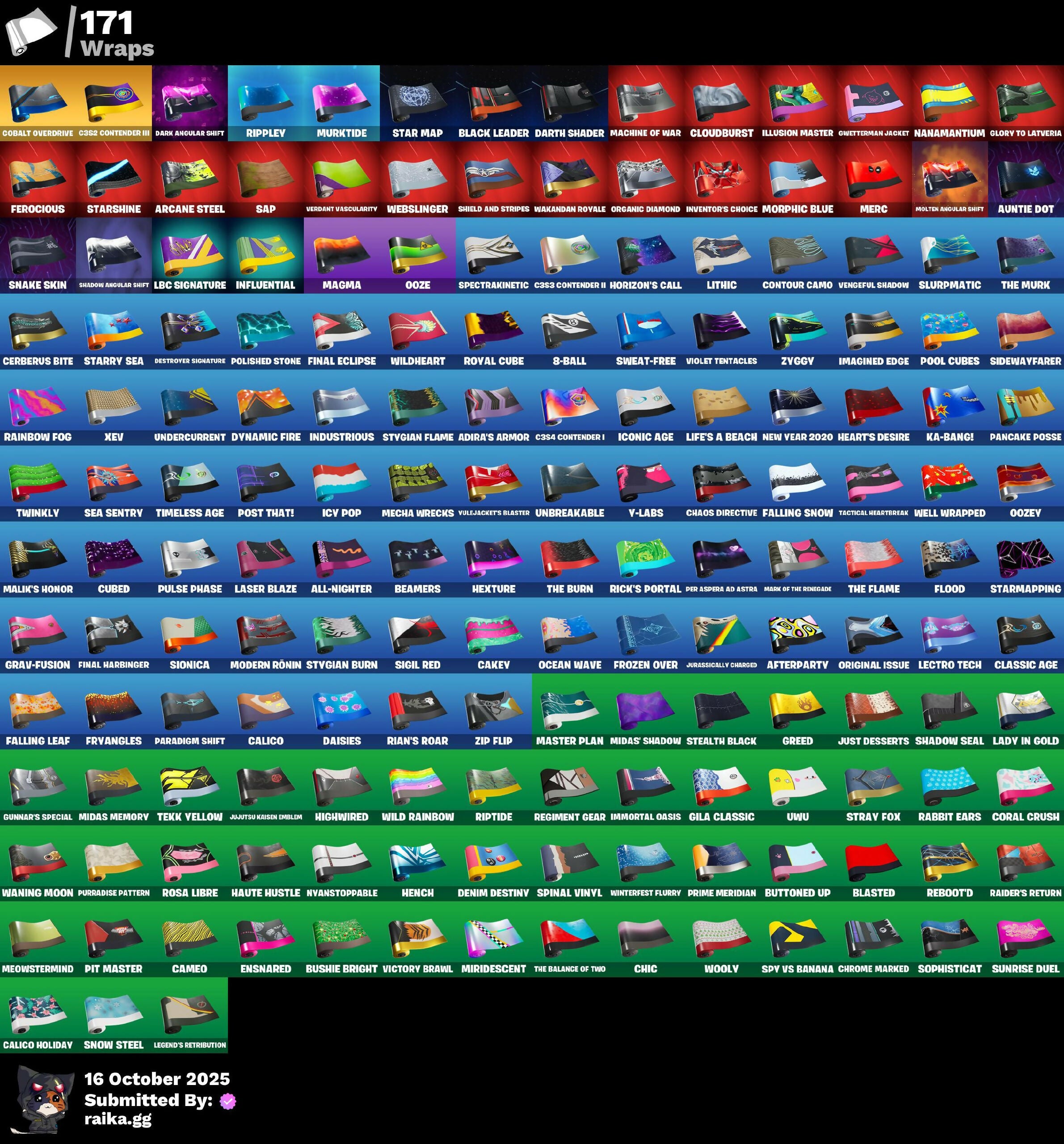 (Snikt!), 10 Stealth Sail, 2020, 2020 Kickflip, 8-Ball, 8-Ball Janky, 8-Ball Vs Scratch, A.L.T.E.R., Abduction, Access Core, Adeline, Adira, Adira's Battle Flag, Adira’s Armor, Adventure Aerial, Adventure Pack, Afterparty, Agent Jones, Agent Nana, Agent Peely, Ahsoka Tano, Air Shredder, Ali-A Was Here, All-Nighter, Alpha Trophy, Ancestral Bloom, Angler Axes, Angular Chic, Anniversary Axe, Antidote, Antonia, Antonia in Action, Apocalypse Shroud, Aquaman, Aquaman's Trident, Arachnrobatics, Arcade Cat, Arcane Energy Glider, Arcane Steel, Arroyo Pack, Arthur Curry, Articulated Blade Wing, Artifact Axe, Assault Trooper, Astro Antidote, Astro Jack, Astroworld Cyclone, Auntie Dot, Aura, Aurelian, Auto Clutch, Autobot, Autobot Emblem, Axe-Tral Form, B Splat, B.A.V.E. Competitor, Back Bloom, Back Board, Backlash, Backstabber, Backup Blades, Bad Joke, Ball Bling, Banana Bomber, Banana Briefcase, Bananaxe, Bank Shots, Banner Shield, Banner Trooper, Base Jumper, Basecamp Bag, Basement Key, Bat Royale, Batman, Battle Bloom, Battle Mode, Battle Ready Era, Battle-Tested, Be The Mastermind, Beach Breezer, Beachcomber, Beacon Glass, Beamers, Beast Boy & Raven, Beastfang, Beat Breaker, Beatzbunny, Bedside Nanner, Beep Beep, Bees!, Belt It!, Berserker Barrage, Big Fan, Big Guns, Big Haul, Bike To Go, Birthday Basher, Birthday Bud, Birthday Dash, Black Eternal Knight, Black Leader, Black One X-Wing, Black Panther (Shuri), Black Queen, Blade Bag, Blade Raven, Blade of the Waning Moon, Bladed Bag, Blasted, Blizzard Bomber, Blocko, Blowin' Up, Blustery Bag, Bobo, Boing!, Bombastic Winterfest, Bombs Away!, Boogie Down, Boomin', Both Eyes Open, Boulder Breakers, Bounty 'Brella, Brain Freeze, Break Point Ultra, Breakfast Bounty, Breaking Waves, Brella, Brilliant Cutters, Bring It, Brite Bomber, Brutus, Bubblegum Highwire, Bubloon, Buffer Fish, Bullet Rider, Bullseye, Bun Bun Bang Bang, Bun Bun Blast, Burn Bright, Burning Ambition Valeria, Bushie Bright, Butter Robot, Buttoned Up, Buzzsaw Breacher, By The Horns, Bytes, Bytes' Sigil, C3S2 Contender III, C3S3 Contender II, C3S4 Contender I, Cake!, Cakev, Calico, Calico Holiday, Calico-Coconut, Calico-Conut, Call Me, Cameo, Cameo Vs Chic, Candy Axe, Cap's Jones Bones & Picker, Caper, Captain Jones, Captain Jones's Shells P Pack, Captain L'America, Captain's Glider, Carbon Fiber Holster, Card Drop, Cash Grab, Castaway Jonesy, Catwoman's Grappling Claw, Cazadora, Cazadora Wings, Cerberus Bite, Challenger Cerberus, Challenger's Staff, Champion Kyra, Chaos Directive, Charlotte's Logo, Chef's Special, Chew Toy, Chibi, Chic, Chill Challenger, Chillshot, Chimpanski Wants You, Choice-Knit, Chomp Cudi, Choose Naughty, Chop Chop, Chop Dropper, Choppy, Chrome Cloudcruiser, Chrome Marked, Chromestruck Fire, Chronos Lock, Clark Kent, Classic Age, Classic Peelverine, Classic Wolverine, Classified, Clawbox, Clawz Retro, Clean Sweep, Cliffside Soarer, Clip Show Carry-All, Cloud Llama Board, Cloud Striker, Cloudburst, Clutch & Dagger, Cobalt Overdrive, Coin Flip, Cold Furia, Cold Snap, Collector Kado Thorne, Color Crush, Combat Giller, Combat Tech Jules, Comet, Comet Crasher, Comfy Cats, Competitor Medusa, Competitor's Time Brella, Conjuring Mystery, Console Cup, Contour Camo, Convergence, Coral Crush, Corrupted, Cosmic Sun, Count It!, Courageous Michas, Cowboy Chat, Cozy Conch, Crabby King, Crack It, Crashed Chiller, Crashed Shield, Crazy Castle, Crazy Eight, Crazy Feet, Crescent Shroom, Crimson Wish, Crowning Achievement, Cryptic, Crystal, Cubed, Cuddly Cloudcruiser, Cybertronian Axe, Cyclo Curl, Cymitar, D.C. 63, Dagger Dance, Daisies, Dark Angular Shift, Dark Bag, Dark Bomber, Dark Power Chord, Dark Side Rising, Dark Six String, Dark Strikers, Darth Shader, Darth Vader, Datafiber Chargepack, Daughter of Trigon, Dawn Duelist Nisha, Deadpool, Deadpool's Katanas, Dealer's Deck, Deep Dab, Deep Dive, Delivery Diver, Demons Beware, Denim Destiny, Destroyer Signature, Determined Renegade, Diamond Shapes, Diamond Throne, Diamondclaw Picker, Dice Roll, Dieselback Pack, Dino Deck, Dire Goat, Dirtbike Challenge, Diva's Grin, Dive Knives, Do The Split, Doctor Doom, Doctor Slone, Doctor Slone (Prismatic), Dogg Treat, Doggo, Dolphin, Doom, Doom Brella, Doom Chalice, Doom Dancer, Doom's Cloak, Doom's Cowl, Doom's Domain, Double Draw, Downpour, Doze Dab, Dragon Radar, Dragon Rider, Dragon Rune Lance, Dragon Rune Lances, Dragon Spirit, Dramatic Flares, Drift Face, Drippy Drift, Driver, Drones-y View, Drooly, Droop, Droopy, Drop Dee, Dropout, Drummies, Duelist's Foil, Dumbbell Driver, Dumbell Driver, Dune Scooper, Durrr Face, Dyed Breeze, Dynamic Fire, Dynamite, Dynamo, Dynamo Grab-Suit, E.G.O., Eagle's Form, Echo, Eclipse Brella, Eclipsed Edges, Electric Shredder, Electro Pairing Blades, Elegance Blade, Elevation, Eleven, Elite Servo, Ember Pick, Emma Frost, Emma's Influence, Empowered Dha, Empress Fan Dance, Ensnared, Eon Blades, Epic Swords of Wonder, Equalizer, Era, Eren Jaeger, Eren's Faceoff, Erisa Alert, Eternal Emblem, Eternal Knight, Eternal Ranker, Eternal Shield, Everything's Fine, Evie, Exploding Axis, Explorer Emilie, Expressionism, Eye of Agamotto, FNCS 3:1 Champion, Fabled Cape, Face Palm, Fade, Fade Out, Falling Leaf, Falling Snow, Fan Attack, Fancy Peter Griffin, Fang Dance, Fashion Accident Janky, Felina, Felina's Claw, Feline Fun, Ferocious, Final Eclipse, Final Harbinger, Finger Wag, Fireworks Salvo, Fish Hook, Fish Thicc, Fishbone, Fishbone Flayer, Fishstick Janky, Fishy Flier, Fist, Fist of Doom, Fixer, Fizzix, Fizzle, Flaky Feast, Flapjack Flyer, Flashback Breakdown, Flight Risk, Flippin' Away, Floating Island, Flood, Fncs Fit, Focused, Foil Flex, Fortilla Flier, Foundational 'Brella, Fox Drifter, Fox Wayfinder, Foxfire Edge, Frost Squad, Frostburn, Frosted Frets, Frosty Globes, Frozen Oculiara, Frozen Over, Frvangles, Fully Charged Drift, Furnidable Meowscles, Fusion, Fusion Coil, Fusion Orb, Fusion Scythe, Fusion!, Future Goat, G1 Optimus Prime, GG Ornament, GG Snakes, G