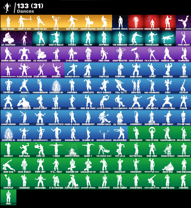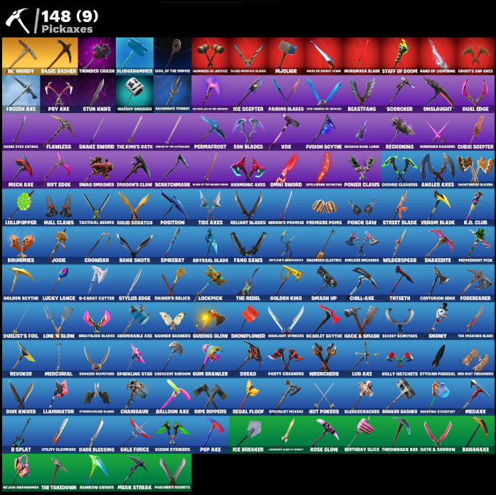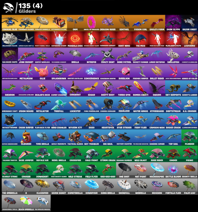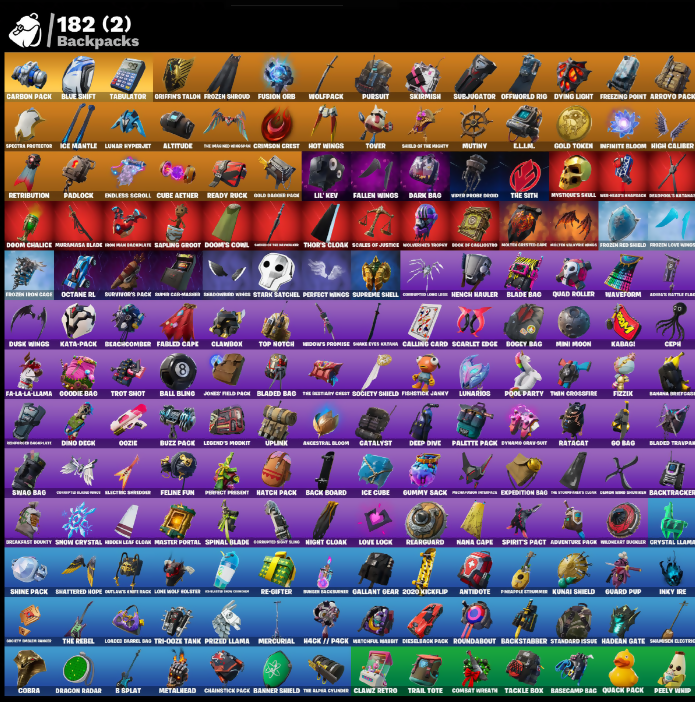 2020, 2020 Kickflip, 6-Carat Cutter, 8 Splat, Abominable Axe, Absenz, Abyssal Blade, Adira, Adonis Battle Flag, Adventure Pack, Agent Jones, Agent Peely, Air Shredder, Alim, Altitude, Ancestral Bloom, Angler Axes, Antidote, Aquaman, Aquaman's Trident, Arcane Energy Glider, Arroyo Pack, Astronaut's Oxygen, Attackcraft Blade Wing, Aura, Avengers Quinjet, B Splat, B-Ball vs Scratch, Back Board, Backstabber, Backtracker, Ball Bling, Balloon Axe, Banana Bomber, Banana Briefcase, Bananaxe, Bank Shots, Banner Shield, Baron's Hoard, Base Jumper, Basecamp Bag, Basic Basher, Battle Bloom, Battle Call, Battlehawk, Beach Umbrella, Beachcomber, Bean Bag, Beastfang, Beep Beep, Big Haul, Billy Bounce, Birthday Slice, Blackheart, Blade, Blade Bag, Bladed Bag, Bladed Trapjaw, Blizzabelle, Blowin' Up, Blue Shift, Blue Striker, Bogey Bag, Boing!, Bombs Away!, Bone Patrol, Boobytrapped, Boogie Down, Book of Eqalugtoid, Boomin', Boosting Ki, Boots 'N' Cats, Booty Buoy, Boulder Breakers, Bounty Brella, Breakdown, Breakfast's Bounty, Breathless Blades, Brella, Bronzed Scimitars, Brutus, Bubblloon, Bullet Rider, Bunker Backburner, Bunker Basher, Bunker Jonesy, Buzz Pack, Calamity, Calculated, Call Me, Calling Card, Cameo vs Chic, Carbide, Carbon Commando, Carbon Pack, Carbon Snow Runner, Cardistry, Cat Flip, Catalyst, Centurion, Centurion Edge, Ceph, Chain Surfer, Chainsaur, Chainstick Pack, Charging Up, Chemist's Cloudglider, Chigusa, Chill-Axe, Choice Knit, Chun-Li, Cinder, Classified, Clawbox, Clawz Retro, Clean Sweep, Cluck, Cluck Strut, Coaxial Blue, Cobalt, Cobra, Coin Flip, Cold Front, Combat Wreath, Comet Crasher, Cometbrella, Complete Blackwing, Conba, Conjure Weapon, Conquest, Convergence, Corrupted Long Leg, Corrupted Long Legs, Corrupted Scientist, Corrupted Shogun, Cosmic Cleavers, Covered Crusader, Crabby, Crazy Eight, Crescent Shroom, Crimson Crest, Crimson Valkyrie, Crimson Wish, Crossfire, Crowbar, Cruiser, Crystal Llama, Cube Aether, Cubic Scepter, Cursed Medran Blades, Cyclo Curl, D'Ark, DJ Yonder, Dagger Dance, Dark Bag, Dark Blessing, Dark Bomber, Dark Glyph, Darky Dynamo, Darth Vader, Deadpool, Dealer's Deck, Deep Dab, Deep Dive, Deep End, Demi, Demogorgon, Diamond Diva, Dino Deck, Dire, Dirtbat's Gone Rogue, Dissembler Pack, Dive Knives, Doctor Doom, Doctor Strange, Doom Chalice, Doom's Cowl, Downpour, Downshift, Dragon Radar, Dragon Rider, Dragon Rune Lancer, Dragon Stance, Dragon's Claw, Dread, Dreadpicks Reaver's Blade, Drift, Driftstream, Droop!, Drummies, Dual Edge, Duelist's Foil, Dumbo, Dusk, Dusk Wings, Dying Light, Dynamic Gray Gut, E.L.I.M., Eagles Porn, Eggar, Electric Shredder, Ember, Emergency Raft, Enchanted Lifebloom, Endless Scroll, Enforcer, Eon Blades, Equalizer, Evasive Maneuver, Evie, Expedition Bag, Fa-La-La-Llama, Fable, Fabled Cape, Fade, Fallen Love Ranger, Fallen Wings, Fang Saws, Feline Fun, Field Flyer, Fierce, Fishstick Janey, Fishy Flier, Fizzix, Flamenco, Flapjack Flyer, Flawless, Flippin' Away, Flippin' Incredible, Focused, Foil+Flex, Forebearer, Fortilla Flier, Foundational Stella, Founder's Glider, Founder's Umbrella, Free Flow, Freezing Point, Frostbite, Frozen Axe, Frozen Iron Cage, Frozen Love Wings, Frozen Raven, Frozen Red Shield, Frozen Shroud, Full Tilt, Fusion, Fusion Coil, Fusion Orb, Fusion Scythe, Gale Force, Gallant Gear, Gathering Storm, Gear Specialist Maya, Gentleman's Dab, Get Funky, Giddy-Up, Glidurdr, Go Bag, Gold Badge Folien, Gold Token, Golden King, Golden Scythe, Golf Clap, Gothic Saddlesoarer, Grand Salute, Griffin's Talon, Groot, Groot's Sap Axes, Groove Jam, Guard Pup, Guardian Daggers, Guff Gringle, Guiding Glow, Guitar Walk, Gum Brawler, Gummy Sack, Gun Show, Gunn-Brella, Gunnar, Hack & Smash, Hack // Pack, Hadean Gate, Halsey, Hammers Of Justice, Hand Of Lightning, Har-Har-Har!, Harlowe, Harmonic Axes, Hatch Pack, Have A Seat, Heartspan, Helix Slayer Wings, Helldown Falcon, Hello Friend, Hench Hauler, High Caliber, High Five, High Society Glider, Highlight Strikers, Hoard Leaf Cloak, Holly Hatchets, Holographic, Hoop Master, Hope, Hot Marat, Hot Wings, Hotpokers, Hula Hoopin', Huntress, Hybrid, Hype, Hyperboard, I Declare!, I'm A Mystery, Ice Breaker, Ice Cube, Ice Mantle, Ice Scepter, Imperial March, Indiana Jones, Infinite Bloom, Inky Ire, Intrepid, Invasion, Iron Man Backpack, It Is Finished, It's Go Time!, It's... You?, Jackie, Jaded Switchway, Jennifer Walters, Jones' Field Pack, Josie, Journey vs Hazard, Jules, Jump Jets, Junk Bucket, K.O. Club, K.O. Cruiser, Kabagi, Kara K.O., Kata-Pack, Keep It Mello, Keved Up, Kisha, Kit, Koa Tech Submersible, Kondor, Krisabelle, Kunai Shield, Laguna, Laid Back Shuffle, Lambda-Class Shuttle, Laminator, Lara Croft, Lavawing, Legend's Mookit, Leka, Lil Prancer, Lil' Kev, Lil' Monster, Lil' Warthog, Llamacorn Express, Locate Draftsman, Lockpick, Lockstep, Lodest!, Lollipopper, Lone Wolf Holster, Love Lock, Loveless, Low N Slow, Lt. Evergreen, Lt. John Llama, Lucky Lance, Lug Axe, Lunar Charge, Lunar Hyper-Jet, Lunar Skyspan, Lunarios, Luxe, Lynx, Make A Seat, Make Go Fight Pan, Malik, Mandala Disc, Mandalorian, Mangane, Mark Of Energy Blade, Marshmello, Marshy Smasher, Mashed Potato, Master Key, Mave, Mean Streak, Mech Axe, Mech Team Leader, Medaxe, Mega, Megumi, Menace, Meowscles, Mercurial, Metalhead, Metalmark, Mic Drop, Midas, Mighty Marvel Sheila, Min-Joon, Mind Blown, Mini Moon, Mjolnir, Mjolnir's Path, Molten Valkyrie, Moster Portal, Mother Crestbearer Cane, Muramasa Blade, Mutiny, Mwahaha, Mystique, Mystique's Skull, Nana Cape, Nana Nana, Night Cloak, Nightshade, Nourisher's Trophy, Null Claws, Oath & Sorrow, Ocean, Octane RL, Offworld Rig, Ol' Woody, Ollie, Omega, Omni Sword, One Shot, Onesie, Onslaught, Oodie Bag, Oozie, Orange Justice, Oscar, Out West, Outlander Backpack, Outlaw's Night Pack, Outlaw's Workshoves, Ovum, Padlock, Pairing Blades, Palette Pack, Palm Leaf, Pandemonium, Pans & Claws, Party Crashers, Party Hips, Peace Out, Peely, Peely Wind, Peppermint Pick, Perfect Pr