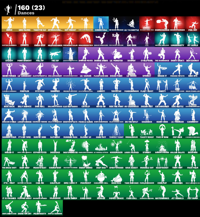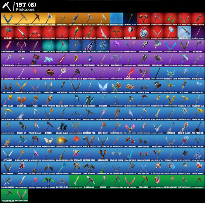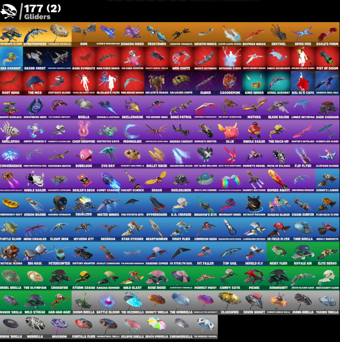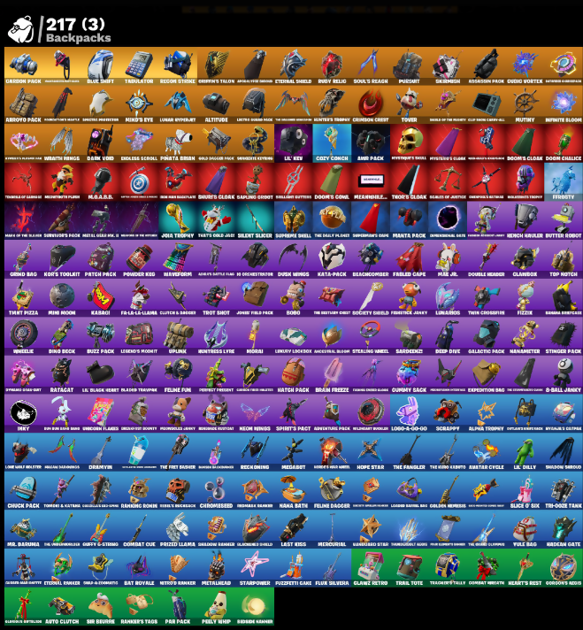 100 Eradicator, Abominable Axe, Acrobathics, Adam's Battle Flag, Adira, Adventure Pack, Aerial Acrobat, Agent Jones, Agent Peely, Ahsoka Tano, Ahsoka’s Staff, Air Shredder, Alpha Trophy, Alpha Wars XP Edition, Altitude, Amity Arms Swing, Ancestral Bloom, Animated Ride Rune, Antonia, Apex Predator, Aphrodite, Apocalypse Grendel, Aquaman, Aquaman Trident, Arcane Energy Glider, Arctic Adeline Party Trooper, Arrow|Point Carver, Arroyo Pack, Artemis, Assassin Pack, Aura, Auto Clutch, Avatar Cycle, Awe Pack, Axe-Trail Form, Back & Smash, Backflip Blades, Balance Board, Banana Bomber, Banana Make, Bankers Tags, Baron's Hoard, Barone Blaze R., Basic Basher, Baskat's Dance, Bat Royale, Battle Blessing, Battle Bloom, Baymax Wings, Beach Umbrella, Beachcomber, Bean Bag, Bear Hug, Beastfang, Beastglass Blade, Beatz Bunny, Beep Beep, Beholde, Bice's UFO Cruiser, Big Haul, Billy Bounce, Birdse Nannie, Birthday Bashers, Black Manta, Blackheart, Blade Raven, Bladed Travel, Blades Of Light, Bling, Blizzia Bomber, Blown Up, Blue Light Dagger, Blue Shift, Blue Striker, Bluzzabelle, Board Breaker, Bobo, Bogey Basher, Bolt Blades, Bomb Bouquet, Bombs Away!, Bone Patrol, Boogie Down, Boomin', Boost Glitch, Bootspin Cats, Bounty Brella, Braids of Justice, Brain Freeze, Breaking Point, Brella, Brilliant Cutters, Brite Bomber, Brittiske Challenge, Brutus, Bubloon, Bullet Rider, Bunny's Outback, Burnout, Bushbuck Buckaroo, Butter Robot, Buzz Pack, Bytes, Cacodemon, Calamity, Call Me, Cap Kick, Captain Jones, Captain Sparerrica, Captain's Glider, Carbon Pack, Card Drop, Cardistry, Carnage, Carnage’s Cleaver, Catflip, Cauldron Chill, Celebration Slice, Cerberus, Chain Surfer, Chainsawer, Challenger’s Staff, Chaos Director, Chaotic Crawler, Charlotte, Chimichanga!, Choice Knit, Chop Chop, Chop Dropper, Chrombrella, Chrome Punk, Chromeseed, Chronostrike Five, Chuck Pack, Clang & Bash, Clark Kent, Classified, Clean Sweep, Clementine's Cornucopia, Cliffside Soarer, Clip Show Carry-All, Cloud Llama Board, Cluck, Clutch & Sacken, Cogsworth Timepiece, Coin Flip, Combat Cue, Combat Meutia, Comet Crasher, Comfy Cats, Conga Call, Convergence, Covered Crusader, Cozy Conch, Crescent Slicer, Crimson Crest, Crimson Polestar, Crimson Wisp, Crossbones, Crossfire, Crucible Blade, Crystal, Crystal Fang, Cubic Vortex, Cursed Halo, Cyclo' Curl, DJ Yonder, Daigo, Daigo’s Claws, Dancer's Watertribe, Dark Charger, Dark Symbiote, Dark Vanguard, Dark Void, Dark Void's Gift, Dave Knives, Day Blade Of Frogs, Daytrip, Deadpool, Dealer's Deck, December Days Skull, Deep Dab, Deep Dive, Designated Hitters, Diamond Throne, Diamondview Ripper, Diet Roll, Dimensional Sails, Dino Deck, Disco Fever, Diya’s Broken Lance, Do The Split, Doctor Doom, Doctor Slone, Dome Clumpus, Dood Treat, Doom, Doom Brella, Doom Chalice, Doom Slayer, Doom's Cloak, Doom's Cowl, Dooms Domain, Double Carvers, Double Header, Downshift, Dozedab, Dragon Fire Lance, Dragon Rider, Dragon Stance, Dragon's Claw, Dragonfly Balloon, Dramyin, Dreadnaught’s Edge, Dream Feet, Driver, Drummies, Duelist’s Foil, Dumbledilioninger, Dumbo, Dusk Wings, Dusty, Dusty Deer Fez, Dynamo Tintina, Dypsa-Djna-Gat, Eagle's Form, Eclipse Brella, Eclipsed Edges, Edgar, Electro Shuffle, Electro Swing, Elegance Blade, Elegant Clawblis, Elite Servo, Ember Pick, Emergenraft, Emma Frost, Enchanted Umbrella, End Of Lightning, Endless Scroll, Eon Blades, Epitaph Edge, Equalizer, Eternal Enforcer, Eternal Knight, Eternal Ranger, Eternal Shield, Evie, Exo Re-Turbulation, Expedition Bag, Fable, Fabled Cape, Facepalm, Fang Clan, Fanged Forest Bat, Felina, Feline Dagger, Feline Fun, Feline’s Claw, Fiendish Wand, Firestick Janky, Fireworks Salvo, Fish Thicc, Fishbone Flayer, Fishy Flier, Fist Bump, Fist Of Doom, Fixer, Fizzix, Fla-la-la-laame, Flaky Feast, Flapjack Flyer, Flash & Chevy Slam, Flashback Strobing, Flight Risk, Flip Flyer, Flippin' Away, Flux Silvera, Focus, Fortilla Flier, Fouilflex, Founder's Glider, Founder's Umbrella, Four Elements Banner, French Hauler, Frostburn, Frosty, Frozen Axe, Galactic Pack, Gamma Pack, Gassy G-String, Gathering Storm, Gentleman's Dab, Geralt of Rivia, Ghost’s Saber Claws, Giddy-Up, Gift Wrap, Glacier's Shield, GlamBok, Glavez Retro, Godzilla Evolved, Gold Dagger Pack, Golden King, Golden Nemesis, Golden Scythe, Good Guy, Gorgon's Aegis, Grack It, Grand Glacier Glider, Griffin's Talon, Grind Bag, Grizzly Clopper, Groot, Groots Sap Axes, Guardian Sentinel Axe, Guffy G-String, Guggimon, Guiding Glow, Gum Brawler, Gummy Sack, Gunn-Brella, Gunnar, Guuff Gringle, Gwen-Step, Gwenpool, H-Ball, Hadean Gate, Haden's Chariot, Hades, Hand-Forged, Handheld Medical, Happy Llama, Har-Har-Har!, Harlowe, Hatch Pack, Have A Beat, Haven, Headband Kev, Heart Sign, Heart Wargasher, Heart's Rest, Heartburst, Heartwinder, Heart’s Carver, Heist Flier, Helperdance, Hero Baymax, Hero Stance Jerry, Heved Up, Hobbogot Mallet, Holiday Box, Hollowend War Axes, Holly Hatchets, Hope Star, Horde War's Armet, Hot Marat, Hot Pokers, Hot Slurp Balloon, Hud Boots, Magnet, Humbug Slicer, Hunter's Trophy, Hunter’s Sabers, Huntress Lyre, Hybrid, Hydra, Hyperboard, Hypnoteyes, IQ Field Flyer, IQ Orchestrator, IQ Stealth Sail, Igg Society Glider, Igní Sign, In A Mystery, Indiana Jones, Infield Fly, Infinite Bloom, Inflate-A-Roach, Inky, Intense Comb Girl, Introducing..., Invasion, Invasive Pamerhurs, Invisible Cut, Iriel's Recess, Iron War Pickaxe, It Is Finished, It's Go Time!, It's... You?, J.B. Chimpanski, Jackfruit Ranger, Jade, Jaguar Strike, Jar Buster, Jennifer Walters, Jesters' Jester Glider, Jet Signals, Joey, John Wick, Joja Trophy, Joni's Field Pack, Josie, Jukarii Map Battlefy, Jules, Juneau, Junker Brella, K.O. Club, K.O. Cruiser, Kado Thorne, Kal-El's Cape, Kata-Pack, Kendo, Kick Back, Kick Ups, King Wings, Kisha, Kit, Kita Tech Hoverboard, Kittanas, Klombo’s Stomper, Knife & Spinner, Kondor, Kor, Kor Flails, Kor's Toolkit, Korra, Krisabelle, Kurobi's Ash Cruiser, Lama, Lara