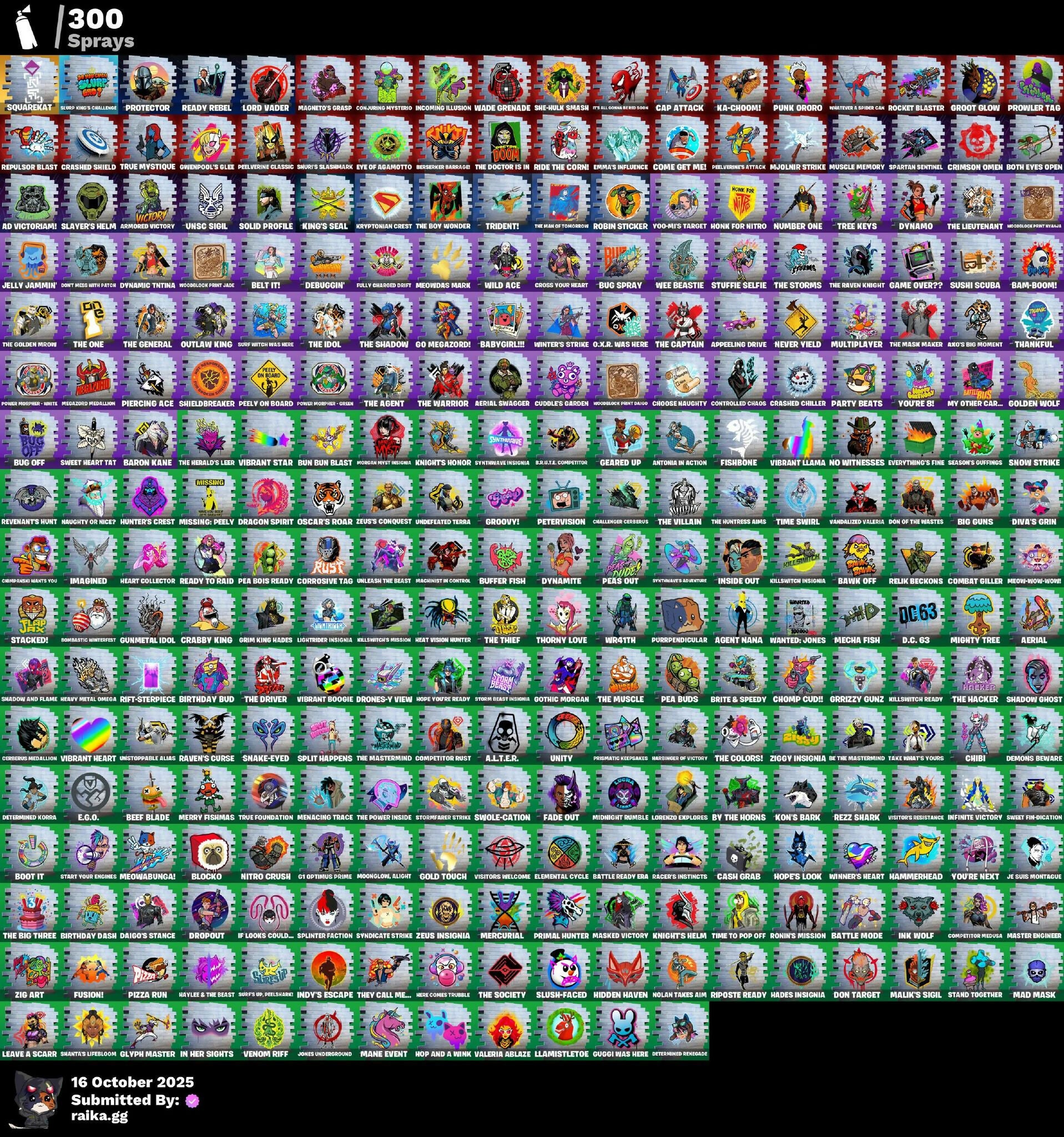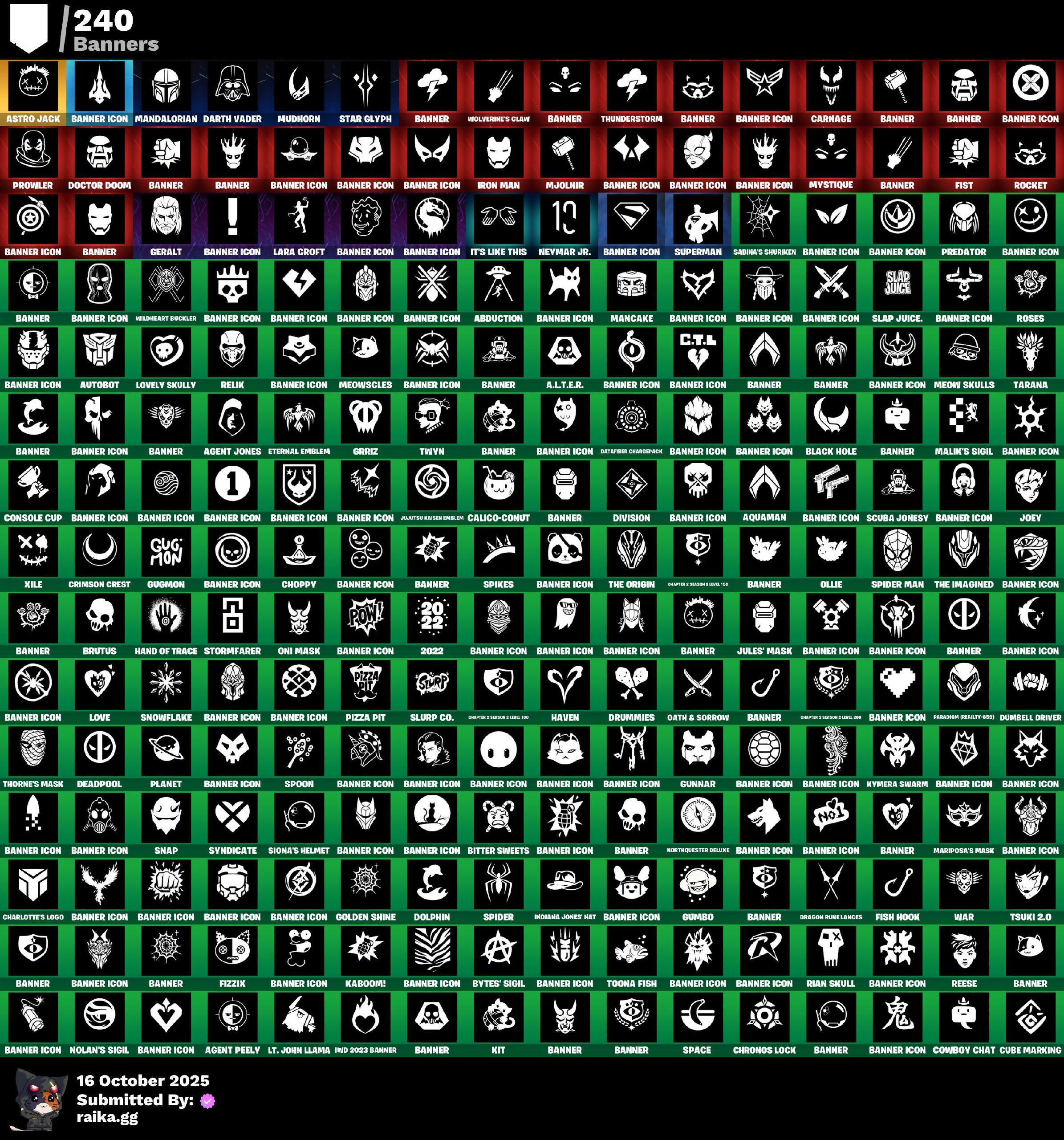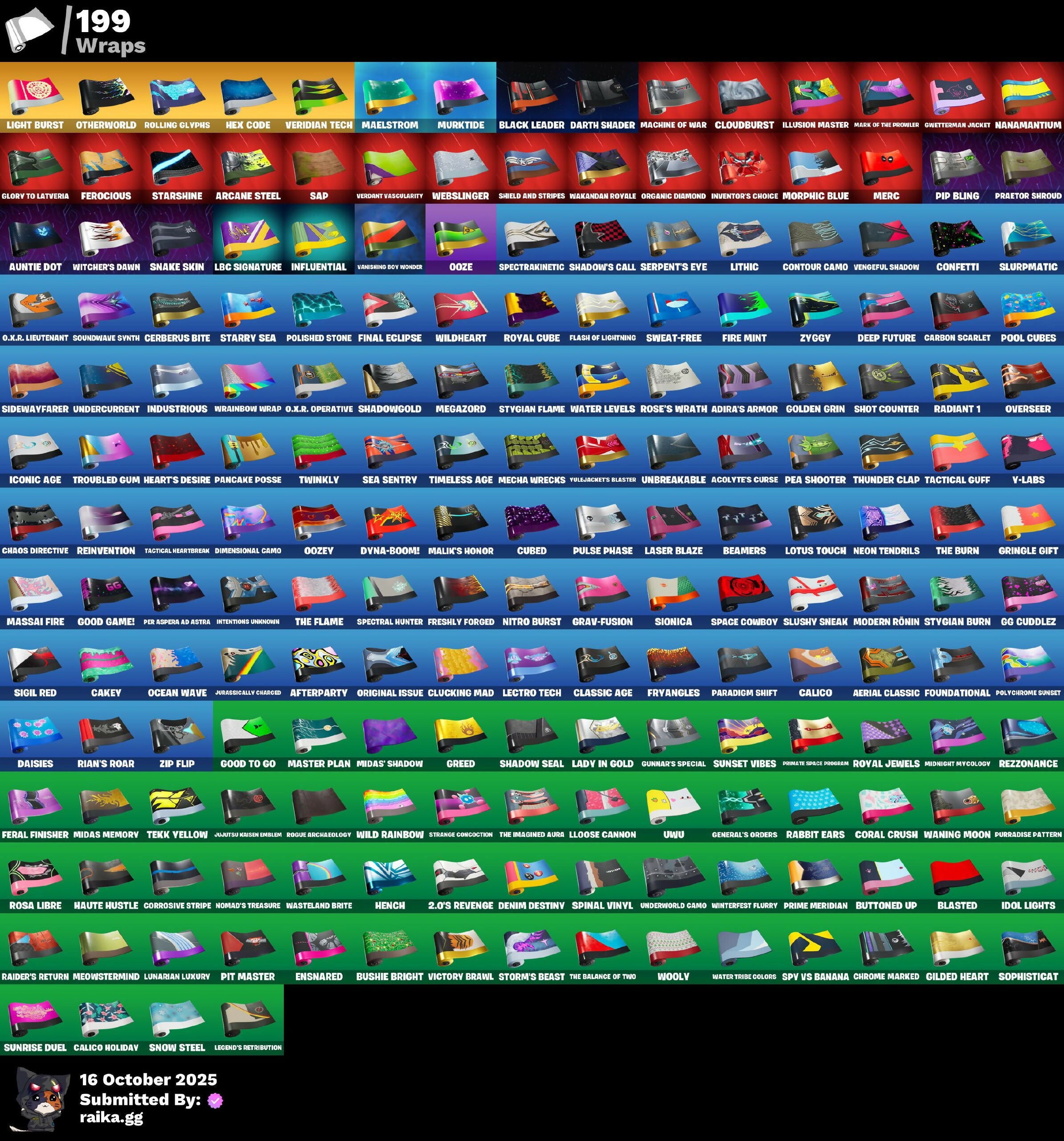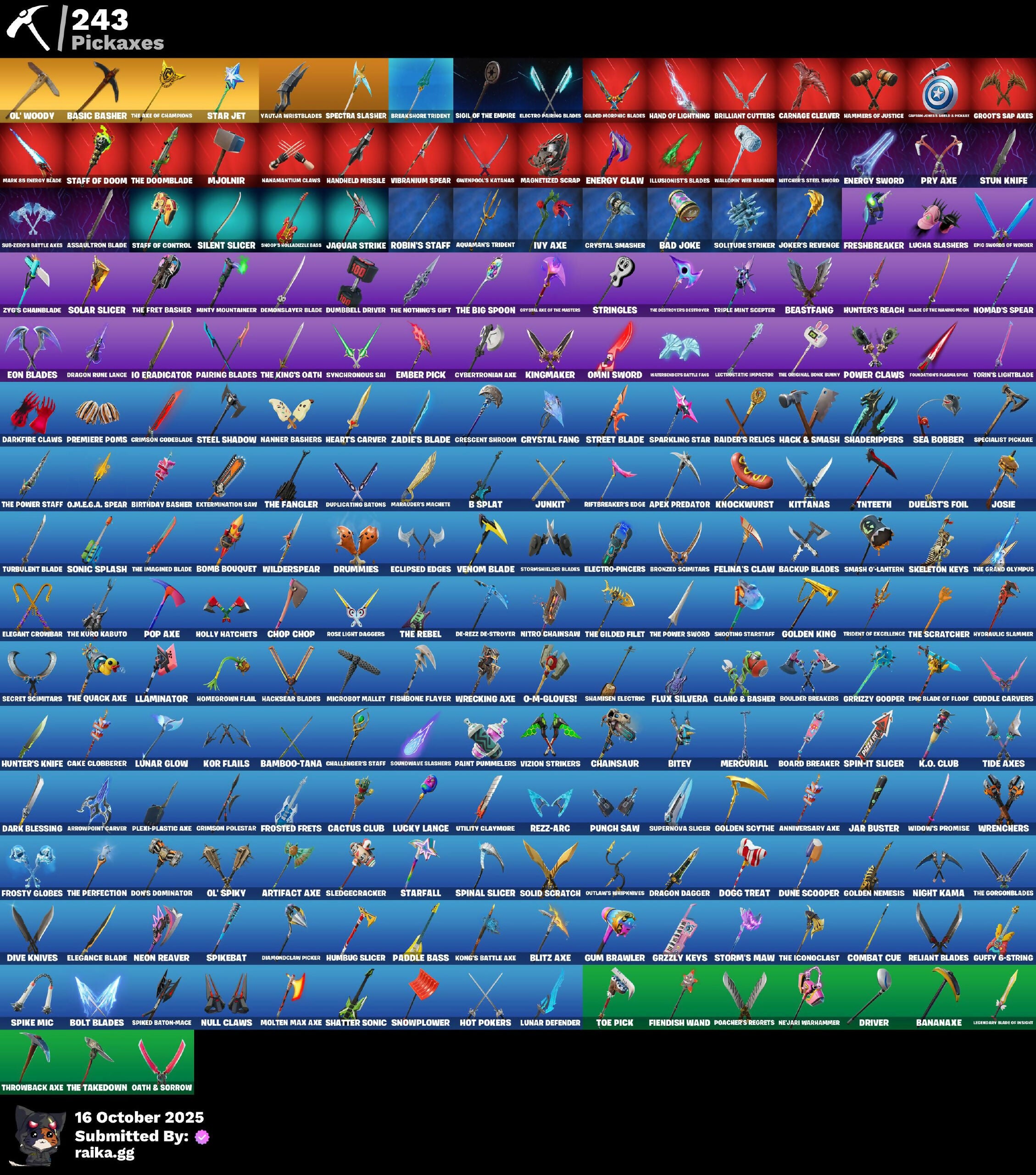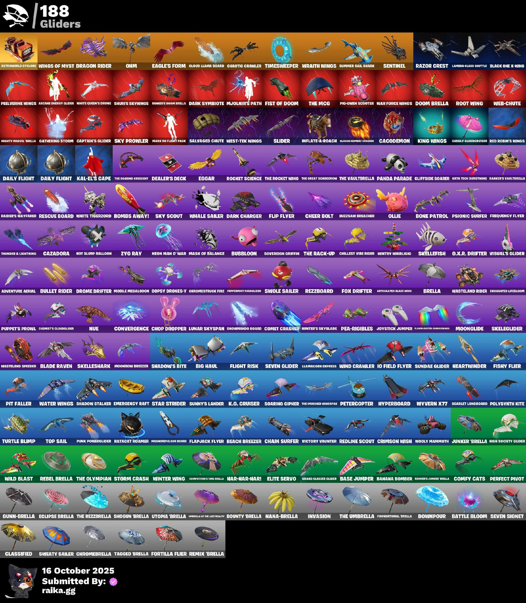 (Snikt!), 1-Ball, 2.0's Revenge, 2022, A.L.T.E.R., Abduction, Acolyte's Curse, Ad Victoriam!, Adira, Adira's Armor, Adira's Battle Flag, Adventure Aerial, Adventure Pack, Aerial, Aerial Classic, Aerial Swagger, Afterparty, Agent Jones, Agent Jones (Jump 31), Agent Nana, Agent Patch, Agent Peely, Air Shredder, Alpha Trophy, Ancestral Bloom, Anniversary Axe, Antonia, Antonia In Action, Apex Predator, Aphrodite, Appeling Drive, Aquaman, Aquaman's Trident, Arcane Energy Glider, Arcane Research, Arcane Steel, Arctic Adeline, Armored Victory, Arrowpoint Carver, Arroyo Pack, Artemis, Arthur Curry, Articulated Blade Wing, Artifact Axe, Assaultron Blade, Astro Jack, Astroworld Cyclone, Auntie Dot, Aurelian, Auto Clutch, Autobot, Autobot Emblem, Avatar's Flourish, Axo's Big Moment, B Splat, Babygirl, Back Bloom, Back-Masted Bones Away, Back-Masted Toad Tower, Backstabber, Backup Blades, Bad Joke, Balance Board, Balls of Power, Bam-Boom!, Bamboo Patch, Bamboo-Tana, Banana Bomber, Banana Briefcase, Bananaxe, Banner, Banner Icon, Baron Kane, Baron's Hoard, Base Jumper, Basecamp Bag, Basic Basher, Bat Royale, Battle Bloom, Battle Gamer Mae, Battle Mode, Battle Ready Era, Battle-Tested, Bawk Off, Be The Mastermind, Beach Breezer, Beach-Blasted Baker's Tink, Beachcomber, Beacon Glass, Beamers, Bean Bag, Bear Hug, Beastfang, Beatzbunny, Beautiful Things, Bedside Nanner, Beef Blade, Beep Beep, Belt It!, Berserker Barrage, Big Fan, Big Guns, Big Haul, Bike To Go, Birdarang Flourish, Birthday Basher, Birthday Bud, Birthday Dash, Bitey, Bitter Sweets, Black Eternal Knight, Black Hole, Black Knight T-60 Power Armor, Black Leader, Black One X-Wing, Black Panther (Shuri), Black Queen, Blackened Shield, Blade Raven, Blade of the Hanging Moon, Bladed Travpak, Blasted, Blazing Fire Cerberus, Blitz Axe, Blitz Wings, Blocko, Blowin' Up, Blustery Bag, Board Breaker, Bobo, Bolt Blades, Bomb Bouquet, Bombastic Winterfest, Bombs Away!, Bone Patrol, Boogie Down, Boomin', Boosting Ki, Boot It, Boots N' Cats, Both Eyes Open, Boulder Breakers, Bounty 'Brella, Brain Freeze, Braj.tv Competitor, Breakfast Bounty, Breaking Point, Breakshore Trident, Brella, Brilliant Cutters, Brite & Speedy, Brite Moves, Brite Raider, Bronzed Scimitars, Brutus, Bubbloon, Buffer Fish, Bug Off, Bug Punk Sunny, Bug Spray, Bullet Rider, Bun Bun Bang Bang, Bun Bun Blast, Bunsen Backburner, Burning Ambition Valeria, Bushie Bright, Buttoned Up, Buzz Pack, Buzzsaw Breacher, By The Horns, Bytes, Bytes' Sigil, Cacodemon, Cactus Club, Cake Clobberer, Cake!, Cakey, Calico, Calico Holiday, Calico-Conut, Call Me, Camo War Machine, Cap Attack, Captain America Shield & Wakaba, Captain Jones, Captain Llamerica, Captain's Glider, Carbon Fiber Holster, Carbon Scarlet, Card Drop, Cardistry, Carnage, Carnage Cleaver, Cash Grab, Cauldron Chill, Cazadora, Cazadora Wings, Cerberus, Cerberus Bite, Cerberus Medallion, Chain Surfer, Chainsaur, Chainstick Pack, Chalked Up 1-Ball, Challenger Cerberus, Challenger's Staff, Champion's Rucksack, Chaos Directive, Chaos Director, Chaotic Crawler, Charge Pack, Charlotte, Charlotte's Logo, Cheer Bag, Cheer Bolt, Chemist's Cloudglider, Chibi, Chillest Vibe Rider, Choice Knit, Chomp Cudd!!, Chompanski Wants You, Choose Naughty, Chop Chop, Chop Dropper, Choppy, Chrome Marked, Chrome Punk, Chromebrella, Chromeseed, Chromestruck Fire, Chronos Lock, Clang & Basher, Classic Age, Classic Peelverine, Classic Wolverine, Classified, Clawbox, Clawz Retro, Clean Sweep, Cliffside Soarer, Clip Show Carry-All, Cloud Llama Board, Cloudburst, Cluck, Clucking Mad, Clutch & Dagger, Codsworth's Cleanup, Coin Flip, Collector Kado Thorne, Combat Cue, Combat Elite, Combat Giller, Combat Tech Jules, Come Get Me!, Comet Crasher, Comfy Cats, Competition's Time Brella, Competitor Medusa, Competitor Rust, Conch Call, Confetti, Conjuring Mysterio, Console Cup, Contour Camo, Controlled Chaos, Controller Crew, Convergence, Coral Crush, Corrosive Stripe, Corrosive Tag, Count It!, Cowboy Chat Cube Marking, Cozy Conch, Crabby King, Crack It, Crashed Chiller, Crashed Shield, Crescent Shroom, Crimson Codeblade, Crimson Crest, Crimson Omen, Crimson Polestar, Crimson Wish, Cross Your Heart, Crowning Achievement, Crystal Axe of the Masters, Crystal Fang, Crystal Smasher, Cube Aether, Cubed, Cuddle Carvers, Cuddly Cloudcruiser, Cudole's Garden, Cursed Marionette, Cybertronian Axe, Cyclo Curl, D'ark, D.C. 63, Daigo's Stance, Daily Flight, Daisies, Dare, Dark Blessing, Dark Charger, Dark Gwenpool, Dark Symbiote, Darkfire Claws, Darklands Brite Raider, Darth Shader, Darth Vader, Datafiber Chargopack, Datafier Chargopack, Dawn Duelist Nisha, De-Rezz De-Stroyer, Deadpool, Deadpool's Katanas, Dealer's Deck, Debuggin', Deck Ducky, Deep Dive, Deep Future, Demons Beware, Demonslayer Blade, Denim Destinv, Derby Dynamo, Determined Korra, Determined Renegade, Diamond Throne, Diamondclaw Picker, Dice Roll, Dieselback Pack, Dimensional Camo, Dino Deck, Dino Megazord, Diva's Grin, Dive Knives, Division, Doctor Doom, Dogg Treat, Dolphin, Don Target, Don of the Wastes, Don't Mess with Patch, Dons Dominator, Doom, Doom Brella, Doom Chalice, Doom Slayer, Doom's Cloak, Doom's Cowl, Doom's Domain, Downpour, Dragon Dagger, Dragon Daggers Song, Dragon Radar, Dragon Rider, Dragon Rune Lance, Dragon Rune Lances, Dragon Spirit, Dramatic Flares, Dreamer's Two-Shot, Driver, Drome Drifter, Dromrunner's Trophy, Drones-y View, Droopy, Dropout, Drummies, Duelist's Foil, Duffle Dog, Dumbbell Driver, Dumbell Driver, Dune Scooper, Dupli-Kate, Duplicates, Duplicating Batons, Dusk Knight, Dyna-Boom!, Dynamic Tinting, Dynamite, Dynamo, Dynamo Gray-Suit, E.G.O., Eagle's Form, Eclipse Brella, Eclipsed Edges, Eggar, Electric Shredder, Electro Pairing Blades, Electro-Pincers, Electrostatic Impactor, Elegance Blade, Elegant Crowbar, Elemental Cycle, Elite Servo, Ember Pick, Emergency Raft, Emma Frost, Emma's Influence, Enchanted Lifebloom, Endless Scroll, Energy Claw, Energy Sword, Ensnared, Eon Blades, Epic Blad