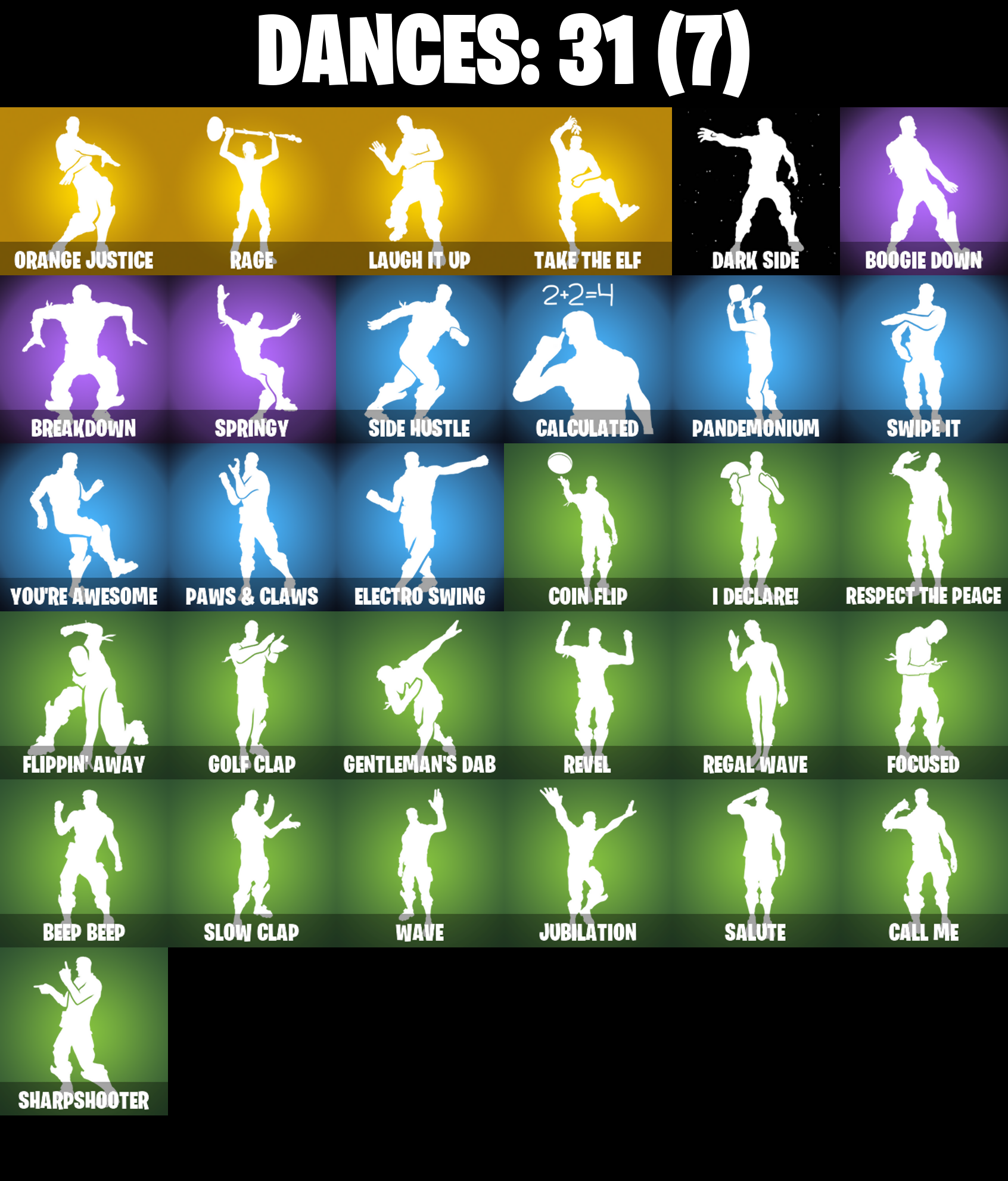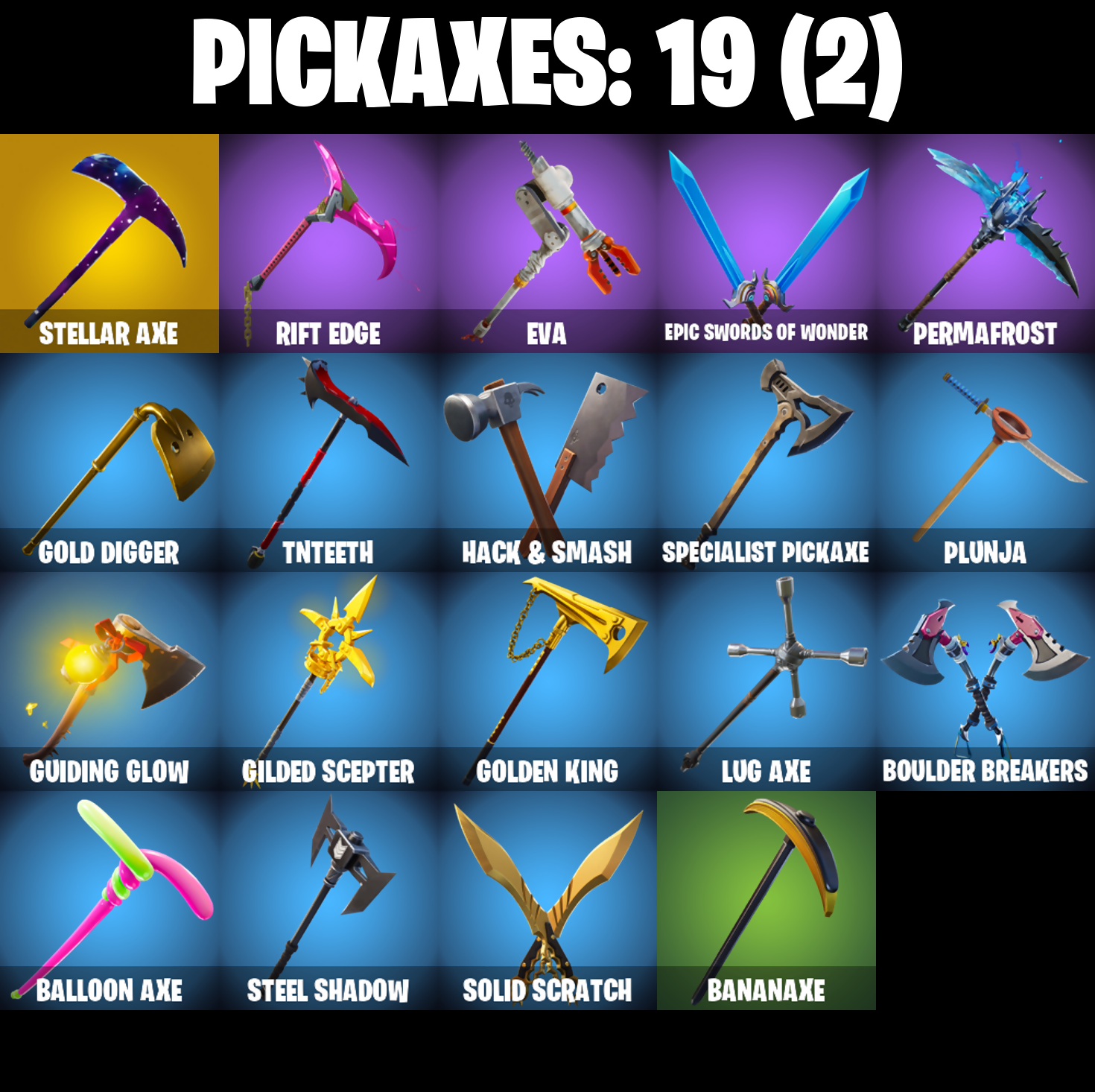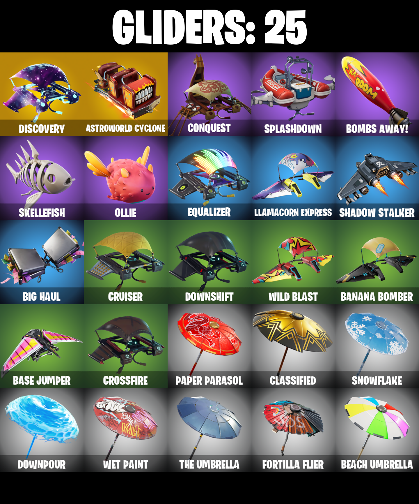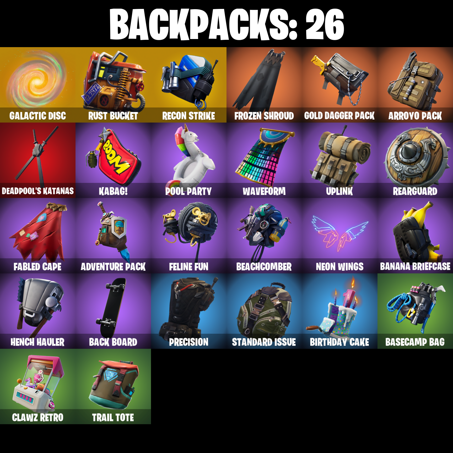 Adventure Pack, Agent Peely, Arroyo Pack, Astroworld Cyclone, Aura, Back Board, Balloon Axe, Banana Bomber, Banana Briefcase, Bananaxe, Base Jumper, Basecamp Bag, Beach Umbrella, Beachcomber, Beep Beep, Big Haul, Birthday Cake, Bombs Away!, Boogie Down, Boulder Breakers, Breakdown, Calculated, Call Me, Classified, Clawz Retro, Coin Flip, Conquest, Crossfire, Cruiser, Dark Side, Deadpool, Deadpool Unmasked, Deadpool's Katanas, Discovery, Downpour, Downshift, Drift, Drift Stage 5, Electro Swing, Epic Swords Of Wonder, Equalizer, Eva, Fabled Cape, Feline Fun, Flippin' Away, Focused, Fortilla Flier, Frozen Shroud, Galactic Disc, Galaxy, Gear Specialist Maya, Gear Specialist Maya (Hat - Dark), Gentleman's Dab, Gilded Scepter, Gold Brutus, Gold Dagger Pack, Gold Digger, Gold Meowscles, Gold Midas, Gold Tntina, Golden King, Golf Clap, Guiding Glow, Hack & Smash, Hench Hauler, Huntress, I Declare!, Jubilation, Kabag!, Laugh It Up, Llamacorn Express, Lug Axe, Neon Wings, Ollie, Orange Justice, Pandemonium, Paper Parasol, Paws & Claws, Permafrost, Plunja, Point Patroller, Pool Party, Precision, Rage, Ragnarok, Raonaron (No Shoulder Pad), Rearguard, Recon Strike, Red Jade, Redline, Regal Wave, Respect The Peace, Revel, Rift Edge, Rook, Rust Bucket, Salute, Shadow Stalker, Sharpshooter, Side Hustle, Skellefish, Skye, Sledgehammer, Slow Clap, Snowflake, Solid Scratch, Specialist Pickaxe, Splashdown, Springy, Standard Issue, Steel Shadow, Stellar Axe, Sun Strider, Swipe It, Take The Elf, The Umbrella, Tnteeth, Trail Tote, Uplink, Wave, Waveform, Wet Paint, Wild Blast, You're Awesome
