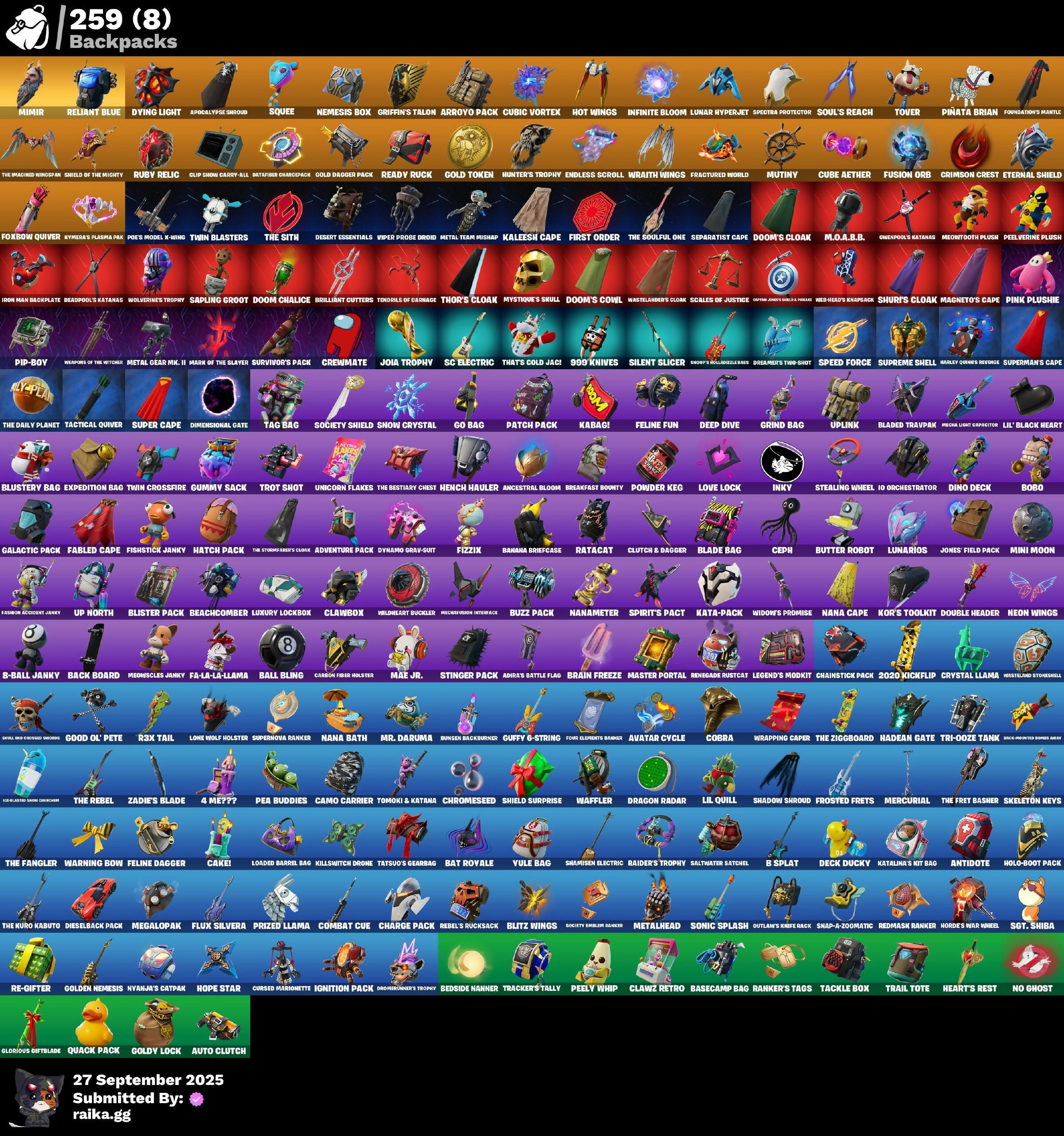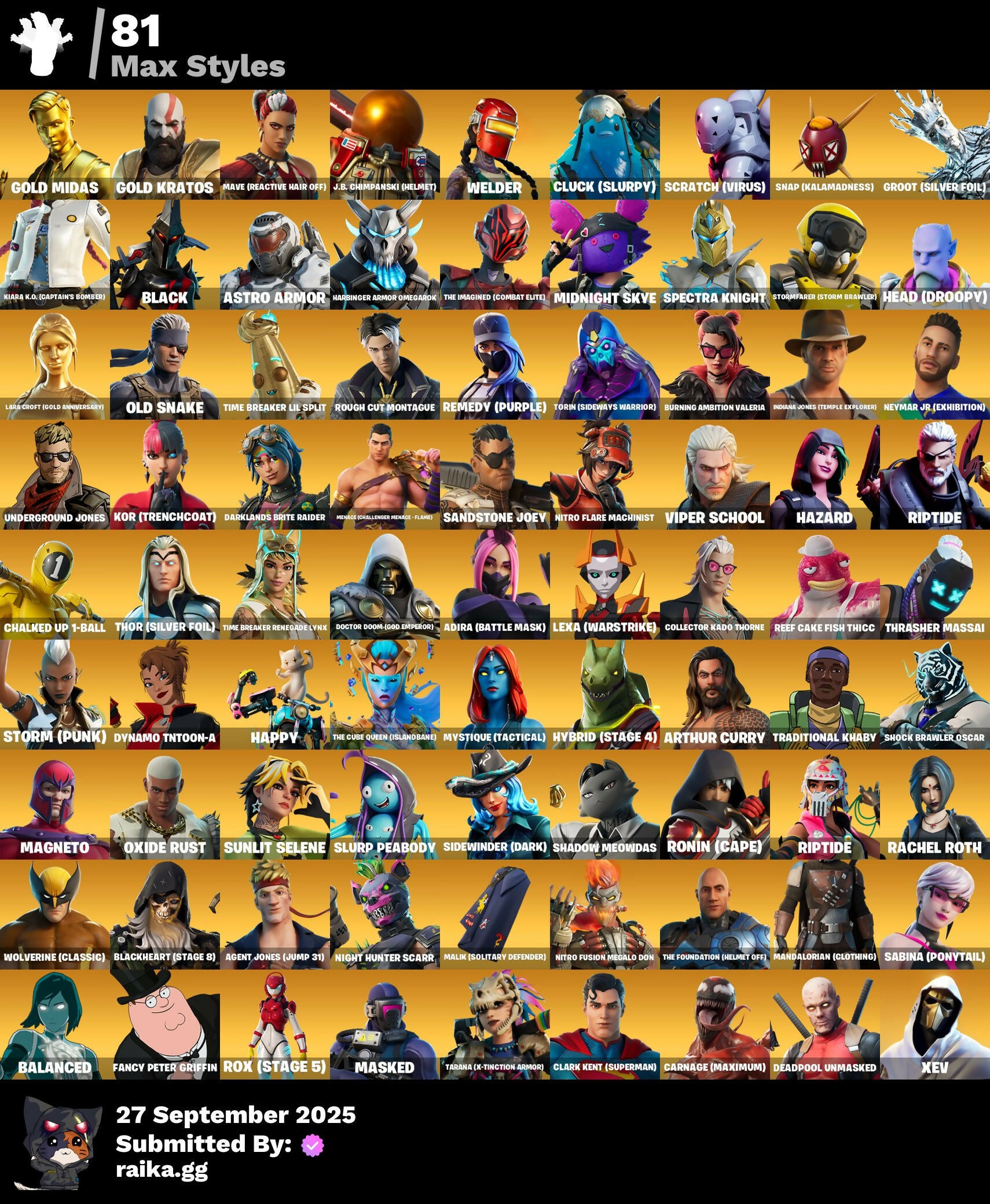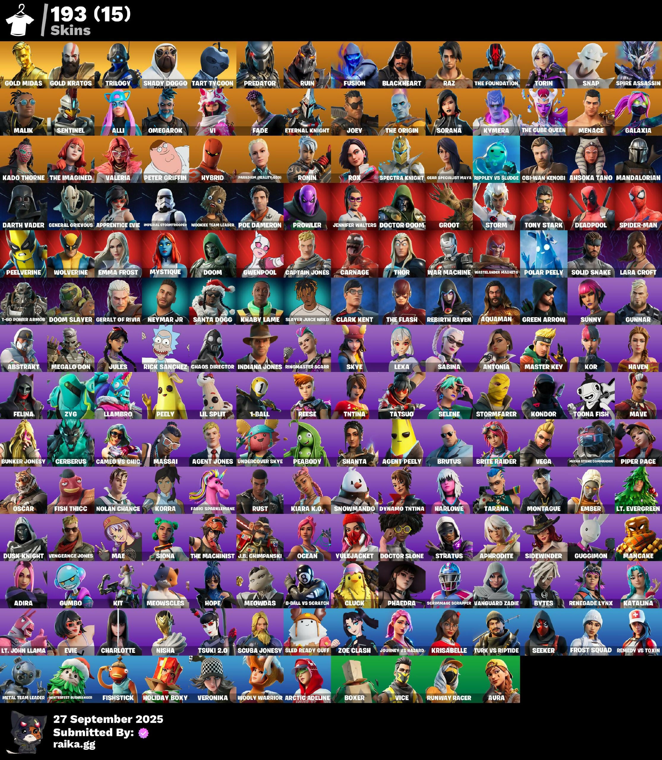 [PC/PSN/XBOX] 193 skins | Gold Midas | Gold Kratos | Trilogy | Shady Doggo | Tart Tycoon | Predator | Ruin | Fusion | Blackheart | Raz | The Foundation | 1050 VB / FN