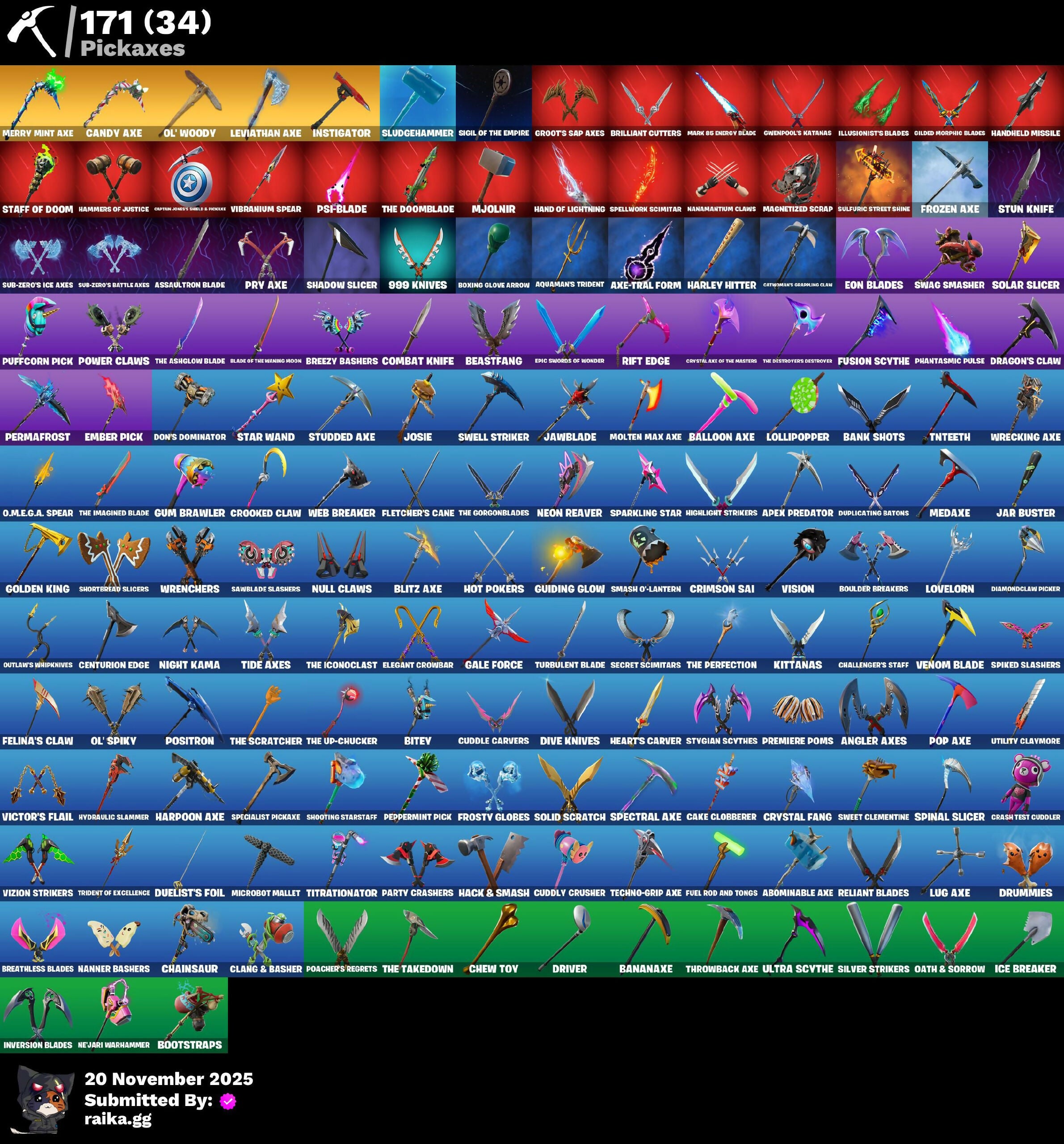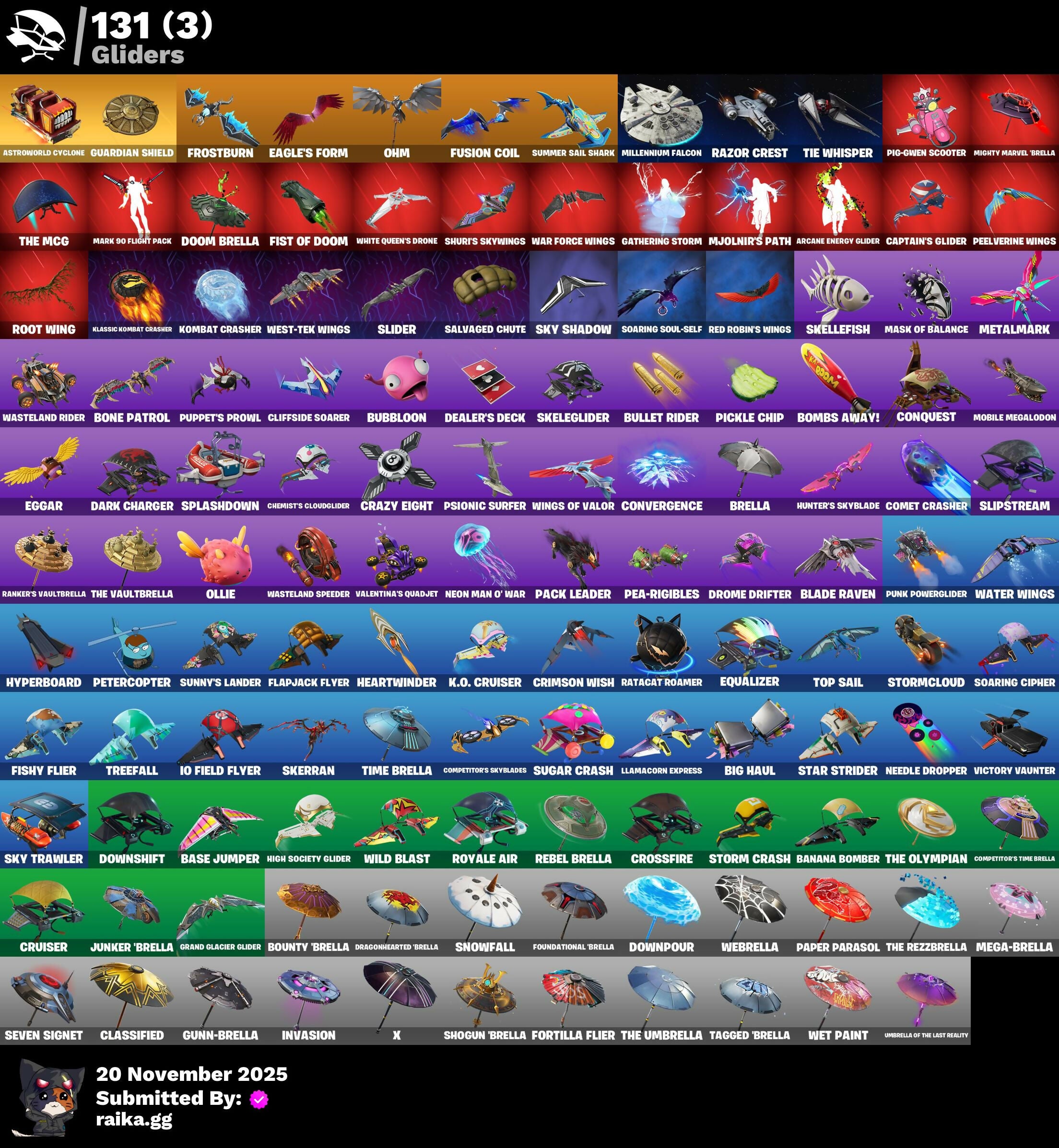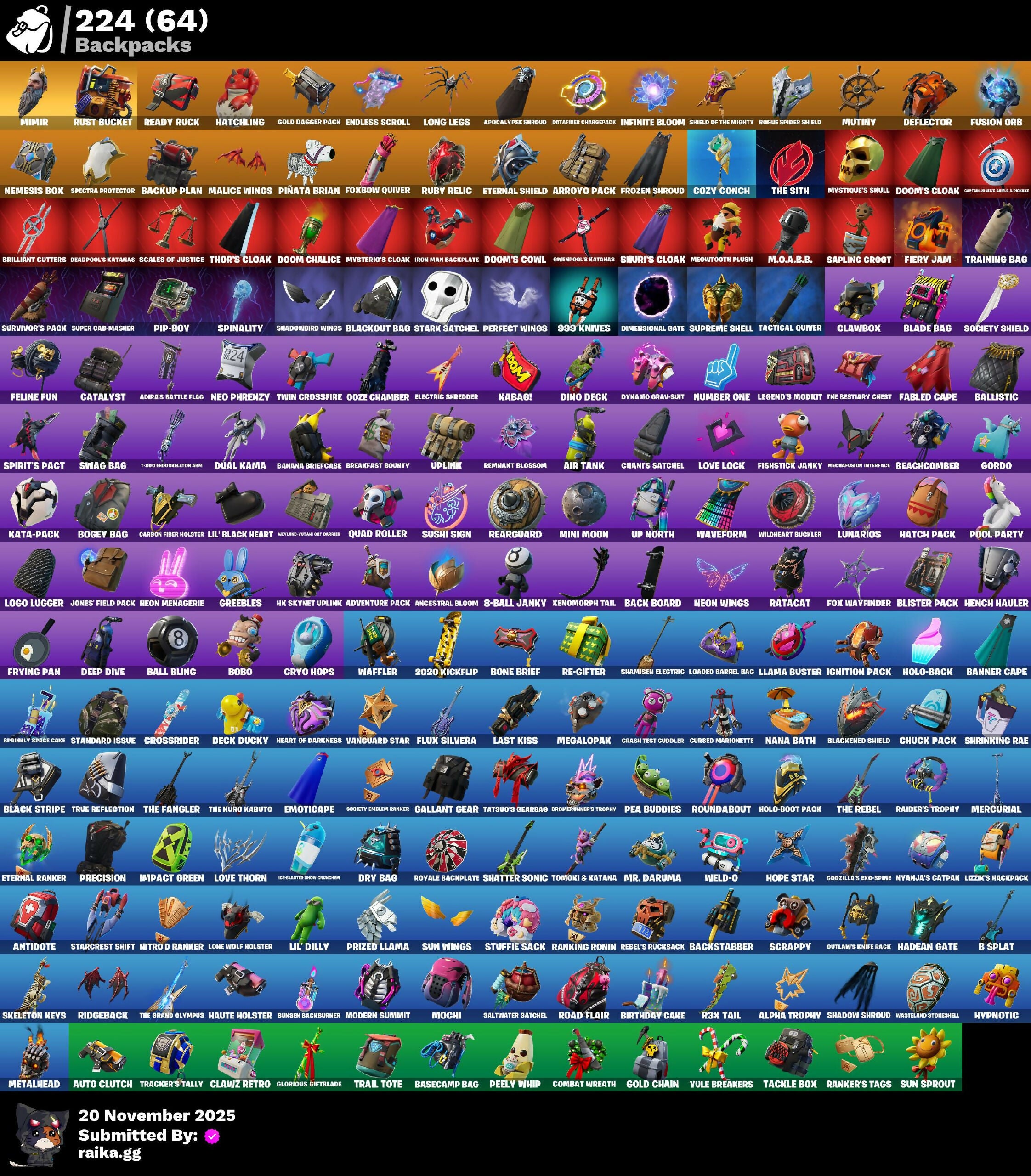 (Snikt!), 2020 Kickflip, 8-Ball Janky, 8-Ball vs Scratch, 999 Knives, A Warrior Prepares, Abominable Axe, Adira's Battle Flag, Adventure Pack, Agent Jones, Agent Peely, Air Shredder, Air Tank, Alpha Trophy, Ancestral Bloom, Angler Axes, Antidote, Apex Predator, Apocalypse Shroud, Aquaman, Aquaman's Trident, Arachne, Arcane Energy Glider, Arctica, Arroyo Pack, Assaultron Blade, Astro Assassin, Astroworld Cyclone, Athleisure Assassin, Aura, Auto Clutch, Axe-Tral Form, Azarath Metrion Zinthos!, B Splat, Bachii, Back Board, Backlash, Backstabber, Backup Plan, Ball Bling, Ballistic, Balloon Axe, Banana Bomber, Banana Briefcase, Bananaxe, Bank Shots, Banner Cape, Baron's Hoard, Base Jumper, Basecamp Bag, Battlehawk, Beachcomber, Bean Bag, Bear Hug, Beastfang, Beep Beep, Big Dill, Big Haul, Birdie, Birthday Cake, Bitev, Black Stripe, Blackened Shield, Blackheart, Blackout Bag, Blade Bag, Blade Raven, Blade of the Waning Moon, Blister Pack, Blitz Axe, Bobo, Bogey Bag, Boing!, Bombs Away!, Bone Brief, Bone Patrol, Boogie Down, Boomin', Boots'n' Cats, Bootstraps, Boulder Breakers, Bounty 'Brella, Boxing Glove Arrow, Brainiac, Breakdown, Breakfast Bounty, Breaking Point, Breathless Blades, Breezy Bashers, Brella, Brilliant Cutters, Bring It Around, Brite Moves, Brite Raider, Britestorm Bomber, Brute Gunner, Brutus, Bubbloon, Buckle Up, Bullet Rider, Bullseye, Bunsen Backburner, Cake Clobberer, Calculated, Call Me, Cameo vs Chic, Candy Axe, Captain America, Captain Jones, Captain Jones's Shield & Pickaxe, Captain's Glider, Carbide, Carbon Fiber Holster, Card Drop, Cardistry, Carefree, Cassidy Quinn, Catalyst, Catwoman's Grappling Claw, Centurion, Centurion Edge, Chainsaur, Challenger's Staff, Chan's Satchel, Chani, Chaos Agent, Chemist's Cloudglider, Chew Toy, Chill Count, Chopper, Chuck Pack, Chugga-Chugga, Chun-Li, Cimere, Clang & Basher, Classified, Clawbox, Clawz Retro, Clean Sweep, Cliffside Soarer, Clix Groove, Cluck, Codsworth's Cleanup, Coin Flip, Combat Knife, Combat Wreath, Comet Crasher, Competitor's Skyblades, Competitor's Time Brella, Conquest, Controller Crew, Convergence, Cozy Conch, Crash Test Cuddler, Crazy Eight, Crimson Sai, Crimson Wish, Crooked Claw, Crossfire, Crossrider, Cruiser, Cryo Hops, Crystal, Crystal Axe of the Masters, Crystal Fang, Cuddle Carvers, Cuddly Crusher, Cursed Marionette, Cyberdyne Salute, Cyclo Curl, Dagger Dance, Dali, Dancin' Domino, Dark Charger, Dark Doggo, Datafiber Chargepack, Deadpool, Deadpool's Katanas, Dealer's Deck, Deck Ducky, Deep Dive, Deflector, Derby Dynamo, Diamond Throne, Diamondclaw Picker, Dill With It, Dimensional Gate, Dino Deck, Dive Knives, Doctor Doom, Don's Dominator, Don't Start Now, Doom, Doom Brella, Doom Chalice, Doom's Cloak, Doom's Cowl, Doom's Domain, Downpour, Downshift, Doze Dab, Dragon Stance, Dragon's Claw, Dragonhearted 'Brella, Dream Feet, Dribblin', Drift, Driver, Drome Drifter, Dromundripper's Trophy, Droop, Drummies, Dry Bag, Dual Kama, Duelist's Card Trick, Duelist's Foil, Dupli-Kate, Duplicating Batons, Duplikates, Dynamo, Dynamo Grav-Suit, Eagle's Form, Echo, Eclipse, Eggar, Electric Shredder, Electro Shuffle, Elegant Crowbar, Ellen Ripley, Ember Pick, Emma Frost, Emoticape, Endless Scroll, Envoy, Eon Blades, Epic Swords of Wonder, Equalizer, Eternal Knight, Eternal Ranker, Eternal Shield, Evasive Maneuvers, Evil Plan, Explorer Emilie, Fabled Cape, Fade, Felina, Felina's Claw, Feline Fun, Fiery Jam, Fire Show, Fireworks Salvo, Fishin', Fishstick, Fishstick Janky, Fishy Flier, Fist Bump, Fist Of Doom, Flapjack Flyer, Fletcher Kane, Fletcher's Cane, Flippin' Away, Flux Silvera, Focus, Foil Flex, Fortilla Flier, Foundational 'Brella, Fox Wayfinder, Foxbow Quiver, Frostburn, Frosty Globes, Frozen Axe, Frozen Shroud, Frozen Treat Cart, Frying Pan, Fuel Rod and Tongs, Fusion, Fusion Coil, Fusion Orb, Fusion Scythe, Gale Force, Gallant Gear, Gathering Storm, Gear Specialist Maya, Gentleman's Dab, Get Griddy, Gilded Morphic Blades, Glorious Giftblade, Go Home!, Godzilla's Exo-Spine, Gold Chain, Gold Dagger Pack, Gold Kratos, Gold Midas, Golden King, Golf Clap, Gordo, Grand Glacier Glider, Greebles, Green Arrow, Greenpool's Katanas, Groot, Groot's Sap Axes, Guardian Shield, Guiding Glow, Gum Brawler, Gunn-Brella, Gwen-Step, Gwenpool, Gwenpool's Katanas, HK Skynet Uplink, Hack & Smash, Hadean Gate, Hammers of Justice, Hand of Lightning, Handheld Missile, Harley Hitter, Harley Quinn, Harpoon Axe, Hatch Pack, Hatchling, Haute Holster, Havoc, Haze, Heart Sign, Heart of Darkness, Heart's Carver, Heartwinder, Hellfire Dance, Hench Hauler, High Five, High Society Glider, Highlight Strikers, Hit It, Holiday Boxy, Holo-Back, Holo-Boot Pack, Hope, Hope Star, Hot Marat, Hot Pokers, Hula Hoopin', Hunter's Skyblade, Huntress, Hush, Hybrid, Hydraulic Slammer, Hyperboard, Hypnotic, I Declare!, I'm A Mystery, IO Field Flyer, Ice Breaker, Icy-Bolsted Snow Grunchem, Ignition Pack, Illusionist's Blades, Impact Green, Imperial March, Infinite Bloom, Instigator, Invasion, Inversion Blades, Iris, Iron Man Backplate, It Is Finished, It's Chemistry!, It's Go Time!, It's... You?, Jar Buster, Jawblade, Jennifer Walters, Jet Signals, Jolly Jammer, Jones' Field Pack, Josie, Joss, Journey vs Hazard, Jules, Junker 'Brella, K.O. Cruiser, Kabag!, Kata-Pack, Keep It Mello, Keisha Cross, Keyed Up, Kit, Kite!, Kittanas, Klassic Kombat Crasher, Knife Sharpener, Kombat Crasher, Kondor, Kuno, Kyra, Lara Croft, Last Forever, Last Kiss, Laugh It Up, Legend's Modkit, Leviathan Axe, Lexa, Lil' Black Heart, Lil' Bounce, Lil' Dilly, Lizzik, Lizzik's Hackpack, Llama Buster, Llamacorn Express, Llambro, Loaded Barrel Bag, Logo Lugger, Lollipopper, Lone Wolf Holster, Long Legs, Love It!, Love Lock, Love Thorn, Lovelorn, Lt. Evergreen, Lug Axe, Lunarios, M.O.A.B.B., Magnetized Scrap, Major Mancake, Make A Seat, Malice, Malice Wings, Mancake, Mandalorian, Manic, Mark 85 Energy Blade, Mark 90 Flight Pack, Mashed Potato, Mask Of Balance, Mave, Me & You, Mechafusion Interfa