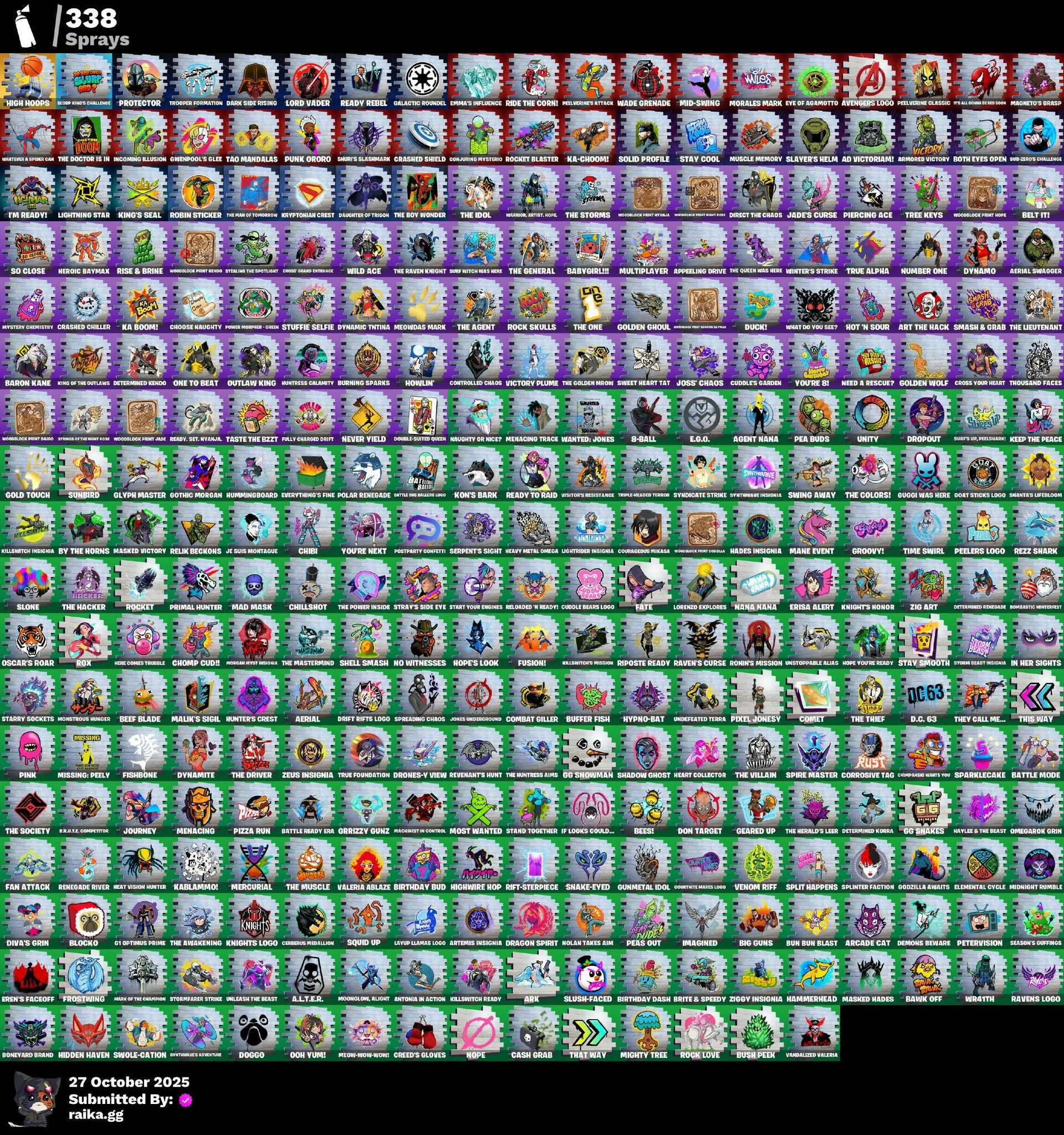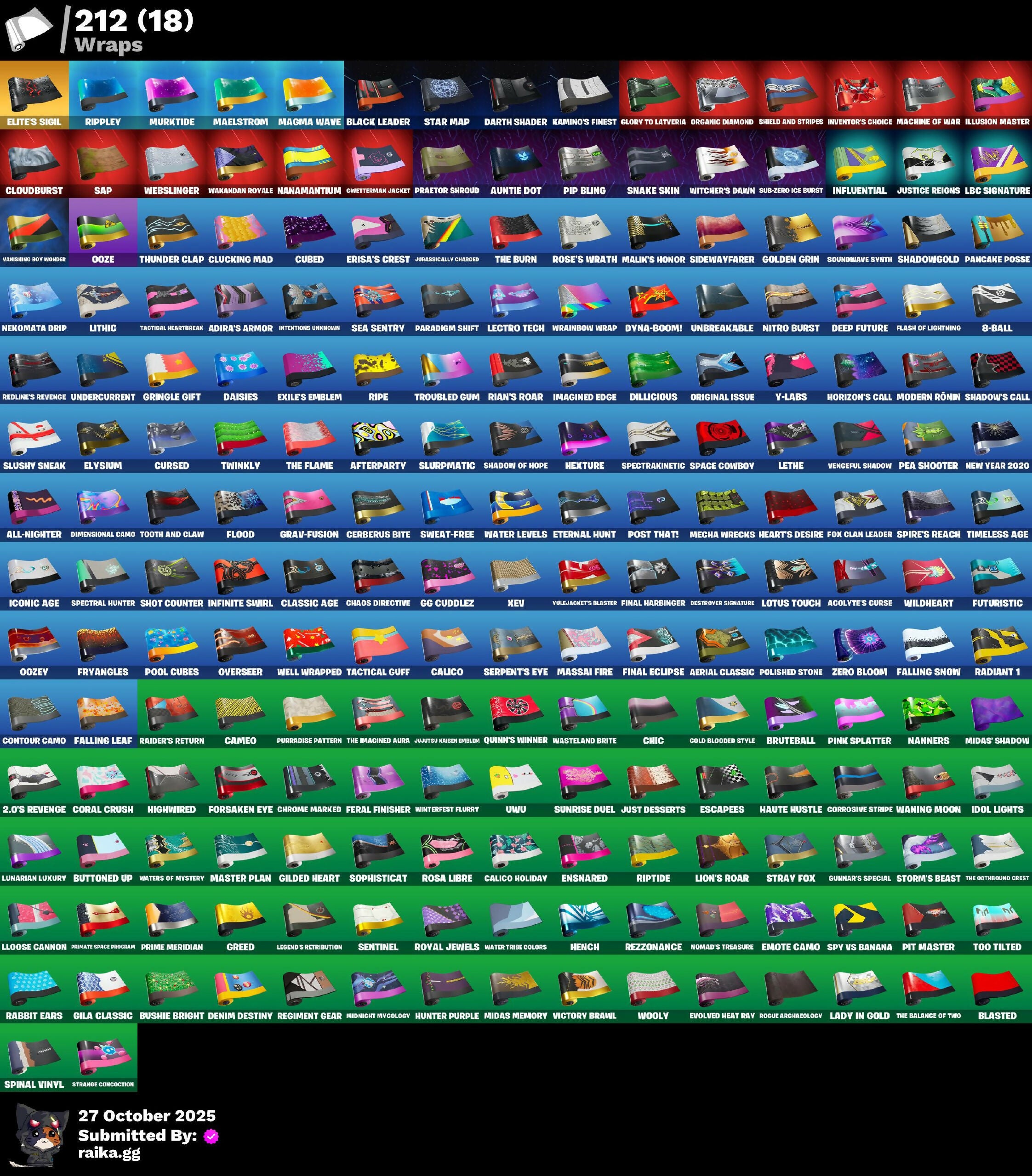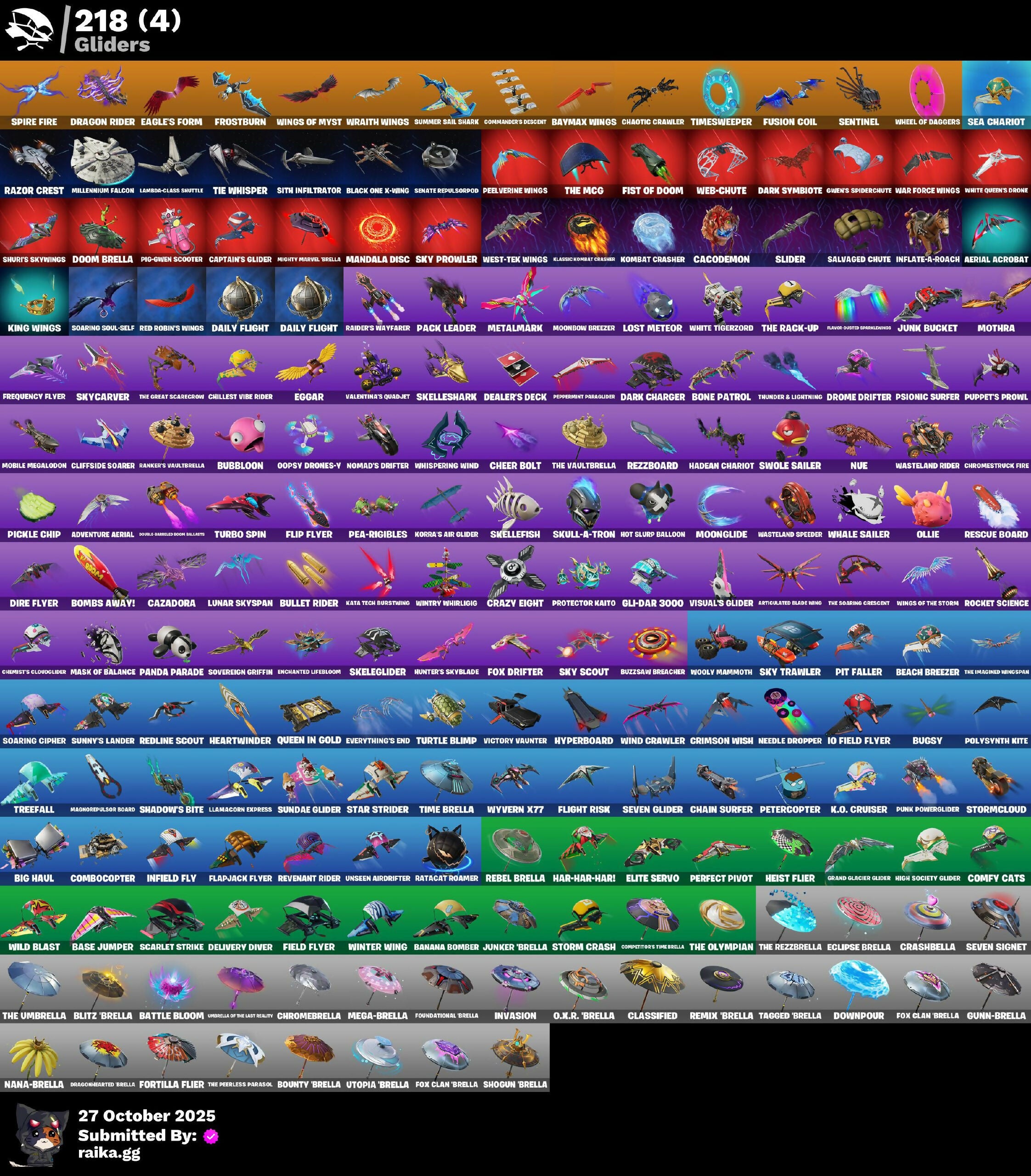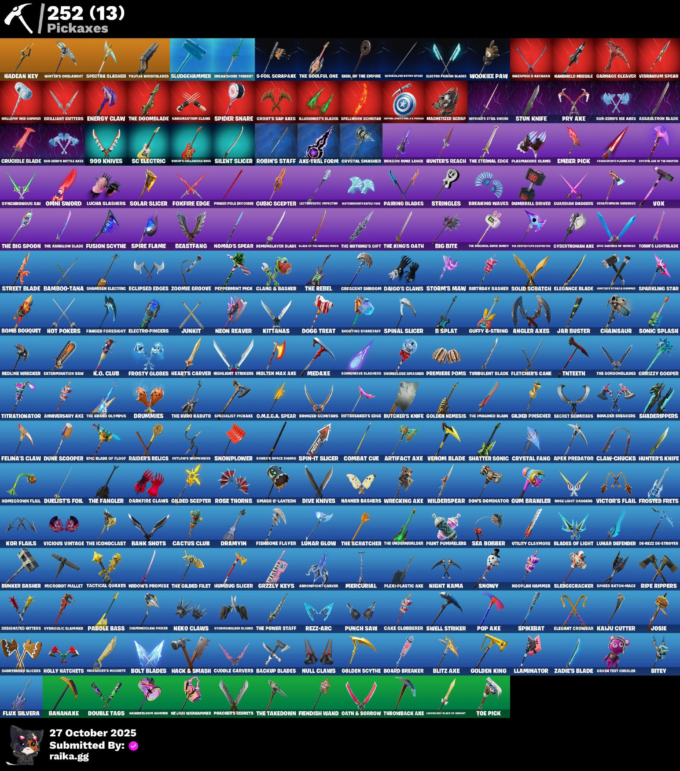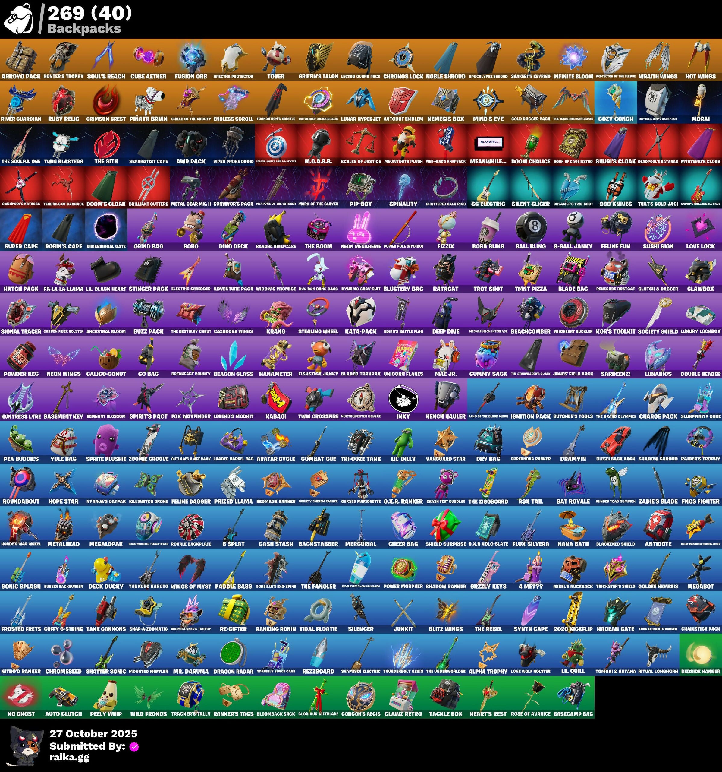 (Snikt!), 1-Ball, 10 Field Flyer, 2.0's Revenge, 2020 Kickflip, 4 Me???, 8-Ball, 8-Ball Janky, 8-Ball Vs Scratch, 999 Knives, A Warrior Prepares, A.L.T.E.R., AWR Pack, Acolyte's Curse, Ad Victoriam!, Adira, Adira's Armor, Adira's Battle Flag, Adventure Aerial, Adventure Pack, Aerial, Aerial Acrobat, Aerial Classic, Aerial Swagger, Afterparty, Agent Jones, Agent Jones (Jump 31), Agent Nana, Agent Peely, Ahsoka Tano, All-Nighter, Alpha Trophy, Ancestral Bloom, Angler Axes, Anniversary Axe, Antidote, Antonia, Antonia In Action, Apex Predator, Aphrodite, Apocalypse Shroud, Appeeling Drive, Arachrobatics, Arcade Cat, Arcane Research, Arctic Adeline, Ark, Arrowpoint Carver, Arroyo Pack, Art The Hack, Artemis, Artemis Insignia, Articulated Blade Wing, Artifact Axe, Ascend!, Ascension Nezumi, Assaultron Blade, Astro Armor, Astro Jack, Auntie Dot, Aurelian, Auto Clutch, Autobot, Autobot Emblem, Avatar Cycle, Avatar's Flourish, Avengers Logo, Axe-Tral Form, Azarath Metrion Zinthos!, B Splat, B.R.U.T.E. Competitor, Babygirl!!, Back-Injected Bombs Away, Back-Injected Turbo Tuner, Backstabber, Backup Blades, Bacon, Bad Guy, Balance Board, Balanced, Ball Bling, Ball Control, Ballsy, Bamboo-Tana, Banana Bomber, Banana Briefcase, Bananaxe, Bank Shots, Banner, Baron Kane, Baron's Hoard, Base Jumper, Baseball, Basecamp Bag, Basement Key, Basketball Hoop, Bat Royale, Battle Blessing, Battle Bloom, Battle Bus Brailers Logo, Battle Mode, Battle Ready Era, Battle-Tested, Bawk Off, Baymax Wings, Beach Breezer, Beach Chair, Beachcomber, Beacon Glass, Bean Bag, Beastfang, Beatzbunny, Bedside Nanner, Beef Blade, Beep Beep, Bees!, Belt It!, Bi-Han, Big Bite, Big Dill, Big Guns, Big Haul, Bike To Go, Birdarang Flourish, Birthday Basher, Birthday Bud, Birthday Dash, Bitey, Black Hole, Black Knight T-60 Power Armor, Black Leader, Black One X-Wing, Black Panther (Shuri), Black Queen, Blackened Shield, Blade Bag, Blade Of The Waning Moon, Bladed Trapvak, Blades Of Light, Blasted, Blazing Fire Cerberus, Blinding Lights, Blitz Axe, Blitz Wings, Blitz' Brella, Blocko, Bloomback Sack, Blowin' Up, Blustery Bag, Board Breaker, Boba Bling, Boba Snack, Bobo, Boing!, Bolt Blades, Bomb Bouquet, Bombastic Huntress, Bombs Away!, Bone, Bone Patrol, Boneyard Brand, Boogie Down, Book Of Cagliostro, Boomin', Boosting KI, Boots'n'Cats, Both Eyes Open, Boulder Breakers, Bounty 'Brella, Breakfast Bounty, Breaking Point, Breaking Waves, Breakshore Trident, Brilliant Cutters, Brite & Speedy, Brite Moves, Brite Raider, Bronzed Scimitars, Bruteball, Brutus, Bubbloon, Buffer Fish, Bugsy, Bullet Rider, Bullpen Brawler Dusty, Bun Bun Bang Bang, Bun Bun Blast, Bunker Basher, Bunker Jonesy, Bunsen Backburner, Burning Ambition Valeria, Burning Sparks, Bush Peek, Bushie Bright, Butcher's Knife, Butcher's Tools, Buttoned Up, Buzz Pack, Buzzsaw Breacher, By The Horns, Bytes, Bytes' Sigil, Cacodemon, Cactus Club, Caffeinated, Cake Clobberer, Calico, Calico Holiday, Calico-Coconut, Calico-Conut, Call Me, Called Shot, Cameo, Cameo Vs Chic, Camo War Machine, Captain America's Shield, Captain Johnson's Plush & Pickles, Captain Jones, Captain Jones (Fn & Juk), Captain Jonesy’s Shell & Pickaxe, Captain L America, Captain's Glider, Carbon Fiber Holster, Card Drop, Cardistry, Carnage, Carnage Cleaver, Cash Grab, Cash Stash, Cassidy Quinn, Catalyst, Cauldron Chill, Cazadora, Cazadora Wings, Cerberus, Cerberus Bite, Cerberus Medallion, Chain Surfer, Chainsaur, Chainstick Pack, Chalked Up 1-Ball, Challenger Menace - Flame, Chaos Directive, Chaos Director, Chaotic Crawler, Charge Pack, Charlotte, Charlotte's Logo, Cheer Bag, Cheer Bolt, Chef's Special, Chemist's Cloakglider, Chibi, Chic, Chillest Vibe Rider, Chillshot, Choice Knit, Chomp Cudd!, Choose Naughty, Choppy, Chrome Marked, Chrome Punk, Chromebrella, Chromeseed, Chromestruck Fire, Chronos Lock, Chum Chums, Clang & Basher, Classic Age, Classic Peelverine, Classified, Claw-Chucks, Clawbox, Clawz Retro, Clean Sweep, Cliffside Soarer, Cloudburst, Club President Helsie, Cluck, Cluck (Slurpy), Cluck Strut, Clucking Mad, Clutch & Dagger, Codsworth's Cleanup, Coin Flip, Cold Blooded Style, Collector Kado Thorne, Combat Cue, Combat Elite, Combat Giller, Combocopter, Comet, Comfy Cats, Commander's Descent, Competitor's Timebrella, Computer 2 Season 1 Level 153, Conch Call, Conjuring Mysterio, Contour Camo, Controlled Chaos, Coral Crush, Corrosive Stripe, Corrosive Tac, Corrupted, Count It!, Courageous Mikasa, Courtier Mates Logo, Cowboy Chat, Cozy Conch, Crack It, Crash Test Cuddler, Crashbella, Crashed Chiller, Crashed Shield, Crazy Eight, Creed's Gloves, Crescent Shroom, Crimson Crest, Crimson Wish, Cross Your Heart, Cross' Grand Entrance, Crowning Achievement, Crucible Blade, Crystal Axe Of The Master, Crystal Fang, Crystal Smasher, Cube Aether, Cube Marking, Cubed, Cubic Scepter, Cuddle Bears Logo, Cuddle Carvers, Cuddle’s Garden, Cursed, Cursed Marionette, Cybertronian Axe, Cyclo Curl, D.C. 63, Dagger Dance, Daigo, Daigo's Claws, Daily Flight, Daisies, Dark Charger, Dark Gwenpool, Dark Side Rising, Dark Symbiote, Darkfire Claws, Darklands Brite Raider, Darth Shader, Darth Vader, Datafiber Chargepack, Daughter Of Trigon, Dawn Duelist Nisha, De-Rezz De-Stroyer, Deadpool, Deadpool's Katanas, Dealer's Deck, Dealm' Cassidy Quinn, Deck Ducky, Deep Dab, Deep Dive, Deep Future, Delivery Diver, Demon Hunter Hope, Demon Slayer Blade, Demons Beware, Denim Destiny, Designated Hitters, Destroyer Signature, Determined Kendo, Determined Korra, Determined Renegade, Diamond Shapes, Diamond Throne, Diamondclaw Picker, Dice Roll, Dieselback Pack, Dill With It, Dillicious, Dillinger The Gherk, Dimensional Camo, Dimensional Gate, Dino Deck, Dire Flyer, Direct The Chaos, Dirtbike Challenge, Diva's Grin, Dive Knives, Do The Split, Dogg Treat, Doggo, Don Target, Don's Dominator, Doom, Doom Brella, Doom Chalice, Doom Slayer, Doom's Cloak, Doom's Domain, Double Header, Double Tags, Double-Barreled Boom Ballists, Double-Suited Quee