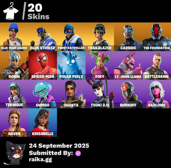 [PC/PSN/XBOX] 20 skins | Blue Team Leader | Blue Striker | Point Patroller | Trailblazer | Carbide | The Foundation | Ronin | Spider-Man | Polar Peely | Zoey | 600 VB / FN