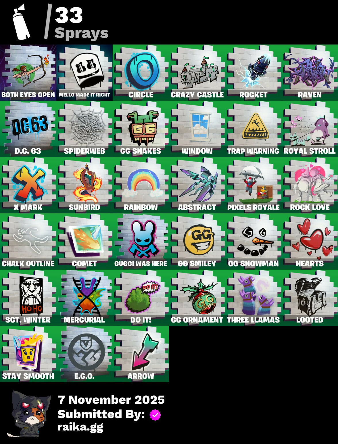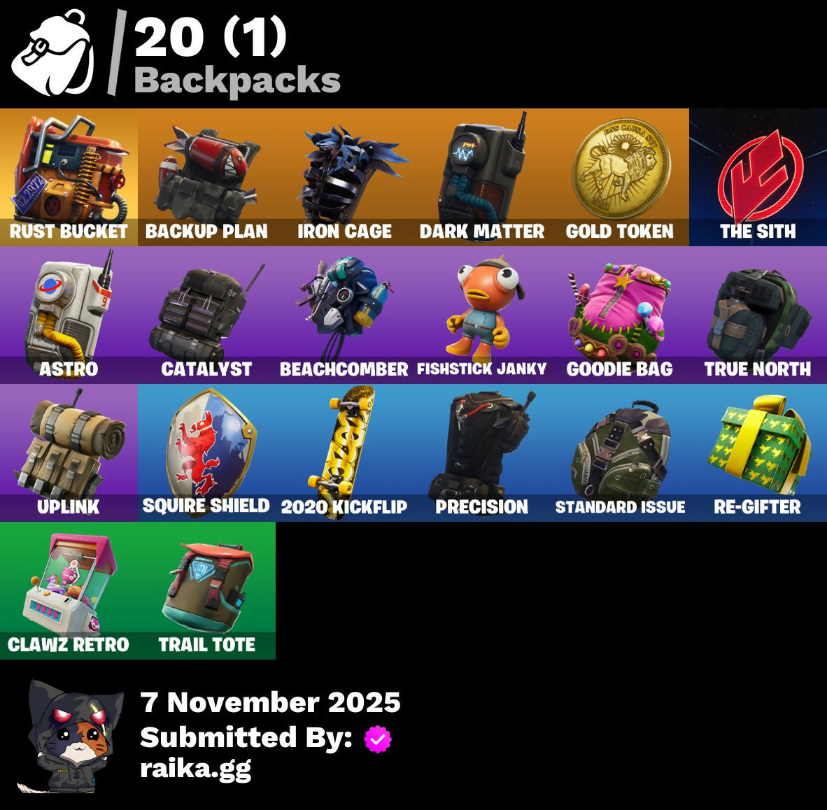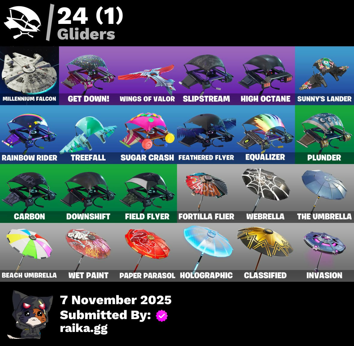 2020 Kickflip, Abstract, Agent Jones, Arrow, Astro, Backup Plan, Banner, Banner Icon, Battlehawk, Beach Umbrella, Beachcomber, Bee, Best Mates, Blue Squire, Boogeyman, Both Eyes Open, Breaking Point, Bush, Call Me, Carbide, Carbon, Cat Soldier, Catalyst, Chains, Chalk Outline, Chick, Circle, Classified, Clawz Retro, Clean Sweep, Comet, Compass, Crab, Crazy Castle, Cuddly Bear, D.C. 63, Dark Matter, Dark Voyager, Dinosaur Skull, Do It!, Dog Bowl, Dog Collar, Downshift, Dragon, Duck, E.G.O., Eagle, Egg, Elite Agent, Equalizer, Eva, Falcon, Falling Leaf, Feathered Flyer, Fence, Field Flyer, Fish Hook, Fishstick Janky, Flail, Flippin' Away, Fortilla Flier, Freestylin', Fresh, Fryangles, Gale Force, Gentleman's Dab, Get Down!, Gg Ornament, Gg Smiley, Gg Snakes, Gg Snowman, Gold Token, Golf Clap, Goodie Bag, Guggi Was Here, Happy Cloud, Have A Seat, Havoc, Hearts, Hello Friend, Hero Emblem, High Octane, Holographic, Hype, Infinite Dab, Instigator, Invasion, Iron Cage, Jolly Roger, Keep It Mello, Kittanas, Kymera Swarm, Lightning, Lion Herald, Lobby Classic, Lollipopper, Looted, Lt. Evergreen, Make It Rain, Mello Made It Right, Mercurial, Millennium Falcon, Mission Specialist, Monks, Moonwalker, New Year 2020, Only 90's Kids, Oozey, Orange Justice, Paper Parasol, Paper Plane, Paw, Pencil, Peppermint Pick, Pixels Royale, Planet, Plunder, Pony Up, Popcorn, Positron, Precision, Pulse Axe, Quick Bite, Rainbow, Rainbow Rider, Rattlesnake, Raven, Re-Gifter, Regal Wave, Respect, Respect The Peace, Ride The Pony, Rock Love, Rocket, Rogue Agent, Royal Stroll, Rust Bucket, Rust Lord, Salt, Salute, Sawtooth, Sgt. Winter, Shaolin Sip, Shooting Star, Shortbread Slicers, Sith, Slipstream, Snowshaker, Spiderweb, Spray Can, Squire Shield, Standard Issue, Stay Smooth, Sub Commander, Sugar Crash, Sun, Sunbird, Sunny's Lander, Take The Elf, Take The L, Teeth, Teknique, Tenderizer, The Reaper, The Robot, The Sith, The Umbrella, Three Llamas, Top Hat, Trail Tote, Trailblazer, Trap Warning, Treefall, Triple Threat, True North, Trusty No. 2, Undercurrent, Uplink, Valor, Viking Ship, Vulcan Salute, Wave, Wavy (Blitz), Webrella, Well Wrapped, Wet Paint, Whale, Widow's Pirouette, Window, Wing, Wings Of Valor, Wolf, Wooly Warrior, Worm, X Mark, X-4 Stormwing, X-Mass Sweater, Yay!, Zoey
