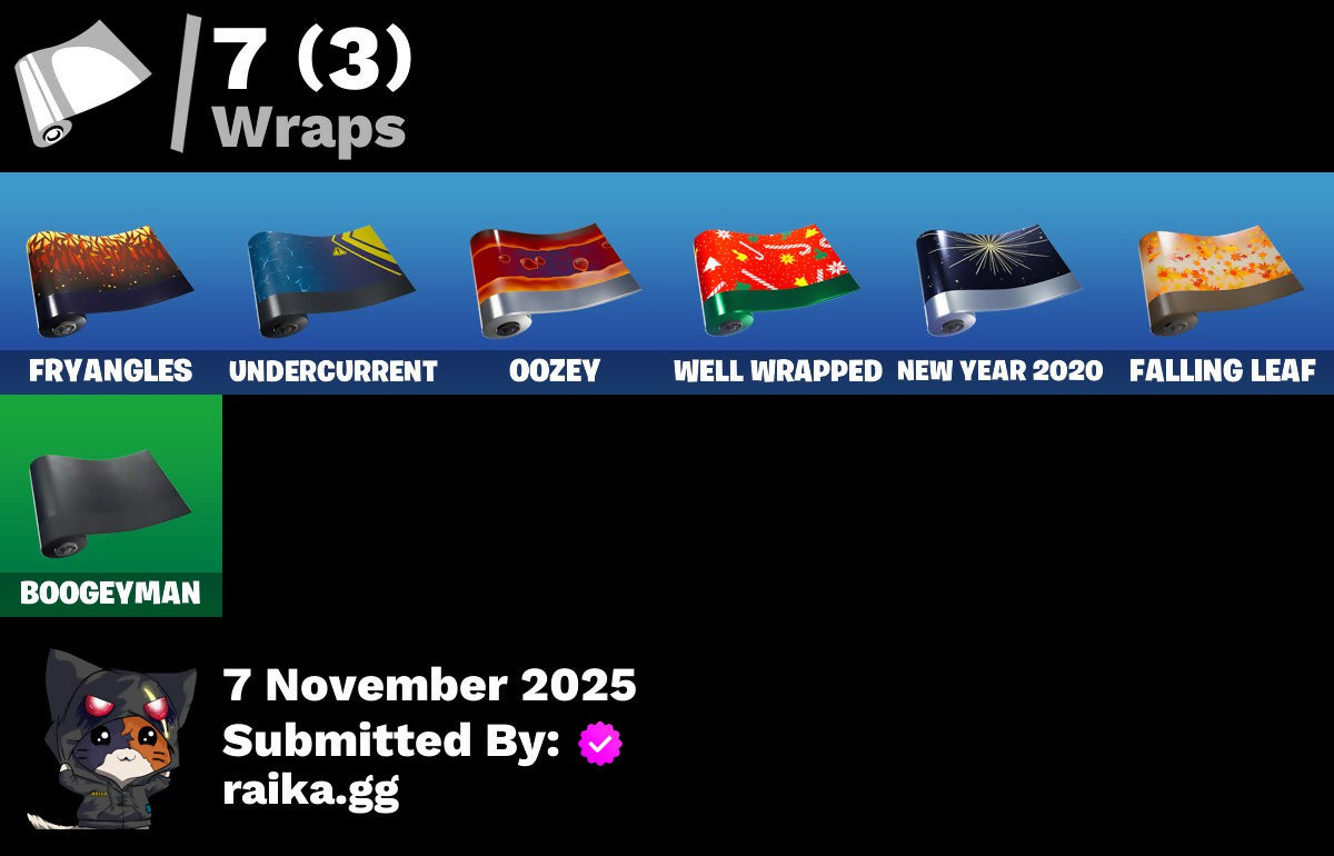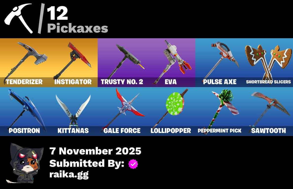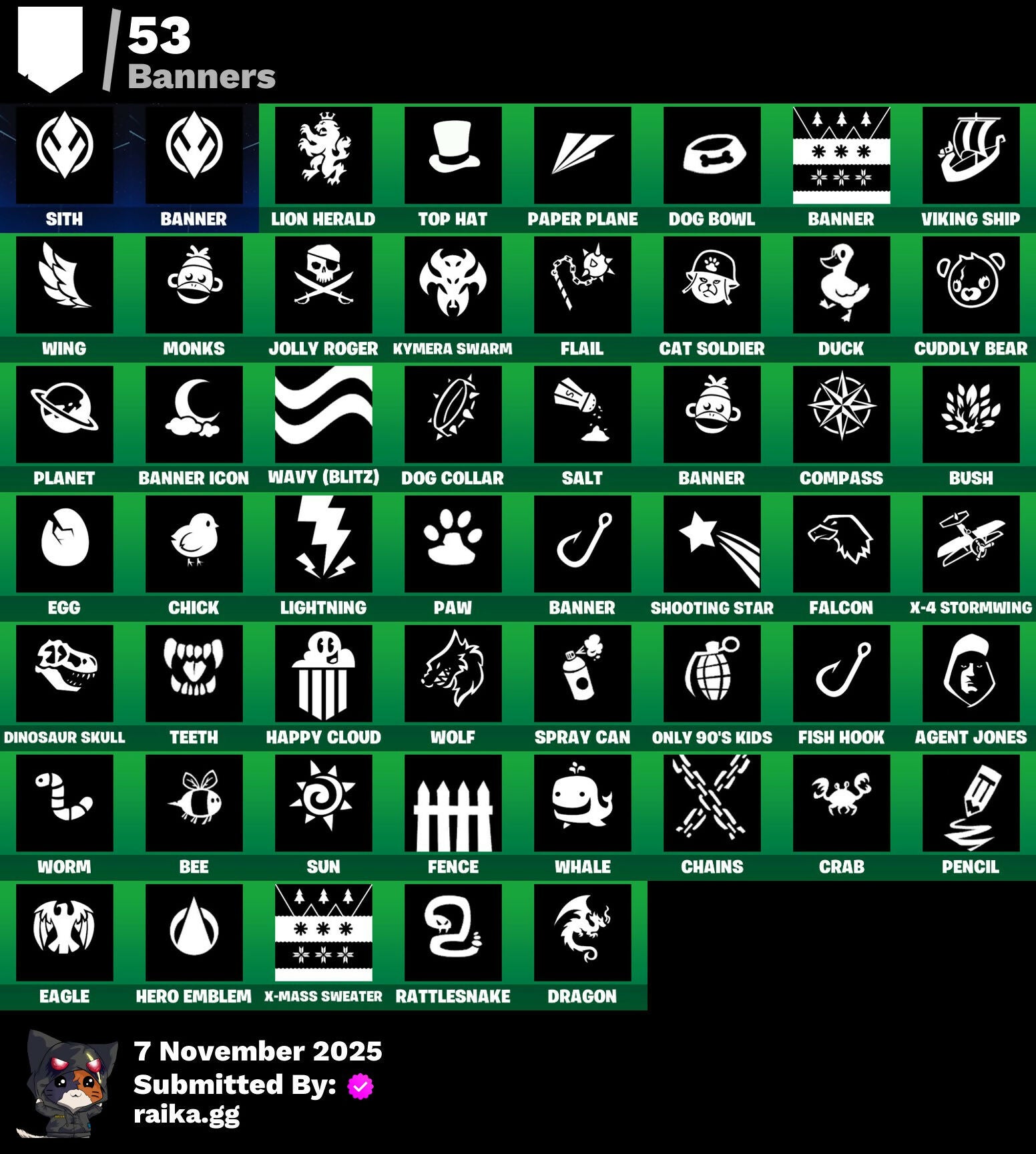 2020 Kickflip, Abstract, Agent Jones, Arrow, Astro, Backup Plan, Banner, Banner Icon, Battlehawk, Beach Umbrella, Beachcomber, Bee, Best Mates, Blue Squire, Boogeyman, Both Eyes Open, Breaking Point, Bush, Call Me, Carbide, Carbon, Cat Soldier, Catalyst, Chains, Chalk Outline, Chick, Circle, Classified, Clawz Retro, Clean Sweep, Comet, Compass, Crab, Crazy Castle, Cuddly Bear, D.C. 63, Dark Matter, Dark Voyager, Dinosaur Skull, Do It!, Dog Bowl, Dog Collar, Downshift, Dragon, Duck, E.G.O., Eagle, Egg, Elite Agent, Equalizer, Eva, Falcon, Falling Leaf, Feathered Flyer, Fence, Field Flyer, Fish Hook, Fishstick Janky, Flail, Flippin' Away, Fortilla Flier, Freestylin', Fresh, Fryangles, Gale Force, Gentleman's Dab, Get Down!, Gg Ornament, Gg Smiley, Gg Snakes, Gg Snowman, Gold Token, Golf Clap, Goodie Bag, Guggi Was Here, Happy Cloud, Have A Seat, Havoc, Hearts, Hello Friend, Hero Emblem, High Octane, Holographic, Hype, Infinite Dab, Instigator, Invasion, Iron Cage, Jolly Roger, Keep It Mello, Kittanas, Kymera Swarm, Lightning, Lion Herald, Lobby Classic, Lollipopper, Looted, Lt. Evergreen, Make It Rain, Mello Made It Right, Mercurial, Millennium Falcon, Mission Specialist, Monks, Moonwalker, New Year 2020, Only 90's Kids, Oozey, Orange Justice, Paper Parasol, Paper Plane, Paw, Pencil, Peppermint Pick, Pixels Royale, Planet, Plunder, Pony Up, Popcorn, Positron, Precision, Pulse Axe, Quick Bite, Rainbow, Rainbow Rider, Rattlesnake, Raven, Re-Gifter, Regal Wave, Respect, Respect The Peace, Ride The Pony, Rock Love, Rocket, Rogue Agent, Royal Stroll, Rust Bucket, Rust Lord, Salt, Salute, Sawtooth, Sgt. Winter, Shaolin Sip, Shooting Star, Shortbread Slicers, Sith, Slipstream, Snowshaker, Spiderweb, Spray Can, Squire Shield, Standard Issue, Stay Smooth, Sub Commander, Sugar Crash, Sun, Sunbird, Sunny's Lander, Take The Elf, Take The L, Teeth, Teknique, Tenderizer, The Reaper, The Robot, The Sith, The Umbrella, Three Llamas, Top Hat, Trail Tote, Trailblazer, Trap Warning, Treefall, Triple Threat, True North, Trusty No. 2, Undercurrent, Uplink, Valor, Viking Ship, Vulcan Salute, Wave, Wavy (Blitz), Webrella, Well Wrapped, Wet Paint, Whale, Widow's Pirouette, Window, Wing, Wings Of Valor, Wolf, Wooly Warrior, Worm, X Mark, X-4 Stormwing, X-Mass Sweater, Yay!, Zoey
