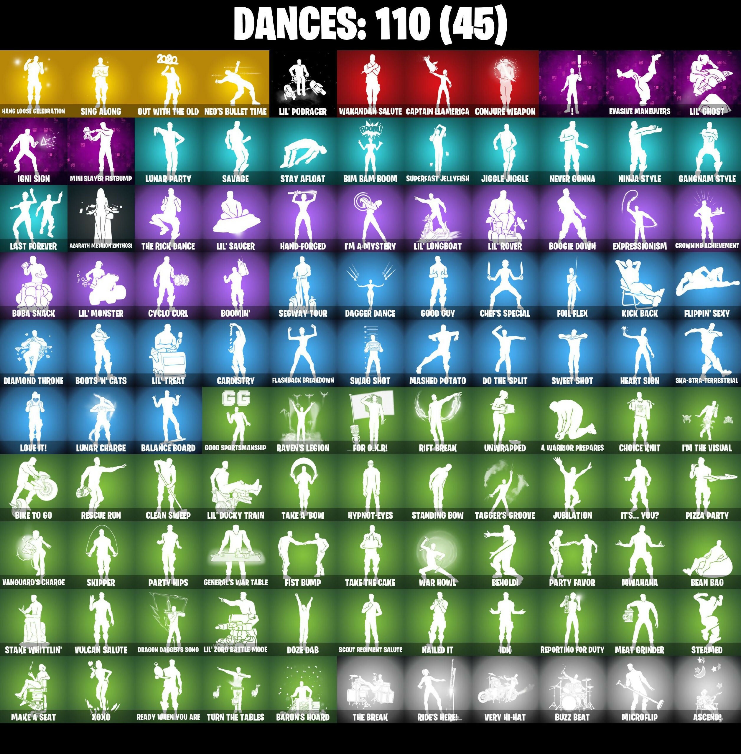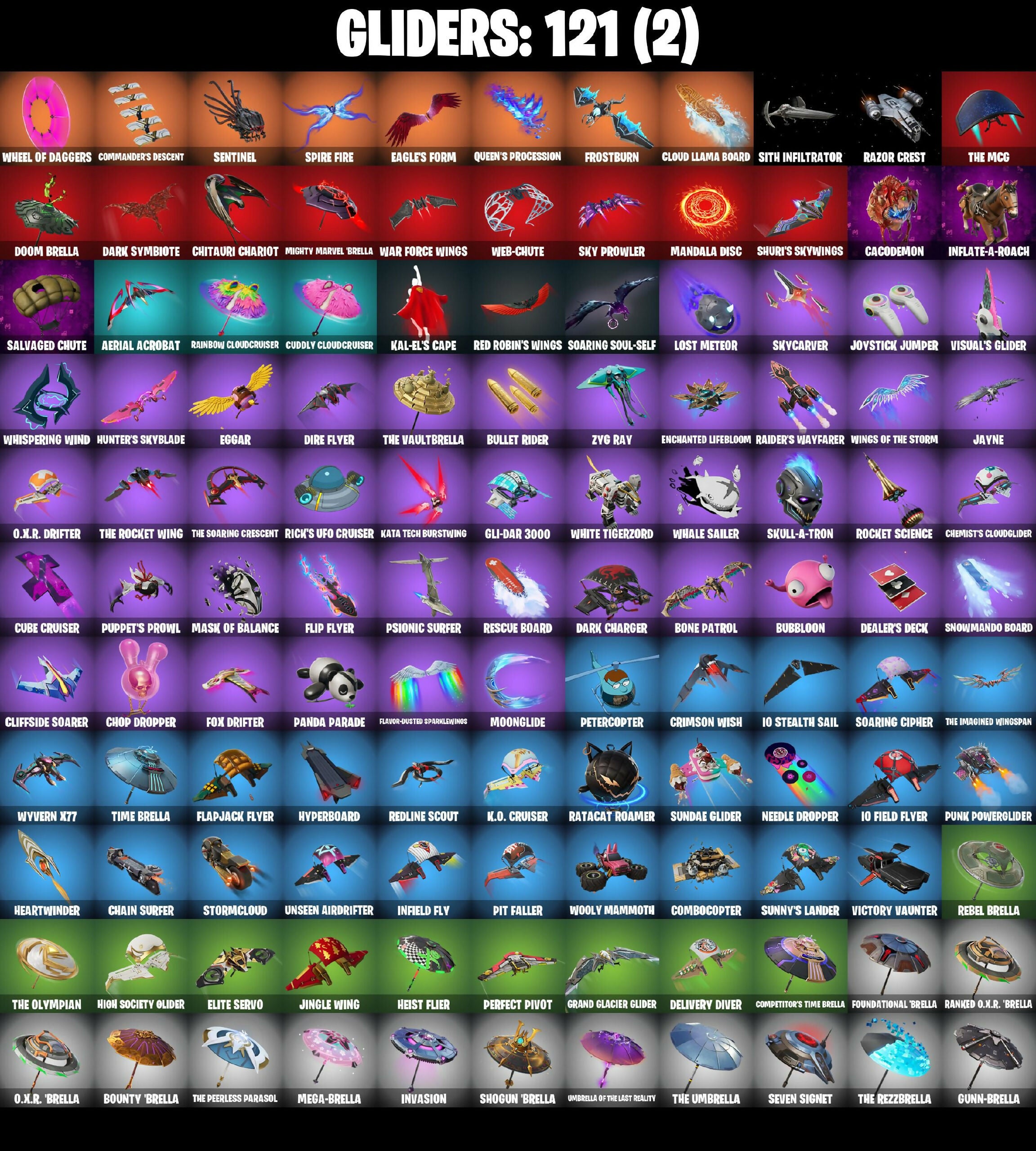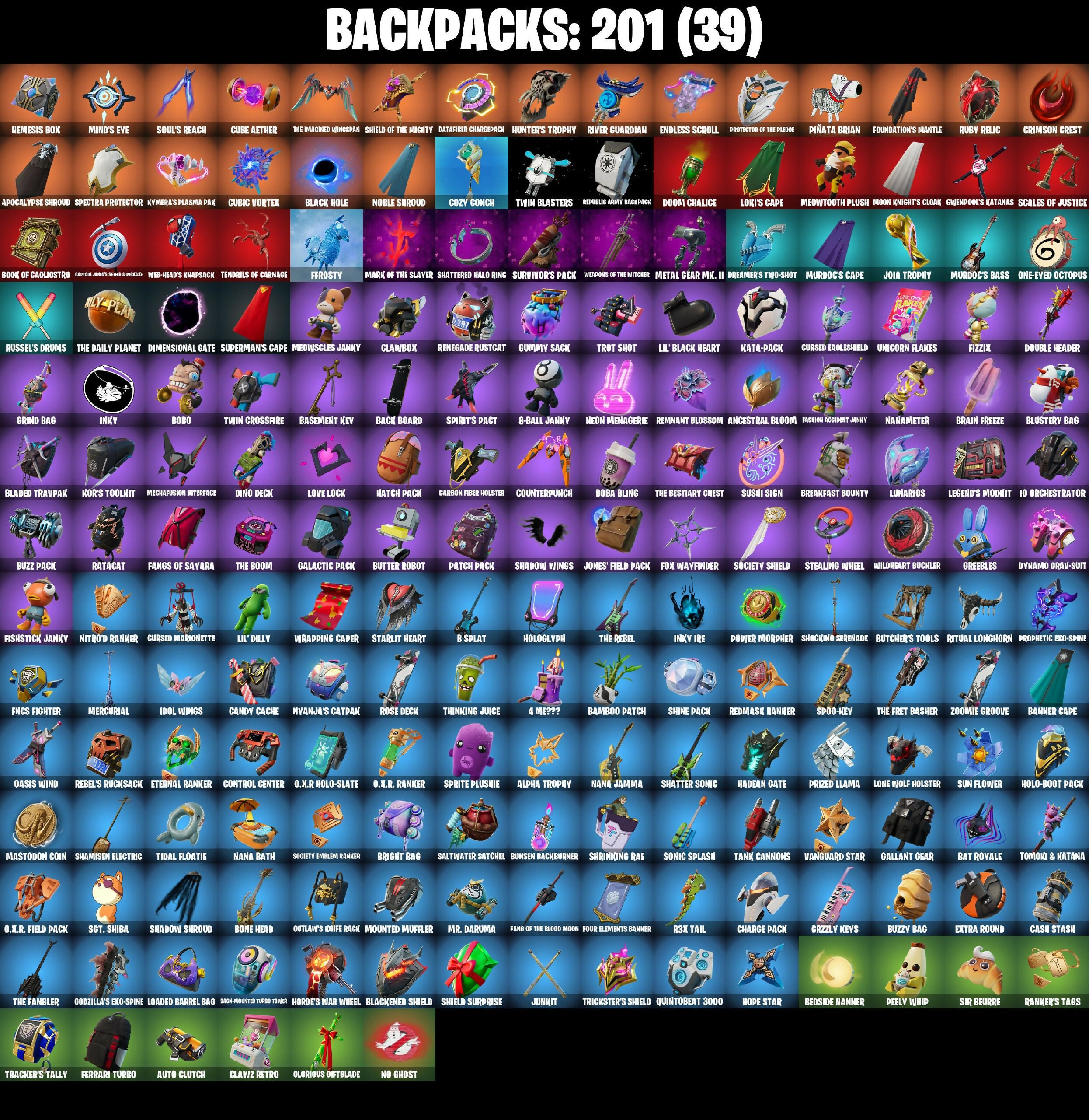 10 Orchestrator, 4 Me???, 6-Carat Cutter, 8-Ball Janky, A Warrior Prepares, Absenz, Abyssal Blade, Aerial Acrobat, Agent Jones, Agent Jones (Jump 31), Agent Patch, All-Weather Extractor, Alpha Trophy, Ancestral Bloom, Apocalypse Shroud, Arc Flail, Ascend!, Ascension Nezumi, Astro Armor, Augury, Aura, Auto Clutch, Axe-Tral Form, Azarath Metron Zinthos!, B Splat, Back Board, Back-Mounted Turbo Tower, Backup Blades, Balance Board, Bamboo Patch, Bamboo-Tana, Banner Cape, Baron's Hoard, Basement Key, Bat Royale, Battle Gamer Mae, Bean Bag, Beastfang, Bedside Nanner, Beep & Boop, Behold!, Beskar, Big Bite, Bike To Go, Bim Bam Boom, Birthday Basher, Black Hole, Blackened Shield, Blade Of The Waning Moon, Bladed Travpak, Blitz Axe, Blustery Bag, Board Breaker, Boba Bling, Boba Snack, Bobo, Bone Head, Bone Patrol, Boogie Down, Book of Caolostro, Boomin', Boonty 'Brella, Boots N' Cats, Brain Freeze, Breakfast Bounty, Breaking Waves, Breathless Blades, Bright Bag, Brilliant Cutters, Bronzed Scimitars, Bubloon, Bullet Rider, Bunsen Backburner, Bushranger, Butcher's Knife, Butcher's Tools, Butter Robot, Buzz Beat, Buzz Pack, Buzzy Bag, Cacodemon, Candy Cache, Captain Jane's Shield & Pouch, Captain Llamerica, Carbon Fiber Holster, Cardistry, Carnage, Carnage Cleaver, Cash Stash, Centurion, Centurion Edge, Chain Surfer, Chainsaur, Challenger Menace - Flame, Challenger's Staff, Charge Pack, Charlotte, Chef's Special, Chemist's Cloudglider, Chitauri Chariot, Choice Knit, Chop Chop, Chop Dropper, Clark Kent, Claw-Chucks, Clawbox, Clawz Retro, Clean Sweep, Cliffside Soarer, Clinical Crosser, Cloaked Shadow, Cloud Llama Board, Cluck, Cluck (Slurpy), Combat Elite, Combocopter, Commander's Descent, Competitor's Time Brella, Conjure Weapon, Control Center, Counterpunch, Cozy Conch, Crescent Darts, Crescent Shroom, Crimson Crest, Crimson Wish, Crowning Achievement, Crucible Blade, Crystal Axe Of The Masters, Crystal Fang, Crystalline, Cube Aether, Cube Cruiser, Cubic Scepter, Cubic Vortex, Cuddle Carvers, Cuddly Cloudcruiser, Cursed Caoleshield, Cursed Marionette, Cyclo Curl, Dagger Dance, Danica, Dark Charger, Dark Symbiote, Datafiber Chargepack, De-Rezz De-Stroyer, Dealer's Deck, Delivery Diver, Demonslayer Blade, Desionated Hitters, Diamond Diva, Diamond Throne, Diamondclaw Picker, Dimensional Gate, Dino Deck, Dino Megazord, Dire Flyer, Dizzie, Do The 'Split, Doctor Slone, Doctor Slone (Prismatic), Doctor Strange, Doom Brella, Doom Chalice, Doom Slayer, Double Header, Double Tags, Doze Dab, Dragon Dagger, Dragon Daggers Song, Dreamer's Two-Shot, Driver, Droopy, Drummies, Dual Machettas, Duelist's Foil, Dusk Knight, Dusty, Dynamo Grav-Suit, Eagle's Form, Eggar, Electro Pairing Blades, Electro-Pincers, Elegant Crowbar, Elite Servo, Enchanted Lifebloom, Endless Scroll, Energy Claw, Energy Sword, Epic Sword Of Might, Eren Jaeger, Erisa, Eternal Ranker, Evasive Maneuvers, Explorer Emilie, Expressionism, Extermination Saw, Extra Round, Fabio Sparklemane, Fang of the Blood Moon, Fanged Foresight, Fangs of Sayara, Fashion Accident Janky, Felina's Claw, Ferrari Turbo, Ffrosty, Fishstick, Fishstick Janky, Fist Bump, Fizzix, Flapjack Flyer, Flashback Breakdown, Flavor-Dusted Sparklewings, Flip Flyer, Flippin' Sexy, Fncs Fighter, Foil Flex, For O.X.R.!, Foundation's Mantle, Foundation's Plasma Spike, Foundational 'Brella, Four Elements Banner, Fox Drifter, Fox Wayfinder, Foxfire Edge, Frost Squad, Frostburn, Fuel Rod And Tongs, Galactic Pack, Gallant Gear, Gangnam Style, General's War Table, Geralt Of Rivia, Gilded Reality, Gli-Dar 3000, Glorious Giftblade, Godzilla's Exo-Spine, Golden Rune Charlotte, Golden Rune Fabio, Good Guy, Good Sportsmanship, Grand Glacier Glider, Greebles, Green Ranger, Grind Bag, Grizzly Keys, Groot's Sap Axes, Guardian Daggers, Guggimon, Guggimon (Prismatic), Gum Brawler, Gumbo, Gummy Sack, Gunn-Brella, Gunnar, Gwenpool's Katanas, Hadean Gate, Hammerhead Morty, Hana Park, Hand-Forged, Hang Loose Celebration, Hardbore Armor Omegarok, Harlowe, Hatch Pack, Haven, Headpiece, Heart Sign, Heart's Carver, Heartbreaker Lightstick, Heartwinder, Heist Flier, Helmet, Helsie, High Society Glider, Highwire, Holiday Boxy, Holly Hatchets, Holo-Boot Pack, Hologlyph, Honey Scepter, Hooplah Hammer, Hope, Hope Star, Horde's War Wheel, Hot Pokers, Hunter's Skyblade, Hunter's Stake & Hammer, Hunter's Trophy, Hyperboard, Hypnot-Eyes, I'm A Mystery, I'm The Visual, IDK, IQ Eradicator, Ice Breaker, Idol Wings, Igni Sign, Illusionist's Blades, Imani, Infield Fly, Inflate-A-Roach, Inky, Inky Ire, Invasion, Io Field Flyer, Io Stealth Sail, It's... You?, J.B. Chimpanski, Jaguar Strike, Jayne, Jiggle Jiggle, Jingle Wing, Joey, Joia Trophy, Jones' Field Pack, Josie, Joystick Jumper, Jubilation, Junkit, K.O. Club, K.O. Cruiser, Kaiju Cutter, Kal-El's Cape, Kata Tech Burstwing, Kata-Pack, Kiara K.O., Kick Back, Kittanas, Knight’s Helm, Kondor, Kor, Kor Flails, Kor's Toolkit, Krisabelle, Kymera, Kymera's Plasma Pak, Lara Croft, Lara Croft (Gold Anniversary), Last Forever, Legend's Modkit, Legendary Blade Of Insight, Lexa, Lil Split, Lil' Black Heart, Lil' Dilly, Lil' Ducky Train, Lil' Ghost, Lil' Longboat, Lil' Monster, Lil' Podracer, Lil' Rover, Lil' Saucer, Lil' Treat, Lil' Zord Battle Mode, Llaminator, Loaded Barrel Bag, Loki Laufeyson, Loki's Cape, Loki's Scepter, Lone Wolf Holster, Lost Meteor, Love It!, Love Lock, Lt. John Llama, Lt. Ripp Slade, Lunar Charge, Lunar Glow, Lunar Party, Lunarios, Make A Seat, Mancake, Mandala Disc, Mandalorian, Maranello Racer, Mark of the Slayer, Marshmallets, Mashed Potato, Mask Of Balance, Massai, Mastodon Coin, Mave, Maximum Carnage, Maxx Speed, Meat Grinder, Mechafusion Interface, Mega-Brella, Menace, Meowscles Janky, Meowtooth Plush, Mercurial, Metal Gear Mk. II, Microbot Mallet, Microflip, Mighty Marvel 'Brella, Mind's Eye, Mini Slayer Fistbump, Mizuki, Modena Icon, Montague, Moon Knight, Moon Knight's Cloak, Moonglide, Mounted Muffler, Mr. Dappermint, Mr. Daruma, Murdoc, Murdoc's