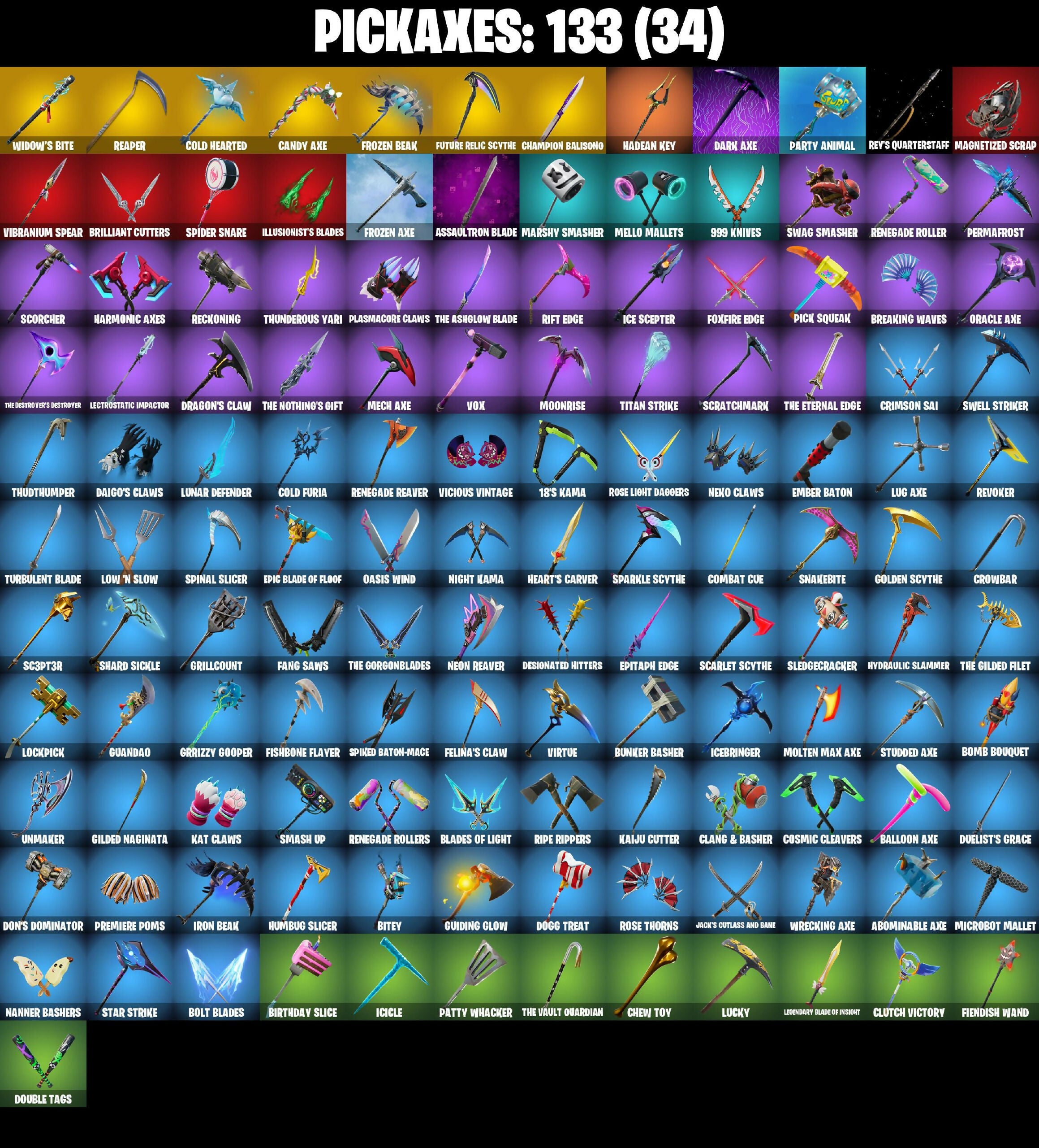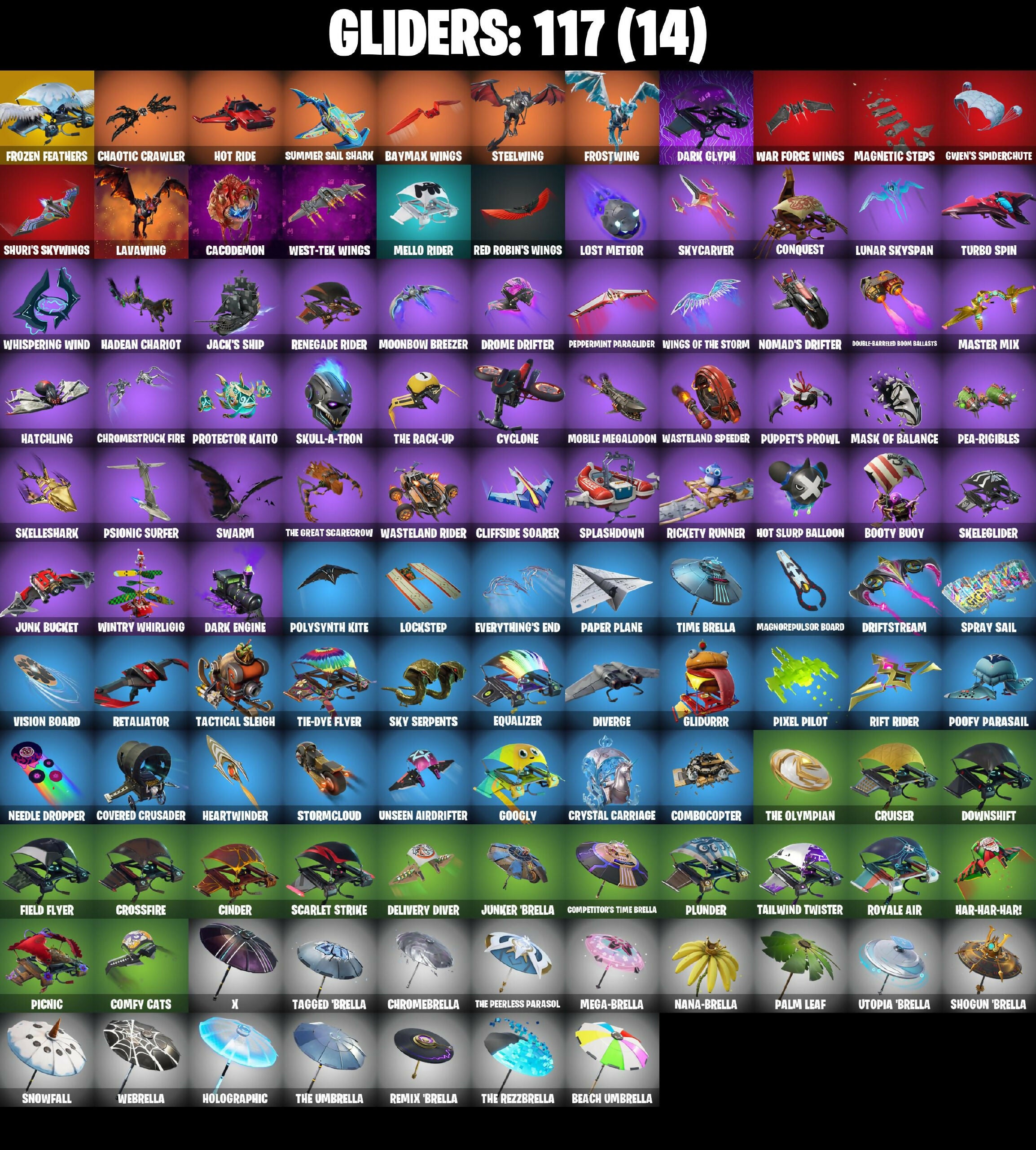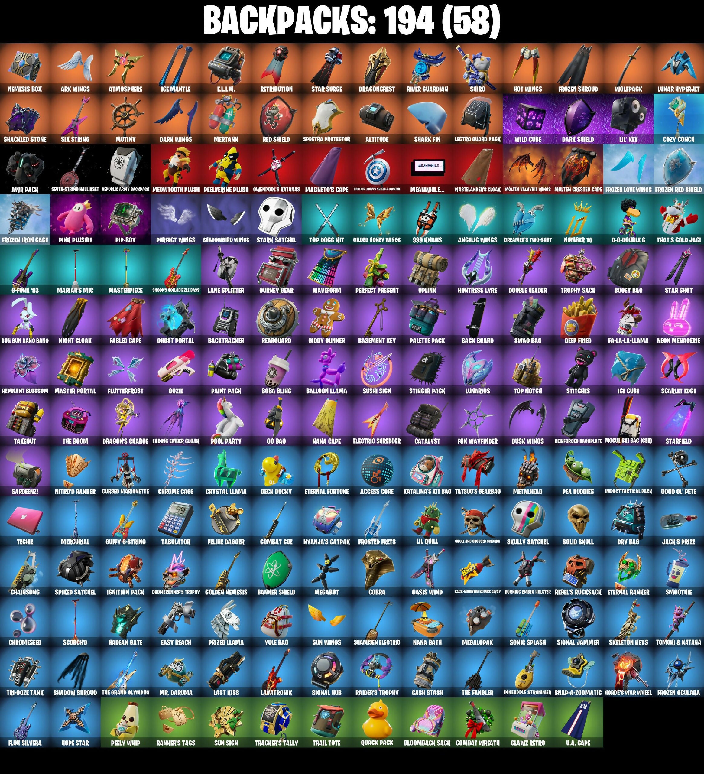 1-Ball, 18's Kama, 999 Knives, A WR Pack, A.I.M., Abominable Axe, Access Core, All I Want For Christmas Is You, Altitude, Andy Fangerson, Angelic Wings, Arachrobatics, Arctic Adeline, Ark, Ark Wings, Assaultron Blade, Atmosphere, Aurelian, Ayida, Back Board, Back-Mounted Boss Navy, Backtracker, Balloon Axe, Balloon Llama, Banner Shield, Basement Key, Battle Bus Balloon, Battle Call, Baymax Wings, Beach Umbrella, Bee Boss, Birthday Slice, Bitey, Black Dragon 100-Pound Roaster, Black Werewolf, Blackheart, Blades of Light, Blitz, Bloomback Sack, Blowing Bubbles, Bob Cut, Boba Bling, Bogey Bag, Bolt Blades, Bomb Bouquet, Boogie Down, Booty Buoy, Breakdown, Breaking Waves, Breakneck, Breakpoint, Brilliant Cutters, Bring It Around, Brite Moves, Brite Raider, Bubblegum Highwire, Bullseye, Bun Bun Bano Bang, Bunker Basher, Bunker Jonesy, Burning Ember, Burning Ember Holster, Burst Case Scenario, Bytes, Cacodemon, Calamity, Calculated, Candy Axe, Captain Jones's Shrub & Pickle, Captain Llamerica, Cash Stash, Cat Flip, Catalyst, Cauldron Chill, Chainsong, Chalked Up 1-Ball, Champion Balisong, Chaos Director, Chaotic Crawler, Chef's Special, Chew Toy, Chomp Sr., Chord Kahele, Chrome Cage, Chrome Punk, Chromebrella, Chromeseed, Chromestruck Fire, Cinder, Clang & Basher, Clawz Retro, Cliffside Soarer, Clinical Crosser, Cluck Strut, Clutch Victory, Cobalt, Cobra, Codsworth's Cleanup, Cold Blooded Ace, Cold Furia, Cold Hearted, Combat Cue, Combat Wreath, Combocopter, Comfy Cats, Committed, Competitor's Time Brella, Conga, Conquest, Cosmic Cleavers, Covered Crusader, Cozy Conch, Crimson Sai, Crossfire, Crowbar, Crowned, Crowning Achievement, Cruiser, Crystal Carriage, Crystal Llama, Culture Festival Dance, Cupid's Arrow, Curling Iron, Cursed Marionette, Cyclone, D-O-Double G, DJ Yonder, Dabstand, Daigo, Daigo's Claws, Dancin' Domino, Dark, Dark Axe, Dark Engine, Dark Glyph, Dark Jonesy, Dark Red Knight, Dark Shield, Dark Wild Card, Dark Wings, Darklands Brite Raider, Deadfire, Deck Ducky, Deep End, Deep Fried, Delivery Diver, Demi, Designated Hitters, Dire, Dirtbike Challenge, Disassemble, Diverge, Dogg Treat, Dominator, Don's Dominator, Double Header, Double Tags, Double-Barreled Boom Ballasts, Downshift, Dragon Stance, Dragon's Charge, Dragon's Claw, Dragoncrest, Dreamer's Two-Shot, Drift, Driftstream, Drome Drifter, Dromer's Trophy, Dry Bag, Duelist's Grace, Dusk, Dusk Knight, Dusk Wings, Dynamo TNTina, Dynamo TNToon-A, E.L.I.M., Easy Reach, Electric Shredder, Electrostatic Impactor, Ember, Ember Baton, Empress Fan Dance, Epic Blade of Floof, Epitaph Edge, Equalizer, Eren Jaeger, Eterna, Eternal Fortune, Eternal Ranker, Eternal Voyager, Everything's End, Expressionism, Fa-La-La-Llama, Fable, Fabled Cape, Fading Ember Cloak, Fang Saws, Featherweight, Felina, Felina's Claw, Feline Dagger, Field Flyer, Field Surgeon, Fiendish Wand, Fire Show, Fishbone Flayer, Fist Bump, Fist Pump, Flamenco, Flatfoot, Flutterfrost, Flux Silvera, Fox Wayfinder, Foxfire Edge, Free Flow, Frosted Frets, Frostwing, Frozen Axe, Frozen Beak, Frozen Feathers, Frozen Iron Cage, Frozen Love Ranger, Frozen Love Wings, Frozen Oculara, Frozen Raven, Frozen Red Knight, Frozen Red Shield, Frozen Shroud, Future Relic Scythe, G-Funk '93, Gentleman's Dab, Get Funky, Ghost Portal, Giddy Gunner, Giddy-Up, Gilded Naginata, Ginger Gunner, Glidurr, Glitter, Go Bag, Gold, Gold Blooded Ace, Golden Nemesis, Golden Scythe, Golf Clap, Good Game, Well Played, Good Ol' Pete, Googly, Grill Sergeant, Grillcount, Grriz, Grrizzy Gooper, Guandao, Guff Gringle, Guffy 6-String, Guiding Glow, Gurney Gear, Gutbomb, Gwen Stacy, Gwen's Spiderchute, Gwenpool's Katanas, Hadean Chariot, Hadean Gate, Hadean Key, Hand Signals, Hang Loose, Hang On, Har-Har-Har!, Harmonic Axes, Hatchling, Heart, Heart's Carver, Heart'winder, Helichopper, Hello Friend, Helmet On, Hero Baymax, Highwire, Hime, Holographic, Hoodie, Hope Star, Horde's War Wheel, Hot Marat, Hot Ride, Hot Slurp Balloon, Hot Wings, Howl, Humbug Slicer, Huntress, Huntress Lyre, Hybrid, Hydraulic Slammer, Hypnot-Eyes, Ice Cube, Ice Mantle, Ice Scepter, Icebringer, Icicle, Ignition Pack, Illusionist's Blades, Imani, Impact Tactical Pack, In Da Party, Infinity, Invisible Cut, Iron Beak, It's Go Time!, Jabba Switchway, Jack's Cutlass and Bane, Jack's Prize, Jack's Ship, Jade, Jaywalking, Jet Signals, Joltara, Jump Jets, Jun-Hwan, Junk Bucket, Junker 'Brella, Kaiju Cutter, Kat Claws, Katalina, Katalina's Kit Bag, Keep It Mello, Kendo, Kintsugi Daigo, Kyran Arvy, LBC 93 Dogg, Lace, Lady Of Cranes, Laguna, Laid Back Shuffle, Lane Splitter, Laser Focused, Last Kiss, Lavatronik, Lavawing, Lavish, Lazer Blast, Lazy Shuffle, Lectro Guard Pack, Legendary Blade of Insight, Lennox Rose, Lil Quill, Lil' Godzilla Attack, Lil' Kev, Lil' Prancer, Lil' Tank, Lionel Messi, Living Large, Llama Bell, Llamacadabra, Lockpick, Lockstep, Lost Meteor, Low 'N Slow, Lucky, Lug Axe, Lunar Defender, Lunar Hyperjet, Lunar Skyspan, Lunarios, Lynx, Magnetic Steps, Magnetized Scrap, Magneto, Magneto's Cape, Magnorepulsor Board, Make A Seat, Mariah Carey, Mariah's Mic, Marked Marauder, Marsh Walk, Marshy Smasher, Mask of Balance, Master Key, Master Mix, Master Portal, Masterpiece, Maven, Maximum Styles, Meanwhile..., Mech Axe, Mega-Brella, Megabot, Megalo Don, Megalopak, Mello Mallets, Mello Rider, Meow Skulls, Meowdas, Meowtooth Plush, Mercurial, Mertank, Metalhead, Mic Drop, Microbot Mallet, Midnight Skye, Mine, Mizuki, Mobile Megalodon, Mogul Master (Ger), Mogul Ski Bag (GER), Moisty Merman, Molten Battle Hound, Molten Crested Cape, Molten Max Axe, Molten Valkyrie, Molten Valkyrie Wings, Moonbow Breezer, Moonrise, Mr. Daruma, MrBeast, Munitions Expert, Mutiny, Mystica, Nana Bath, Nana Cape, Nana Nana, Nana-Brella, Nanner Bashers, Needle Dropper, Neko Claws, Nemesis Box, Neon Menagerie, Neon Reaver, Night Cloak, Night Hunter Scarr, Night Kama, Nightshade, Nite Nite, Nitelite, Nitro Fusion Arnold Don, Nitro'd Ranker, No Sweat, Nomad's Drifter, 