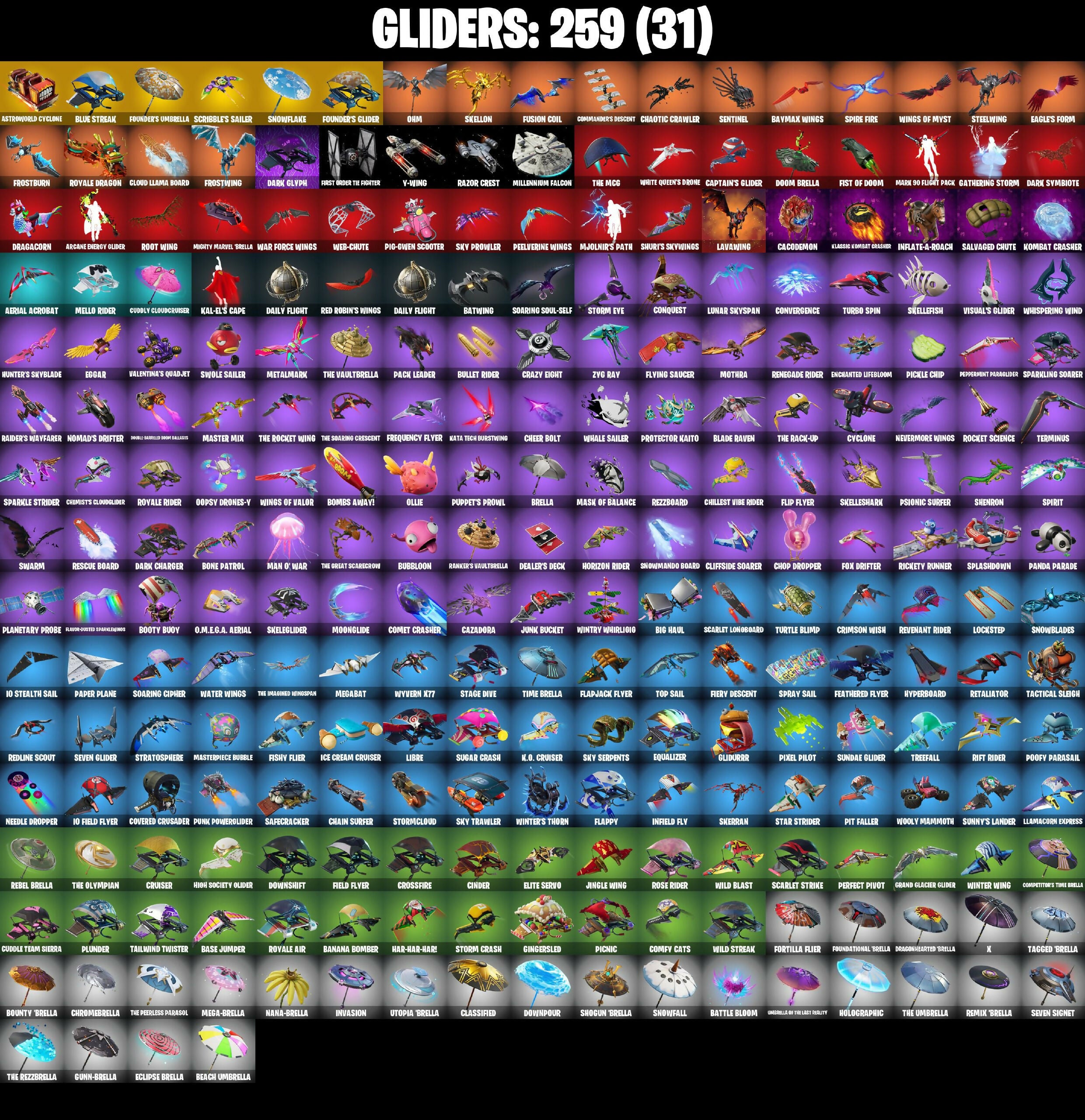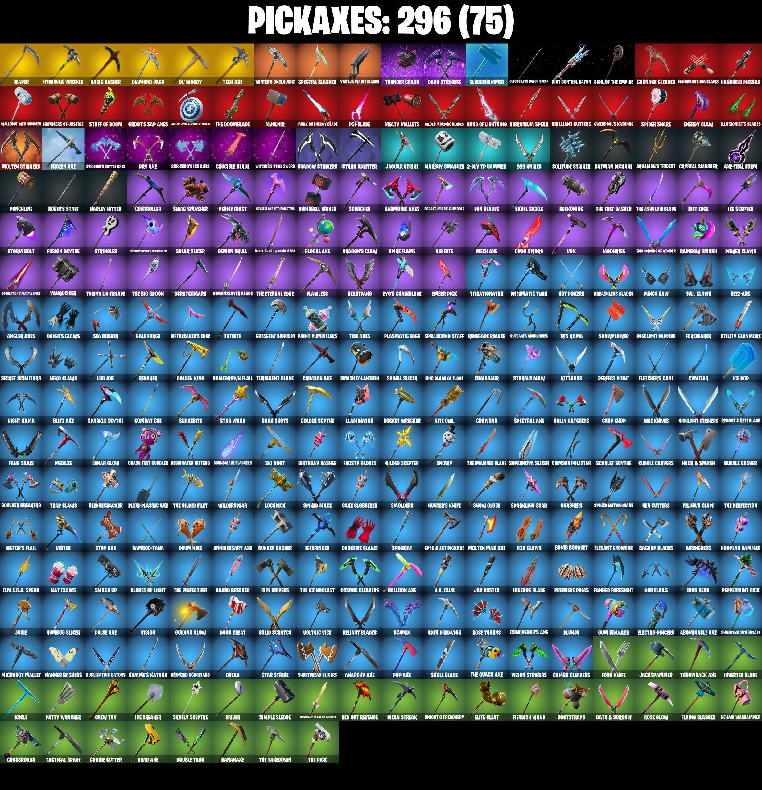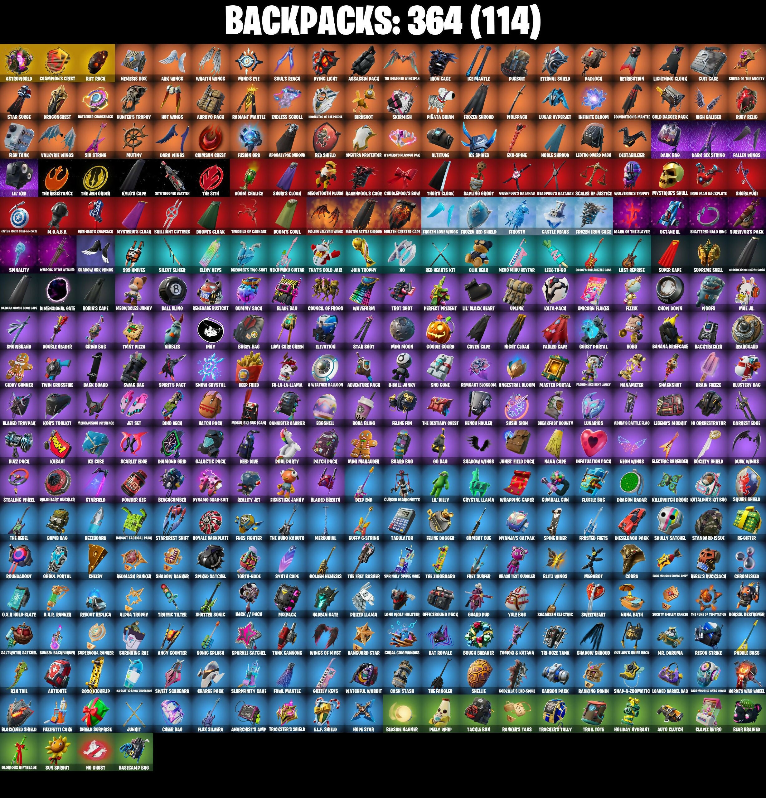 (Snikit!), 185 Kama, 2-2-4, 2-Ply TP Hammer, 2020 Kickflip, 8-Ball Janky, 999 Knives, A Warrior Prepares, A Weather Balloon, Abix, Abominable Axe, Admiral's Battle Flag, Adventure Pack, Aerial Acrobat, Agent Jones, Agent Jones (Jump 3), Agent Peely, Air Horn, Air Shredder, Alpha Trophy, Altitude, Always Fantabulous, Anarchist's Amp, Anarchy Axe, Ancestral Bloom, Angler Axes, Angry Counter, Anniversary Axe, Antidote, Apex Predator, Apocalypse Shroud, Apprentice Eve, Aquaman, Aquaman's Trident, Arcane Energy Glider, Arcane Research, Arctic Assassin, Ark Wings, Arroyo Pack, Arsenal Assault Officer, Arthur Curby, Ascension Nezumi, Assassin Pack, Astro Armor, Astro Jack, Astroworld, Astroworld Cyclone, Aura, Auto Clutch, Avila Winn, Aw, Shucks., Axe-Trail Form, Azarath Metrion Zinthos, Back Board, Back-Hounded Turbo Trow, Backtracker, Backup Blades, Balance Board, Ball Bling, Balloon Axe, Bamboo-Tana, Banana Bomber, Banana Briefcase, Bananaxe, Bank Shots, Baron's Hoard, Base Jumper, Basecamp Bag, Basic Basher, Bat Royale, Batch Pack, Batman Comic Bone Cape, Batman Pickaxe, Battle Blessing, Battle Bloom, Battle Bus Balloon, Battle Call, Battlehawk, Batwing, Baymax Wings, Beach Umbrella, Beachcomber, Bean Bag, Bear Brained, Beastfang, Bedside Nanner, Beef Boss, Beep Beep, Bernus, Beskar, Big Bill, Big Bite, Big Haul, Big Mouth, Bigfoot Man, Bike To Go, Billy Bounce, Birdarang Flourish, Birdshot, Birthday Basher, Black Panther (Stages 1-3), Black Panther Final Champion, Black Queen, Black Werewolf, Blackened Shield, Blackheart, Blade Bag, Blade Raven, Blade of the Wearing Moon, Bladed Breath, Bladed Trapwalk, Blades of Light, Blitz Axe, Blitz Wings, Blowing Bubbles, Blue Squire, Blue Streak, Blue Team Leader, Blustery Bag, Board Bag, Board Breaker, Bob Cut, Boba Bling, Boba Snack, Bobo, Bogey Bag, Boing!, Bomb Bag, Bomb Bouquet, Bombs Away!, Bone Breaker, Bone Patrol, Bones, Boogie Down, Boomin', Boosting Ki, Boots N' Cats, Bootstraps, Booty Buoy, Bough Breaker, Boulder Breakers, Bounty Brella, Boys A Liar, Brain Freeze, Brawler, Breakdown, Breakfast Bounty, Breakin', Breakneck, Breathless Blades, Brella, Brilliant Cutters, Brite Bomber, Bronzed Scimitars, Bubble Basher, Bubloon, Bullet Brain Buck, Bullet Rider, Bunker Basher, Bunny Brawler, Bunoff, Bunsen Backburner, Burst Case Scenario, Business Hips, Buzz Pack, Cacodemon, Cake Clobberer, Calamity, Calculated, Call Me, Called Shot, Cameo vs Chico, Camoflauge Machine, Cannister Carrier, Captain America's Shield & Pickaxe, Captain Elamerica, Captain Jones, Captain Phasma, Captain's Glider, Carbide, Carbon Commando, Carbon Pack, Cardistry, Carmine Rosso, Carnage, Carnage Cleaver, Cash Stash, Cassidy Quinn, Castle Peaks, Cat Flip, Catalyst, Cauldron Chill, Cazadora, Chain Surfer, Chainsaur, Chalked Up Q-Ball, Champion's Crest, Chaos Director, Chaotic Crawler, Charge Pack, Charging Up, Charlotte, Cheer Bag, Cheer Bolt, Cheesy, Chemist's Cloudglider, Chew Toy, Chicken Wing It, Chigusa, Chillest Vibe Rider, Chimichanga!, Choice Knit, Chop Chop, Chop Dropper, Chow Down, Chow Trooper, Chrome Seed, Chromebrella, Chuck, Cinder, Circuit Breaker, Classic Peelyverine, Classic Wolverine, Classified, Clawz Retro, Clean Sweep, Click (Slurpy), Cliffside Soarer, Clik Bear, Clikxy Keys, Clix, Clix Groove, Cloaked Shadow, Cloaked Star, Cloud Llama Board, Cloud Star Specialist, Cloud Striker, Club President Luxe, Cobra, Coco Nameless, Coin Flip, Combat Cue, Combat Elite, Combo Cleavers, Comet Crasher, Comfy Cats, Commander, Commander's Descent, Competitor's Time Brella, Conga, Conqueror's Axe, Conqueror's Claim, Conquest, Contract Giller, Controller, Convergence, Cookie Cutter, Coral Commandos, Corrupted, Cosmic Cleavers, Cosmic Legacy, Council of Frogs, Coven Cape, Covered Crusader, Crackabella, Crackdown, Crackshot, Crash Test Cuddler, Crazy Eight, Crescent Shroom, Crimson Axe, Crimson Crest, Crimson Polestar, Crimson Wish, Crossfire, Crossroads, Crowbar, Crowned, Crowning Achievement, Crucible Blade, Cruiser, Crystal, Crystal Axe of the Pastors, Crystal Llama, Crystal Smasher, Cuddle Carvers, Cuddle Team Sierra, Cuddlepoll, Cuddlepool's Bow, Cuddly Cloudcruiser, Cuff Case, Cursed Marionette, Cyclo Curl, Cyclone, Cymitar, Dab, Dabstand, Daigo's Claws, Daily Flight, Dallyonder, Dancer Lord Diva, Dandi Deck, Danica, Dark, Dark Bag, Dark Bomber, Dark Charger, Dark Glyph, Dark Gwenpool, Dark Powder Chargo, Dark Six String, Dark Strikers, Dark Symbiote, Dark Wings, Darkest Edge, Darkfire Claws, Datapier Charged Pack, Deadpool, Deadpool's Katanas, Dealer's Deck, Dear Specialist Maya, Deathstroke Disaster, Deep Dive, Deep End, Deep Fried, Demi, Demon Skull, Demonslayer Blade, Designated Hitters, Destabilizer, Dexter Ocean, Diago, Diamond Grid, Diamond Jack, Die With A Smile, Die With A Smile Brina, Dieselback Pack, Dillinger The Dawg, Dimensional Gate, Dire, Diva Fever, Dive Knives, Do The Split, Doctor Doom, Dogg Treat, Doggo, Dolpa, Don't Start Now, Doom, Doom Brella, Doom Chalice, Doom Hunter 400%, Doom Slayer, Doom's Cloak, Doom's Cowl, Doom's Domain, Dopplh-Kate, Dorsal Destroyer, Double Barreled Doom Ballista, Double Header, Double Tags, Downpour, Downshift, Doze Dab, Drag-Hunting Doppler Bunny, Dragacorn, Dragon Radar, Dragon Stance, Dragon's Claw, Dragoncrest, Dragonhearted Brella, Drake, Dread, Dreamer's Two-Shot, Drift, Driver, Droop, Drop The Bass, Drummies, Duelist's Card Trick, Dumbbell Driver, Dunker Jonesy, Duplicates, Duplicating Batons, Dusk, Dusk Knight, Dusks Wings, Dusty, Dying Light, Dynamo, Dynamo Orb-Suit, Dynamo Tintina, Dynamo Tintona, E.L.F. Shield, Eagle, Eagle's Form, Eclipse Brella, Eggar, Eggshell, Electric Shredder, Electro Swing, Electro-Pincers, Elegant Crowbar, Elevation, Elite Cleat, Elite Servo, Ember, Ember Pick, Emma Frost, Enchanted Lifebloom, Endless Scroll, Energy Claw, Eon Blades, Epic Blade of Floof, Epic Swords of Wonder, Equalizer, Eternal Shield, Eternal Voyager, Evasive Maneuvers, Ex, Exo-Spine, FNCS Fighter, Fa-La-La-Llama