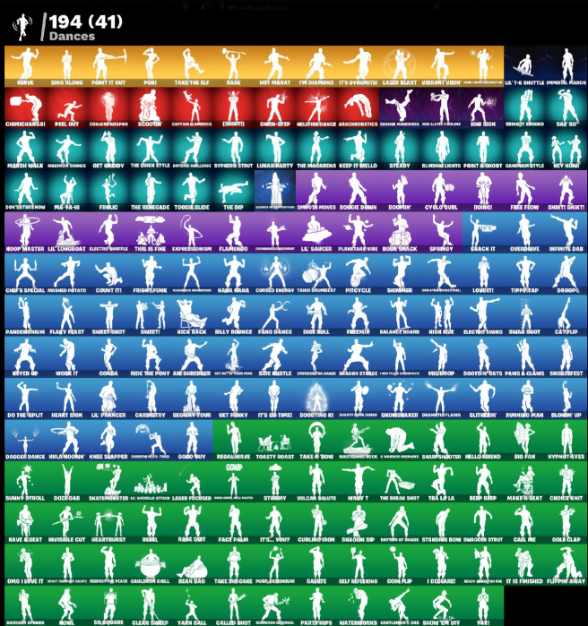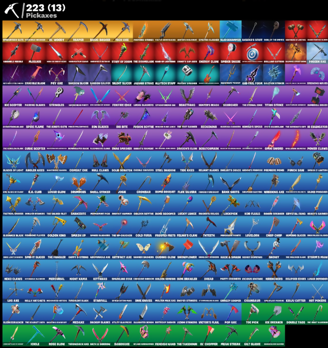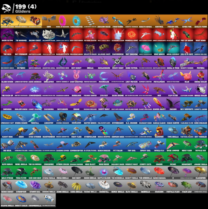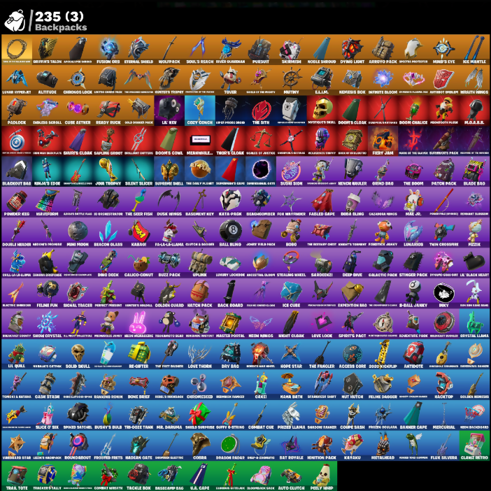 1-Ball, 10 Stealth Sail, 2020, 2020 Kickflip, 4 Warboss Squads, 8-Ball Janky, A.I.M., Abominale Axe, Access Core, Ace's Up Crater, Adira, Adventure Acall, Aerial Acrobat, Aeris, Agent Jones, Agent Peely, Ahsoka Tano, All-Tech Staff, Altitude, Ancient Bloom, Angler Axes, Animated Scarecrow, Antidote, Antoha, Apocalypse Shroud, Aquaman, Arachnobotics, Arcane Energy Glider, Arctic Jungle, Arroyo Pack, Artifact Ace, Ashoka's Staff, Askarans Templar Staff, Astrolites Lost Wings, Astromite Epsilon, Auto Clutch, Autobot Smolder, Awaits Battle Flag, Awe Shredder, Axis-Trail Form, Axs Tech Burststrike, Back Board, Backcup Blades, Backlit Firelance, Badger's Mayhem, Balance Board, Ball Bling, Banana Bomber, Bananaxe, Banner Bashers, Banner Cape, Base Jumper, Basecamp Bag, Basement Key, Basic Basher, Bat Royale, Battle Bloom, Battle Of Bones, Beach Breezer, Beachcomber, Beacon Glass, Bean Bag, Beastfang, Beep Beep, Beerus, Bicycle Challenge, Big Bite, Big Fan, Big Haul, Billy Bounce, Birthday Bash, Blackheart, Blackout Bag, Blade Bag, Blade Raven, Blades Of Light, Blazeburn Demon, Blinding Lights, Blitz 'Brella, Blowin' Up, Board Breaker, Boba Bling, Boba Snack, Boceo, Boiler Blaster, Boing!, Bomb Bouquet, Bombs Away!, Bone Brief, Bone Patrol, Boogie Down, Boom Chalice, Boomin', Boosting Ki, Bootkit Hammer, Bootsin' Gats, Booty Buoy, Bounty Brella, Brandon Bishop Jr, Breaking News, Brella, Brilliant Cutters, Brilliant Outfits, Bring It Around, Broadway Event, Bubbelon, Bushy's Bulbs, Buzz Pack, Buzzham Breacher, Bytes, Cacodemon, Cake!, Calamity, Calico-Conut, Call Me, Call On The Party, Called Shot, Candle Fender Glider, Captain America, Captain America's Shield, Captain Cabrera, Captain Jones, Captain's Glider, Carb Dotty, Cash Stash, Catflip, Catwing, Cauldron Chill, Cazadora, Chain Slicer, Chainsaw, Chaos Director, Chaotic Cavalier, Charlotte, Chef's Special, Chill-U-LA-Llama, Chimichanga, Choiceknit, Chop Chop, Chop Dropper, Chrome Punk, Chromessed, Chromestorm Fire, Chromobrella, Chronos Lock, Cinder, Clankz Retro, Clara, Clark Kent, Classified, Clean Sweep, Cliffsdie Soarer, Cluck, Clutch & Slam, Cobalt, Cobra, Coin Flip, Cold Furia, Combat Cue, Combat Wreath, Combocopter, Comet Crasher, Comfy Cats, Commando, Conga, Conga Weapon, Convergence, Count It!, Coupe Slash, Cozy Conch, Crack It, Crazy Eight, Crescent Scythe, Crimson Veil, Crossbow, Crossfire, Crowbar, Crucible Blade, Crystal Fang, Crystal Llama, Cube Aether, Cubic Scepter, Cuddle Carvers, Cult Crops Kid, Curling Iron, Cursed Energy, Cyberstrike Axe, Cyclo Curl, D.J. B Oombatic, DJ Orchestrator, DJ Yonder, Dagger Dance, Dakara Dragoon, Dark Charger, Dark Doggo, Dark Engine, Dark Glyph, Darth Vader, Deadpool, Dealer's Deck, Death Slide Formation, Deep Dive, Defender Victory, Defenders' Outfit, Delivery Diver, Delta & Sorrow, Dice Roll, Dino Deck, Dire, Dive Knives, Do The Split, Doctor Doom, Doctor Slone, Doctor Strange, Doctor's Cloak, Don't Skate Grumpy, Don't Strike Now, Doom, Doom Brella, Doom Slayer, Doom's Cowl, Door Of Blight, Double Header, Double Tags, Downmils, Downpour, Downshift, Doze Oab, Dragon Radar, Dragon Rider, Dragon Stance, Dragon's Claw, Drama To Flare, Dread, Dreissless Blades, Drooga, Dry Bag, Duelist's Orace, Dumbbell Driver, Dune Sooper, Dunpepool, During Clan Gift Kit, Dusk, Dusk Knight, Dusk Wings, Dusty, Dying Light, Dynamo Tintina, E.L.I.M., Eagle's Form, Echo Glider, Eclipse Brella, Eclipsed Edgers, Egoar, Eiza, Elastic Sheen, Electric Swing, Electro Grogu Pack, Electro Shuffle, Elegance Blade, Elite Servo, Ember, Emma Frost, Endless Scroll, Energy Claw, Eoin Blades, Equalizer, Eren Jaeger, Estrogen Rat, Eternal Knight, Eternal Shield, Evie, Expedition Bag, Expressiomism, Fable, Fabled Cape, Face Palm, Fang Isle Claw, Fanged Finsher, Fano Dance, Felina's Claw, Feline Dagger, Feline Fun, Field Flyer, Fiendish Wand, Fiery Jam, Fireside Jackey, Firewing, Fish Thicc, Fishy Flier, Fissohne Flare, Fist of Doom, Fistclaw's Swirl, Fizzrix, Flag, Flaky Feast, Flamenco, Flaming River, Flashbones Claws, Flava Maneuvers, Flight Risk, Flip Flyer, Flippin' Away, Flux Silvera, Formational Brella, Forte Edge, Fortilla Flier, Founders Glider, Founders Umbrella, Fox Wayfinder, Foxglove Scarf, Free Flow, Freedom Darwin, Freemix, Fright Funk, Frolic, Frostburn, Frosted Frets, Frostmoto Bear, Frozen Axe, Frozen Oculus, Fusion, Fusion Coil, Fusion Orb, Fusion Scythe, Galactic Pack, Game Over Sync, Game's Shipbringer, Gangnam Style, Gathering Storm, Gazhavna Wings, Gem Of The Heavens, Gentleman's Dab, Geralt of Rivia, Get Funky, Get Greddy, Get Off My Phone, Ghost's Sap Axe, Giddy-Up, Gilded Punisher, Gildhart, Gilt Glaive, Girl Of The Knife, Gold Brutus, Gold Dagger Pack, Gold Midas, Golden Guard, Golden King, Golden Nemesis, Golden Scythe, Golf Clap, Good Guy, Gorilla Attack, Got. Winter, Greipicy's Claws, Griffin's Talon, Grind Bag, Grizz, Grizzly Gouger, Groot, Guff Gringle, Guffy 6-String, Guffy G-String, Guggimon, Guiding Glow, Gunn-Brella, Gunnar, Guu Brawler, Gwen-Step, Gypsy Drones-Y, Hack & Smash, Hacktop, Hadean Gate, Hana Bath, Hand Of Lightning, Handbell Missile, Handcannon Rider, Har-Har-Har!, Hatch Pack, Have A Seat, Heart Sign, Heartburst, Heartwinder, Heath's Carver, Heist Flier, Heli Fire Dance, Hello Friend, Helsie, Hench Hauler, Heritage Whirligig, Hey Now!, High Five, Highwire, Holiday Bow, Holly Hatchets, Homosa Spear, Hondor, Hoop Master Lil', Hope Star, Hot Blades, Hot Marat, Hot Pokers, Hot Slurp Balloon, Hula Honkong, Hull Claws, Hunter's Hoodall, Hunter's Reach, Hunter's Trophy, Hybrid, Hydroarc Blades, Hyperboard, Hypnotises, I Declare!, I Forgot To Peace, I'm Diamond, ID Eradicator, Ice Breaker, Ice Cube, Ice Mantle, Ice Scepter, Ice Team Leader, Icicle, Ignition Pack, Imani, Imperial March, Improved On, Indiana Jones, Infield Fly, Infinite Bloom, Infinite Dab, Inflate-a-Roach, Inky, Invasion, Invisible Cut, Ioni Sign, Ironclaw Blake, Ironclaw Grovers, Isis, It Is Finished, It's Dynamite, It's Go Ti