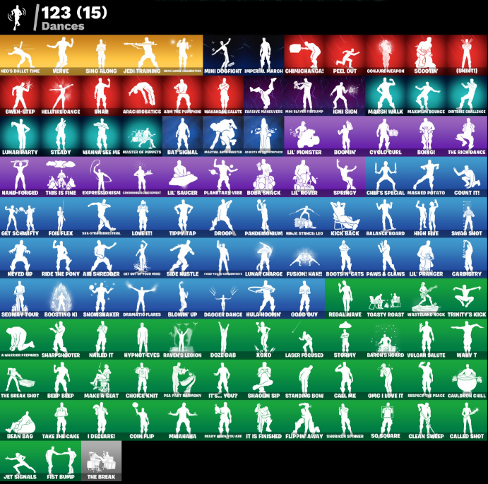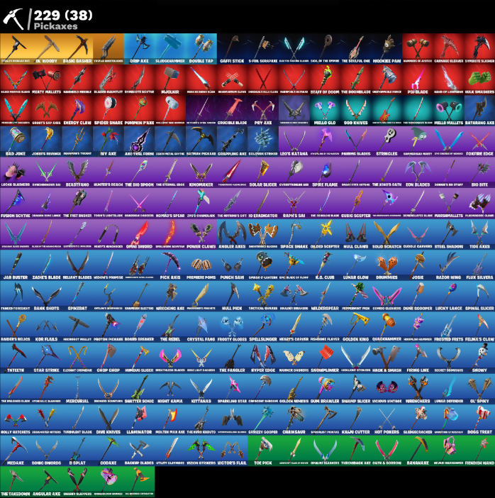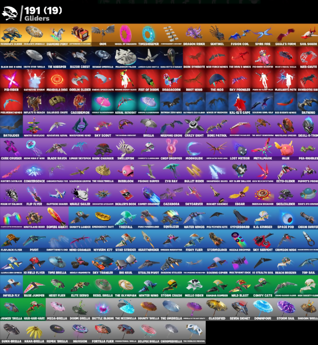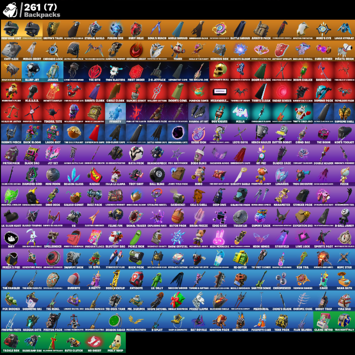 2-6 Jetpack, 2020 Kickflip, 8 Splat, 8-Splat, 999 Knives, A Merry 37, A Warrior Prepares, Acrobatics, Adira, Adventure Astral, Adventure Pack, Aegina Energy Blobie, Aerial Acrobat, Agent Jones, Agent Peely, Air Shredder, Ambler Axes, Angular Axe, Antidote, Aquaman, Arctic Addrel, Arm The Pumpkin, Arroyo Pack, Ascetic Meditation, Astroworld Cruiser, Atturdan Clears, Auto Clutch, Axe Harsh Asmaras, Axe True Form, B-Ball Janxy, Back Bloom, Bad Joke, Bagger Blades, Bags of Justice, Balance Board, Ball Bling, Banana Bomber, Bananake, Bann Shots, Barbaric Battle Axe, Baron's Hoard, Base Jumper, Basic Basher, Basiccamp Bag, Bat Royale, Bat Signal, Batarang Axe, Batglider, Batman Pickaxe, Batman Zero, Batman Zero Wing, Batman's DX-Glider, Battle Bloom, Battle Shroud, Battle-Worn Camo, Battlefires Blades, Batwing, Beach Bomber, Beach Breezer, Beacon Glass, Bean Bag, Beast Barn Katana, Beastfang, Beastmode, Beep Beep, Beetle Juice Daggers, Beskar Umbrella, Betty, Big Bite, Big Chuggus, Big Haul, Black Metal Battle Battle, Black One X-Wing, Blade Bag, Blade Raven, Bladed Cage, Bladed Trapper, Blistering Crush, Bloodsport Xcutlfy, Blowin' Up, Blue Fox Scrapaxe, Blustery Bag, Board Breaker, Boardwario Board, Boba Bling, Boba Fett, Boba Snack, Bobo, Boing!, Bombs Away!, Bone Patrol, Book of Candleskin, Boom Meagrave, Boomin', Boosting Ki, Bootsin' Cats Paws & Claws, Bounty Brella, Brain Freeze, Brella, Brides Rex, Broadcast Blazer, Bronzed Scimitars, Bubbloon, Bullet Rider, Butter Robot, Buzz Pack, CODAxe, Cable Cloak, Cacodemon, Cake!, Calico-Gonut, Call Me, Called Shot, Camo vs Chic, Cardistry, Carnage, Carnage Cleaver, Caster Starcon, Castor, Cauldron Chill, Cazadora, Cazadora Wings, Cell, Cell's Shell, Ceremon's Lock, Chain Shank, Chain Surfer, Charged Long, Charlotte, Chef's Special, Cherry Blossom, Chimichanga!, Choice Knit, Chop Chop, Chop Dropper, Chrombrella, Chrome Cloudcrosser, Chrome Punk, Chrome Seed, Clark Kent, Classified, Clawz Retro, Clean Sweep, Cliffside Soarer, Cluck, Coin Flip, Collider Dagger, Combo Cleavers, Comet Crasher, Comfy Cats, Commander's Escort, Conjure Weapon, Convergence, Convoy Chomps, Count It!, Cowboy's Cowpoke, Crazy Eight, Crimson Crest, Crimson Wish, Crossbridge Movement, Crucible Blade, Crystal Fang, Cube Cruiser, Cube Esther, Cubic Scepter, Cuddle Carver, Cuff Case, Cunnnar, Cyclo, Cyclo Curl, Dagger Dance, Danger Zone, Daredevil, Dark Charger, Dark Symbiote, Darkshine Cape, Darth Vader, Dawnner's Do Staff, Deadlock, Deadpool, Dealer's Deck, Death Star Starella, Deep Dive, Desert Duelist, Devil Kings Glaive, Diagonal Fangs, Diamond Grid, Diamond Pony, Dino Bandana, Dino Deck, DirtBike Challenge, Dive Knives, Doctor Doom, Doctor Slone, Doctor Strange, Dogs Treat, Domino, Domino Pack, Donatello, Doom, Doom Brella, Doom Slayer, Doom's Chalice, Doom's Cloak, Doom's Cowl, Doom's Steal, Double Decay, Double Slicaxe, Double Tap, Downpour, Doze Dab, Dr. Destructator, Dragacorn, Dragon Long Axe, Dragon Radar, Dragon Rider, Dragon Slayer Lance, Dragonbon's Vanity, Dramatic Flares, Drip Axe, Droop, Druid Blades, Drummines, Drustvar Updraft, Dune Scooper, Dusk Knight, Dusty, Dynamo, Dynamo Bandolier, Eagle's Form, Earthroot Hunter, Echo Drop Pack, Echo Drop's Case, Eclipse Brella, Eco-Rider Cape, Ecto-Glider, Eddie Brock, Edge Case, Eggar, Ek, Elegant Crowbar, Elite Servo, Emergency Raft, Emma Frost, Endless Scroll, Energy Claw, Eon, Eon Blades, Epic Blue of Road, Equalizer, Era, Erisa, Eternal Knight, Eternal Shield, Evasive Maneuvers, Eve, Everbright Axe, Everything's End, Expedition Bag, Exploding Rims, Expressionism, Fa-La-La-Llama, Fade, Fadia Starflame, Fanged Forestar, Felina, Felina's Claw, Feline Fun, Festival Llama, Fiendish Wand, Firefrosty, Firing Line, First Order, Fishbone Flayer, Fishstick-Janky, Fishy Flier, Fist Bump, Fist Of Doom, Fizzik, Flip Flyer, Flipjack Flyer, Flippin' Away, Fluk Silvera, Flux Silvera, Fogfire Edge, Fortilla Flier, Foul Flex, Foundation Sail, Founders Glider, Founders Umbrella, Friez, Frost Squad, Frosted Betis, Frosted Frust, Frosty Globes, Fryda's Pod, Fusion, Fusion Coil, Fusion Orb, Fusion Scythe, Fusion! Hah!!, Fuzzfetti Cake, Gable, Gaffi Stick, Galactog Phantom, Gardener, Gathering Storm, Gear Encased Mavis, Genos Spideromite, Geralt of Rivia, Get Out Of Your Mind, Get Schwifty, Ghost Man, Ghost Trap, Goblin Glider, Goert's Sad Axes, Gold Brutus, Gold Midas, Gold Peerless GS, Gold Reaper Blade, Gold Tintina, Golden King, Golden Nemesis, Golden Retribution, Goobzy Gouger, Good Guy, Gorzz, Grand Bag, Grand Radiant, Grand Slasher Glider, Grappling Axe, Grave Feather, Greatest Glory Epic, Green Goblin, Griffin's Talon, Groot, Groot's Outfit, Groovy Cloudcrosser, Grump, Gryph's Hollow, Guardian Daggers, Guhn-Brella, Guigonjon, Gum Brawler, Gumbo, Gummy Sack, Gwen-Step, Gymlock's Oath, Hack & Smack, Hadron Gate, Hammers of Justice, Hana-Brella, Hand Plant, Hand of Lightning, Hand-Forged, Har-Har-Har!, Harlowe, Harrier Basher, Harrison, Hatch Pack, Haven, Hearts Carver, Heartwinder, Heist Flier, Hella, Hellfire Dance, Helsie, Hench Hauler, High Five, Highwire, Himarsa Cloak, Hit Me!, Holding Pen, Holiday Rocky, Holly Hatchets, Homestead Rifle, Hope Star, Horseshoe Skull, Hot Pokers, Hot Slurp Balloon, Hot Zone, Hula Hoopin', Hulk Smashes, Humungo Slicer, Hunter's Reach, Hunter's Skyblade, Hunters Trophy, Hyperboard, Hypnot Eyes, I Declare!, I Need Your Co-Operation, ID Eradicator, ID Stealth Sail, IQ Field Flyer, Ice Tea Battling, Ign1 Sign, Ignition Pack, Imani, Imperial March, Independence Paratrooper, Indestructible Chest, Indestructible Shield, Indiana Jones, Indigo Ice Destroyer, Infield Fly, Infinite Bloom, Infinity, Infinity Gauntlet, Inflat-A-Roach, Ink-Jay, Inky, Inv Axe, Invasion, Iron Man Zero, Iso, It Is Finished, It's... You?, J.B. Chimpanski, Jar Buster, Jedi Training, Jet Set, Jet Signals, Joey, John's Field Pack, Joke Pack, Joker's Revenge, Jonsey vs Rox, Jordan Walters, Josie, Jugglus, Jules, Junker Umbrella, K.O. 