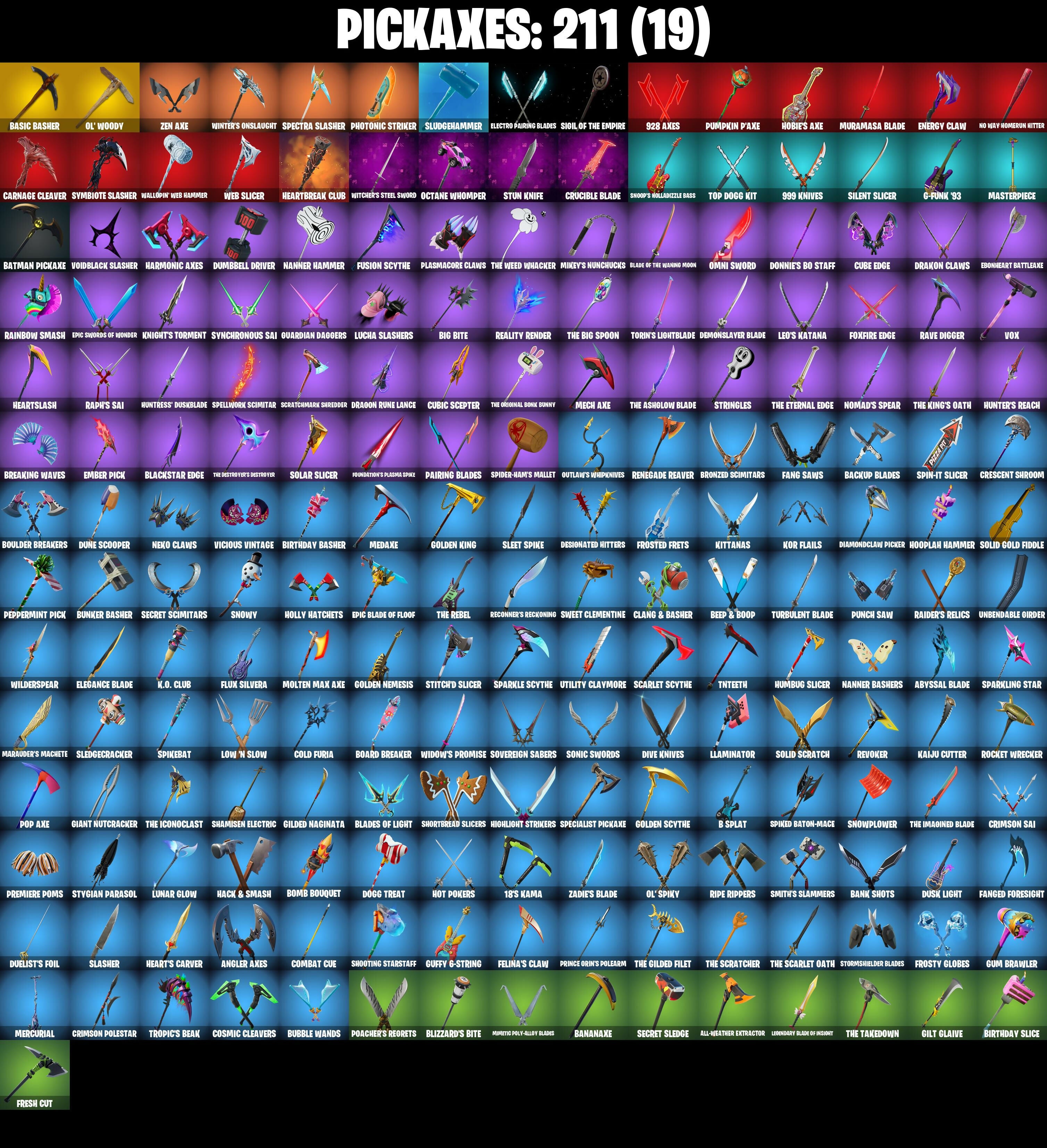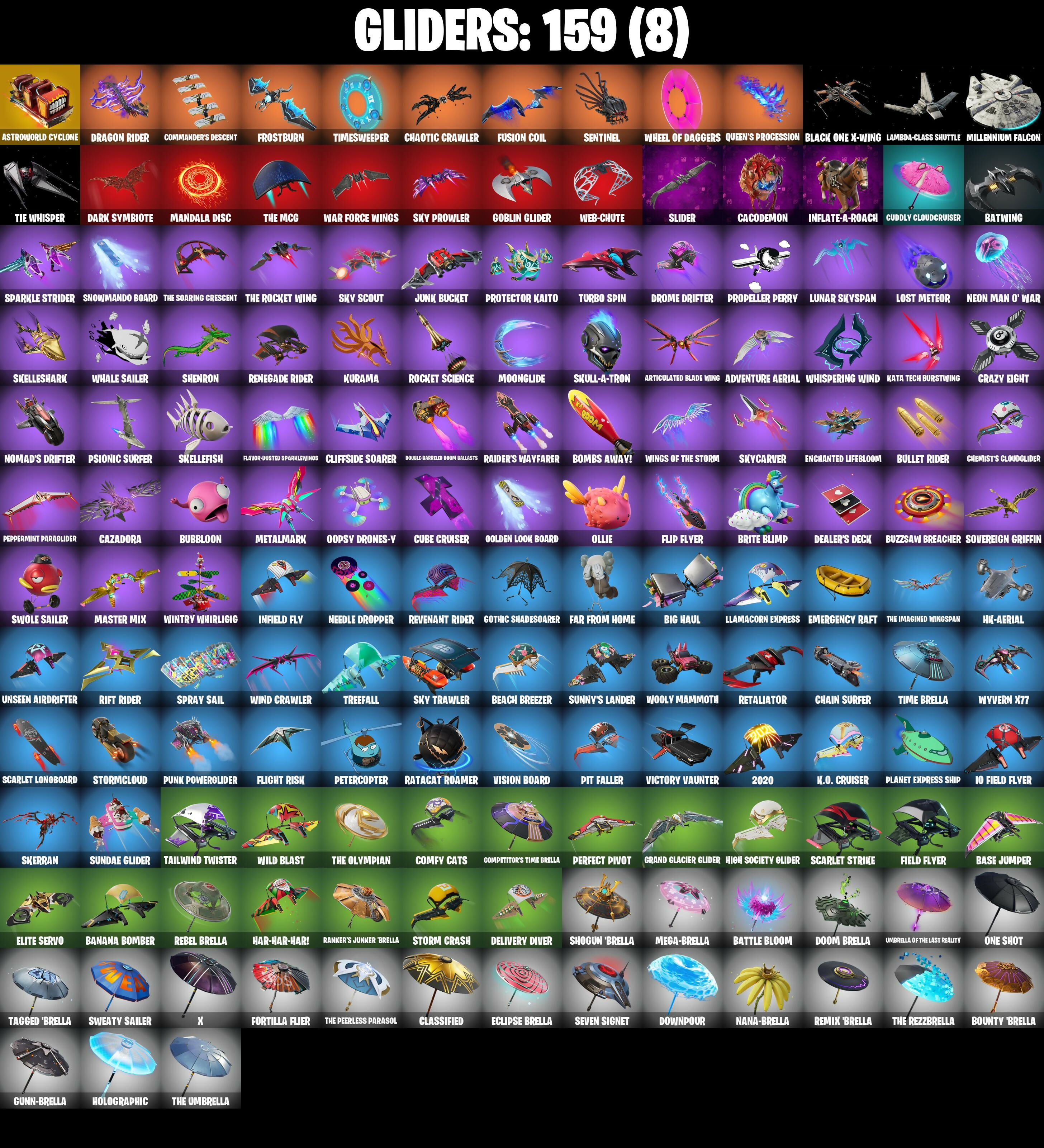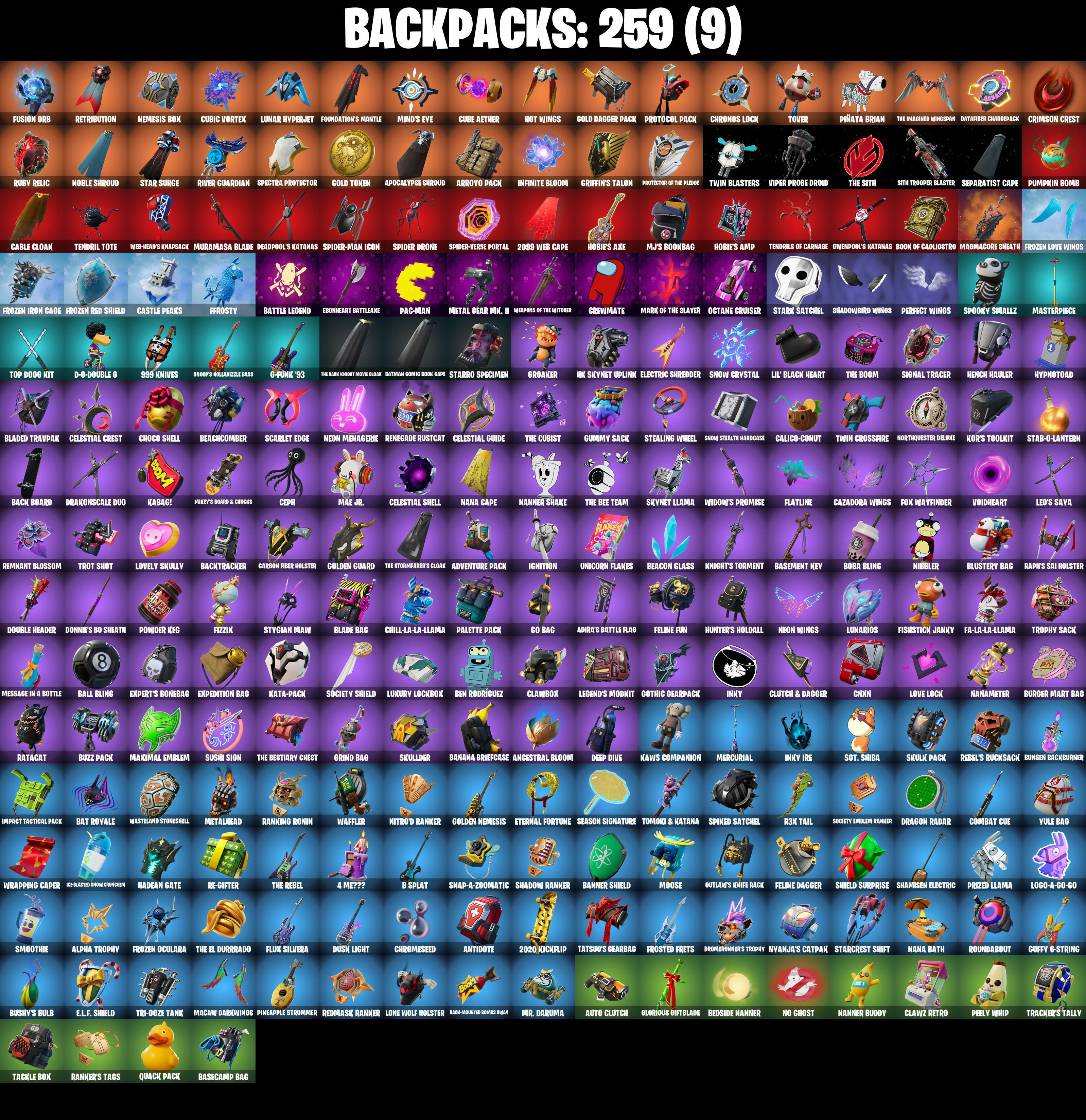1-Ball, 10 Field Flyer, 18's Kama, 2020, 2020 Kickflip, 2099 Web Cape, 4 Me???, 8-Ball Vs Scratch, 928 Axes, 999 Knives, AbseNz, Abyssal Blade, Adira, Adira (Battle Mask), Adira's Battle Flag, Adventure Aerial, Adventure Pack, Aftermath, Agent Peely, Ahsoka Tano, All Red, All-Weather Extractor, Alpha Trophy, Ancestral Bloom, Andy Fangerson, Angler Axes, Antidote, Antonia, Apocalypse Shroud, Arctic Adeline, Arm The Pumpkin!, Arroyo Pack, Articulated Blade Wing, Ascension Nezumi, Astrea, Astro Armor, Astroworld Cyclone, Auto Clutch, Axion Sentinel, Axion Sentinel (Charged), B Splat, Back Board, Back-Amounted Bonus Away, Backtracker, Backup Blades, Balance Board, Ball Bling, Banana Bomber, Banana Briefcase, Bananaxe, Bank Shots, Banner Shield, Base Jumper, Basecamp Bag, Basement Key, Basic Basher, Bat Royale, Batman Comic Book Outfit, Batman Gothic Book Lamp, Batman Pickaxe, Battle Bloom, Battle Call, Battle Legend, Batwing, Beach Breezer, Beachcomber, Beacon Glass, Bedside Nanner, Beep & Boop, Beep Beep, Ben Rodriguez, Bender Bending Rodriguez, Big Bite, Big Fan, Big Haul, Billy Bounce, Bim Bam Boom, Birthday Basher, Birthday Slice, Black One X-Wing, Blackstar Edge, Blade Rag, Blade of the Waning Moon, Bladed Trapvak, Blades of Light, Blizzard's Bite, Bloodsport, Blowin' Up, Blowing Bubbles, Blustery Bag, Board Breaker, Boba Bling, Boba Snack, Boing!, Bomb Bouquet, Bombs Away!, Boogie Down, Book of Caolostro, Boosting Ki, Boulder Breakers, Bounty Brella, Breaking Point, Breaking Waves, Breezabelle, Bring It Around, Brite Blimp, Brite Bomber, Bronzed Scimitars, Brutus, Bubble Wands, Bubblegum Highwire, Bubloon, Bullet Rider, Bun Bun, Bunker Basher, Bunker Jonesy, Bunsen Backburner, Burger Mart Bag, Burning Ambition Valeria, Bushy's Bulb, Buzz Pack, Buzzsaw Breacher, Cable, Cable Cloak, Cacodemon, Calico-Conut, Call Me, Cameo Vs Chic, Carbon Fiber Holster, Carnage, Carnage (Maximum), Carnage Cleaver, Castle Peaks, Catalyst, Cazadora, Cazadora Wings, Celestial Crest, Celestial Guide, Celestial Shell, Ceph, Chain Surfer, Chalked Up 1-Ball, Chaos Director, Chaotic Crawler, Charlotte, Charlotte (Golden Rune), Chef's Special, Chemist's Cloudglider, Chicken Wing It, Chill-La-La-Llama, Chimichanga!, Choco Shell, Choice Knit, Chromeseed, Chronos Lock, Clang & Basher, Classified, Clawbox, Clawz Retro, Cliffside Soarer, Cluck Strut, Clutch & Dagger, CnXin, Codename E.L.E., Coffin, Coin Flip, Cold Furia, Combat Cue, Comfy Cats, Commander's Descent, Competitor's Time Brella, Conjure Weapon, Cosmic Cleavers, Count It!, Crack It, Crazy Eight, Crazyboy, Crescent Shroom, Crewmate, Crimson Crest, Crimson Polestar, Crimson Sai, Crowning Achievement, Crucible Blade, Cube Aether, Cube Assassin, Cube Cruiser, Cube Edge, Cubic Scepter, Cubic Vortex, Cuddly Cloudcruiser, Curling Iron, Cyclo Curl, D-O Double G, Dab, Dabstand, Dagger Dance, Dance Monkey, Dark Symbiote, Darth Vader, Datafiber Chargepack, Deadpool, Deadpool Unmasked, Deadpool's Katanas, Dealer's Deck, Deep Dab, Deep Dive, Deep End, Delivery Diver, Demi, Demonslayer Blade, Desert Dominator, Desionated Hitters, Diamond Throne, Diamondclaw Picker, Dice Roll, Distraction Dance, Dive Knives, Do The 'Split, Doctor Strange, Doctor Strange (Stealth Silver), Dogg Treat, Donatello, Donnie's Bo Sheath, Donnie's Bo Staff, Doom Brella, Doom Slayer, Double Header, Double-Barrelled Boomballasts, Downpour, Doze Dab, Dragon Radar, Dragon Rider, Dragon Rune Lance, Drakon Claws, Drakon Steel Hybrid, Drakonscale Duo, Dramatic Flares, Dream Feet, Drome Drifter, Dronepwner's Trophy, Droop, Duelist's Foil, Dumbbell Driver, Dune Scooper, Dusk Light, Dusty, Dynamo TNToon-A, Dynamo Tntina, E.L.F. Shield, Ebonheart Battleaxe, Eclipse Brella, Electric Shredder, Electro Pairing Blades, Elegance Blade, Elite Servo, Ember Pick, Emergency Raft, Empress Fan Dance, Enchanted Lifebloom, Energy Claw, Epic Blade of Floof, Epic Swords of Wonder, Era, Erisa, Erisa (Stealth Silver), Eternal Fortune, Ether, Evie, Evie (Summer Strider), Expedition Bag, Expert's Bonebag, Expressionism, Extraterrestrial, Fa-La-La-Llama, Fabio Sparklemane, Fabio Sparklemane (Golden Rune), Face Palm, Fang Saws, Fanged Foresight, Far From Home, Felina, Felina's Claw, Feline Dagger, Feline Fun, Ffrosty, Field Flyer, Fish Thicc, Fishstick Janky, Fizzik, Flaky Feast, Flashback Breakdown, Flatline, Flavor-Dusted Sparklewings, Flight Risk, Flip Flyer, Flippin' Away, Flux Silvera, Focused, Foil Flex, Fortilla Flier, Foundation's Mantle, Foundation's Plasma Spike, Fox Wayfinder, Foxfire Edge, Fresh Cut, Frostburn, Frosted Frets, Frosty Globes, Frozen Fishstick, Frozen Iron Cage, Frozen Love Ranger, Frozen Love Wings, Frozen Nog Ops, Frozen Ocolara, Frozen Raven, Frozen Red Knight, Frozen Red Shield, Full Googly, Fusion, Fusion Coil, Fusion Orb, Fusion Scythe, G-Funk '93, G-Punk '93, Gear Specialist Maya, Gear Specialist Maya (Hat - Dark), Geralt Of Rivia, Get Griddy, Get Lost, Get Out Of Your Mind, Giant Nutcracker, Gilded Naginata, Gildhart, Gilt Glaive, Glorious Giftblade, Go Bag, Goblin Glider, Gold Dagger Pack, Gold Token, Golden Guard, Golden King, Golden Look Board, Golden Nemesis, Golden Scythe, Good Guy, Gothic Gearpack, Gothic Shadesoarer, Grand Glacier Glider, Green Goblin, Griffin's Talon, Grind Bag, Groaker, Guardian Daggers, Guardian Jade, Guffy 6-String, Guffy G-String, Gum Brawler, Gumbo, Gumbo (Sour), Gummy Sack, Gunn-Brella, Gunnar, Gunnar (Stealth Silver), Gwenpool's Katanas, HK Skynet Uplink, Hack & Smash, Hadean Gate, Hand-Forged, Hang Loose, Har-Har-Har!, Harbinger Armor Omegaorok, Harlowe, Harlowe (Helmet), Harmonic Axes, Have A Seat, Haven, Haven (Tropical Chirper), Heart Sign, Heart's Carver, Heartbreak Club, Heartbreak Ranger, Heartburst, Heartslash, Heel Click Breakdown, HelicHopper, Helsie, Hench Hauler, High Five, High Society Glider, Highlight Strikers, Highwire, Hit It, Hk-Aerial, Hobie's Amp, Hobie's Axe, Holiday Boxy, Holly Hatchets, Holographic, Hooplah Hammer, Hope, Hot Pokers, Hot Wings