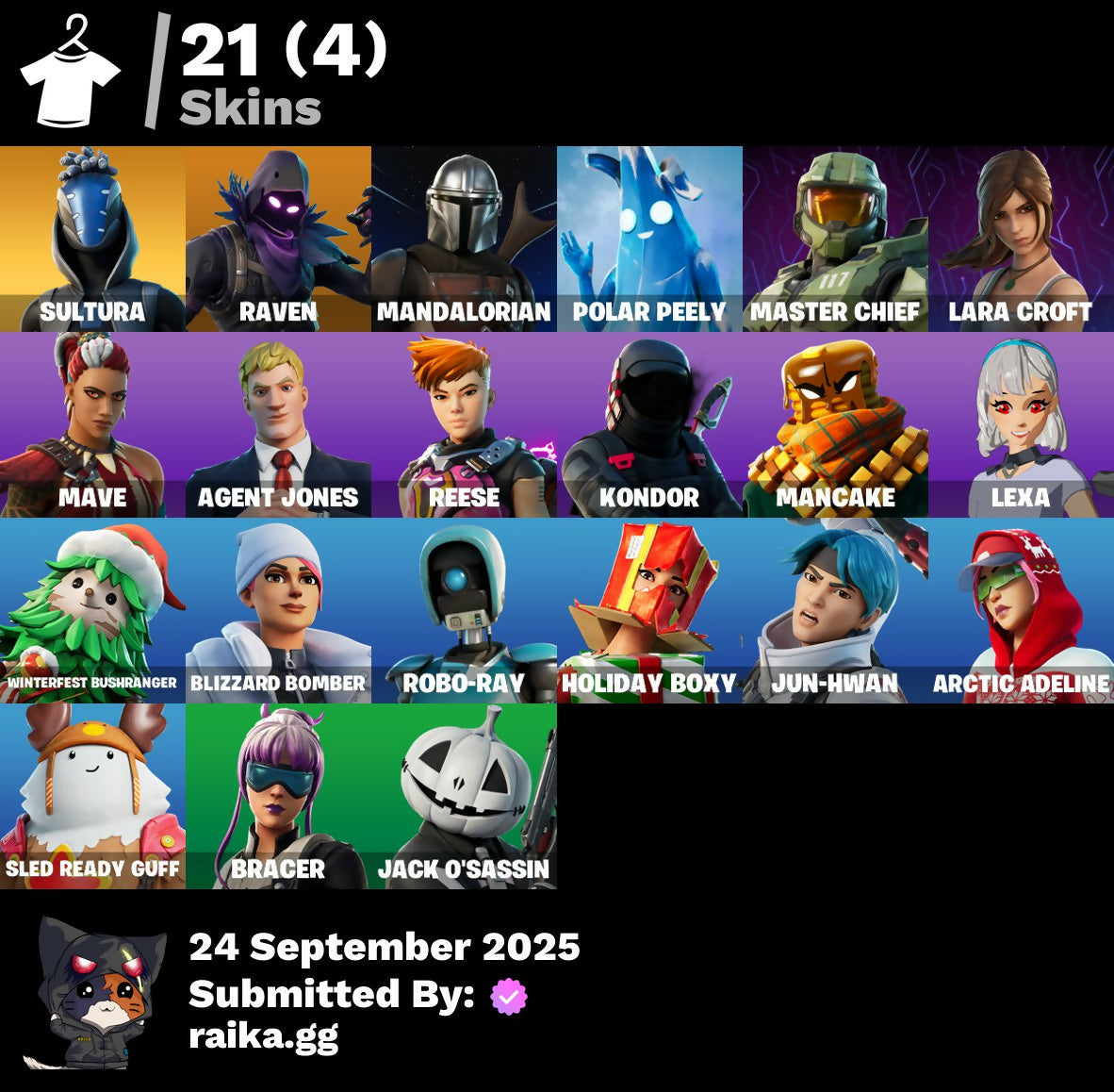 [PC/PSN/XBOX] 21 skins | Master Chief | Sultura | Raven | Mandalorian | Polar Peely | Lara Croft | Mave | Agent Jones | Reese | Kondor | Mancake | Lexa | 900 VB / FN