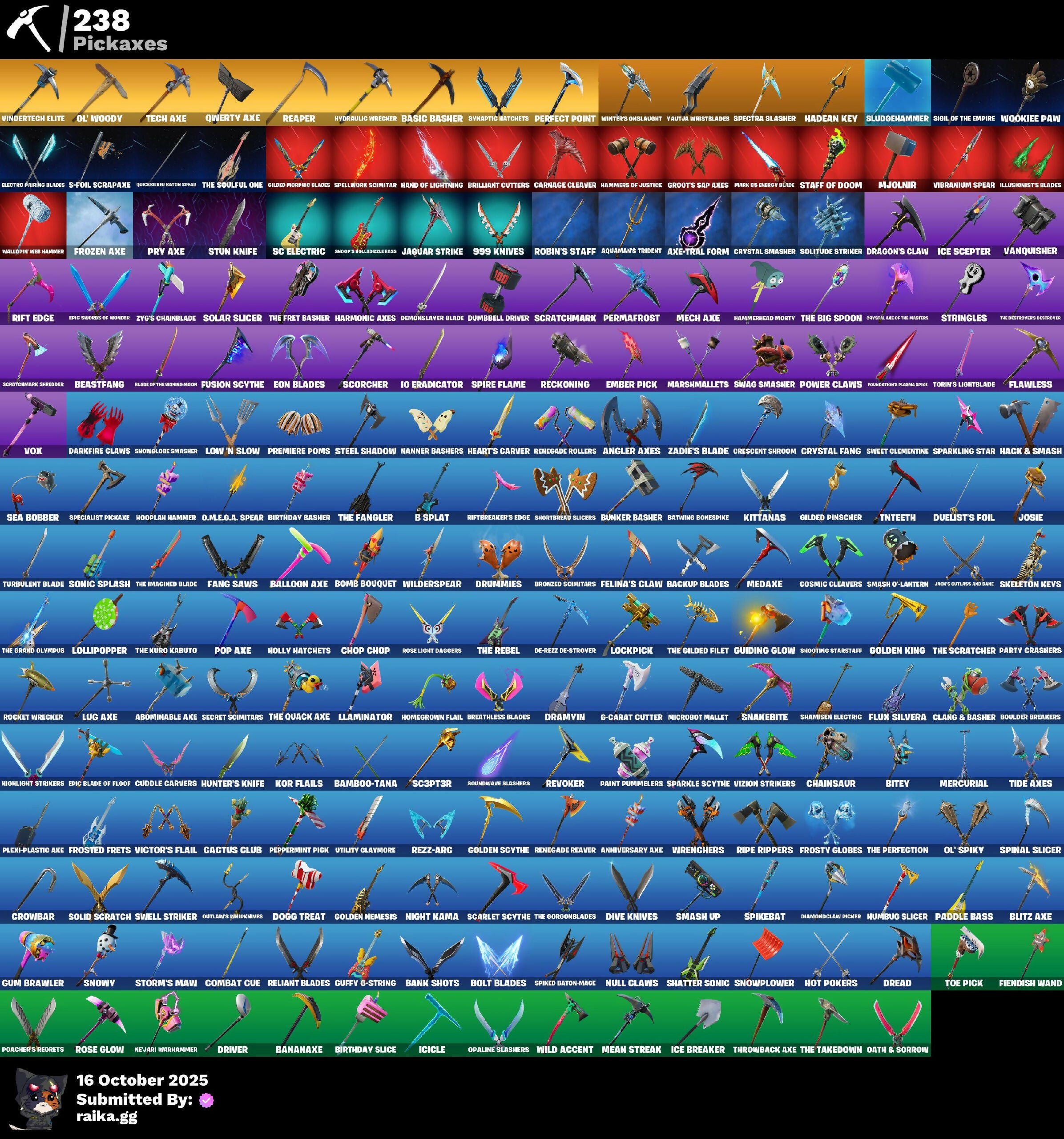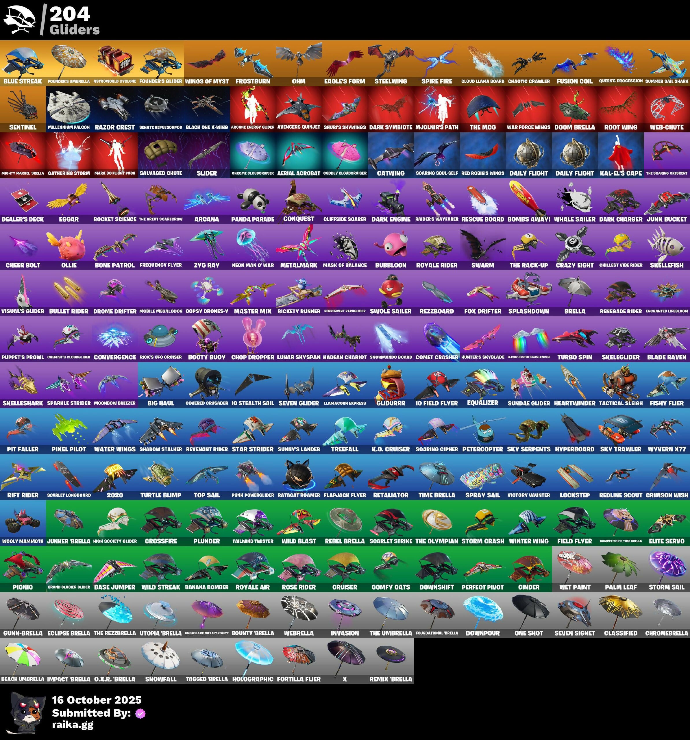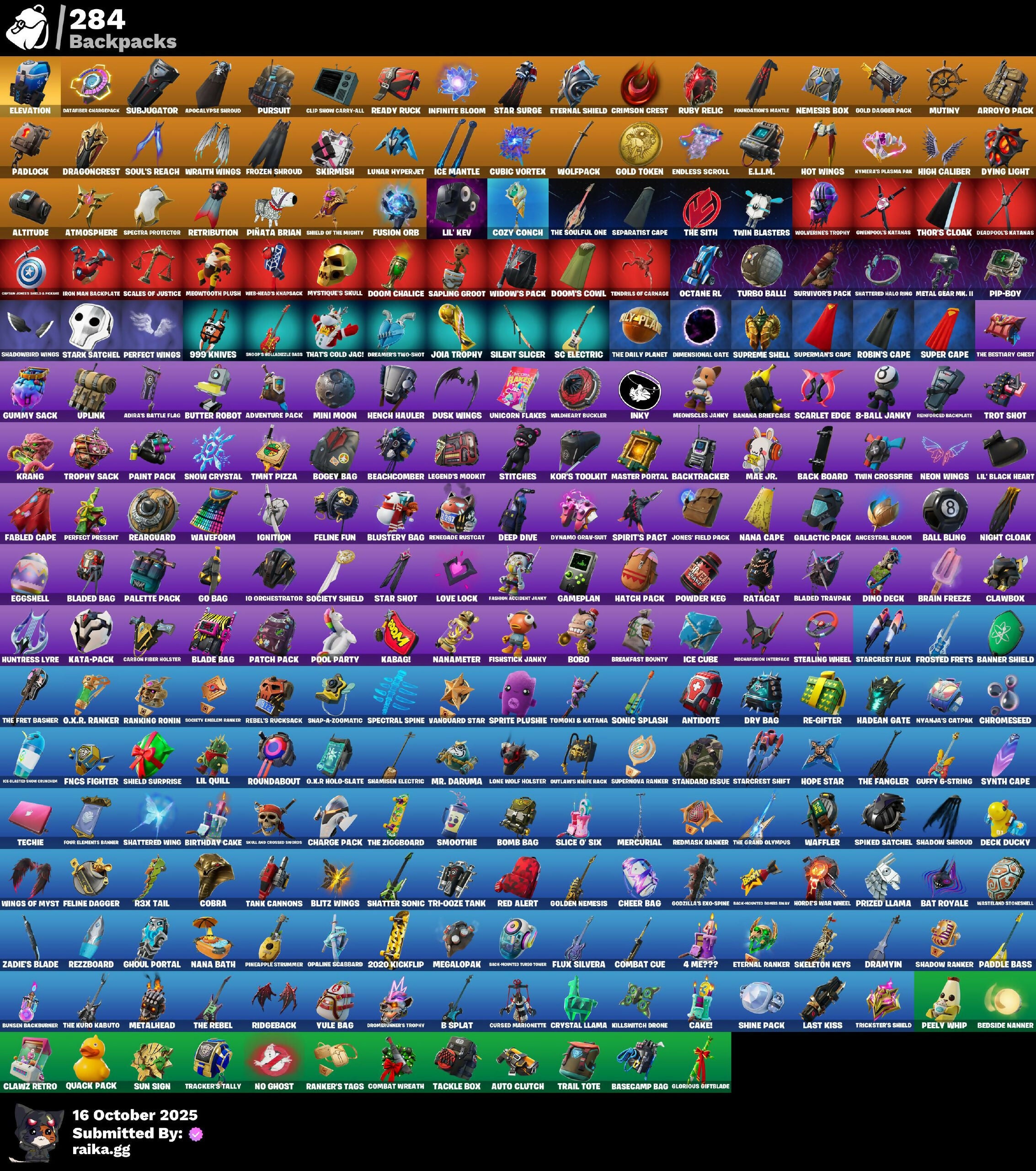 1-Ball, 10 Eradicator, 2020, 2020 Kickflip, 2022, 4 Me???, 6-Carat Cutter, 8-Ball, 8-Ball Janky, 8-Ball vs Scratch, 999 Knives, A Warrior Prepares, A.I.M., A.L.T.E.R., Abduction, Abominable Axe, Acolyte's Curse, Adira's Armor, Adira's Battle Flag, Adventure Pack, Aerial Acrobat, Aerial Assault Bomber, Aerial Classic, Aerial Swagger, Afterparty, Agent Jones, Agent Jones (Jump 31), Agent Nana, Agent Peely, Air Shredder, Altitude, Ancestral Bloom, Angler Axes, Anniversary Axe, Antidote, Apocalypse Shroud, Appeling Drive, Aquaman, Aquaman's Trident, Arcana, Arcane Energy Glider, Arcane Research, Arcane Steel, Arctic Camo, Ark, Array, Arrovo Pack, Arthur Curry, Astro Antidote, Astro Jack, Astroworld Cyclone, Atmosphere, Auntie Dot, Auto Clutch, Avengers Logo, Avengers Quinjet, Axe-tral Form, Azarath Metronomitchos, B Splat, B Splatt, B.R.U.T.E. Gunner, Babygirl!!!, Back Board, Back-Mounted Bombs Mk. II, Back-Mounted Turbo Throne, Backtracker, Backup Blades, Bacon, Bag of Coal, Baited, Ball Bling, Balloon Axe, Bamboo-Tana, Banana Bomber, Banana Briefcase, Bananas, Bananaxe, Bandollette, Bank Shots, Banner, Banner Icon, Banner Shield, Base Jumper, Basecamp Bag, Basic Basher, Bat, Bat Royale, Batarang, Batman, Battle Ball, Battle Bus Balloon, Battle Mode, Batwing Bonespike, Bawk Off, Beach Ball, Beach Chair, Beach Umbrella, Beachcomber, Beamers, Bean Bag, Beastfang, Beatbox, Bedside Nanner, Beef Blade, Beep Beep, Bees!, Behold!, Belt It!, Berserker Barrage, Bhangra Boogie, Big Guns, Big Haul, Bike To Go, Birdarang Flourish, Birthday Basher, Birthday Cake, Birthday Dash, Birthday Slice, Bitey, Bitter Sweets, Black Eternal Knight, Black Knight, Black Leader, Black One X-Wing, Black Werewolf, Black Widow Outfit, Blackheart, Blade Bag, Blade Of The Waning Moon, Blade Raven, Bladed Bag, Bladed Trapvak, Blasted, Blitz Axe, Blitz Wings, Blocko, Blooming Bouquet, Blowing Bubbles, Blue Streak, Blue Team Leader, Blustery Bag, Bob Cut, Bobo, Bogey Bag, Boing!, Bolt Blades, Bomb Bag, Bomb Bouquet, Bombs Away!, Bone, Bone Patrol, Boneless, Boogeyman, Boogie, Boogie Down, Boomin', Boots N' Cats, Booty Buoy, Bot, Both Eyes Open, Boulder Breakers, Bounty 'Brella, Brain Freeze, Breakdown, Breakfast Bounty, Breakneck, Breathless Blades, Brella, Brilliant Cutters, Brite & Speedy, Brite Bomber, Bronzed Scimitars, Brood, Brutus, Bubloon, Bullet Rider, Bunker Basher, Bunker Jonesy, Bunny Brawler, Bunny Hop, Bunsen Backburner, Burning Ambition Valeria, Bush Peek, Bushie Bright, Butter Robot, Butterfly, Buttoned Up, By The Horns, Bytes Sigil, Cactus Club, Cactus Maze, Cake!, Cakey, Calamity, Calculated, Calico, Call Me, Callsign Falcon, Callsign Hornet, Callsign Skull, Callsign Wolf, Cameo, Cameo vs Chic, Campfire, Candy Cane, Captain Alamerica, Captain America's Shield & Pickaxe, Captain America’s Shield, Carbon & Gold, Carbon Fiber, Carbon Fiber Holster, Carbon Scarlet, Card Drop, Cardistry, Carnage, Carnage Cleaver, Cash Grab, Cat Flip, Catalyst, Catwing, Cauldron Chill, Cerberus Bite, Cerberus Medallion, Chains, Chainsaur, Chalked Up 1-Ball, Challenger Menace - Flame, Chaos Directive, Chaos Director, Chaotic Crawler, Chapter 3 Season 1 Live, V.20.0, Chapter 3 Season 2 Live 120, Charge Pack, Charlotte, Charlotte's Logo, Cheer Bag, Cheer Bolt, Chemist's Cloudglider, Chibi, Chic, Chillest Vibe Rider, Chillshot, Choice Knit, Chomp Cudi!, Choose Naughty, Chop Chop, Chop Dropper, Choppy, Chrombrella, Chrome Cloudcruiser, Chrome Marked, Chromeseed, Cimere, Cinder, Clang & Basher, Clark Kent, Classic Wolverine, Classified, Clawbox, Clawz Retro, Clean Sweep, Cliffside Soarer, Clip Show Carry-All, Cloud Llama Board, Cloud Striker, Cloudburst, Cluck, Cluck (Slurpy), Cluck Strut, Clucking Mad, Clutch, Coastal Machinist, Cobalt, Cobalt Overdrive, Cobra, Coconuts, Coin Flip, Color Crush, Combat Cue, Combat Wreath, Comet, Comet Crasher, Comfy Cats, Compass, Competitor's Trip Brella, Concrete Axe Of The Hunter, Confetti, Confident Iridia, Conga, Conquest, Constructor, Controlled Chaos, Convergence, Corrosive Stripe, Corrupted, Cosmic Cleavers, Cosmic Sun, Covered Crusader, Cowboy Chat, Cozy Conch, Crabby King, Crashed Chiller, Crashed Shield, Crazy Boy, Crazy Castle, Crazy Eight, Crescent Shroom, Crimson Crest, Crimson Wish, Crossfire, Crowbar, Crowned, Crowning Achievement, Cruiser, Crunk Bunny, Cryptic, Crystal, Crystal Fang, Crystal Llama, Crystal Smasher, Cube, Cube Marking, Cubed, Cubic Vortex, Cuddle Carvers, Cuddle Hearts, Cuddle Team Hula, Cuddly Cloudcruiser, Cursed, Cursed Marionette, Cyclo Curl, D.C. 63, DJ Yonder, Da Bomb, Dabstand, Dagger Dance, Daigo’s Stance, Daily Flight, Daisies, Dance Me, Danger Zone, Dark, Dark Charger, Dark Engine, Dark Symbiote, Darkfire Claws, Data Broker Cambridge, Datafiber Chargepack, Daughter of Trigon, Dawn Duelist Nisha, De-Rezz De-Stroyer, Deadfire, Deadpool, Deadpool's Katanas, Dealer's Deck, Deck Ducky, Deep Dive, Deep End, Deep Future, Demi, Demons Beware, Demonslayer Blade, Denim Destiny, Determined Renegade, Diamond Diva, Diamond Shapes, Diamond Throne, Diamondclaw Deker, Dice, Dimensional Camo, Dimensional Gate, Dino Deck, Dinosaur, Dire, Direct the Chaos, Dirty Devastation, Disco, Diva’s Grin, Dive Knives, Division, Do The Split, Doctor Doom, Doctor Slone, Doctor Slone (Prismatic), Dogg Treat, Doggo, Dolphin, Doom Brella, Doom Chalice, Doom's Cowl, Doomperwing's Trophy, Double Pump, Downpour, Downshift, Doze Dab, Dragon Rune Lances, Dragon Scales, Dragon Spirit, Dragon Stance, Dragon's Claw, Dragoncrest, Dramvin, Dramyin, Dread, Dream, Dream Feet, Dreamer's Two-Shot, Drift, Driftwood, Driver, Drome Drifter, Drones-y View, Drooly, Droop, Droopy, Dropout, Drummies, Dry Bag, Duelist's Foil, Dumbbell Driver, Durr Burger, Durrr, Dusk, Dusk Knight, Dusk Wings, Dying Light, Dyna-Boom!, Dynamic Tintina, Dynamite, Dynamo, Dynamo Grav-Suit, Dynamo TNTina, E.G.O., E.L.I.M, EQ, ERISA Alert, Eagle's Form, Eclipse Brella, Eggar, Eggshell, Electro Pairing Blades, Electro Swing, Elemental