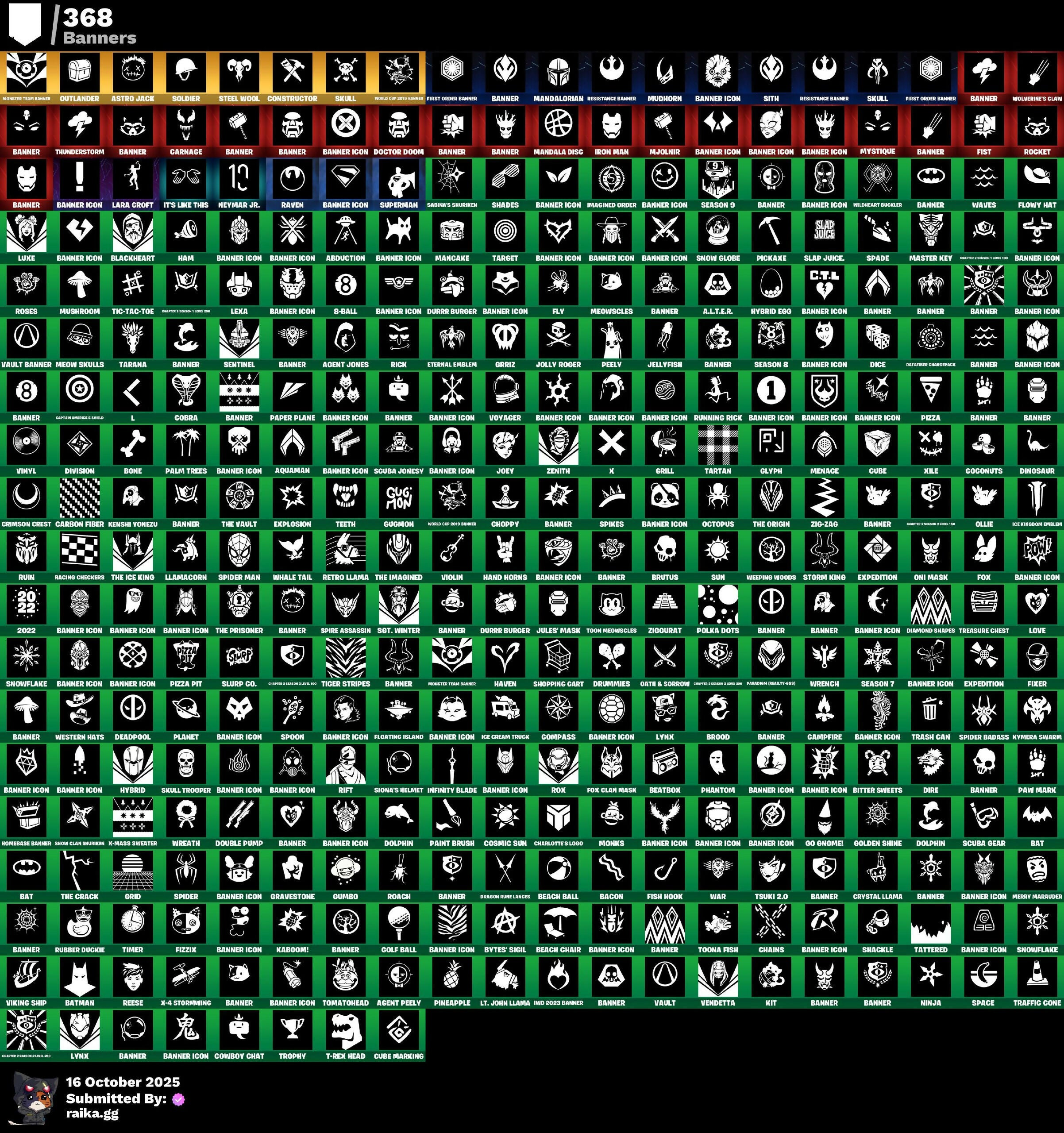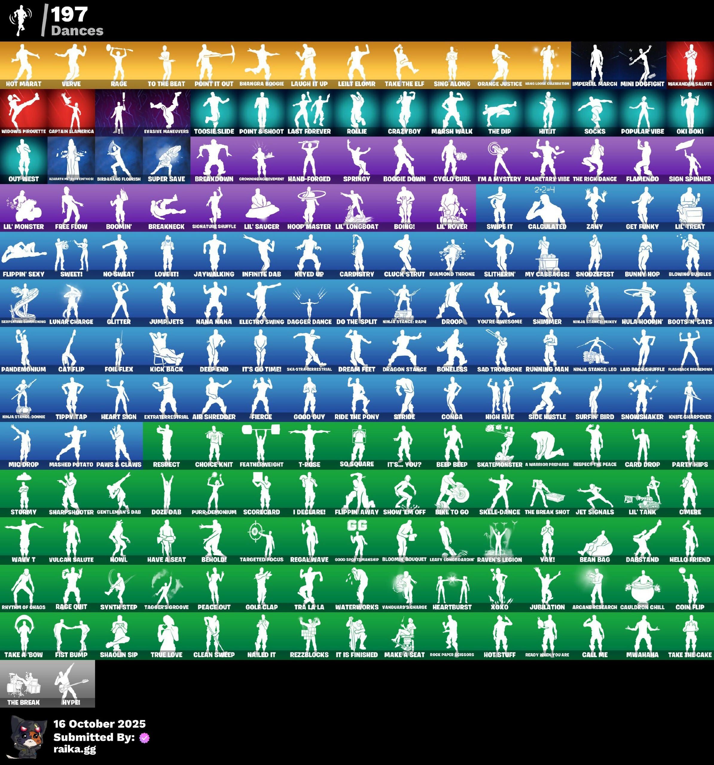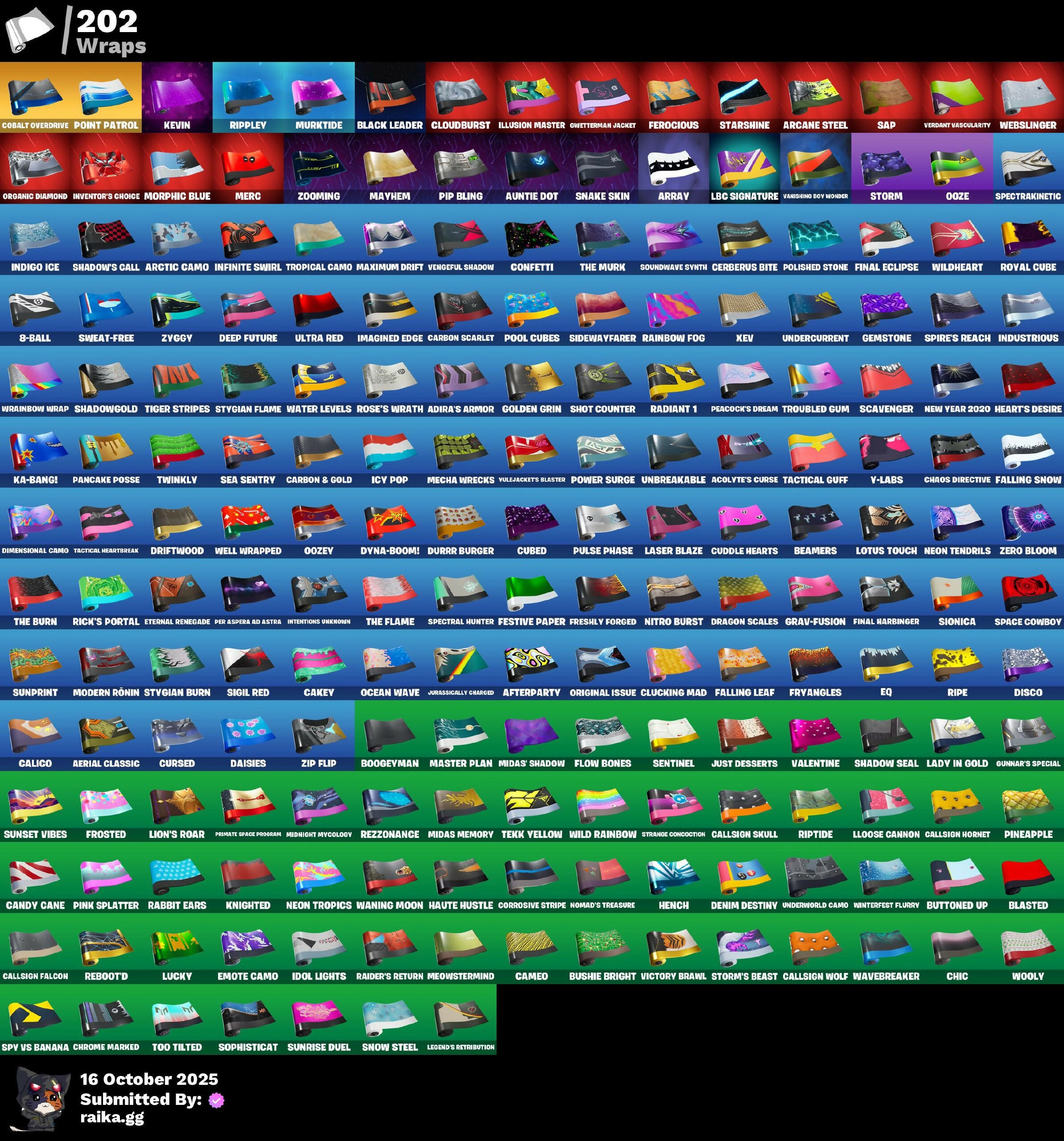 1-Ball, 10 Eradicator, 2020, 2020 Kickflip, 2022, 4 Me???, 6-Carat Cutter, 8-Ball, 8-Ball Janky, 8-Ball vs Scratch, 999 Knives, A Warrior Prepares, A.I.M., A.L.T.E.R., Abduction, Abominable Axe, Acolyte's Curse, Adira's Armor, Adira's Battle Flag, Adventure Pack, Aerial Acrobat, Aerial Assault Bomber, Aerial Classic, Aerial Swagger, Afterparty, Agent Jones, Agent Jones (Jump 31), Agent Nana, Agent Peely, Air Shredder, Altitude, Ancestral Bloom, Angler Axes, Anniversary Axe, Antidote, Apocalypse Shroud, Appeling Drive, Aquaman, Aquaman's Trident, Arcana, Arcane Energy Glider, Arcane Research, Arcane Steel, Arctic Camo, Ark, Array, Arrovo Pack, Arthur Curry, Astro Antidote, Astro Jack, Astroworld Cyclone, Atmosphere, Auntie Dot, Auto Clutch, Avengers Logo, Avengers Quinjet, Axe-tral Form, Azarath Metronomitchos, B Splat, B Splatt, B.R.U.T.E. Gunner, Babygirl!!!, Back Board, Back-Mounted Bombs Mk. II, Back-Mounted Turbo Throne, Backtracker, Backup Blades, Bacon, Bag of Coal, Baited, Ball Bling, Balloon Axe, Bamboo-Tana, Banana Bomber, Banana Briefcase, Bananas, Bananaxe, Bandollette, Bank Shots, Banner, Banner Icon, Banner Shield, Base Jumper, Basecamp Bag, Basic Basher, Bat, Bat Royale, Batarang, Batman, Battle Ball, Battle Bus Balloon, Battle Mode, Batwing Bonespike, Bawk Off, Beach Ball, Beach Chair, Beach Umbrella, Beachcomber, Beamers, Bean Bag, Beastfang, Beatbox, Bedside Nanner, Beef Blade, Beep Beep, Bees!, Behold!, Belt It!, Berserker Barrage, Bhangra Boogie, Big Guns, Big Haul, Bike To Go, Birdarang Flourish, Birthday Basher, Birthday Cake, Birthday Dash, Birthday Slice, Bitey, Bitter Sweets, Black Eternal Knight, Black Knight, Black Leader, Black One X-Wing, Black Werewolf, Black Widow Outfit, Blackheart, Blade Bag, Blade Of The Waning Moon, Blade Raven, Bladed Bag, Bladed Trapvak, Blasted, Blitz Axe, Blitz Wings, Blocko, Blooming Bouquet, Blowing Bubbles, Blue Streak, Blue Team Leader, Blustery Bag, Bob Cut, Bobo, Bogey Bag, Boing!, Bolt Blades, Bomb Bag, Bomb Bouquet, Bombs Away!, Bone, Bone Patrol, Boneless, Boogeyman, Boogie, Boogie Down, Boomin', Boots N' Cats, Booty Buoy, Bot, Both Eyes Open, Boulder Breakers, Bounty 'Brella, Brain Freeze, Breakdown, Breakfast Bounty, Breakneck, Breathless Blades, Brella, Brilliant Cutters, Brite & Speedy, Brite Bomber, Bronzed Scimitars, Brood, Brutus, Bubloon, Bullet Rider, Bunker Basher, Bunker Jonesy, Bunny Brawler, Bunny Hop, Bunsen Backburner, Burning Ambition Valeria, Bush Peek, Bushie Bright, Butter Robot, Butterfly, Buttoned Up, By The Horns, Bytes Sigil, Cactus Club, Cactus Maze, Cake!, Cakey, Calamity, Calculated, Calico, Call Me, Callsign Falcon, Callsign Hornet, Callsign Skull, Callsign Wolf, Cameo, Cameo vs Chic, Campfire, Candy Cane, Captain Alamerica, Captain America's Shield & Pickaxe, Captain America’s Shield, Carbon & Gold, Carbon Fiber, Carbon Fiber Holster, Carbon Scarlet, Card Drop, Cardistry, Carnage, Carnage Cleaver, Cash Grab, Cat Flip, Catalyst, Catwing, Cauldron Chill, Cerberus Bite, Cerberus Medallion, Chains, Chainsaur, Chalked Up 1-Ball, Challenger Menace - Flame, Chaos Directive, Chaos Director, Chaotic Crawler, Chapter 3 Season 1 Live, V.20.0, Chapter 3 Season 2 Live 120, Charge Pack, Charlotte, Charlotte's Logo, Cheer Bag, Cheer Bolt, Chemist's Cloudglider, Chibi, Chic, Chillest Vibe Rider, Chillshot, Choice Knit, Chomp Cudi!, Choose Naughty, Chop Chop, Chop Dropper, Choppy, Chrombrella, Chrome Cloudcruiser, Chrome Marked, Chromeseed, Cimere, Cinder, Clang & Basher, Clark Kent, Classic Wolverine, Classified, Clawbox, Clawz Retro, Clean Sweep, Cliffside Soarer, Clip Show Carry-All, Cloud Llama Board, Cloud Striker, Cloudburst, Cluck, Cluck (Slurpy), Cluck Strut, Clucking Mad, Clutch, Coastal Machinist, Cobalt, Cobalt Overdrive, Cobra, Coconuts, Coin Flip, Color Crush, Combat Cue, Combat Wreath, Comet, Comet Crasher, Comfy Cats, Compass, Competitor's Trip Brella, Concrete Axe Of The Hunter, Confetti, Confident Iridia, Conga, Conquest, Constructor, Controlled Chaos, Convergence, Corrosive Stripe, Corrupted, Cosmic Cleavers, Cosmic Sun, Covered Crusader, Cowboy Chat, Cozy Conch, Crabby King, Crashed Chiller, Crashed Shield, Crazy Boy, Crazy Castle, Crazy Eight, Crescent Shroom, Crimson Crest, Crimson Wish, Crossfire, Crowbar, Crowned, Crowning Achievement, Cruiser, Crunk Bunny, Cryptic, Crystal, Crystal Fang, Crystal Llama, Crystal Smasher, Cube, Cube Marking, Cubed, Cubic Vortex, Cuddle Carvers, Cuddle Hearts, Cuddle Team Hula, Cuddly Cloudcruiser, Cursed, Cursed Marionette, Cyclo Curl, D.C. 63, DJ Yonder, Da Bomb, Dabstand, Dagger Dance, Daigo’s Stance, Daily Flight, Daisies, Dance Me, Danger Zone, Dark, Dark Charger, Dark Engine, Dark Symbiote, Darkfire Claws, Data Broker Cambridge, Datafiber Chargepack, Daughter of Trigon, Dawn Duelist Nisha, De-Rezz De-Stroyer, Deadfire, Deadpool, Deadpool's Katanas, Dealer's Deck, Deck Ducky, Deep Dive, Deep End, Deep Future, Demi, Demons Beware, Demonslayer Blade, Denim Destiny, Determined Renegade, Diamond Diva, Diamond Shapes, Diamond Throne, Diamondclaw Deker, Dice, Dimensional Camo, Dimensional Gate, Dino Deck, Dinosaur, Dire, Direct the Chaos, Dirty Devastation, Disco, Diva’s Grin, Dive Knives, Division, Do The Split, Doctor Doom, Doctor Slone, Doctor Slone (Prismatic), Dogg Treat, Doggo, Dolphin, Doom Brella, Doom Chalice, Doom's Cowl, Doomperwing's Trophy, Double Pump, Downpour, Downshift, Doze Dab, Dragon Rune Lances, Dragon Scales, Dragon Spirit, Dragon Stance, Dragon's Claw, Dragoncrest, Dramvin, Dramyin, Dread, Dream, Dream Feet, Dreamer's Two-Shot, Drift, Driftwood, Driver, Drome Drifter, Drones-y View, Drooly, Droop, Droopy, Dropout, Drummies, Dry Bag, Duelist's Foil, Dumbbell Driver, Durr Burger, Durrr, Dusk, Dusk Knight, Dusk Wings, Dying Light, Dyna-Boom!, Dynamic Tintina, Dynamite, Dynamo, Dynamo Grav-Suit, Dynamo TNTina, E.G.O., E.L.I.M, EQ, ERISA Alert, Eagle's Form, Eclipse Brella, Eggar, Eggshell, Electro Pairing Blades, Electro Swing, Elemental