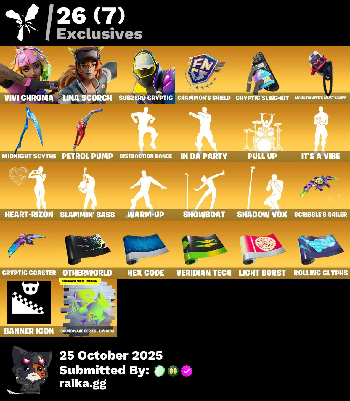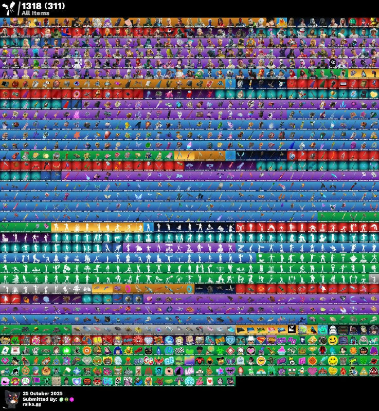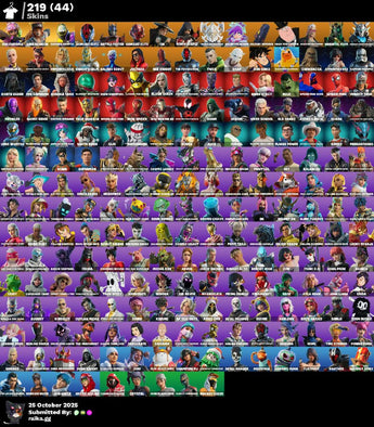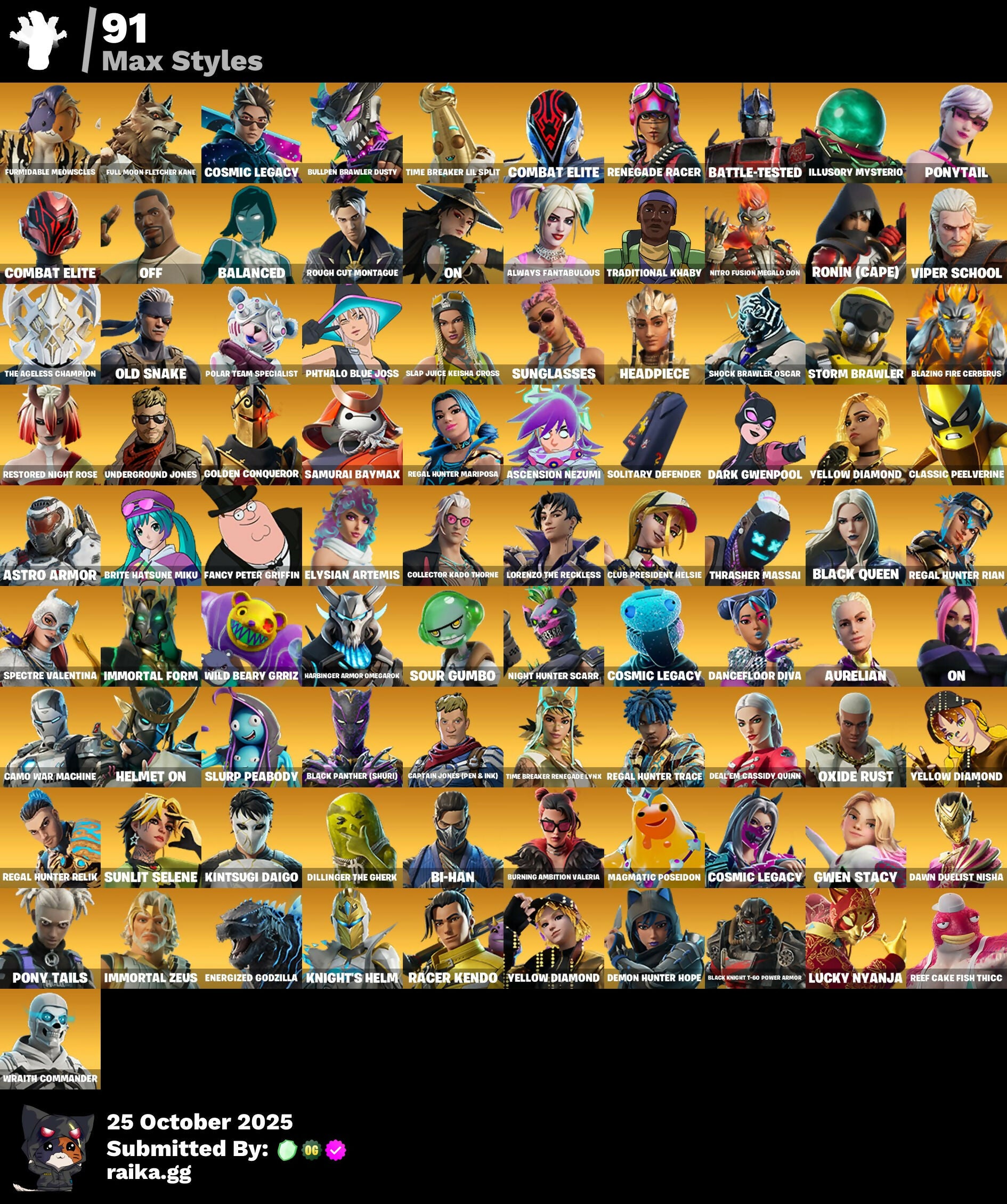Ahsoka Tano, Ajin, Aloe Lex, Alpha, Always Fantabulous, Aphrodite, Aquaman, Arcadian Renegade, Arctic Hedge, Armstice Elite, Ascension Nezumi, Ashes, Astro Armor, Augury, Aura, Aurelian, Axiom Sentinel, Ayla Winn, Balaclava Bling, Balanced, Banner Icon, Banshee, Batman, Battle-Tested, Baylee Skye, Bernie, Bi-Han, Black Knight T-60 Power Armor, Black Panther (Shuri), Black Queen, Black Widow, Blazing Fire Cerberus, Blizzard Tempest, Blossom, Brite Hatsune Miku, Brite Raider, Bugman, Bullpen Brawler Dusty, Burning Ambition Valeria, Camo War Machine, Captain America, Captain Jones (Pen & Ink), Captain Skull, Carmine Rosso, Carnage, Catwoman, Chamberlain, Champain, Champion Liz, Champion PJ, Champion's Shield, Chewbacca, Chifa, Chrome Punk, Classic Peelvérine, Clix, Club President Helsie, Cody Rhodes, Collector Kado Thorne, Combat Elite, Cosmic Legacy, Cryptic Coaster, Cryptic Sling-Kit, Crystal, Dana, Dancefloor Diva, Daredevil Reflux, Dark Gunsmoke, Dark Gwenpool, Dark Impact Shadow, Darth Vader, Dawn Duelist Nisha, Deadpool, Dealm Cassidy Quinn, Demon Hunter Hope, Dillinger The Gherk, Dior, Dirk, Distraction Dance, District Gamma League, Doctor Doom, Doctor Sledge, Dolly, Dominator Elite, Dominus Rex, Doom, Double-Taste, Dr. Happy's Backpack, Dragon, Dragon Godzilla, Duske Knight, Echo Dino Mechdroid, Elysian Artemis, Energized Godzilla, Engineer, Eriba, Evelyn, Fancy Peter Griffin, Felina, Fishstick, Flash, Flatfoot, Full Moon Fletcher Kane, Furmidable Meowscles, Gamer Girl Cross, Genji Bits, Ghost Rider, Gold Midas, Golden Conqueror, Gon Goku, Grace, Green Lantern, Groot, Groucho Marx, Gunner, Gwen Stacy, Hana Park, Harbinger Armor Omegak, Harlowe, Headpiece, Heart-Rizon, Helmet OH, Helmet On, Hex Code, Holiday Dory, Hoops, Hope, Hulk, Illusory Mysterio, Immortal Form, Immortal Roam, Immortal Zeus, Immortal Zion, In Da Party, Inkfire, Iron Man, Iron Spider, It's A Vibe, Joker, Joltara, Judd Hunter, Jules, Kingsley, Kintsugi Daigo, Kitsune Diablo, Knight's Helm, Knights Helm Galactic Scout, Kwame, Lady Loona Londo, Lenox Rose, Light Burst, Lillian Keymark, Lina Scorch, Linna Blossom, Lopez, Lorenzo The Reckless, Lt. John Libara, Lucky Nyanja, Magmatic Poseidon, Mandalorian, Mandarake, Marshall, Master Chief, Medusa, Megga Dash, Metamorph, Midnight Scythe, Mighty Thor, Moon Knight, Mountaineer's Must-Haves, Mrbeastgogo, Mutant, Mystique, Naruto, Neon, Neon Skills, Night Hunter Scarr, Nitro Fusion Megalo Don, Nolan Chance, Nyangelica, Obi-Wan Kenobi, Off, Old Snake, On, Otherworld, Outlaw Madsa, Oxide Fist, Oxide Rust, Panther, Peter Griffin, Petrol Pump, Phthalo Blue Joss, Pigfighter, Place Power, Poe Dameron, Polar Team Specialist, Ponce Bonus, Pony Tails, Ponytail, Powder, Pull Up, Puppet Master Juice, Queen Angela, Racer Kendo, Racer Mexido, Raven, Raven Commander, Raven Terra Lord, Rebo Oro, Reboot Man, Red Knight, Red Ready One, Redline, Redline Racer, Reef Cake Fish Thicc, Regal Amazon, Regal Amazon Mask, Regal Hunter Mariposa, Regal Hunter Relik, Regal Hunter Rian, Regal Hunter Trace, Renegade Racer, Restored Night Rose, Revlimu Christmas, Rhea, Ripley, Robin, Roko, Rolling Glyphs, Ronin (Cape), Rough Cut Montague, Runaway Racer, Russel, Ryder, Saitama, Samildercatch, Samurai Baymax, Sand-Man 2099, Santa Dogg, Sasuke, Scooch, Scribble's Sailer, Scully Coolcat, Sedona, Shade, Shadow Vox, She-Hulk, Shinji, Shock Brawler Oscar, Showboat, Siena Crushuta, Sir Raven, Skeel Ranger, Skull Trooper, Slammin' Bass, Slap Juice Keisha Cross, Slurp Peabody, Slurp Peaddy, Slushy Survivor, Snay, Solitary Blonde, Solitary Defender, Soltraia, Sonia, Sonny, Soundwave Series - Emicida, Sour Gumbo, Spectre Valentina, Spider-Man, Spider-Man 2099, Storm, Storm Blazer, Storm Brawler, Subzero Cryptic, Sucreve Gothic, Suecrete, Sugar Cookie, Sunblast, Sunglasses, Sunguards, Sunlit Selene, Sunset Alto, Superman, TNTina, TVWY, Tepig, Thanos, Thar, The Ageless Champion, The Foundation, The Mechanist, Thor, Thor Odinson, Thrasher Massai, Tide Strider, Time Breaker Lil Split, Time Breaker Renegade Lynx, Tony Peter, Toon Bushy, Toru, Traditional Khaby, Tsuki 2.0, Underground Jones, Unsc Spartan, Uvui Chroma, Vanguard Zero, Venom, Veridian Tech, Vibrow, Viper School, Vivi Chroma, Warm-Up, Wild Beary Grriz, Wolf, Wolverine, Wonder Woman, Wraith Commander, Yellow Diamond, Yoob Belly, Yure Jacket, Zloot, Zuri