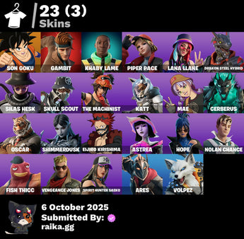 [PC/PSN/XBOX] 23 skins | Son Goku | Gambit | Khaby Lame | Piper Pace | Lana Llane | Drakon Steel Hybrid | Silas Hesk | Skull Scout | The Machinist | Katt | 2000 VB / FN