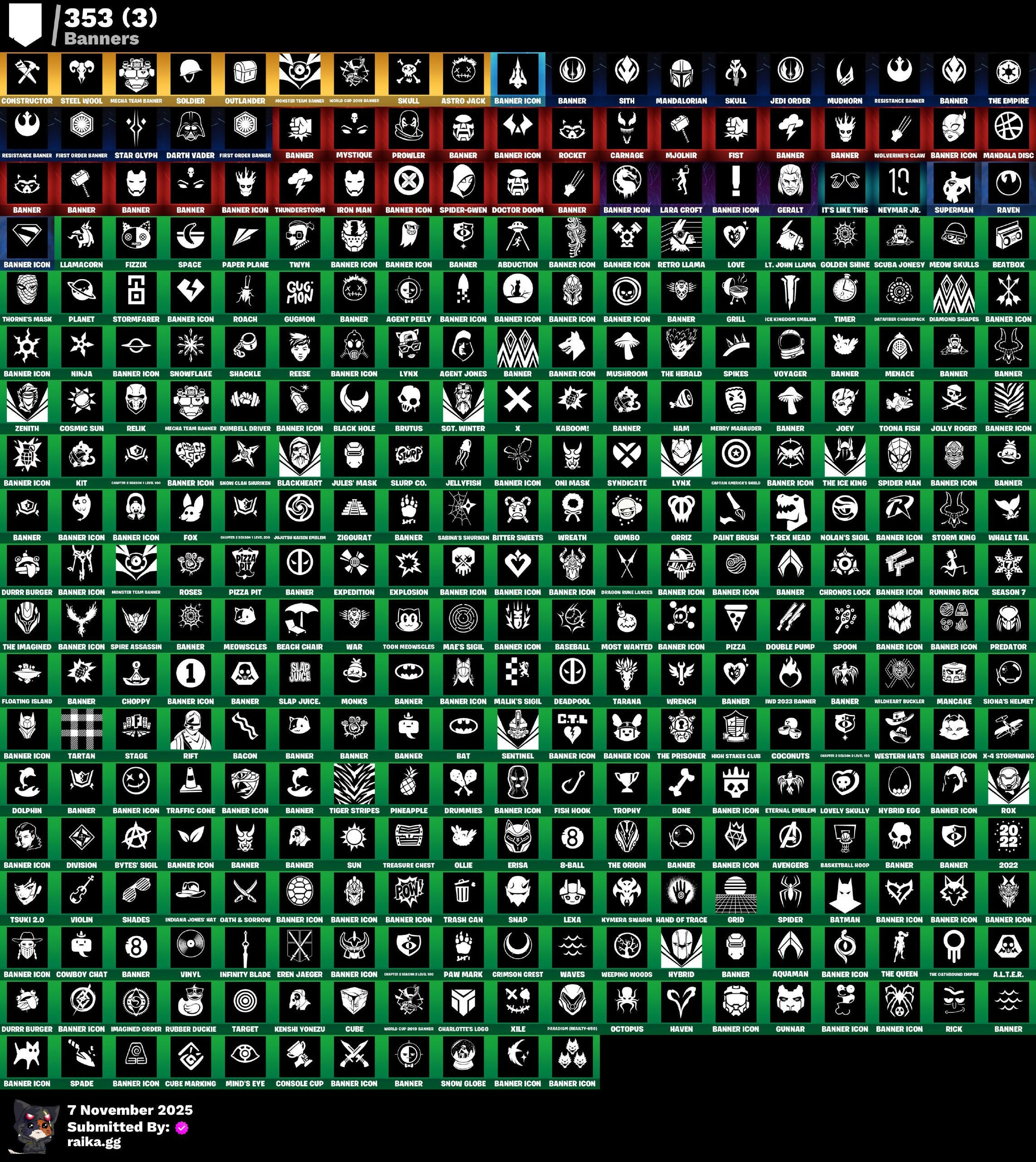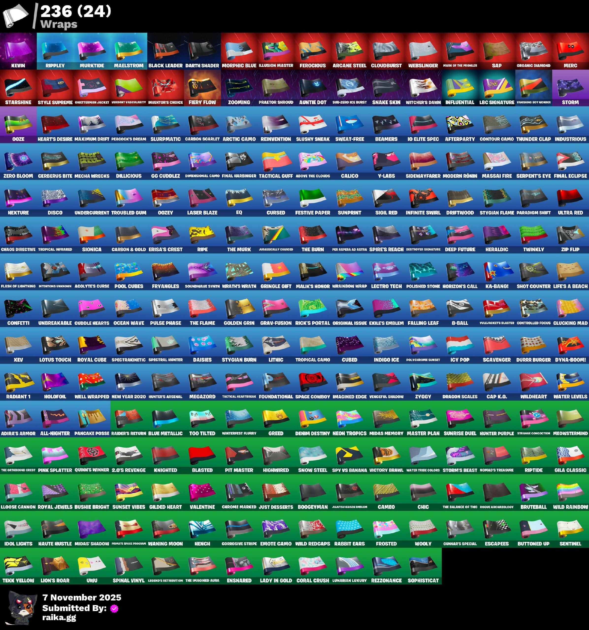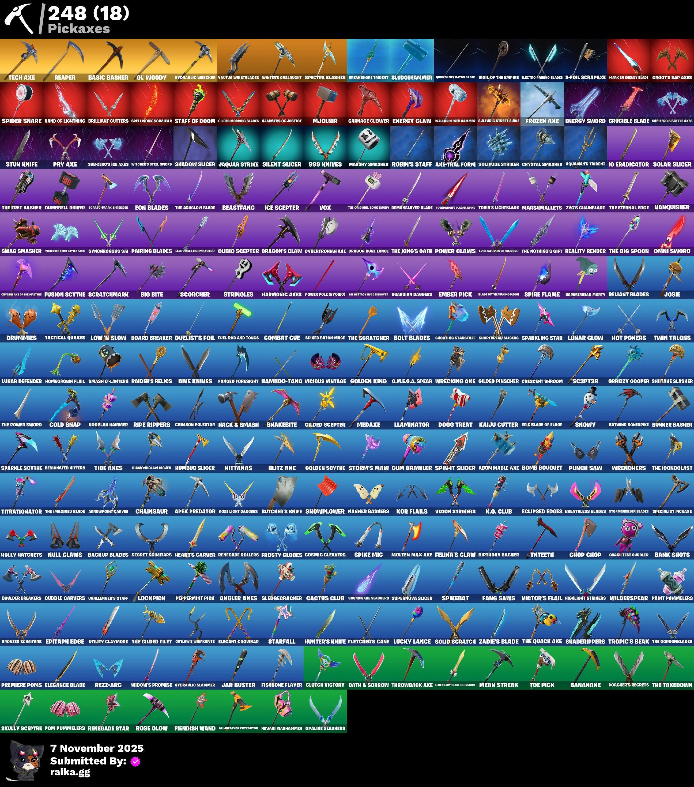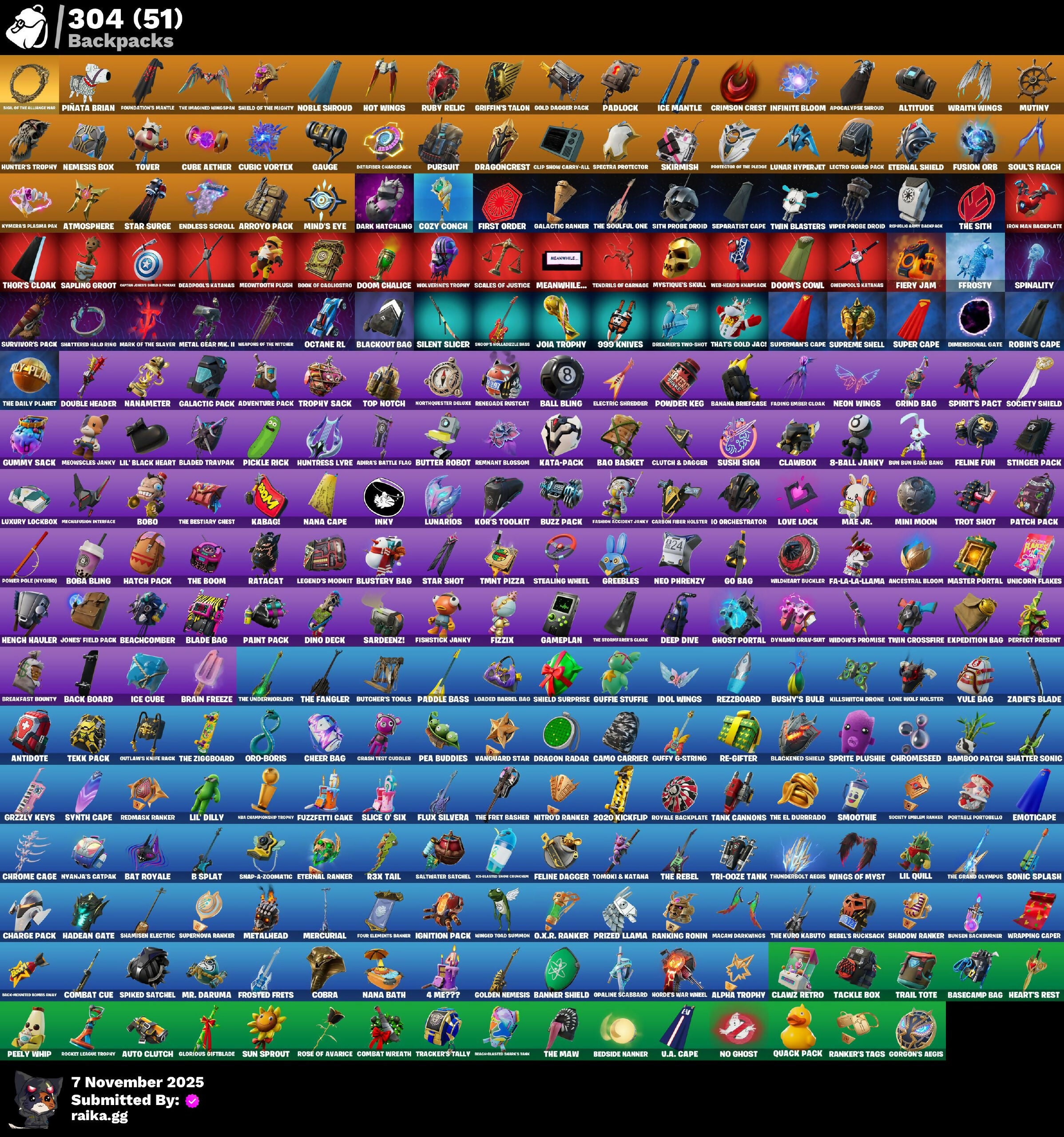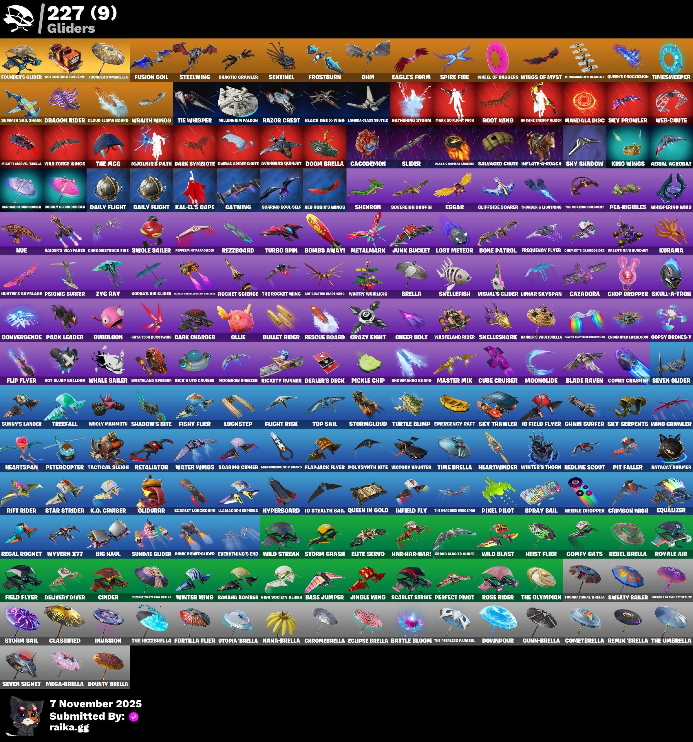 1-Ball, 10 Elite Spec, 10 Field Flyer, 10 Stealth Sail, 2.0's Revenge, 2020 Kickflip, 2022, 4 Me???, 8-Ball, 8-Ball Janky, 8-Ball Vs Scratch, 909 Knives, 999 Knives, A Warrior Prepares, A.L.T.E.R., Abduction, Abominable Axe, Above The Clouds, Acolyte's Curse, Adira, Adira's Armor, Adira’s Battle Flag, Adventure Pack, Aerial, Aerial Ablaze, Aerial Acrobat, Afterparty, Agent Jones, Agent Jones (Jump 31), Agent Nana, Agent Peely, Ahsoka Tano, Air Shredder, All-Nighter, All-Weather Extractor, Alpha Trophy, Altitude, Ancestral Bloom, Angler Axes, Antidote, Antonia, Antonia In Action, Apex Predator, Aphrodite, Apocalypse Shroud, Appeeling Drive, Aquaman, Aquaman's Trident, Arachrobatics, Arcade Cat, Arcane Energy Glider, Arcane Research, Arcane Steel, Arctic Achiever, Arctic Adeline, Arctic Camo, Ark, Arrowpoint Carver, Arroyo Pack, Art The Hack, Artemis, Arthur Curry, Articulated Blade Wing, Astro Antidote, Astro Armor, Astro Jack, Astroworld Cyclone, Atmosphere, Auntie Dot, Aurelian, Auto Clutch, Avatar's Flourish, Avengers, Avengers Logo, Avengers Quinjet, Axe-Trail Form, Azareth Major Contents, B Splat, Babygirl!!!, Back Board, Backup Blades, Bacon, Bag Of Coal, Baited, Balance Board, Balanced, Ball Bling, Bam-Boom!, Bamboo Patch, Bamboo-Tana, Banana Bomber, Banana Briefcase, Bananas, Bananaxe, Bank Off, Bank Shots, Banker's Vault Brella, Banner, Banner Icon, Banner Shield, Bao Basket, Bao Bros, Baron Kane, Baron's Hoard, Base Jumper, Baseball, Basecamp Bag, Basic Basher, Basketball Hoop, Bat, Bat Royale, Batarang, Batman, Battle Bloom, Battle Bus Balloon, Battle Mode, Batwing Bonespike, Beach Chair, Beachcomber, Beamers, Bean Bag, Beast Boy & Raven, Beastfang, Beatbox, Beatzbunny, Bedside Nanner, Beef Blade, Beep Beep, Bees!, Belt It!, Berserker Barrage, Beskar, Bi-Han, Big Bite, Big Dill, Big Fan, Big Guns, Big Haul, Bike To Go, Birdarang Flourish, Birthday Basher, Birthday Dash, Bitter Sweets, Black Eternal Knight, Black Hole, Black Knight, Black Leader, Black One X-Wing, Blackened Shield, Blackheart, Blackout Bag, Blade Bag, Blade Raven, Blade of the Waning Moon, Bladed Travpak, Blasted, Blitz Axe, Blizzabelle, Blocko, Blowin' Up, Blowing Bubbles, Blue Metallic, Blustery Bag, Board Breaker, Bob Cut, Boba Bling, Boba Snack, Bobo, Boing!, Bolt Blades, Bomb Bouquet, Bombs Away!, Bone, Bone Patrol, Boneyard Brand, Boogeyman, Boogie Down, Book of Calamistro, Boomin', Boosting Ki, Boot It, Boots'n'Cats, Bot, Both Eyes Open, Boulder Breakers, Bounty 'Brella, Brain Freeze, Breakfast Bounty, Breakneck, Breakshore Trident, Breathless Blades, Brella, Brilliant Cutters, Brite Bomber, Bronzed Scimitars, Bruteball, Brutus, Bubbloon, Buffer Fish, Bullet Rider, Bullpen Brawler Dusty, Bun Bun Blast, Bunker Basher, Bunker Jonesy, Bunsen Backburner, Burger Competitor, Burning Ambition Valeria, Burning Ember, Bush Peek, Bushie Bright, Bushy’s Bulb, Butcher's Knife, Butcher’s Tools, Butter Robot, Butterfly, Buttoned Up, Buzz Pack, By The Horns, Bytes, Bytes' Sigil, Cacodemon, Cactus Club, Calico, Call Me, Called Shot, Cameo, Cameo Vs Chic, Camo Carrier, Cap K.O., Cap Kick, Captain America's Shields, Captain America’s Shield & Mjolnir, Captain Ilamerica, Carbon & Gold, Carbon Fiber Holster, Carbon Scarlet, Card Drop, Cardistry, Carnage, Carnage Cleaver, Cash Grab, Cassidy Quinn, Catalyst, Catflip, Catwing, Cauldron Chill, Cazadora, Cerberus, Cerberus Bite, Cerberus Medallion, Chain Surfer, Chainsaur, Chalked Up 1-Ball, Challenger Cerberus, Challenger Menace - Flame, Challenger's Staff, Champaska Wants You, Chaos Directive, Chaos Director, Chaotic Crawler, Chapter 3 Season 5 Win Icon, Chapter 4 Season 4 Level 130, Charge Pack, Charging Up, Charlotte, Charlotte's Logo, Cheer Bag, Cheer Bolt, Chef's Special, Chemist's Cloudglider, Chibi, Chic, Chicken Wing It, Choice Knit, Chomp Cud!!, Choose Naughty, Chop Chop, Chop Dropper, Choppy, Chrome Cage, Chrome Cloudcruiser, Chrome Marked, Chrome Punk, Chrome Seed, Chromebrella, Chromestruck Fire, Chronos Lock, Cinder, Clark Kent, Classic Wolverine, Classified, Clawbox, Clawz Retro, Clean Sweep, Cliffside Soarer, Cloud Llama Board, Cloudburst, Club President Helsie, Cluck, Cluck (Slurpy), Cluck Strut, Clucking Mad, Clutch & Dagger, Clutch Victory, Cobra, Coconuts, Coin Flip, Cold Snap, Collector Kado Thorne, Combat Cue, Combat Elite, Combat Giller, Combat Wreath, Comet, Comet Crasher, Cometbrella, Comfy Cats, Commander's Descent, Competitor Medusa, Competitor's Time Brella, Conch Call, Confetti, Confident Iridia, Conga, Conjure Weapon, Console Cup, Constructor, Contour Camo, Controlled Chaos, Controlled Focus, Convergence, Coral Crush, Corrosive Stripe, Corrupted, Coruscant Guard, Cosmic Cleavers, Cosmic Sun, Count It!, Courageous Mikasa, Cowboy Chat, Cozy Conch, Crabby King, Crack It, Crash Test Cuddler, Crashed Chiller, Crashed Shield, Crazy Castle, Crazy Eight, Crescent Shroom, Crimson Crest, Crimson Polestar, Crimson Wish, Cross Brand Entrance, Cross Your Heart, Crowned, Crowning Achievement, Crucible Blade, Crystal Axe of the Masters, Crystal Smasher, Cube, Cube Aether, Cube Cruiser, Cube Marking, Cubed, Cubic Scepter, Cubic Vortex, Cuddle Carvers, Cuddle Hearts, Cuddle Scream Laura, Cuddle Team Hula, Cuddles' Garden, Cuddly Cloudcruiser, Curling Iron, Cursed, Cybertronian Axe, Cyclo Curl, D.C. 63, Dabstand, Dagger Dance, Daigo's Stance, Daily Flight, Daisies, Dance Mat, Dark, Dark Charger, Dark Hatchling, Dark Side Rising, Dark Symbiote, Dark Tricera Ops, Darth Shader, Darth Vader, Databiner Charged Pack, Datafryer Chargerjack, Daughter Of Trigon, Dawn Duelist Nisha, Deadpool, Deadpool’s Katanas, Dealer's Deck, Deep Dab, Deep Dive, Deep End, Deep Future, Delivery Diver, Demi, Demons Beware, Demonslayer Blade, Denim Destiny, Designated Hitters, Destroyer Signature, Determined Korra, Determined Renegade, Diamond Shapes, Diamond Throne, Diamondclaw Picker, Dice Roll, Dillicious, Dillinger The Gherk, Dimensional Camo, Dimensional Gate, Dino Deck, Dino Mega