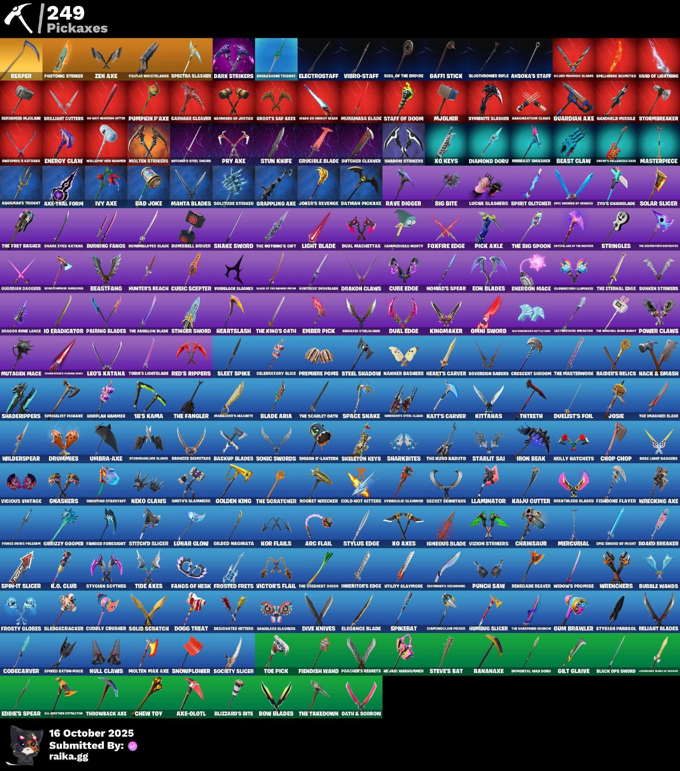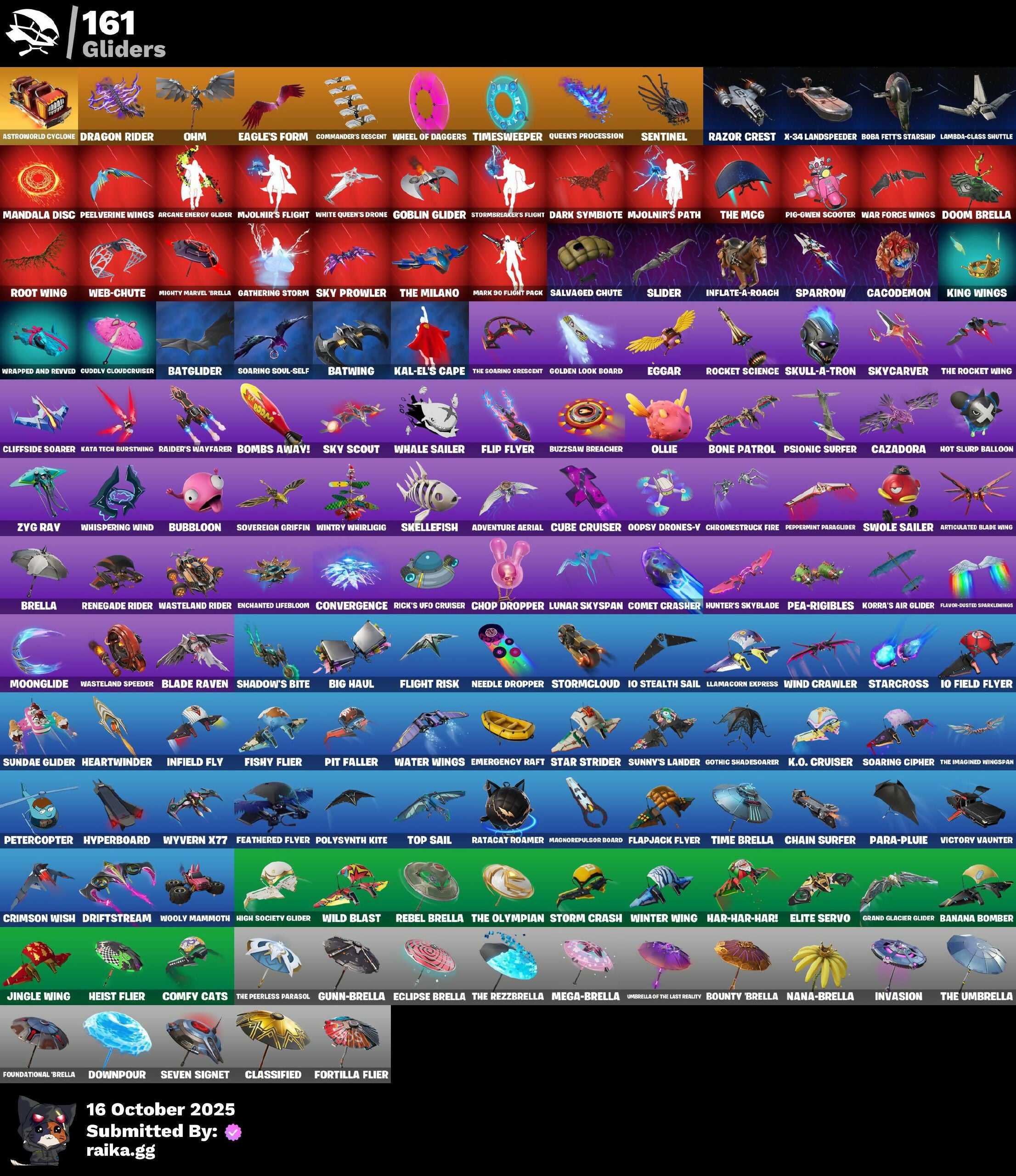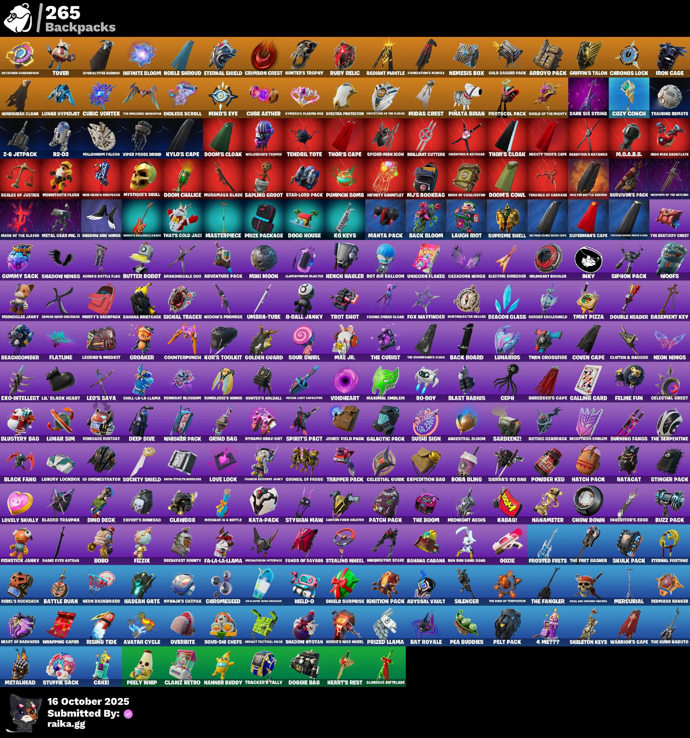 (Snikt!), 10 Orchestrator, 18's Kama, 2.0's Revenge, 201st Battalion Trooper, 2022, 4 Me???, 501st Trooper, 8-Ball Janky, A Warrior Prepares, Abduction, Abyssal Vault, Acolyte's Curse, Adira, Adira's Armor, Adira's Battle Flag, Adventure Aerial, Adventure Pack, Aerial, Aftermath, Afterparty, Agent Jones, Agent Jones (Jump 31), Agent Nana, Agent Peely, Ahsoka's Staff, Air Shredder, All-Nighter, All-Weather Extractor, Ancestral Bloom, Andy Fangerson, Antonia, Antonia in Action, Aphrodite, Apocalypse Shroud, Aquaman, Aquaman's Trident, Arc Flail, Arcade Cat, Arcane Energy Glider, Arcane Steel, Arctic Adeline, Ares, Arm The Pumpkin, Arroyo Pack, Arthur Curry, Articulated Blade Wing, Ascension Nezumi, Assassin's Mark, Astrea, Astro Armor, Astro Jack, Astroworld Cyclone, Aurelian, Avatar Cycle, Avatar's Flourish, Axe-Olotl, Axe-Tral Form, Axo, Back Bloom, Back Board, Backup Blades, Bad Joke, Balance Board, Balanced, Banana Bomber, Banana Briefcase, Banana Cabana, Bananaxe, Banner, Banner Icon, Baseball, Basement Key, Bat Royale, Bat Signal, Batglider, Batman Comic Book Cape, Batman Comic Book Outfit, Batman Pickaxe, Battle Mode, Battle Prep, Battle Ready Era, Battle Ryan, Battlebus, Batwing, Bawk Off, Beachcomber, Beacon Glass, Beamers, Bean Bag, Bear Hug, Beast Backdrop, Beast Blastin', Beast Claw, Beastfang, Beef Blade, Beep Beep, Berserker Barrage, Beskar, Big Bite, Big Guns, Big Haul, Big Mouth, Billy Bounce, Bitter Sweets, Black Eternal Knight, Black Fang, Black Hole, Black Manta, Black Ops Sword, Blade Aria, Blade Raven, Blade of the Hanging Moon, Bladed Travpak, Blast Radius, Blasted, Blizzard's Bite, Blowin' Up, Blue-Blood, Blustery Bag, Board Breaker, Boba Bling, Boba Fett, Boba Fett's Starship, Boba Snack, Bobo, Bombastic Winterfest, Bombs Away!, Bone Patrol, Boneyard Brand, Book of Cagliostro, Boomin', Boots 'N' Cats, Bot Air Balloon, Both Eyes Open, Bounty Brella, Bow Blades, Breakfast Bounty, Breakshore Trident, Breathless Blades, Breezabelle, Brella, Brilliant Cutters, Bronzed Scimitars, Bruteball, Brutus, Bubble Wands, Bubloon, Buckle Up, Bullpen Brawler Dusty, Bumblebee, Bumblebee's Wings, Bun Bun Bang Bang, Bun Bun Blast, Burning Ambition Valeria, Burning Fangs, Burning UFO, Burst Base Scenario, Butcher Cleaver, Butter Robot, Buttoned Up, Buzz Pack, Buzzsaw Breacher, Bytes, Bytes' Sigil, Cacodemon, Cake!, Cakey, Calico, Call Me, Called Shot, Calling Card, Carbon Fiber Holster, Cardistry, Carnage, Carnage Cleaver, Cash Grab, Cattitude, Cazadora, Cazadora Wings, Celebratory Slice, Celestial Crest, Celestial Guide, Ceph, Cerberus, Cerberus Bite, Chain Surfer, Chainsaur, Challenger Menace - Flame, Chaos Director, Chaos Origins, Charlotte, Charlotte's Logo, Chef's Special, Chew Toy, Chibi, Chicken Wing It, Chill-La-La-Llama, Chimichanga!, Chimpanskii Wants You, Choice Knit, Chomp Cud!!, Choose Naughty, Chop Chop, Chop Dropper, Choppy, Chow Down, Chrome Marked, Chrome Punk, Chromeseed, Chromestruck Fire, Chronos Lock, Chugga-Chugga, Clark Kent, Classic Age, Classic Wolverine, Classified, Clawbox, Clawz Retro, Clean Groove, Clean Sweep, Cliffside Soarer, Cloaked Shadow, Cloudburst, Club President Helsie, Cluck, Cluck (Slurpy), Clucking Mad, Clutch & Dagger, Codecarver, Coin Flip, Cold-Hot Hitters, Combat Elite, Comet Crasher, Comfy Cats, Comfy Chomps, Commander's Descent, Confetti, Conjure Weapon, Contour Camo, Convergence, Coral Crush, Corrosive Stripe, Corrosive Tag, Cosmic Legacy, Cosmic Sun, Council of Frogs, Count It!, Counterpunch, Courageous Mikasa, Coven Cape, Cowboy Chat, Cozy Conch, Crabby King, Crack It, Crashed Chiller, Crescent Shroom, Crimson Crest, Crimson Wish, Crowning Achievement, Crucible Blade, Crystal Axe of the Masters, Crystalline, Cube Aether, Cube Assassin, Cube Cruiser, Cube Edge, Cube Marking, Cubed, Cubic Scepter, Cubic Vortex, Cuddly Cloudcruiser, Cuddly Crusher, Curling Iron, Cursed Flagshield, Cyclo, Cyclo Curl, D.C. 63, Dagger Dance, Dahlia, Daisies, Dali, Dance Off, Dark Angular Shift, Dark Power Chord, Dark Side, Dark Six String, Dark Strikers, Dark Symbiote, Darth Shader, Darth Vader, Datafiber Chargepack, Daughter of Trigon, Dave's Pipe Organ, Daydream, Deadpool, Deadpool's Katanas, Decepticon Emblem, Deep Dab, Deep Dive, Deep Future, Demogorgon, Demon Wind Shuriken, Demons Beware, Demonslayer Blade, Denim Destiny, Deo, Designated Hitters, Destroyer Signature, Determined Korra, Determined Renegade, Diamond Doru, Diamond Throne, Diamondclaw Picker, Dice Roll, Digital Grayscale, Dimensional Camo, Dino Deck, Dive Knives, Division, Doctor Doom, Doctor Slone, Doctor Slone (Prismatic), Doctor Strange, Dogg House, Dogg Treat, Doggie Bag, Doggo, Dolphin, Doom Brella, Doom Chalice, Doom Slayer, Doom's Cloak, Doom's Cowl, Double Header, Downpour, Doze Dab, Dragon Rider, Dragon Rune Lance, Dragon Rune Lances, Dragon Seti Hybrid, Dragon Spirit, Drakon Claws, Drakonscale Duo, Dramatic Flares, Driftstream, Drones-Y View, Droopy, Dropout, Drummies, Dual Edge, Dual Machettas, Duelist's Foil, Dumbbell Driver, Dumbell Driver, Durrr Taisho, Dusty, Dynamite, Dynamo Grav-Suit, E.G.O., Eagle's Form, Eclipse Brella, Eddie's Spear, Eggar, Electric Shredder, Electrostaff, Elegance Blade, Elite Servo, Ember Pick, Emergency Raft, Emma Frost, Emma's Influence, Enchanted Lifebloom, Endless Scroll, Energon Mace, Energy Claw, Ensnared, Eon Blades, Epic Sword of Might, Epic Swords of Wonder, Era, Eren Jaeger, Eren's Faceoff, Erisa, Erisa Alert, Erisa's Crest, Escapees, Eternal Emblem, Eternal Fortune, Eternal Knight, Eternal Renegade, Eternal Shield, Evasive Maneuvers, Everything's Fine, Evie, Exile's Emblem, Exo-Intellect, Expedition Bag, Expert's Bonebag, Expressionism, Extraterrestrial, Eye of Agamotto, Fa-La-La-Llama, Fabio Sparklemane, Face Palm, Fade, Fade Out, Fading Ember Cloak, Fanged Foresight, Fangs of Hesk, Fangs of Savara, Fashion Accident Janky, Feathered Flyer, Feelin Jaunty, Feline Fun, Ferocious, Fiendish Wand, Final Harbinger, Finger Wag, Fish Hook, Fish Thicc, 