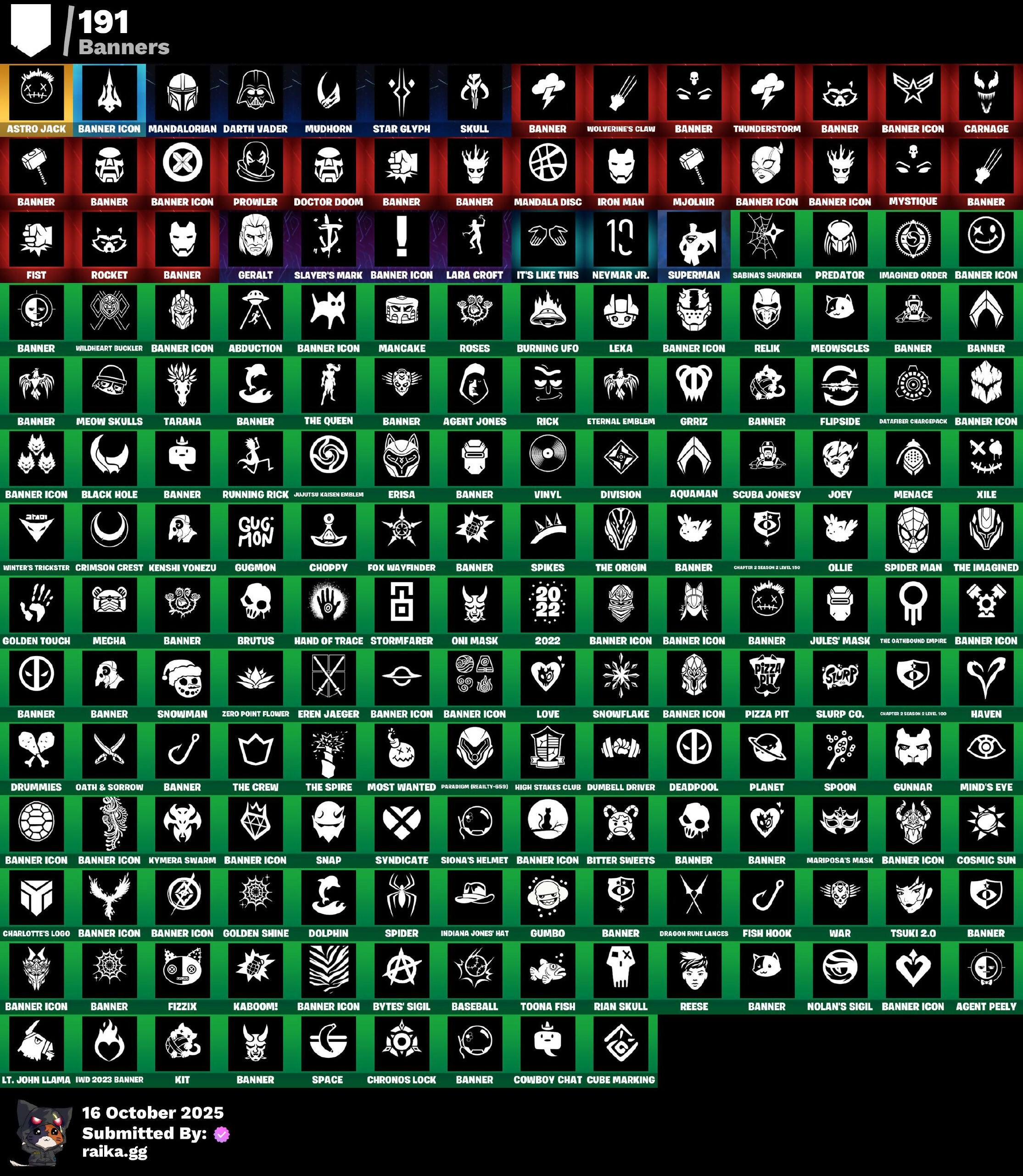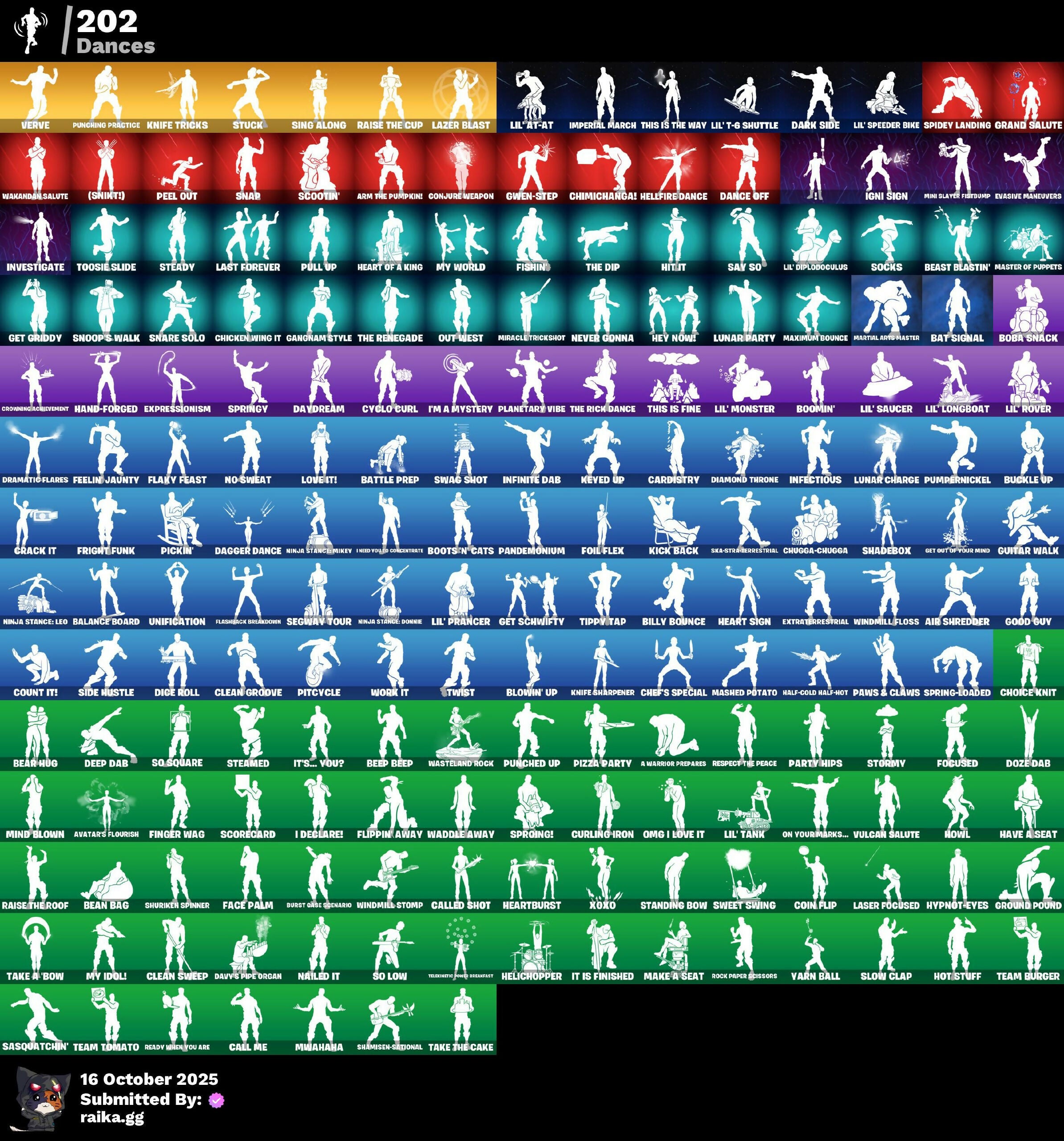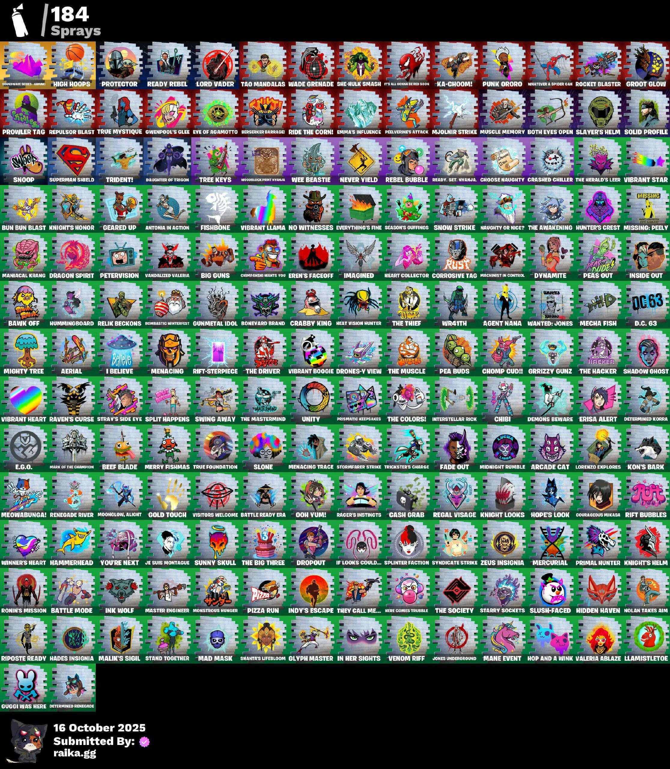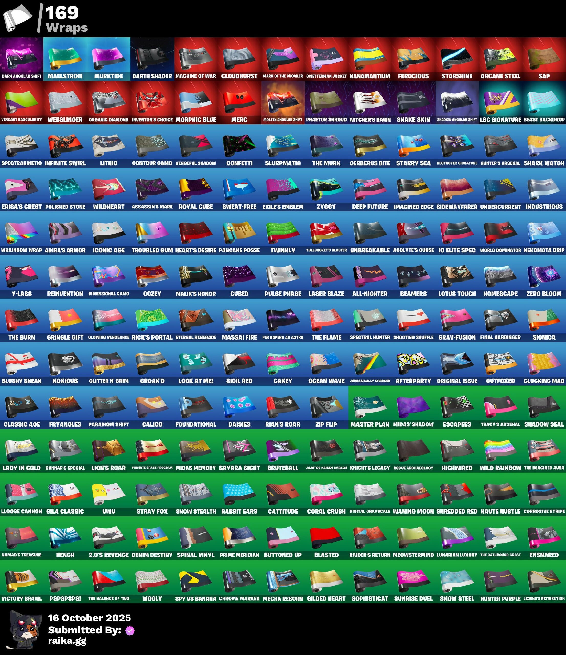 (Snikt!), 10 Orchestrator, 18's Kama, 2.0's Revenge, 201st Battalion Trooper, 2022, 4 Me???, 501st Trooper, 8-Ball Janky, A Warrior Prepares, Abduction, Abyssal Vault, Acolyte's Curse, Adira, Adira's Armor, Adira's Battle Flag, Adventure Aerial, Adventure Pack, Aerial, Aftermath, Afterparty, Agent Jones, Agent Jones (Jump 31), Agent Nana, Agent Peely, Ahsoka's Staff, Air Shredder, All-Nighter, All-Weather Extractor, Ancestral Bloom, Andy Fangerson, Antonia, Antonia in Action, Aphrodite, Apocalypse Shroud, Aquaman, Aquaman's Trident, Arc Flail, Arcade Cat, Arcane Energy Glider, Arcane Steel, Arctic Adeline, Ares, Arm The Pumpkin, Arroyo Pack, Arthur Curry, Articulated Blade Wing, Ascension Nezumi, Assassin's Mark, Astrea, Astro Armor, Astro Jack, Astroworld Cyclone, Aurelian, Avatar Cycle, Avatar's Flourish, Axe-Olotl, Axe-Tral Form, Axo, Back Bloom, Back Board, Backup Blades, Bad Joke, Balance Board, Balanced, Banana Bomber, Banana Briefcase, Banana Cabana, Bananaxe, Banner, Banner Icon, Baseball, Basement Key, Bat Royale, Bat Signal, Batglider, Batman Comic Book Cape, Batman Comic Book Outfit, Batman Pickaxe, Battle Mode, Battle Prep, Battle Ready Era, Battle Ryan, Battlebus, Batwing, Bawk Off, Beachcomber, Beacon Glass, Beamers, Bean Bag, Bear Hug, Beast Backdrop, Beast Blastin', Beast Claw, Beastfang, Beef Blade, Beep Beep, Berserker Barrage, Beskar, Big Bite, Big Guns, Big Haul, Big Mouth, Billy Bounce, Bitter Sweets, Black Eternal Knight, Black Fang, Black Hole, Black Manta, Black Ops Sword, Blade Aria, Blade Raven, Blade of the Hanging Moon, Bladed Travpak, Blast Radius, Blasted, Blizzard's Bite, Blowin' Up, Blue-Blood, Blustery Bag, Board Breaker, Boba Bling, Boba Fett, Boba Fett's Starship, Boba Snack, Bobo, Bombastic Winterfest, Bombs Away!, Bone Patrol, Boneyard Brand, Book of Cagliostro, Boomin', Boots 'N' Cats, Bot Air Balloon, Both Eyes Open, Bounty Brella, Bow Blades, Breakfast Bounty, Breakshore Trident, Breathless Blades, Breezabelle, Brella, Brilliant Cutters, Bronzed Scimitars, Bruteball, Brutus, Bubble Wands, Bubloon, Buckle Up, Bullpen Brawler Dusty, Bumblebee, Bumblebee's Wings, Bun Bun Bang Bang, Bun Bun Blast, Burning Ambition Valeria, Burning Fangs, Burning UFO, Burst Base Scenario, Butcher Cleaver, Butter Robot, Buttoned Up, Buzz Pack, Buzzsaw Breacher, Bytes, Bytes' Sigil, Cacodemon, Cake!, Cakey, Calico, Call Me, Called Shot, Calling Card, Carbon Fiber Holster, Cardistry, Carnage, Carnage Cleaver, Cash Grab, Cattitude, Cazadora, Cazadora Wings, Celebratory Slice, Celestial Crest, Celestial Guide, Ceph, Cerberus, Cerberus Bite, Chain Surfer, Chainsaur, Challenger Menace - Flame, Chaos Director, Chaos Origins, Charlotte, Charlotte's Logo, Chef's Special, Chew Toy, Chibi, Chicken Wing It, Chill-La-La-Llama, Chimichanga!, Chimpanskii Wants You, Choice Knit, Chomp Cud!!, Choose Naughty, Chop Chop, Chop Dropper, Choppy, Chow Down, Chrome Marked, Chrome Punk, Chromeseed, Chromestruck Fire, Chronos Lock, Chugga-Chugga, Clark Kent, Classic Age, Classic Wolverine, Classified, Clawbox, Clawz Retro, Clean Groove, Clean Sweep, Cliffside Soarer, Cloaked Shadow, Cloudburst, Club President Helsie, Cluck, Cluck (Slurpy), Clucking Mad, Clutch & Dagger, Codecarver, Coin Flip, Cold-Hot Hitters, Combat Elite, Comet Crasher, Comfy Cats, Comfy Chomps, Commander's Descent, Confetti, Conjure Weapon, Contour Camo, Convergence, Coral Crush, Corrosive Stripe, Corrosive Tag, Cosmic Legacy, Cosmic Sun, Council of Frogs, Count It!, Counterpunch, Courageous Mikasa, Coven Cape, Cowboy Chat, Cozy Conch, Crabby King, Crack It, Crashed Chiller, Crescent Shroom, Crimson Crest, Crimson Wish, Crowning Achievement, Crucible Blade, Crystal Axe of the Masters, Crystalline, Cube Aether, Cube Assassin, Cube Cruiser, Cube Edge, Cube Marking, Cubed, Cubic Scepter, Cubic Vortex, Cuddly Cloudcruiser, Cuddly Crusher, Curling Iron, Cursed Flagshield, Cyclo, Cyclo Curl, D.C. 63, Dagger Dance, Dahlia, Daisies, Dali, Dance Off, Dark Angular Shift, Dark Power Chord, Dark Side, Dark Six String, Dark Strikers, Dark Symbiote, Darth Shader, Darth Vader, Datafiber Chargepack, Daughter of Trigon, Dave's Pipe Organ, Daydream, Deadpool, Deadpool's Katanas, Decepticon Emblem, Deep Dab, Deep Dive, Deep Future, Demogorgon, Demon Wind Shuriken, Demons Beware, Demonslayer Blade, Denim Destiny, Deo, Designated Hitters, Destroyer Signature, Determined Korra, Determined Renegade, Diamond Doru, Diamond Throne, Diamondclaw Picker, Dice Roll, Digital Grayscale, Dimensional Camo, Dino Deck, Dive Knives, Division, Doctor Doom, Doctor Slone, Doctor Slone (Prismatic), Doctor Strange, Dogg House, Dogg Treat, Doggie Bag, Doggo, Dolphin, Doom Brella, Doom Chalice, Doom Slayer, Doom's Cloak, Doom's Cowl, Double Header, Downpour, Doze Dab, Dragon Rider, Dragon Rune Lance, Dragon Rune Lances, Dragon Seti Hybrid, Dragon Spirit, Drakon Claws, Drakonscale Duo, Dramatic Flares, Driftstream, Drones-Y View, Droopy, Dropout, Drummies, Dual Edge, Dual Machettas, Duelist's Foil, Dumbbell Driver, Dumbell Driver, Durrr Taisho, Dusty, Dynamite, Dynamo Grav-Suit, E.G.O., Eagle's Form, Eclipse Brella, Eddie's Spear, Eggar, Electric Shredder, Electrostaff, Elegance Blade, Elite Servo, Ember Pick, Emergency Raft, Emma Frost, Emma's Influence, Enchanted Lifebloom, Endless Scroll, Energon Mace, Energy Claw, Ensnared, Eon Blades, Epic Sword of Might, Epic Swords of Wonder, Era, Eren Jaeger, Eren's Faceoff, Erisa, Erisa Alert, Erisa's Crest, Escapees, Eternal Emblem, Eternal Fortune, Eternal Knight, Eternal Renegade, Eternal Shield, Evasive Maneuvers, Everything's Fine, Evie, Exile's Emblem, Exo-Intellect, Expedition Bag, Expert's Bonebag, Expressionism, Extraterrestrial, Eye of Agamotto, Fa-La-La-Llama, Fabio Sparklemane, Face Palm, Fade, Fade Out, Fading Ember Cloak, Fanged Foresight, Fangs of Hesk, Fangs of Savara, Fashion Accident Janky, Feathered Flyer, Feelin Jaunty, Feline Fun, Ferocious, Fiendish Wand, Final Harbinger, Finger Wag, Fish Hook, Fish Thicc, 