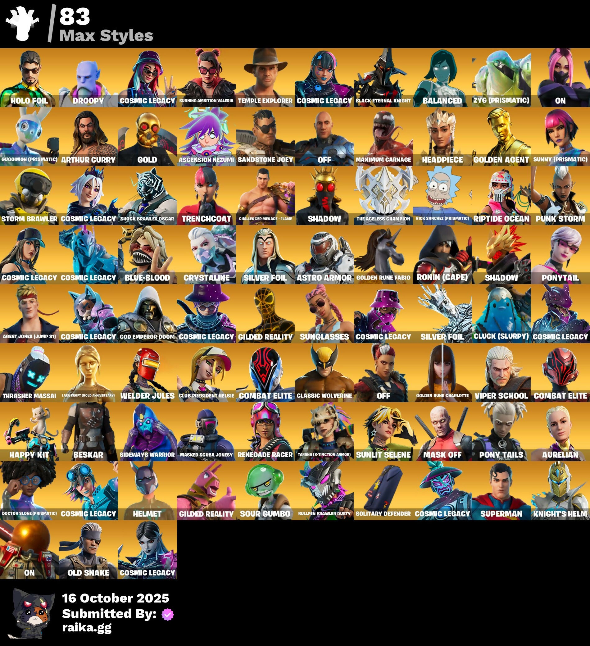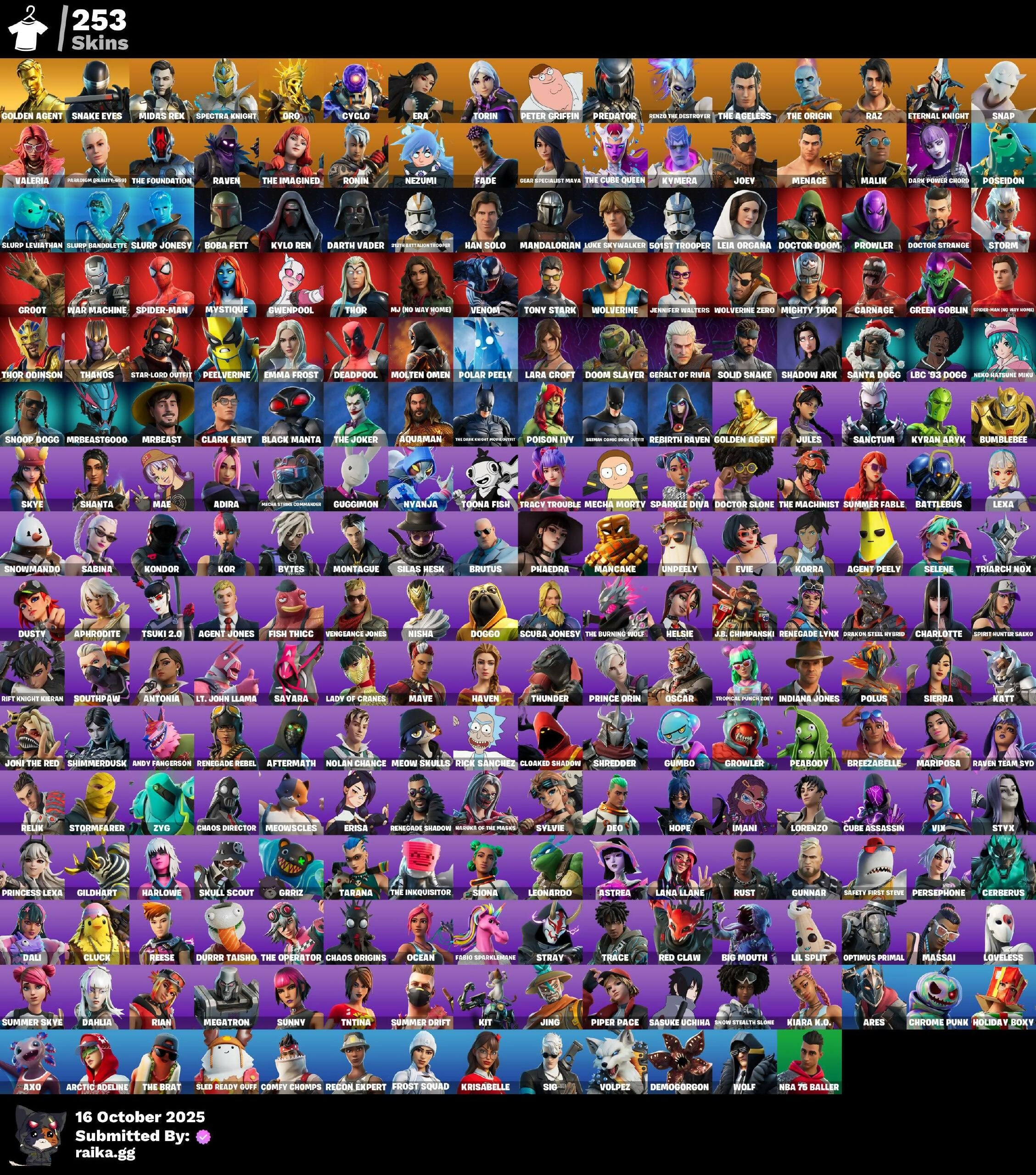 [PC/PSN/XBOX] 253 skins | GOLDEN AGENT | Snake Eyes | Midas Rex | Spectra Knight | Oro | Cyclo | Era | Torin | Peter Griffin | Predator | Renzo the Destroyer | 100 VB / FN
