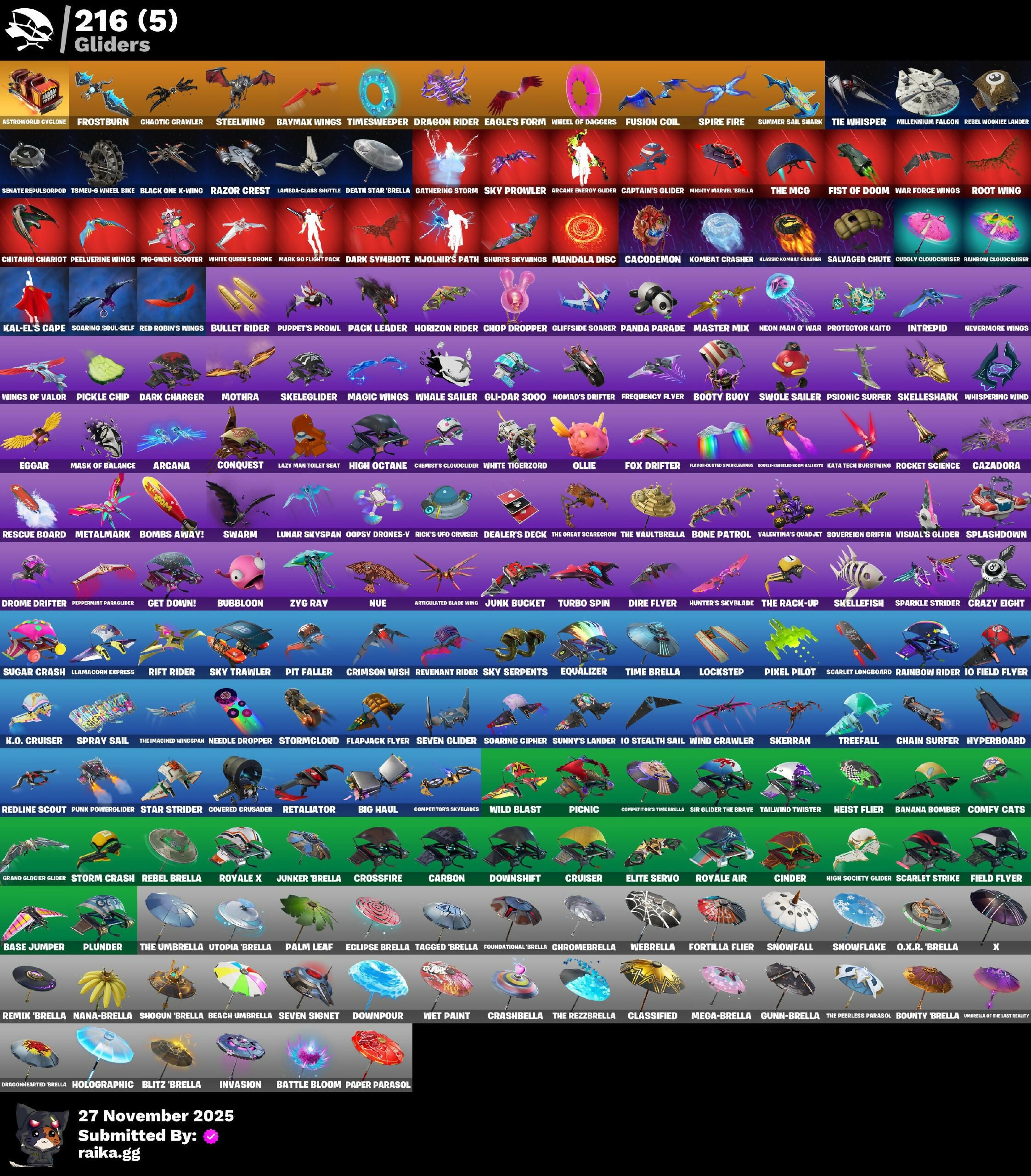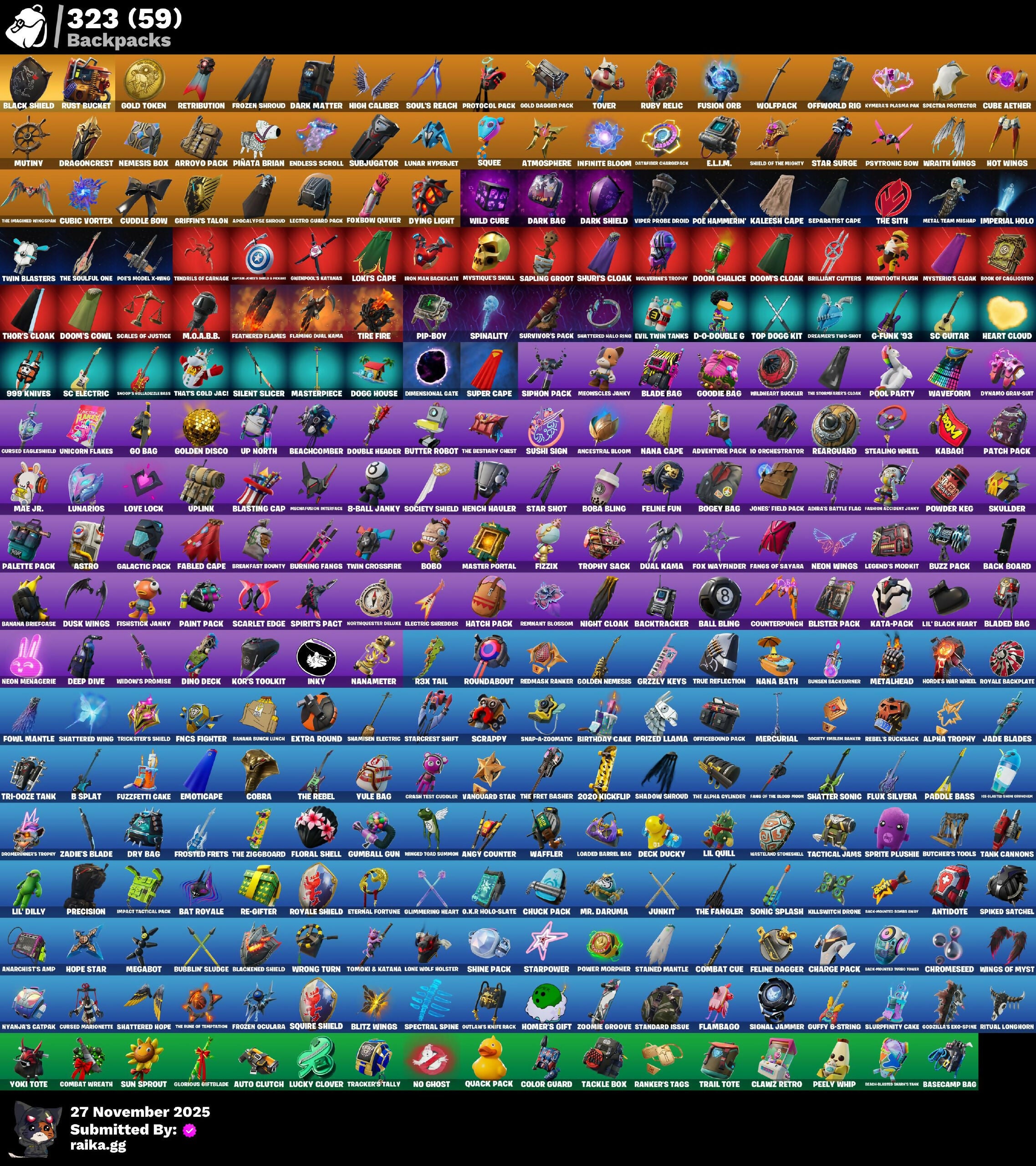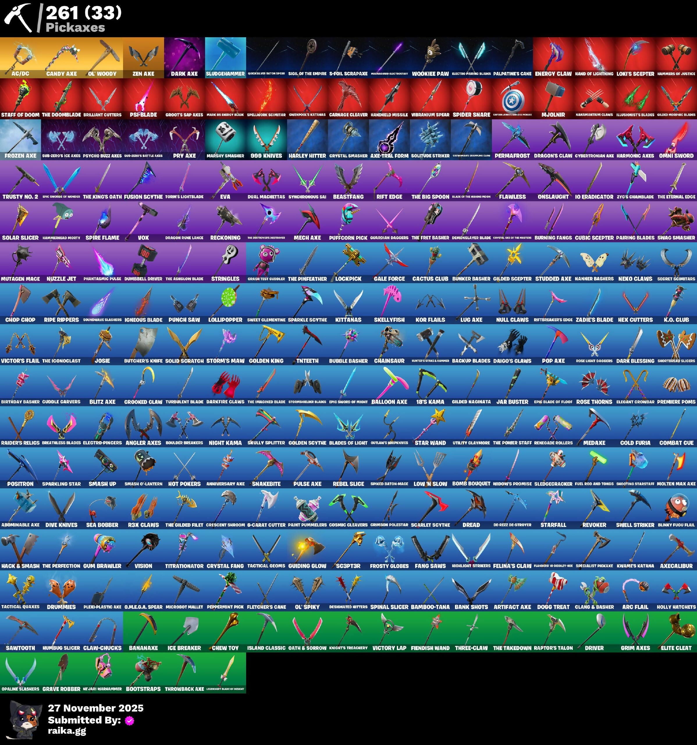 (Snikit!), 18's Kama, 2020 Kickflip, 6-Carat Cutter, 8-Ball Janky, 8-Ball Vs Scratch, 999 Knives, A Warrior Prepares, A.I.M., Abominable Axe, Ac/Dc, Adira, Adira's Battle Flag, Adventure Pack, Agent Jones, Agent Peely, Alli, Alpha Trophy, Anarchist's Amp, Ancestral Bloom, Andy Fangerson, Angler Axes, Angry Counter, Anniversary Axe, Antidote, Apocalypse Shroud, Apprentice Evie, Arc Flail, Arcana, Arcane Energy Glider, Arroyo Pack, Articulated Blade Wing, Artifact Axe, Ascend!, Astro, Astroworld Cyclone, Atmosphere, Aura, Aura Analyzer, Auto Clutch, Axe-Trail Form, Axecalibur, Ayla Winn, Azarath Metrion Zinthos, B-Splat, Back Board, Back-Agronauts Bomb Suit, Back-Agronauts Void Tower, Backlash, Backtracker, Backup Blades, Ball Bling, Balloon Axe, Bamboo-Tana, Banana Bomber, Banana Briefcase, Banana Bunch Lunch, Bananaxe, Bank Shots, Baron's Hoard, Base Jumper, Basecamp Bag, Bat Royale, Battle Blessing, Battle Bloom, Battlehawk, Baymax Wings, Beach Umbrella, Beach-Gliders Shark's Towel, Beachcomber, Bean Bag, Bear Hug, Beastfang, Beep Beep, Best Mates, Big Dill, Big Fan, Big Haul, Bike To Go, Bim Bam Boom, Bird Call, Birdie, Birthday Basher, Birthday Cake, Bizzochitto, Black Knight, Black One X-Wing, Black Shield, Blackened Shield, Blackheart, Blade Bag, Blade Of The Waning Moon, Bladed Bag, Blades Of Light, Blasting Cap, Blinky Fugu Flail, Blister Pack, Blitz 'Brella, Blitz Axe, Blitz Wings, Blowin' Up, Blowing Bubbles, Blue Squire, Boba Bling, Bobo, Bogey Bag, Boing!, Bold Stance, Bomb Bouquet, Bombs Away!, Bone Breaker, Bone Patrol, Boogie Down, Book of Cagliostro, Boomin', Bootsin' Cats, Bootstraps, Booty Buoy, Boulder Breakers, Bounty 'Brella, Bow Go, Branded Brigadier, Breakdown, Breakfast Bounty, Breaking Point, Breakneck, Breakpoint, Breathless Blades, Brilliant Cutters, Brilliant Striker, Bring It Around, Brite Bomber, Bubble Basher, Bubblin' Sludge, Bubbloon, Bullet Rider, Bullseye, Bunker Basher, Bunker Jonesy, Bunsen Backburner, Burn Bright, Burning Fangs, Butcher's Knife, Butcher's Tools, Butter Robot, Buzz Pack, Cacodemon, Cactus Club, Calamity, Calculated, California Love, Call Me, Cameo Vs Chic, Candy Axe, Captain America's Shield & Pickaxe, Captain Flamerica, Captain James Vega's Halo & Pistol, Captain Jones, Captain Phasma, Captain's Glider, Carbide, Carbon, Cardistry, Carmine Rosso, Carnage, Carnage Cleaver, Cassidy Quinn, Catalyst, Cauldron Chill, Cazadora, Chain Surfer, Chainsaur, Champion Bugha, Chaos Director, Chaos Origins, Chaotic Crawler, Charge Pack, Charlotte, Chemist's Cloudglider, Chew Toy, Chitauri Chariot, Chop Chop, Chop Dropper, Chrome Punk, Chromebrella, Chromesede, Chuck Pack, Cinder, Clang & Basher, Classic Kombat Crasher, Classified, Claw-Chucks, Clawz Retro, Clean Sweep, Cliffside Soarer, Cluck, Cluck Strut, Cobra, Coin Flip, Cold Furia, Color Crush, Color Guard, Combat Cue, Combat Wreath, Combatant's Grappling Claw, Comfy Cats, Competitor's Skyblades, Competitor's Timebrella, Conga, Conjure Weapon, Conquest, Cosmic Cleavers, Count It!, Counterpunch, Covered Crusader, Crabby, Crash Test Cuddler, Crashbella, Crazy Eight, Crescent Shroom, Crimson Polestar, Crimson Wish, Crooked Claw, Crossfire, Cruiser, Cryptic, Crystal, Crystal Axe Of The Mystics, Crystal Fang, Crystal Smasher, Cube Aether, Cubic Scepter, Cubic Vortex, Cuddle Bow, Cuddle Carvers, Cuddle Team Leader, Cuddly Cloudcruiser, Curling Iron, Cursed Eagleshield, Cursed Marionette, Cybertronian Axe, Cyclo'curl, D'ark, D-Double G, DJ Yonder, Dabstand, Dagger Dance, Daigo, Daigo's Claws, Dark Axe, Dark Bag, Dark Blessing, Dark Bomber, Dark Charger, Dark Jonesy, Dark Matter, Dark Red Knight, Dark Shield, Dark Symbiote, Dark Voyager, Dark Wild Card, Darkfire Claws, Darth Vader, Databird Charmpack, De-Rezz De-Stroyer, Dealer's Deck, Death Star 'Brella, Deck Ducky, Deep Dive, Demi, Demonslayer Blade, Designated Hitters, Diamond Diva, Dill With It, Dimensional Gate, Dino Deck, Dire, Dire Flyer, Dive Knives, Dizzie, Doctor Doom, Doctor Slone, Doctor Strange, Dogg House, Doog Treat, Doom, Doom Chalice, Doom's Cloak, Doom's Cowl, Double Header, Double-Barreled Boom Billies, Doublecross, Downpour, Downshift, Doze Dab, Dragon Rider, Dragon Rune Lance, Dragon Stance, Dragon's Claw, Dragoncrest, Dragonhearted 'Brella, Dread, Dream, Dreamer's Two-Shot, Drift, Driver, Drome Drifter, Dronewinder's Trophy, Droop, Drummies, Dry Bag, Dual Kama, Dual Machettas, Duelist's Card Trick, Dumbbell Driver, Dummy, Dusk, Dusk Knight, Dusk Wings, Dying Light, Dynamo, Dynamo Grav-Suit, Dynamo TNTina, E.L.I.M., Eagle's Form, Echo, Eclipse Brella, Eggar, Electric Shredder, Electro Pairing Blades, Electro-Pincers, Elegant Crowbar, Elite Agent, Elite Cleat, Elite Servo, Ember, Emma Frost, Emoticape, Emperor Palpatine, Empty Out Your Pockets, Endless Scroll, Energy Claw, Enforcer, Epic Blade Of Flood, Epic Sword Of Night, Epic Swords Of Wonder, Equalizer, Erisa, Eternal Fortune, Eternal Voyager, Eva, Evasive Maneuvers, Evie, Evil Twin Tanks, Extra Round, FNCS Fighter, Fabio Sparklemane, Fable, Fabled Cape, Fang Saws, Fang of the Blood Moon, Fangs of Sayara, Fashion Accident Janky, Feathered Flames, Featherweight, Feel The Force, Felina, Felina's Claw, Feline Dagger, Feline Fun, Field Flyer, Fiendish Wand, Fierce, Finger Guns, Fireworks Salvo, Fireworks Team Leader, Fishstick Janky, Fist Bump, Fist Of Doom, Fizzix, Flambago, Flamenco, Flaming Dual Kama, Flanners W/Bloody Mac, Flapjack Flyer, Flavor-Dusted Sparklings, Flawless, Fletcher Kane, Fletcher's Cane, Flippin' Away, Flippin' Sexy, Floral Shell, Floss, Flux Silvera, Focus, Foil Flex, Force Lightning, Fortilla Flier, Foundational Brella, Fowl Mantle, Fox Drifter, Fox Wayfinder, Foxbow Quiver, Frequency Flyer, Frostburn, Frosted Frets, Frosty Globes, Frozen Axe, Frozen Oculara, Frozen Shroud, Frozen Treat Cart, Fuel Rod And Tongs, Funk Ops, Fusion, Fusion Coil, Fusion Orb, Fusion Scythe, Fuzzfetti Cake, G-Funk '93, Galactic Pack, Gale Force, Gathering Storm, Gear Specialist Maya,