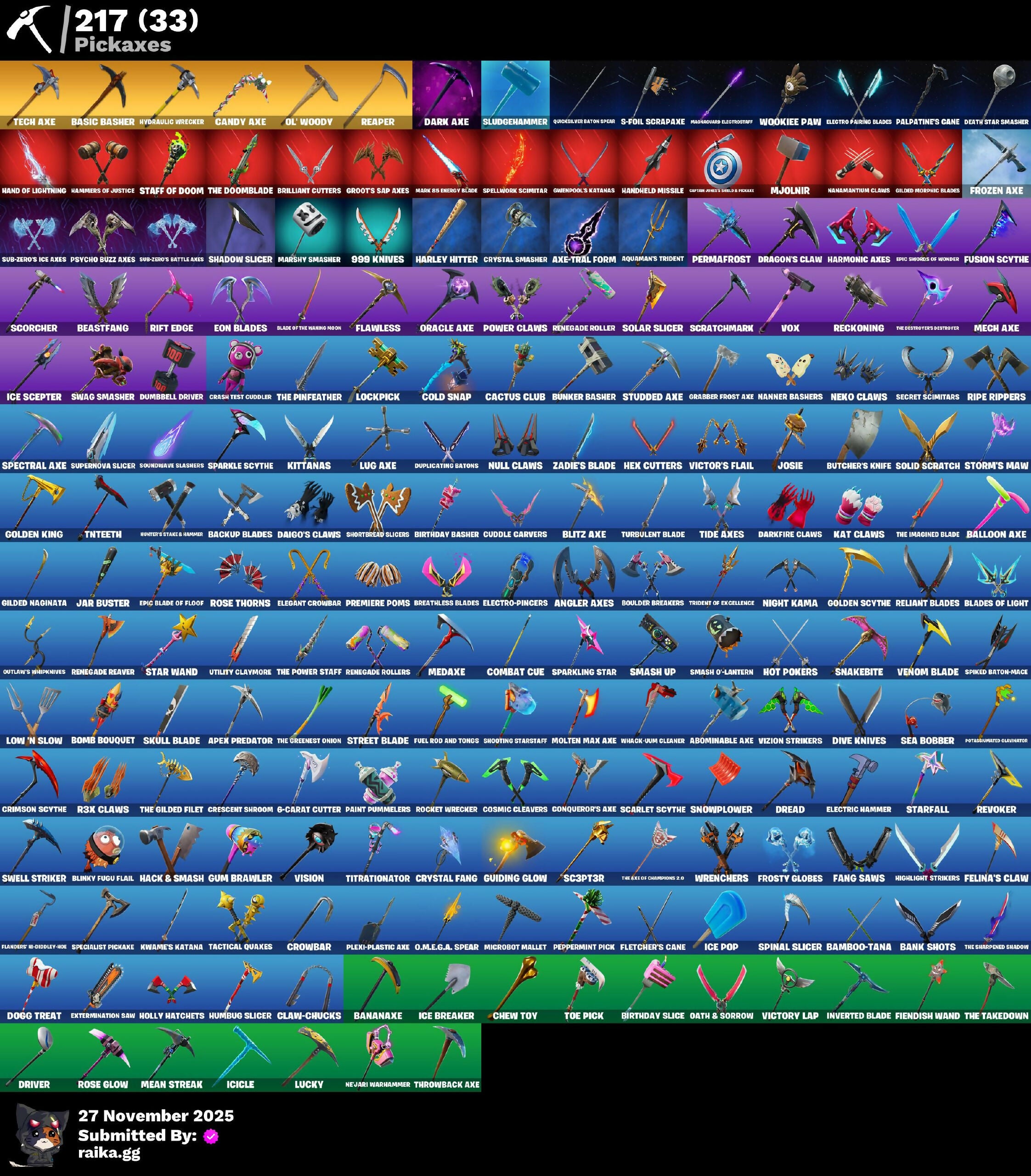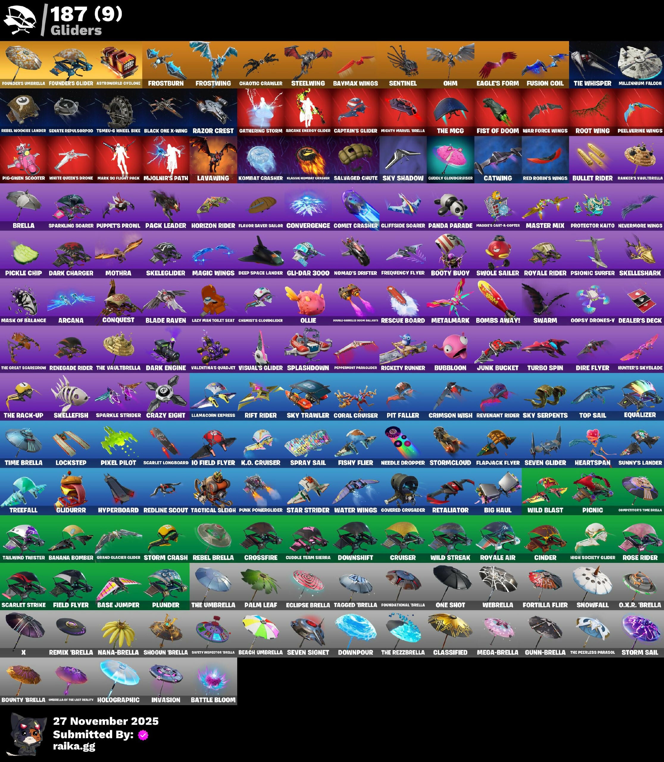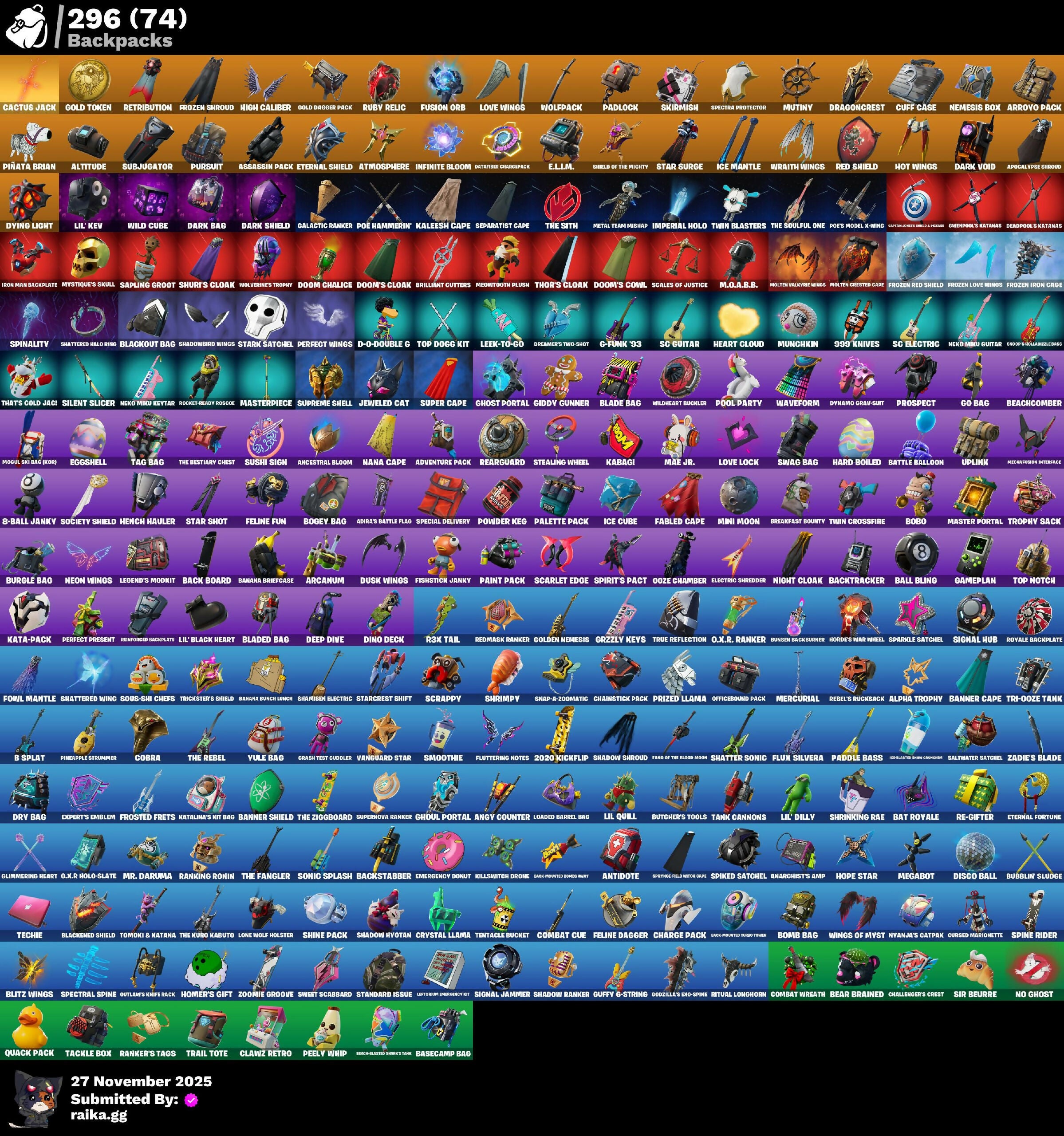 (SNIKT!), 1-Ball, 2020 Kickflip, 6-Carat Cutter, 8-Ball Vs Scratch, 8-ball Janky, 999 Knives, A Warrior Prepares, A.I.M., Abominable Axe, Abstrakt, Adira’s Battle Flag, Adventure Pack, Aerial Assault Banshee, Agent Peely, Air Horn, Air Shredder, All Red, Alpha Trophy, Altitude, Anarchist’s Amp, Ancestral Bloom, Angler Axes, Angy Counter, Antidote, Apex Predator, Apprentice Evie, Aquaman, Aquaman's Trident, Arcana, Arcane Energy Glider, Arcanum, Arctic Assassin, Around The Clock, Arroyo Pack, Ascend!, Assassin Pack, Assault Trooper, Astroworld Cyclone, Atmosphere, Aura, Axe-Tral Form, B Splat, B.R.U.T.E. Gunner, Back Board, Back-mounted Ooming Pak, Back-mounted Turbo Thumper, Backlash, Backstabber, Backtracker, Backup Blades, Ball Bling, Balloon Axe, Bamboo-Tana, Banana Bomber, Banana Briefcase, Banana Bunch Lunch, Bananaxe, Bank Shots, Banner Cape, Banner Shield, Baron's Hoard, Base Jumper, Basecamp Bag, Basic Basher, Bat Royale, Battle Balloon, Battle Blessing, Battle Bloom, Baymax Wings, Beach Umbrella, Beachcomber, Bear Brained, Bear Hug, Beastfang, Beep Beep, Berzerk Banana Beam, Big Dill, Big Haul, Bike To Go, Billy Bounce, Bird Call, Birthday Basher, Birthday Slice, Black One X-Wing, Blackened Shield, Blackheart, Blackout Bag, Blade Bag, Blade Raven, Blade of the Waning Moon, Bladed Bag, Blades of Light, Blinky Fishtick, Blinky Fugu Flail, Blitz Axe, Blitz Wings, Blowing Bubbles, Bobo, Bogey Bag, Boing!, Bomb Bag, Bomb Bouquet, Bombs Away!, Bone Breaker, Bones, Boogie Down, Boomin', Booty Buoy, Boulder Breakers, Bounty 'Brella, Bow Go, Branded Brigadier, Breakdown, Breakfast Bounty, Breakneck, Breakpoint, Breathless Blades, Breezy, Brella, Brilliant Cutters, Bring It Around, Brite Bomber, Brutus, Bubblin' Sludge, Bubbloon, Bullet Rider, Bullseye, Bunker Basher, Bunker Jonesy, Bunny Brawler, Bunsen Backburner, Burgle Bag, Butcher's Knife, Butcher's Tools, Cactus Club, Cactus Jack, Calamity, Calculated, Call Me, Cameo Vs Chic, Candy Axe, Captain Jones, Captain Llamerica, Captain Phasma, Captain's Glider, Carmine Rosso, Cassidy Quinn, Cat Flip, Catalyst, Catwing, Cauldron Chill, Celebrate Me, Centurion Comic Book Outfit, Chainstick Pack, Challenger's Crest, Chaos Agent, Chaos Director, Chaotic Crawler, Charge Pack, Chemist's Cloudglider, Chew Toy, Chill Count, Choice Knit, Chord Kahele, Cinder, Classified, Claw-Chucks, Clawz Retro, Clean Sweep, Cliffside Soarer, Cluck Strut, Cobalt, Cobra, Coin Flip, Cold Snap, Combat Cue, Combat Wreath, Comet Crasher, Commando, Conga, Conqueror's Axe, Conqueror's Claim, Conquest, Convergence, Coral Cruiser, Cosmic Cleavers, Covered Crusader, Crash Test Cuddler, Crazy Eight, Crescent Shroom, Crimson Scythe, Crimson Wish, Crossfire, Crowbar, Cruiser, Cryptic, Crystal, Crystal Fang, Crystal Llama, Crystal Smasher, CuCoo Team Specialist, Cuddle Carvers, Cuddle Team Sierra, Cuddly Cloudcruiser, Cuff Case, Cursed Marionette, Cyclo Curl, D-O-Double G, DJ Yonder, Dabstand, Dagger Dance, Daigo, Daigo's Claws, Dark Axe, Dark Bag, Dark Bomber, Dark Charger, Dark Engine, Dark Jonesy, Dark Red Knight, Dark Shield, Dark Vanguard, Dark Void, Dark Wild Card, Darkfire Claws, Deadpool, Deadpool's Katanas, Dealer's Deck, Death Star Smasher, Deep Dive, Deep End, Deep Space Lander, Demi, Desert Dominator, Diamond Diva, Dill With It, Dino Deck, Dire, Dire Flyer, Disco Ball, Disco Diva, Disco Fever, Diva Fever, Dive Knives, Doctor Doom, Dogg Treat, Don't Start Now, Doom, Doom Chalice, Doom's Cloak, Doom's Cowl, Double-Barrelled Boom Ballasts, Downpour, Downshift, Doze Dab, Dragon Stance, Dragon's Claw, Dragoncrest, Dread, Dream, Dreamer's Two-Shot, Drift, Driver, Droop, Dry Bag, Duelist's Card Trick, Dumbbell Driver, Dupli-Kate, Duplicating Batons, Duplikates, Durrr Taisho, Dusk, Dusk Knight, Dusk Wings, Dying Light, Dynamo, Dynamo Gray-suit, Dynamo Tntina, E.L.I.M., Eagle's Form, Echo, Eclipse Brella, Eggshell, Electric Hammer, Electric Shredder, Electro Pairing Blades, Electro Shuffle, Electro Swing, Electro-Pincers, Elegant Crowbar, Ember, Emergency Donut, Emma Frost, Emperor Palpatine, Enforcer, Eon Blades, Epic Blade of Floof, Epic Swords of Wonder, Equalizer, Eternal Fortune, Eternal Knight, Eternal Shield, Eternal Voyager, Expert's Emblem, Extermination Saw, Fable, Fabled Cape, Fade, Fancy Footwork, Fang Saws, Fang of the Blood Moon, Featherweight, Feel The Force, Feelin' Jaunty, Felina, Felina's Claw, Feline Dagger, Feline Fun, Field Flyer, Fiendish Wand, Fierce, Fishstick Janky, Fishy Flier, Fist Bump, Fist Of Doom, Fist Pump, Flamenco, Flanders McCuddly-Axe, Flapjack Flyer, Flavor Saver Sailor, Flawless, Fletcher Kane, Fletcher's Cane, Flippin' Away, Fluttering Notes, Flux Silvera, Focused, Foil Flex, Force Lightning, Fortilla Flier, Foundational 'Brella, Founder's Glider, Founder's Umbrella, Fowl Mantle, Free Flow, Frequency Flyer, Frontpage Pose, Frostburn, Frosted Frets, Frostwing, Frosty Globes, Frozen Axe, Frozen Iron Cage, Frozen Love Ranger, Frozen Love Wings, Frozen Raven, Frozen Red Knight, Frozen Red Shield, Frozen Shroud, Frozen Treat Cart, Fuel Rod and Tongs, Fusion, Fusion Coil, Fusion Orb, Fusion Scythe, G-Funk '93, Galactic Ranker, Gameplan, Gathering Storm, Gear Specialist Maya, General Grievous, Gentleman's Dab, Get Funky, Get Griddy, Ghost Portal, Ghoul Portal, Ghoul Trooper, Giddy Gunner, Giddy-Up, Gilded Morphic Blades, Gilded Naginata, Ginger Gunner, Gli-Dar 3000, Glidurrr, Glimmering Heart, Glow, Go Bag, Godzilla Evolved, Godzilla’s Exo-Spine, Gold Dagger Pack, Gold Token, Golden King, Golden Nemesis, Golden Scythe, Golf Clap, Good Sportsmanship, Grabber Frost Axe, Grand Glacier Glider, Greenpool's Katanas, Grill Sergeant, Grizzly Keys, Groot, Groot's Sap Axes, Guffy G-String, Guiding Glow, Gum Brawler, Gunn-Brella, Gwen-Step, Gwenpool, Gwenpool's Katanas, Hack & Smash, Hammers of Justice, Hand Signals, Hand of Lightning, Handheld Missile, Hang Loose, Harbinger Of The Horde, Hard Boiled, Harley Hitter, Harmonic Axes, Head Banger, Heart