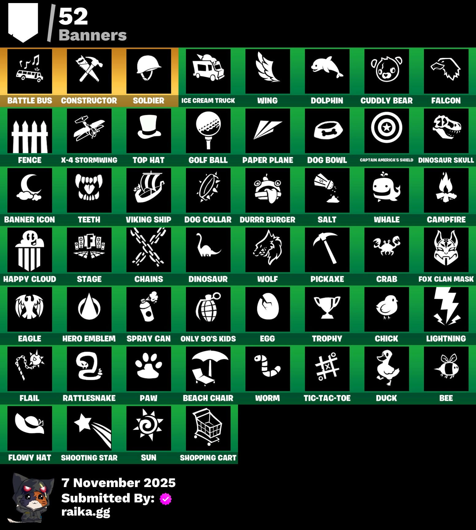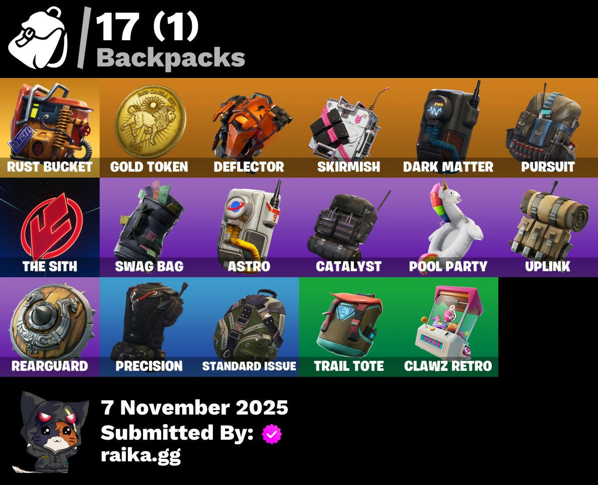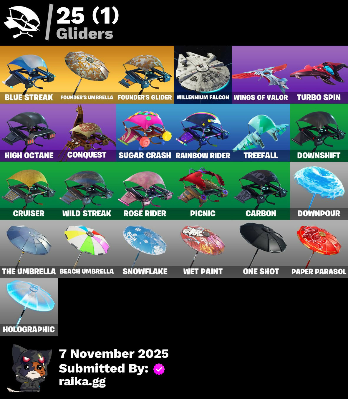 Arrow, Astro, Balloon Axe, Banner Icon, Battle Bus, Battlehawk, Beach Chair, Beach Umbrella, Bee, Best Mates, Blue Streak, Blue Team Leader, Boogeyman, Boogie, Calamity, Calculated, Call Me, Campfire, Captain America's Shield, Carbide, Carbon, Catalyst, Chains, Chalk Outline, Chick, Circle, Clawz Retro, Comet, Conquest, Constructor, Crab, Crazy Castle, Cruiser, Cuddly Bear, DJ Yonder, Dark Matter, Dark Voyager, Deflector, Dinosaur, Dinosaur Skull, Dog Bowl, Dog Collar, Dolphin, Downpour, Downshift, Drift, Duck, Durrr, Durrr Burger, E.G.O., Eagle, Egg, Elite Agent, Eva, Fake Door, Falcon, Fence, Flail, Flowy Hat, Founder's Glider, Founder's Umbrella, Fox Clan Mask, Fryangles, Fuel Rod and Tongs, Gale Force, Gentleman's Dab, Gg Smiley, Gg Snakes, Gg Snowman, Gold Token, Golf Ball, Golf Clap, Good Vibes, Happy Cloud, Hearts, Hero Emblem, High Octane, Holographic, Huntress, Ice Cream Truck, Keep It Mello, Lightning, Lobby Classic, Lollipopper, Looted, Lucha Gg, Lug Axe, Make It Rain, Marshmello, Marshy Smasher, Max Styles, Mean Streak, Mello Made It Right, Millennium Falcon, Mission Specialist, Moonwalker, New Year 2020, Ol' Woody, One Shot, Only 90's Kids, Orange Justice, Paper Parasol, Paper Plane, Paw, Pickaxe, Picnic, Pixel Jonesy, Pixels Royale, Pony Up, Pool Party, Popcorn, Positron, Precision, Pursuit, Radiant Striker, Rainbow, Rainbow Rider, Rattlesnake, Rearguard, Reckoning, Redline, Regal Wave, Respect The Peace, Ride The Pony, Rift Edge, Ripe, Ripe Rippers, Rock Love, Rogue Agent, Rose Glow, Rose Rider, Rose Team Leader, Rox, Royal Stroll, Rust Bucket, Rust Lord, Salt, Salute, Sawtooth, Sentinel, Shooting Star, Shooting Starstaff, Shopping Cart, Shortbread Slicers, Skirmish, Snowflake, Snowshaker, Soldier, Spiderweb, Spray Can, Stage, Standard Issue, Strawberry Paws, Sugar Crash, Suited Up, Sun, Sun Strider, Sushi, Swag Bag, Take The L, Teeth, Teknique, The Ace, The Reaper, The Robot, The Sith, The Umbrella, This Way, Tic-Tac-Toe, Top Hat, Trail Tote, Treefall, Trophy, Trusty No. 2, Turbo Spin, Uplink, Vertex, Viking Ship, Warpaint, Wave, Wet Paint, Whale, Wild Streak, Wing, Wings Of Valor, Wolf, Worm, X Mark, X-4 Stormwing, Yay!, You're Awesome, Zoey