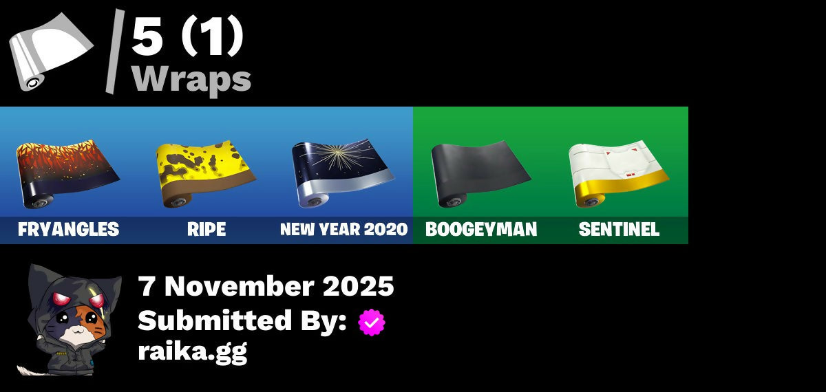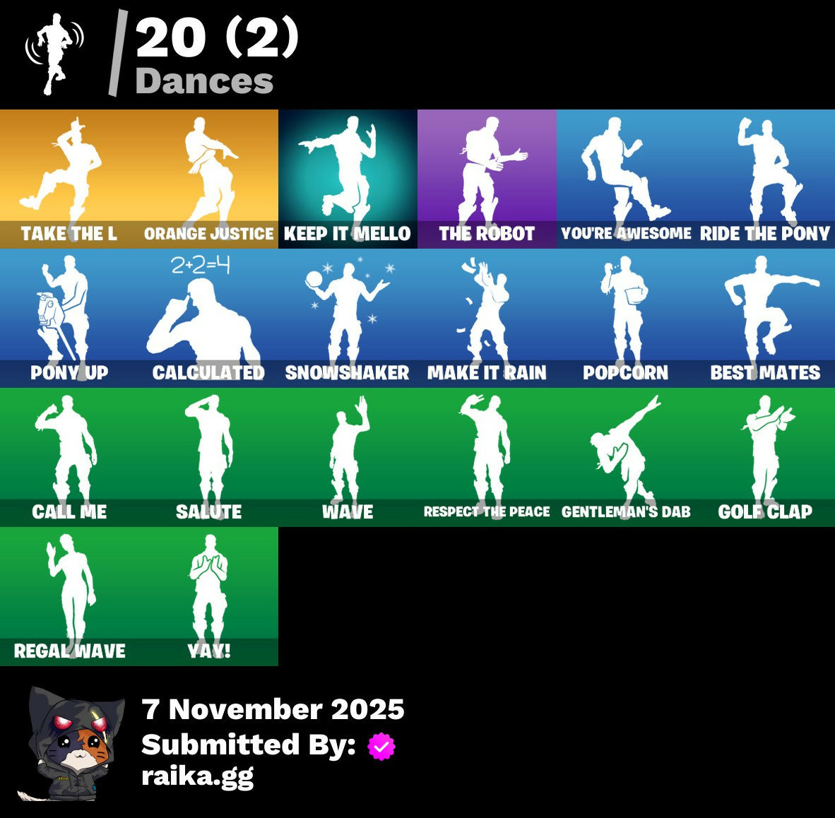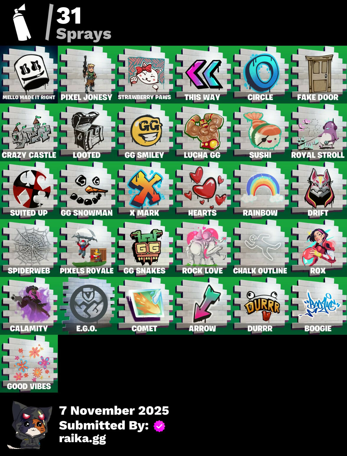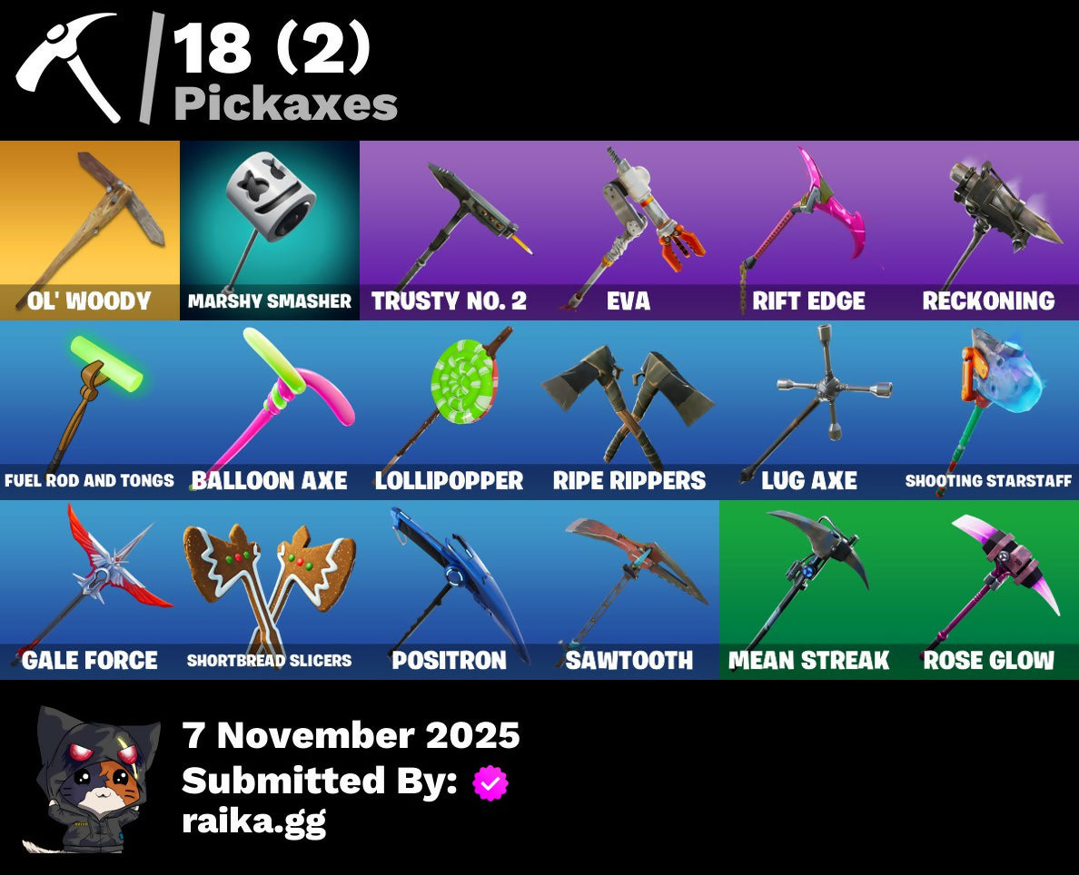 Arrow, Astro, Balloon Axe, Banner Icon, Battle Bus, Battlehawk, Beach Chair, Beach Umbrella, Bee, Best Mates, Blue Streak, Blue Team Leader, Boogeyman, Boogie, Calamity, Calculated, Call Me, Campfire, Captain America's Shield, Carbide, Carbon, Catalyst, Chains, Chalk Outline, Chick, Circle, Clawz Retro, Comet, Conquest, Constructor, Crab, Crazy Castle, Cruiser, Cuddly Bear, DJ Yonder, Dark Matter, Dark Voyager, Deflector, Dinosaur, Dinosaur Skull, Dog Bowl, Dog Collar, Dolphin, Downpour, Downshift, Drift, Duck, Durrr, Durrr Burger, E.G.O., Eagle, Egg, Elite Agent, Eva, Fake Door, Falcon, Fence, Flail, Flowy Hat, Founder's Glider, Founder's Umbrella, Fox Clan Mask, Fryangles, Fuel Rod and Tongs, Gale Force, Gentleman's Dab, Gg Smiley, Gg Snakes, Gg Snowman, Gold Token, Golf Ball, Golf Clap, Good Vibes, Happy Cloud, Hearts, Hero Emblem, High Octane, Holographic, Huntress, Ice Cream Truck, Keep It Mello, Lightning, Lobby Classic, Lollipopper, Looted, Lucha Gg, Lug Axe, Make It Rain, Marshmello, Marshy Smasher, Max Styles, Mean Streak, Mello Made It Right, Millennium Falcon, Mission Specialist, Moonwalker, New Year 2020, Ol' Woody, One Shot, Only 90's Kids, Orange Justice, Paper Parasol, Paper Plane, Paw, Pickaxe, Picnic, Pixel Jonesy, Pixels Royale, Pony Up, Pool Party, Popcorn, Positron, Precision, Pursuit, Radiant Striker, Rainbow, Rainbow Rider, Rattlesnake, Rearguard, Reckoning, Redline, Regal Wave, Respect The Peace, Ride The Pony, Rift Edge, Ripe, Ripe Rippers, Rock Love, Rogue Agent, Rose Glow, Rose Rider, Rose Team Leader, Rox, Royal Stroll, Rust Bucket, Rust Lord, Salt, Salute, Sawtooth, Sentinel, Shooting Star, Shooting Starstaff, Shopping Cart, Shortbread Slicers, Skirmish, Snowflake, Snowshaker, Soldier, Spiderweb, Spray Can, Stage, Standard Issue, Strawberry Paws, Sugar Crash, Suited Up, Sun, Sun Strider, Sushi, Swag Bag, Take The L, Teeth, Teknique, The Ace, The Reaper, The Robot, The Sith, The Umbrella, This Way, Tic-Tac-Toe, Top Hat, Trail Tote, Treefall, Trophy, Trusty No. 2, Turbo Spin, Uplink, Vertex, Viking Ship, Warpaint, Wave, Wet Paint, Whale, Wild Streak, Wing, Wings Of Valor, Wolf, Worm, X Mark, X-4 Stormwing, Yay!, You're Awesome, Zoey