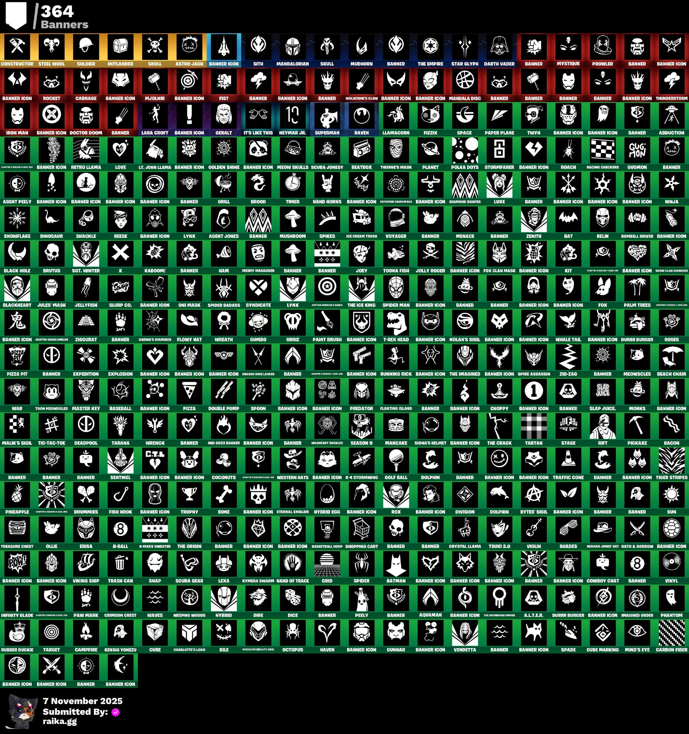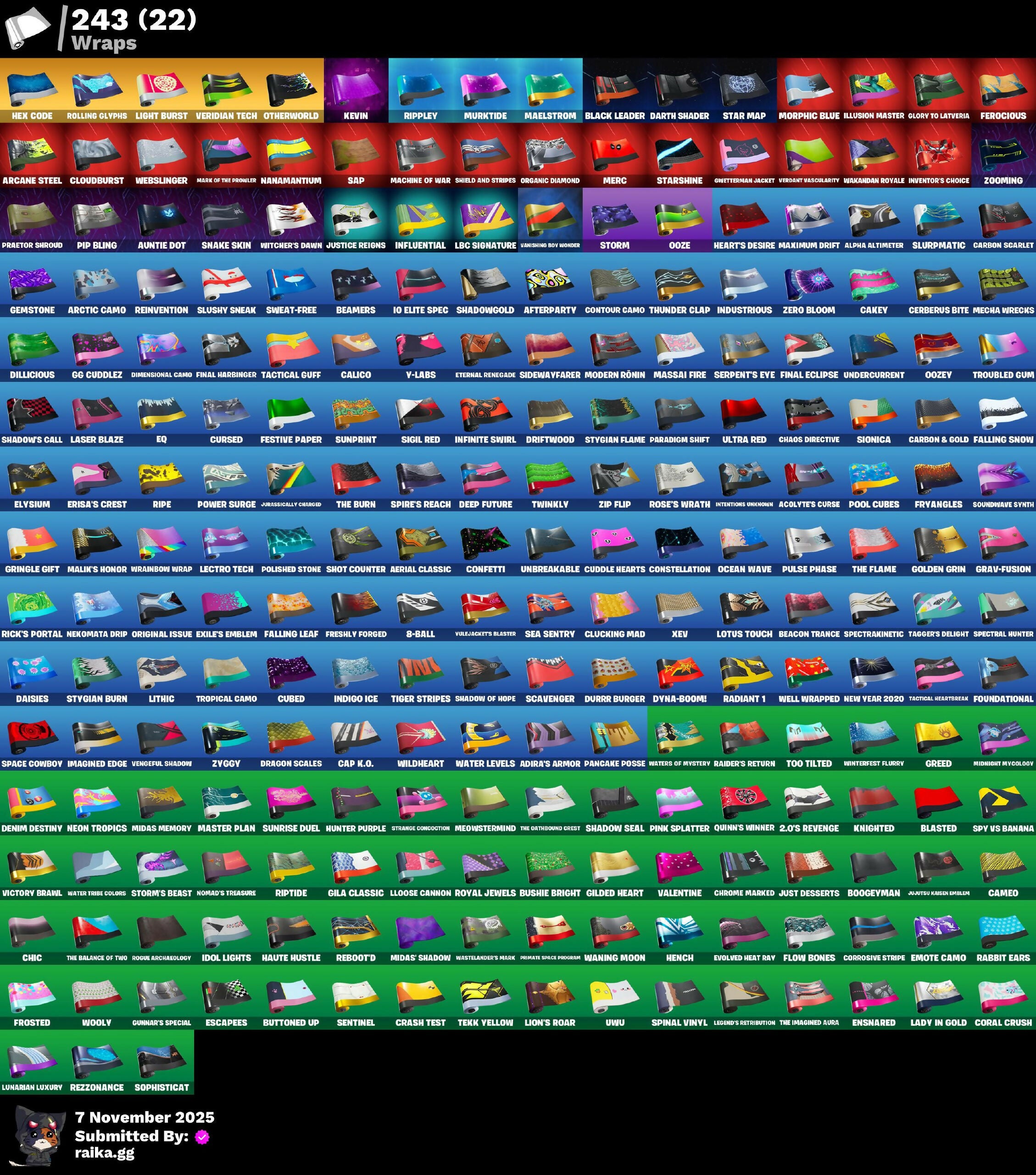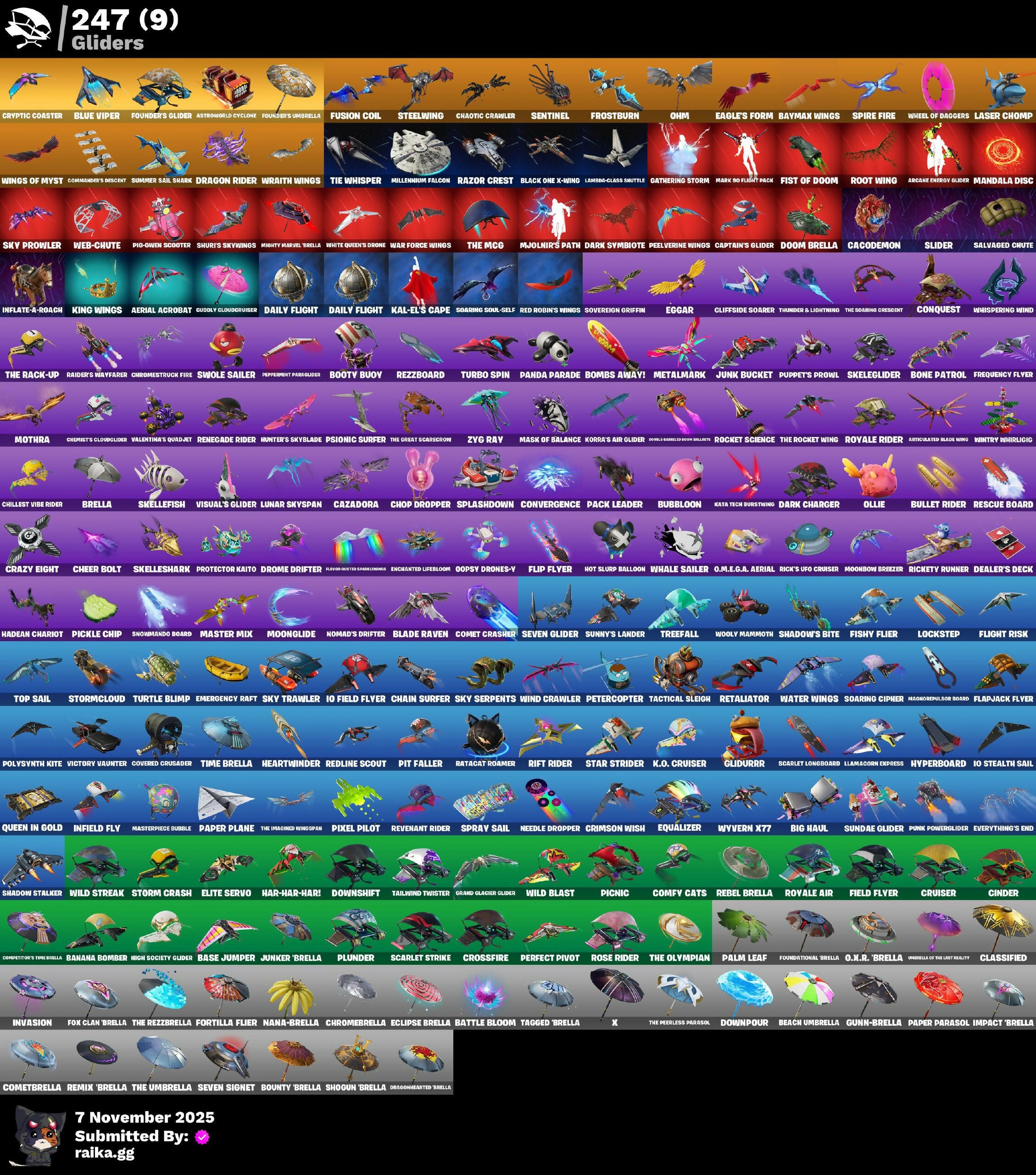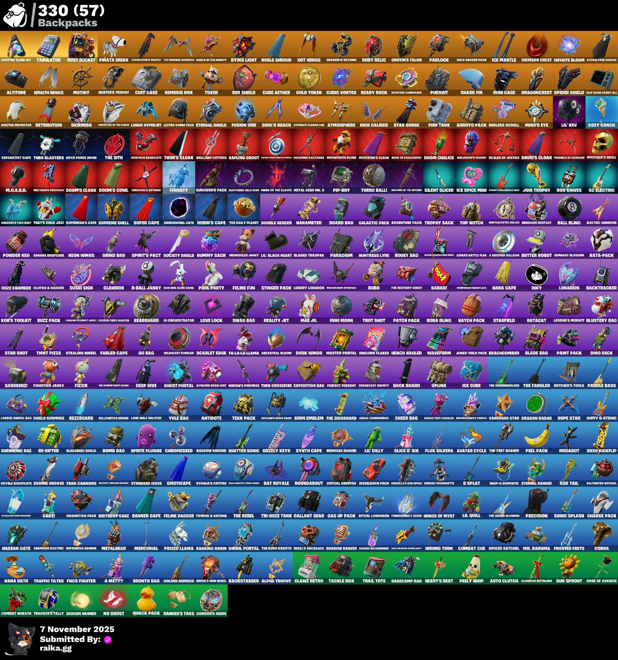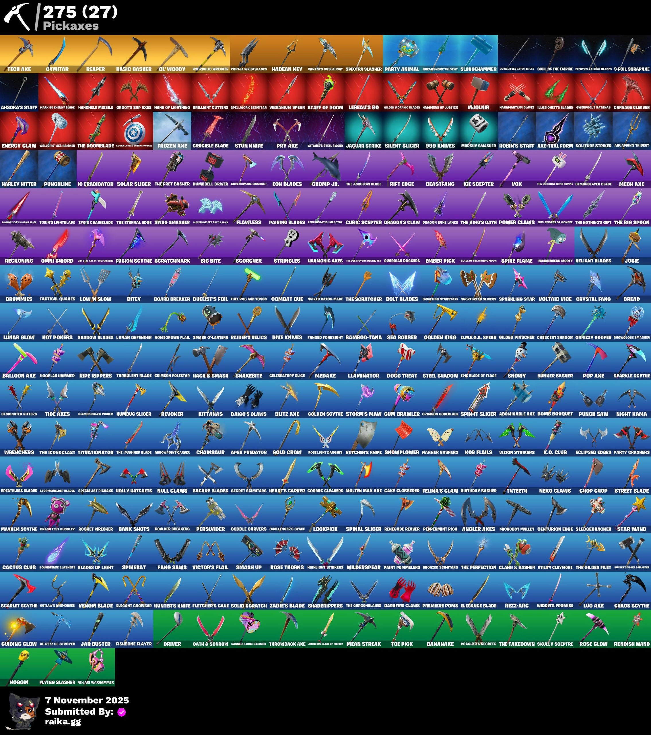 (Snikit!), 1-Ball, 2.0's Revenge, 2020 Kickflip, 4 Me???, 8-Ball, 8-Ball Janky, 8-Ball vs Scratch, 999 Knives, A Wakening, A Warrior Prepares, A Weather Balloon, A.L.T.E.R., Abduction, Abominable Axe, Acolyte's Curse, Adira, Adira's Armor, Adira's Battle Flag, Adventure Pack, Aerial, Aerial Acrobat, Aerial Assault Bomber, Aerial Classic, Aerial Swagger, Afterparty, Agent Jones, Agent Jones (Jump 31), Agent Nana, Agent Peely, Ahsoka Tano, Ahsoka's Staff, Air Shredder, Alpha Altimeter, Alpha Trophy, Alpine Ace (GBR), Altitude, Always Fantabulous, Ancestral Bloom, Angler Axes, Antidote, Antonia, Antonia in Action, Apex Predator, Aphrodite, Apocalypse Shroud, Apollo Adressories, Appeling Drive, Aquaman, Aquaman's Trident, Arcane Energy Glider, Arcane Research, Arcane Steel, Archetype, Arctic Adeline, Arctic Camo, Ark, Arrow Point Carver, Arroyo Pack, Art the Hack, Artemis, Artemis Insignia, Arthur Curry, Articulated Blade Wing, Astro Antidote, Astro Armor, Astro Jack, Astroworld Cyclone, Atmosphere, Auntie Dot, Aurelian, Auto Clutch, Avatar Cycle, Avatar's Flourish, Axe-Tral Form, Axo's Big Moment, B Splat, B.Z.B.C. Competitor, Babygirl!!!, Back Board, Back-Pointed 2050 Ranker, Backstabber, Backtracker, Backup Blades, Bacon, Bag of Coal, Baited, Balance Board, Balanced, Ball Bling, Balloon Axe, Bamboo-Tana, Banana Bomber, Banana Briefcase, Bananas, Bananaxe, Bank Shots, Banner, Banner Cape, Banner Icon, Baron's Hoard, Base Jumper, Baseball, Basecamp Bag, Basic Basher, Basketball Hoop, Bat, Bat Royale, Batarang, Batman, Battle Ball, Battle Blessing, Battle Bloom, Battle Bus Balloon, Battle Mode, Bawk Off, Baymax Wings, Beach Chair, Beach Umbrella, Beachcomber, Beacon Trance, Beamers, Bean Bag, Beastfang, Beat Breaker, Beatbox, Bedside Manner, Beef Blade, Beefremeez's Trophy, Beep Beep, Beesi, Belt It!, Beserker Barrage, Beskar, Big Bite, Big Dill, Big Guns, Big Haul, Bike To Go, Billy Bounce, Birdbrain Flourish, Birthday Basher, Birthday Bud, Birthday Cake, Birthday Dash, Bitey, Black Eternal Knight, Black Hole, Black Knight, Black Leader, Black One X-Wing, Black Panther (Shuri), Black Queen, Blackened Shield, Blackheart, Blade Bag, Blade Raven, Blade of the Howling Moon, Bladed Travpak, Blades of Light, Blasted, Blitz Axe, Blocko, Blowin' Up, Blowing Bubbles, Blue Viper, Blustery Bag, Board Bag, Board Breaker, Board Flair, Bob Cut, Boba Bling, Boba Snack, Bobo, Bogey Bag, Boing!, Bolt Blades, Bomb Bag, Bomb Bouquet, Bombastic Winterfest, Bombs Away!, Bone, Bone Patrol, Boogeyman, Boogie, Boogie Down, Book Of Cagliostro, Boomin', Bootsin' Cats, Booty Buoy, Bot, Both Eyes Open, Boulder Breakers, Bounty 'Brella, Break Point, Breakfast Bounty, Breakneck, Breakshore Trident, Breathless Blades, Brella, Brillant Cutters, Brilliant Cutters, Brite & Speedy, Brite Bomber, Broken Heart Emoji, Bronto, Bronto Bag, Bronzed Scimitars, Brood, Brutus, Bubbloon, Bullet Rider, Bun Bun Bang Bang, Bun Bun Blast, Bunker Basher, Bunker Jonesy, Bunsen Backburner, Burning Ambition Valeria, Bush Peek, Bushie Bright, Butcher's Knife, Butcher's Tools, Butter Robot, Butterfly, Buttoned Up, Buzz Pack, By the Horns, Bytes, Bytes' Sigil, Cacodemon, Cactus Club, Cactus Maze, Cake Clobberer, Cake!, Cakey, Calamity, Calculated, Calico, Call Me, Called Shot, Cameo, Cameo vs Chic, Campfire, Cap K.O., Caper, Captain America's Shield, Captain America's Shield & Pickaxe, Captain America's Shield & Picker, Captain Blamerica, Captain Jones, Captain's Glider, Carbon & Gold, Carbon Fiber, Carbon Fiber Holster, Carbon Scarlet, Card Drop, Cardistry, Carnage, Carnage Cleaver, Cash Grab, Cassidy Quinn, Cat Flip, Catalyst, Cauldron Chill, Cazadora, Celebratory Slice, Centurion, Centurion Edge, Cerberus, Cerberus Bite, Cerberus Medallion, Chain Surfer, Chainsaur, Chainstick Pack, Chalked Up 1-Ball, Challenger Cerberus, Challenger Menace - Flame, Challenger's Staff, Chaos Agent, Chaos Directive, Chaos Director, Chaos Explorer, Chaos Scythe, Chaotic Crawler, Chapter 3 Season 3 Level 100, Chapter 3 Season 4 Level 100, Charge Pack, Charlotte, Charlotte's Logo, Cheer Bag, Cheer Bolt, Chemist's Cloudglider, Chibi, Chic, Chillest Vibe Rider, Chillshot, Choice Knit, Chomp Cudi!, Chomp Jr., Chomp Sr., Choose Naughty, Chop Chop, Chop Dropper, Choppy, Chrome Marked, Chromebrella, Chromesed, Chromestruck Fire, Cinder, Clang & Basher, Clark Kent, Classic Peelverine, Classic Wolverine, Classified, Clawbox, Clawz Retro, Clean Sweep, Cliffside Soarer, Clip Show Carry-All, Cloudburst, Cluck, Cluck (Slurpy), Cluck Strut, Clucking Mad, Clutch & Dagger, Cobalt, Cobra, Coconuts, Coin Flip, Combat Cue, Combat Elite, Combat Giller, Combat Wreath, Comet, Comet Crasher, Cometbrella, Comfy Cats, Commander's Descent, Competitor Medusa, Competitor's Time Brella, Conch Call, Confetti, Conga, Conjure Weapon, Conjuring Mysterio, Conquest, Constellation, Constructor, Contour Camo, Controlled Chaos, Convergence, Coral Commandos, Coral Crush, Corrosive Stripe, Corrupted, Cosmic Cleavers, Count It!, Courageous Omega, Covered Crusader, Cowboy Chat, Cozy Conch, Crabby King, Crack It, Cracked Chiller, Cracked Shield, Crash Test, Crash Test Codzler, Crash Test Cuddler, Crazy Castle, Crazy Eight, Crescent Shroom, Crimson Codeblade, Crimson Crest, Crimson Polestar, Crimson Wish, Cronk Bonny, Crooked Front Right Toe, Crossfire, Crowned, Crucible Blade, Cruiser, Cryptic Coaster, Cryptic Sling-Kit, Crystal Axe of the Masters, Crystal Fang, Crystal Llama, Cube, Cube Aether, Cube Marking, Cubed, Cubic Scepter, Cubic Vortex, Cuddle Carvers, Cuddle Hearts, Cuddle Team Llama, Cuddles' Garden, Cuddly Cloudcruiser, Cuff Case, Cups Up, Cursed, Cursed Marionette, Cyglo Curl, Cymitar, D.G. 63, DJ Yonder, Da Bomb, Dabstand, Dagger Dance, Daigo, Daigo's Claws, Daily Flight, Daisies, Dance Mat, Dark, Dark Charger, Dark Gwenpool, Dark Side Rising, Dark Symbiote, Darkfire Claws, Darth Shader, Darth Vader, Datafiber Charged Pack, Datafiber Chargesack, Daughter of Tron, Dawn Duelist Nisha, De-Rezz De