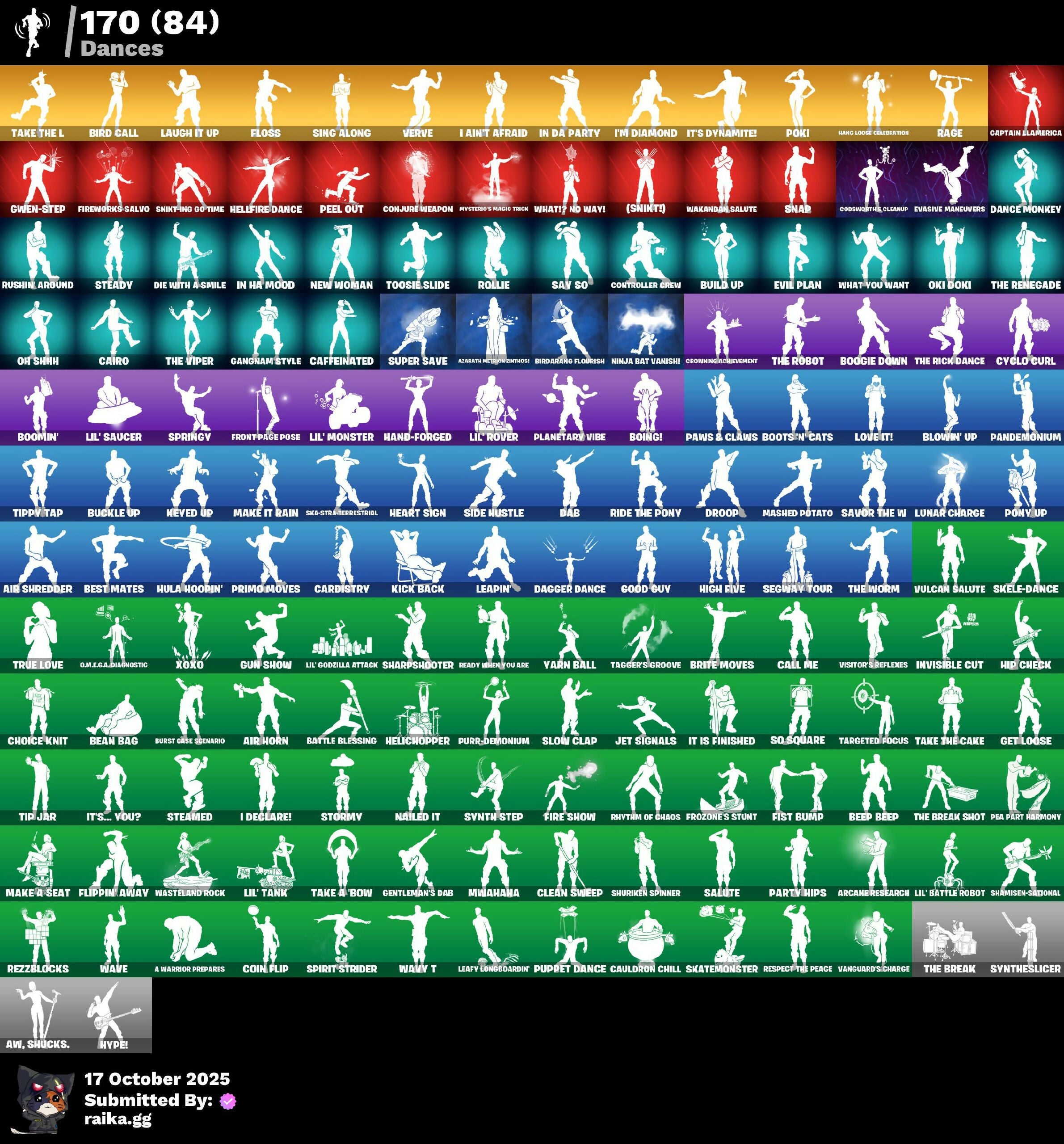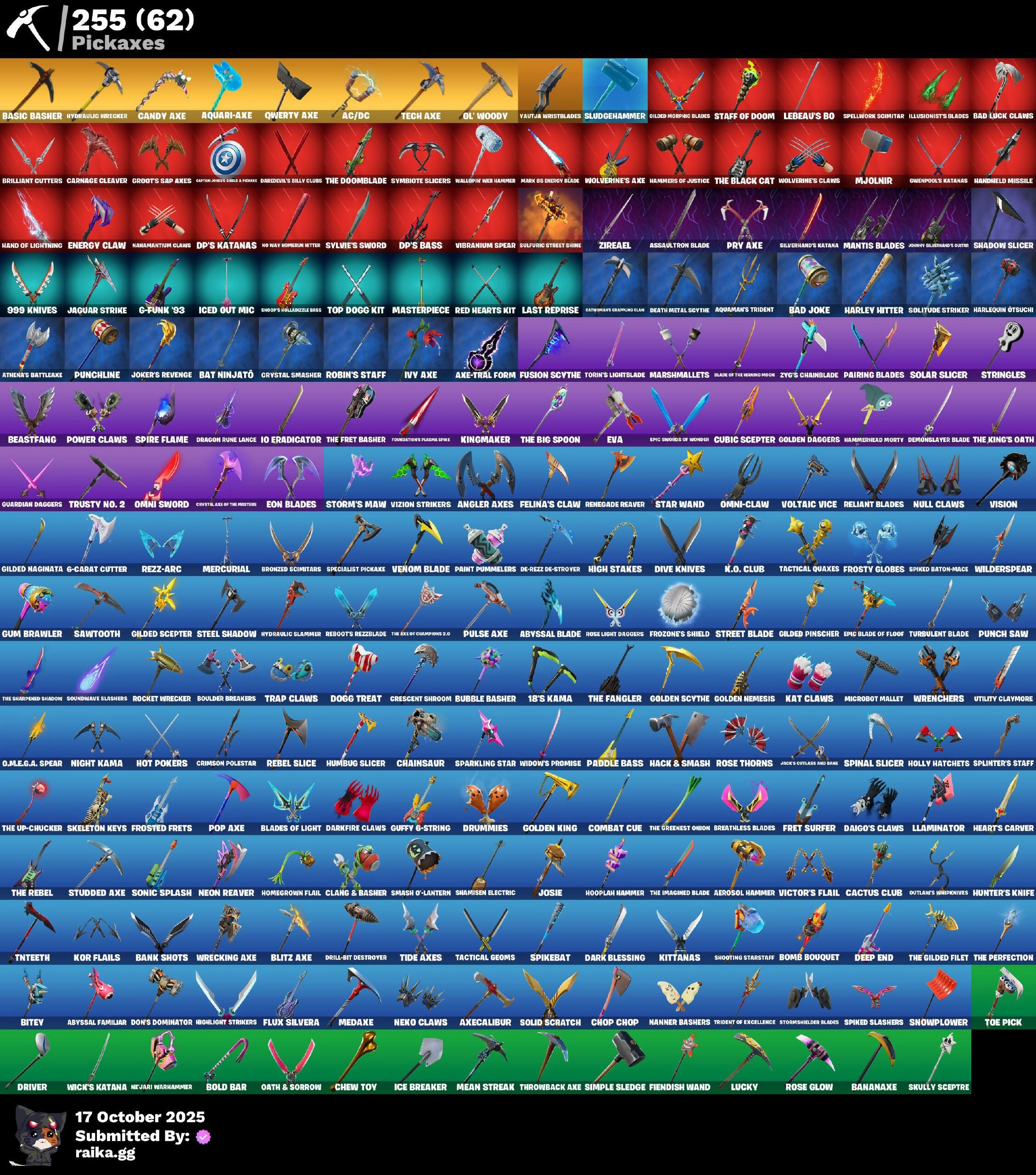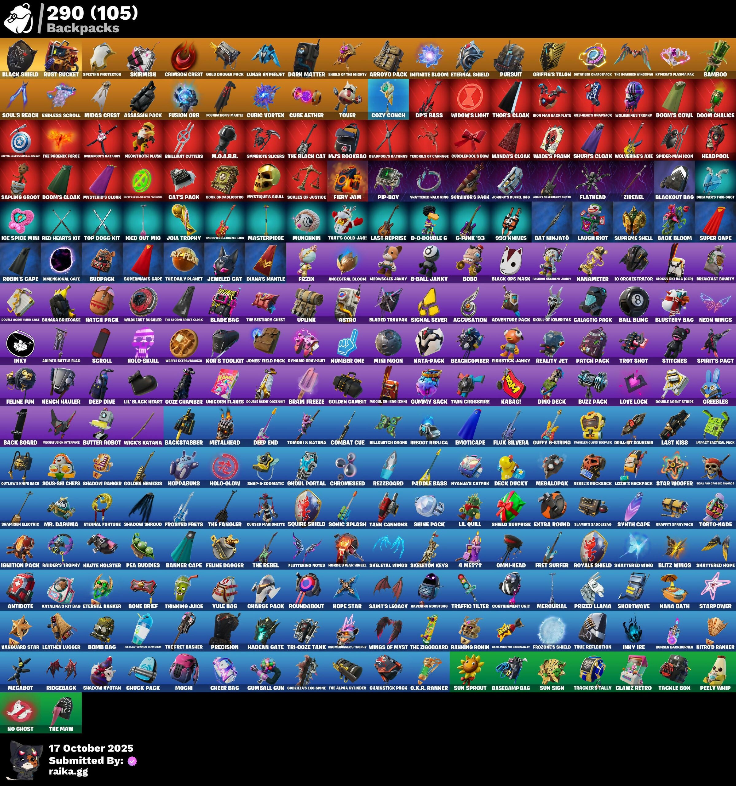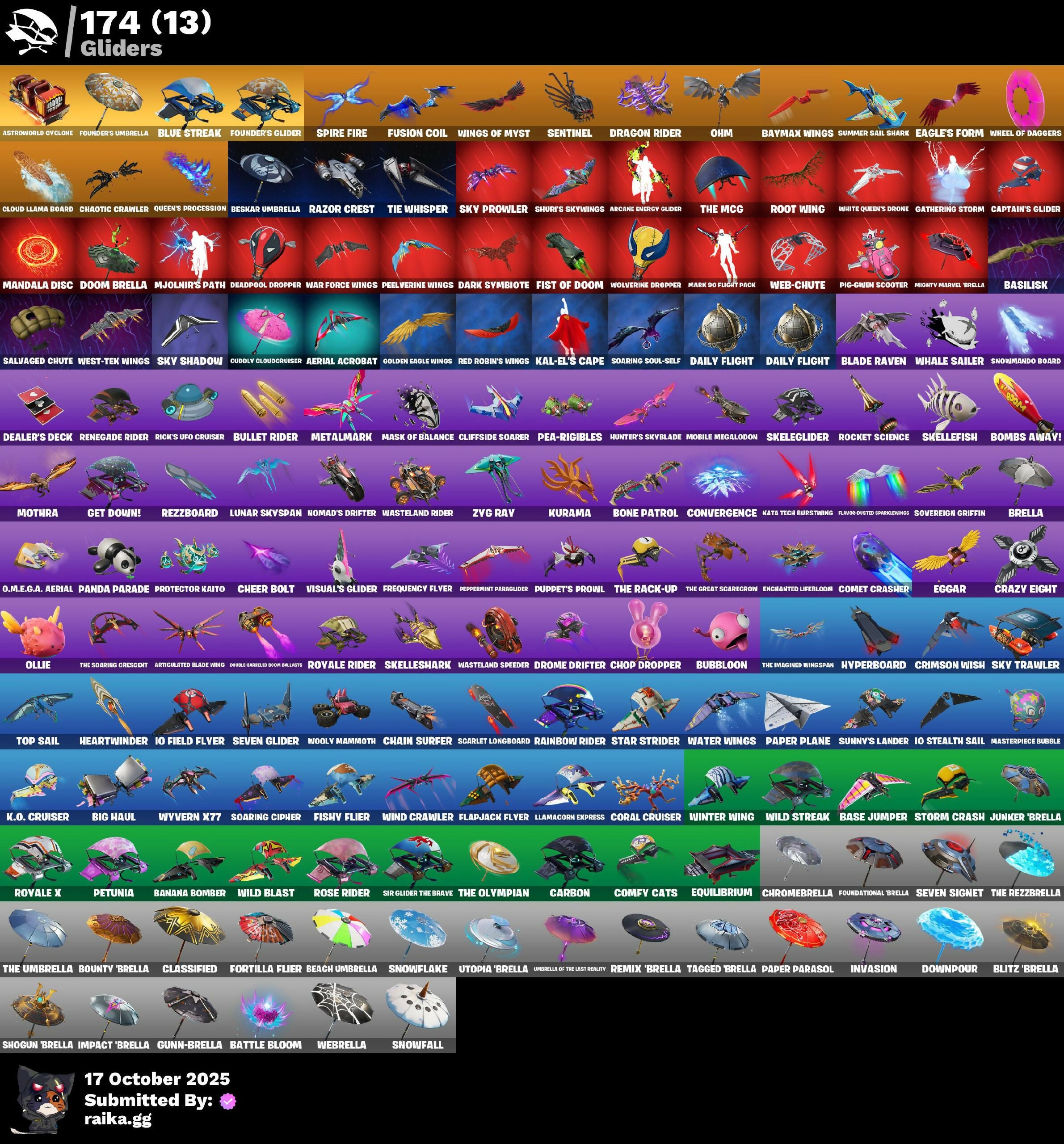 (Snikt!), 1-Ball, 10 Orchestrator, 10-Ball, 18's Kama, 4 Me???, 6-Carat Cutter, 8-Ball Janky, 8-Ball vs Scratch, 999 Knives, A Warrior Prepares, AC/DC, Absenz, Abyss, Abyssal Blade, Abyssal Familiar, Accusation, Ace Academic, Adira, Adira's Battle Flag, Adventure Pack, Aerial Acrobat, Aerial Assault Bomber, Aerosol Hammer, Agent Jones, Agent Peely, Agent Peely Reloaded, Air Horn, Air Shredder, Ancestral Bloom, Andy Fangerson, Angler Axes, Antidote, Aquaman, Aquaman's Trident, Aquari-axe, Arcane Energy Glider, Arcane Research, Arrovo Pack, Articulated Blade Wing, Assassin Pack, Assaultron Blade, Astro, Astroworld Cyclone, Athena's Battleaxe, Athleisure Assassin, Aura, Aw, Shucks., Axe-tral Form, Axecalibur, Ayla Winn, Azarath Metrion Zinthos!, B.R.U.T.E. Gunner, Bachii, Back Bloom, Back Board, Back-Splotted Drones Ammo, Backstabber, Bad Joke, Bad Luck Claws, Ball Bling, Bamboo, Banana Bomber, Banana Briefcase, Bananaxe, Bank Shots, Banner Cape, Base Jumper, Basecamp Bag, Basic Basher, Basilisk, Bat Ninjato, Bat Ninjató, Battle Blessing, Battle Bloom, Baymax Wings, Beach Umbrella, Beachcomber, Bean Bag, Beastfang, Beep Beep, Bernie, Beskar Umbrella, Best Mates, Big Haul, Bird Call, Birdarang Flourish, Birdie, Bitey, Black Cat, Black Knight, Black Ops Mask, Black Shield, Blackout Bag, Blade Bag, Blade Raven, Blade of the Viking Rock, Bladed Trapvak, Blades of Light, Blitz 'Brella, Blitz Axe, Blitz Wings, Blizzabelle, Blowin' Up, Blue Squire, Blue Streak, Blue Team Leader, Blustery Bag, Bobo, Boing!, Bold Bar, Bomb Bag, Bomb Bouquet, Bombs Away!, Bone Brief, Bone Patrol, Boogie Down, Book of Cagliostro, Boomin', Boots 'N' Cats, Boulder Breakers, Bounty 'Brella, Brain Freeze, Breakfast Bounty, Breathless Blades, Brella, Brilliant Cutters, Brite Moves, Brite Raider, Bronzed Scimitars, Bubble Basher, Bubloon, Buckle Up, Budpack, Build Up, Bullet Rider, Bunsen Backburner, Burst Case Scenario, Butter Robot, Buzz Pack, Cactus Club, Caffeinated, Cairo, Call Me, Callisto, Cameo vs Chic, Candy Axe, Caper, Captain America's Shield & Pickaxe, Captain America's Shield & Pickle, Captain Jones, Captain Llamerica, Captain's Glider, Carbon, Cardistry, Carnage, Carnage Cleaver, Cat's Pack, Catwoman Comic Book Outfit, Catwoman's Grappling Clan, Cauldron Chill, Chain Surfer, Chainsaur, Chainstick Pack, Champion Siren, Chaos Agent, Chaos Director, Chaos Double Agent, Chaotic Crawler, Charge Pack, Charlotte, Cheer Bag, Cheer Bolt, Chew Toy, Choice Knit, Chop Chop, Chop Dropper, Chopper Skullcracker Bass, Chromebrella, Chromeseed, Chuck Pack, Ciri, Clang & Basher, Clark Kent, Classified, Clawz Retro, Clean Sweep, Cliffside Soarer, Cloud Llama Board, Cluck, Coastal Machinist, Codsworth's Cleanup, Coin Flip, Color Crush, Combat Cue, Comet, Comet Crasher, Comfy Cats, Commando, Conjure Weapon, Containment Unit, Controller Crew, Convergence, Coral Cruiser, Corvus, Cozy Conch, Crazy Eight, Crescent Shroom, Crimson Crest, Crimson Pollestar, Crimson Wish, Crossheart, Crowning Achievement, Crystal Axe of the Masters, Crystal Smasher, Cube Aether, Cubic Scepter, Cubic Vortex, Cuddlepool, Cuddlepool's Bow, Cuddly Cloudcruiser, Cursed Marionette, Cyclo Curl, D'ark, D-Double G, DP's Bass, DP's Katanas, Dab, Dagger Dance, Daigo, Daigo's Claws, Daily Flight, Dance Monkey, Danica, Daredevil's Billy Clubs, Dark Blessing, Dark Doggo, Dark Matter, Dark Phoenix, Dark Symbiote, Dark Voyager, Darkfire Claws, Dartifier Chromopack, De-Rezz De-Stroyer, Deadpool, Deadpool (Pen & Ink), Deadpool Dropper, Deadpool's Katanas, Dealer's Deck, Death Metal Scythe, Deck Ducky, Deep Dive, Deep End, Demonslayer Blade, Diamond Diva, Diana's Mantle, Die With A Smile, Die With A Smile Bruno, Dimensional Gate, Dino Deck, Dive Knives, Dizzie, Doctor Doom, Doctor Slone, Doctor Strange, Dogg Treat, Don's Dominator, Doom, Doom Brella, Doom Chalice, Doom's Cloak, Doom's Cowl, Double Agent Hard Case, Double Agent Hush, Double Agent Ooze Unit, Double Agent Stripe, Double-Barreled Boom Ballista, Downpour, Dragon Rider, Dragon Rune Lance, Dream, Dreamer's Two-Shot, Drill-Bit Destroyer, Drill-Bit Souvenir, Driver, Drogrunner's Trophy, Drome Drifter, Droop, Drummies, Durrr Taisho, Dusk Knight, Dynamo Grav-Suit, Dynamo Tintina, EVA, Eagle's Form, Echo, Eggar, Eleven, Elite Agent, Emma Frost, Emoticape, Enchanted Lifebloom, Endless Scroll, Energy Claw, Eon Blades, Epic Blade of Floof, Epic Swords of Wonder, Equilibrium, Erisa, Eternal Fortune, Eternal Knight, Eternal Ranker, Eternal Shield, Evasive Maneuvers, Evie, Evil Plan, Explorer Emilie, Extra Round, Fabio Sparklemane, Fade, Fashion Accident Janky, Felina, Felina's Claw, Feline Dagger, Feline Fun, Festival Lace, Festival Phaedra, Fiendish Wand, Fiery Jam, Fire Show, Fireworks Salvo, Fishstick Janky, Fishy Flier, Fist Bump, Fist Of Doom, Fizzix, Flapjack Flyer, Flathead, Flavor-Dusted Sparklewing, Flippin' Away, Floss, Fluttering Notes, Flux Silvera, Focus, Fortilla Flier, Foundation's Mantle, Foundational Brella, Foundations Plasma Spike, Founder's Glider, Founder's Umbrella, Frequency Flyer, Fret Surfer, Front Page Pose, Frost Squad, Frosted Frets, Frosty Globes, Frozone, Frozone's Shield, Frozone's Stunt, Fusion, Fusion Coil, Fusion Orb, Fusion Scythe, G-Funk '93, Galactic Pack, Gangnam Style, Gathering Storm, Gear Specialist Maya, Gentleman's Dab, Get Down!, Get Loose, Ghoul Portal, Gilded Morpho Blades, Gilded Naginata, Gilded Pinscher, Gilded Scepter, Glitch, Godzilla Evolved, Godzilla's Exo-Spine, Gold Brutus, Gold Dagger Pack, Gold Meowscles, Gold Midas, Gold Tintina, Golden Daggers, Golden Eagle Wings, Golden Gambit, Golden King, Golden Nemesis, Golden Scythe, Good Guv, Graffiti Spraypack, Greebles, Greenpool's Katanas, Griffin's Talon, Grimoire, Groot, Groot's Sap Axes, Guardian Daggers, Guerrera Colorado, Guffy 6-String, Guffy G-String, Guggimon, Gum Brawler, Gumball Gun, Gumbo, Gummy Sack, Gun Show, Gunn-Brella, Gunnar, Gwen-Step, Gwenpool, Hack & Smash, Hadean Gate, Hammerhead Morty, Hammers of Jus