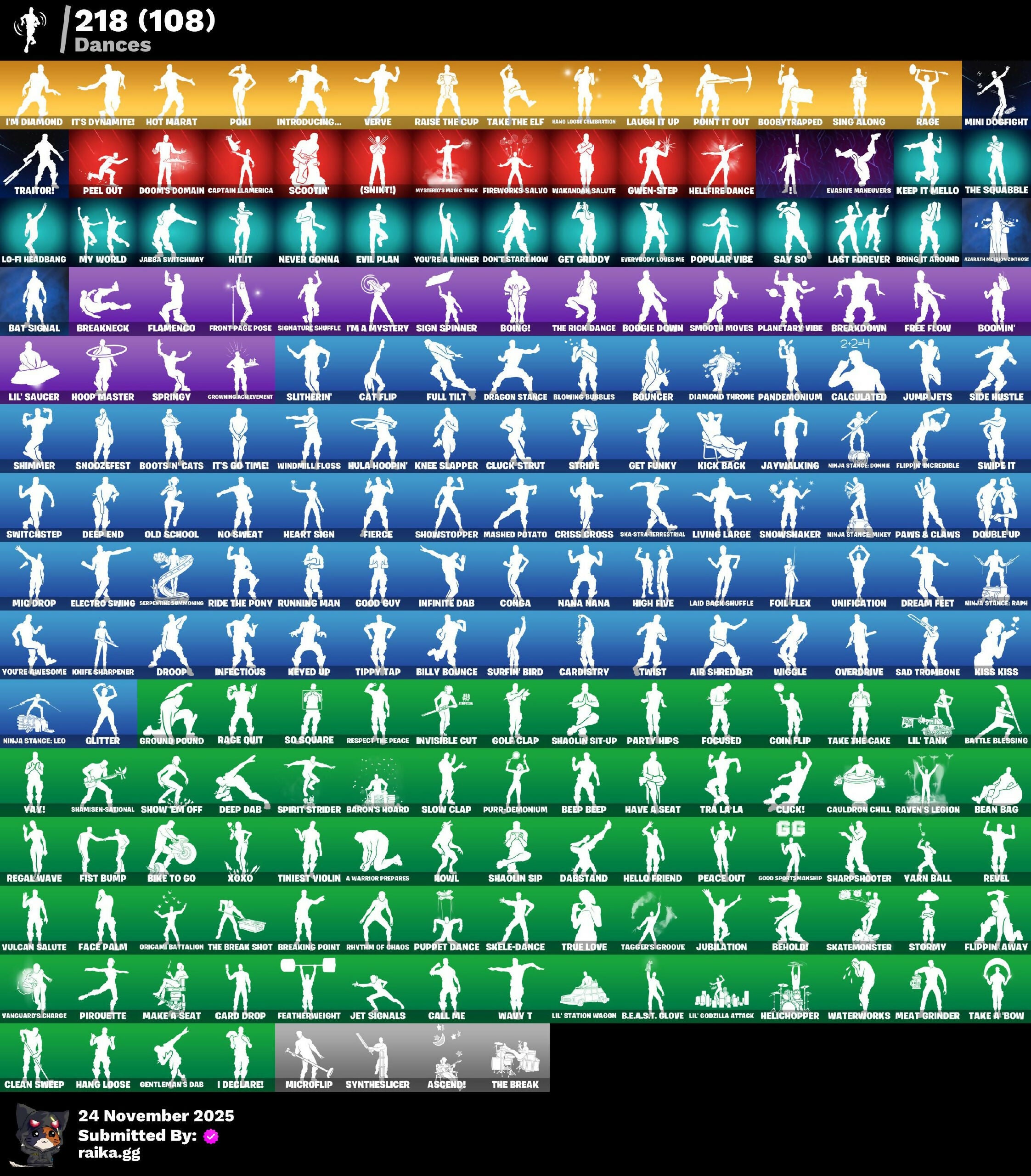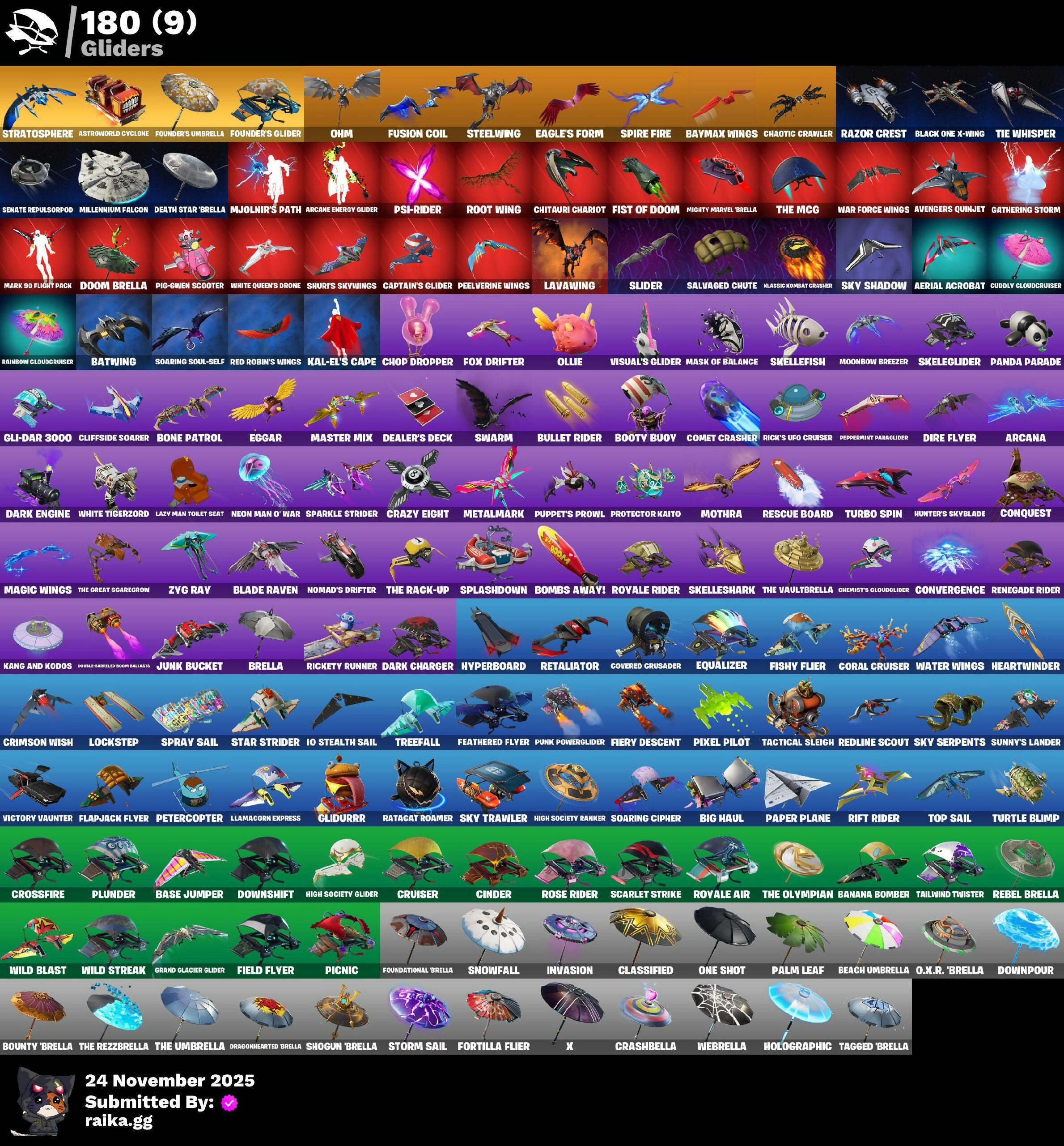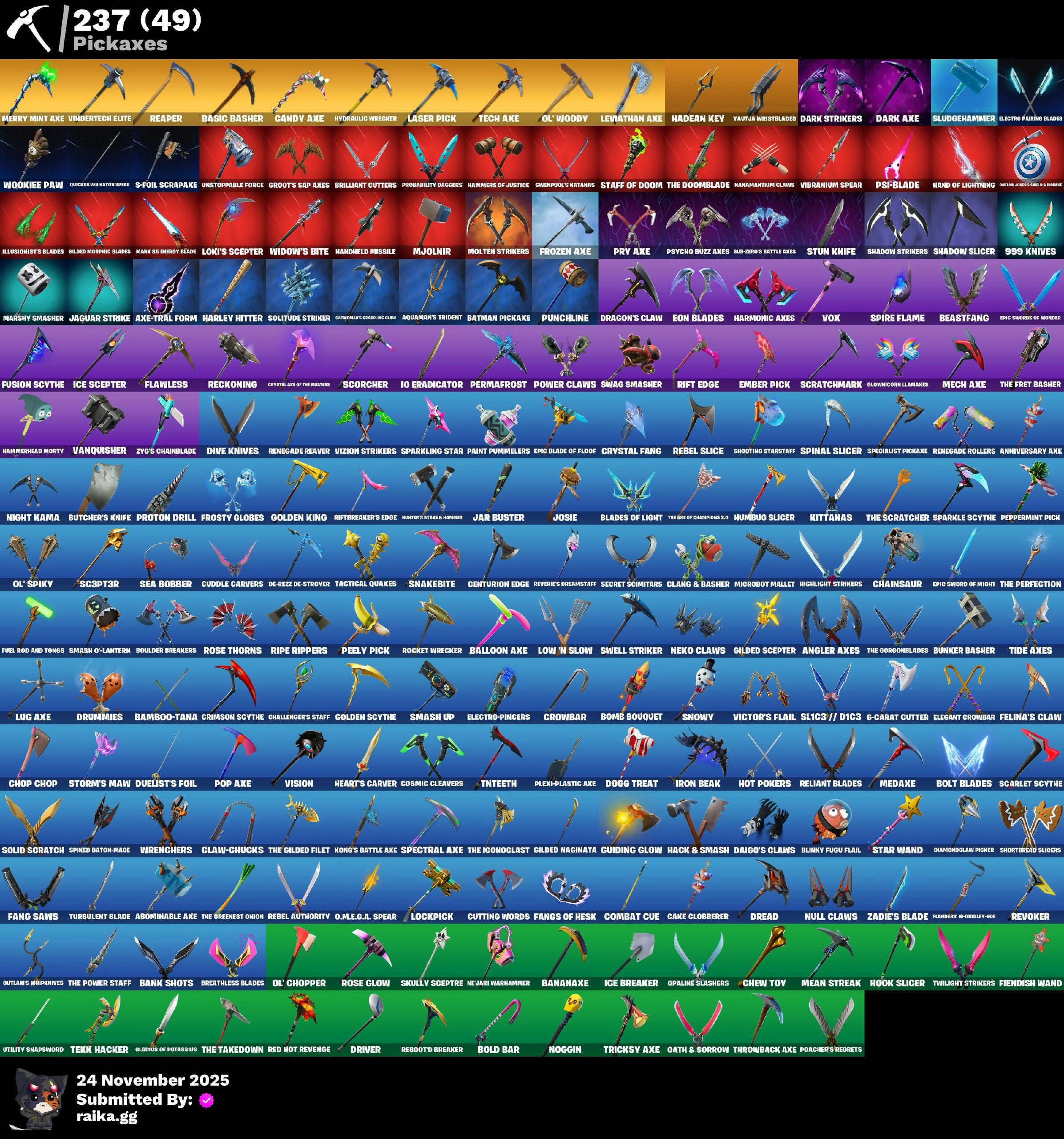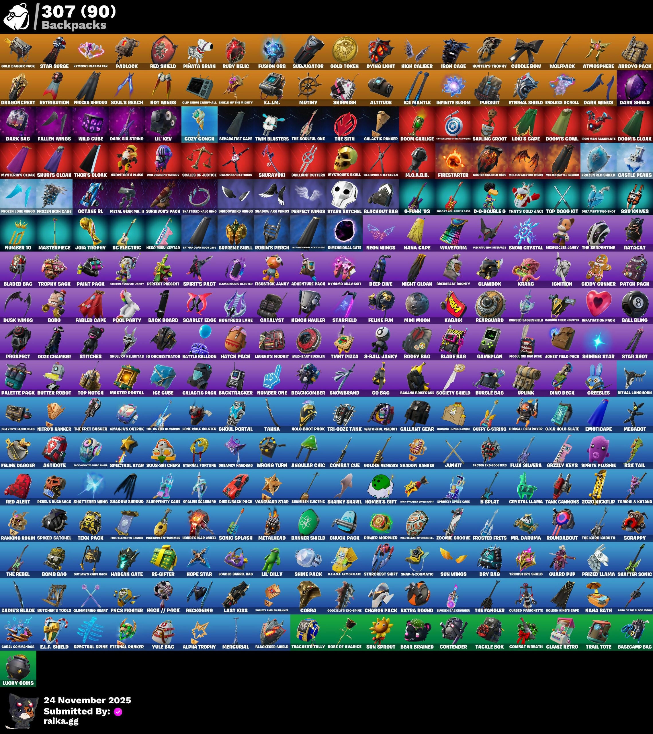 (Snikt!), 1-Ball, 2020 Kickflip, 6-Carat Cutter, 8-Ball Janky, 999 Knives, A Warrior Prepares, A.L.M., Abominable Axe, Adeline, Adventure Pack, Aerial Acrobat, Aerial Assault Bomber, Agent Jones, Agent Peely, Air Shredder, Alpha Trophy, Altitude, Angler Axes, Angular Chic, Anniversary Axe, Antidote, Aquaman, Aquaman's Trident, Arcana, Arcane Energy Glider, Arctic Assassin, Arroyo Pack, Ascend!, Ascendant Midas, Astra, Astroworld Cyclone, Atmosphere, Aura, Avengers Quinjet, Axetral Form, Azarath M'Ragevont, B Splat, B-Ball vs Scratch, B.E.A.S.T. Aeroplate, B.E.A.S.T. Glove, Back Board, Back-Hounted Drops Boots, Back-Hounted Turbo Tower, Backtracker, Ball Bling, Balloon Axe, Bamboo-Tana, Banana Axe, Banana Bomber, Banana Briefcase, Banana Bunch Lunch, Bank Shots, Banner Shield, Banner Trooper, Baron's Hoard, Base Jumper, Basecamp Bag, Basic Basher, Bat Signal, Batman Comic Book Outfit, Batman Going Book Cape, Batman Pickaxe, Battle Balloon, Battle Blessing, Batwing, Baymax Wings, Beach Umbrella, Beachcomber, Bean Bag, Bear Brained, Beastfang, Beep Beep, Behold!, Big Haul, Bike To Go, Billy Bounce, Black One X-Wing, Blackened Shield, Blackheart, Blackout Bag, Blade Bag, Blade Raven, Bladed Bag, Blades Of Light, Blaze, Blinky Fugu Flail, Blowing Bubbles, Bobo, Bogey Bag, Boing!, Bold Bar, Bolt Blades, Bomb Bag, Bomb Bouquet, Bombs Away!, Bone Patrol, Boobytrapped, Boogie Down, Boomin', Boots N' Cats, Booty Buoy, Boulder Breakers, Bouncer, Bounty 'Brella, Breakdown, Breakfast Bounty, Breaking Point, Breakneck, Breathless Blades, Brella, Brilliant Cutters, Bring It Around, Bullet Rider, Bunker Basher, Bunker Jonesy, Bunnymoon, Bunsen Backburner, Burgle Bag, Butcher's Knife, Butcher's Tools, Butter Robot, Cake Clobberer, Calamity, Calculated, Call Me, Cameo vs Chic, Candy Axe, Captain Ilamerica, Captain Jones, Captain's Glider, Carbon Fiber Holster, Card Drop, Cardistry, Castle Peaks, Cat Flip, Catalyst, Catwoman's Grappling Claw, Cauldron Chill, Celeste, Centurion, Centurion Edge, Chainsaur, Challenger's Staff, Chaos Agent, Chaos Director, Chaotic Crawler, Charge Pack, Chemist's Cloudglider, Chew Toy, Chigusa, Chill Count, Chitauri Chariot, Chop Chop, Chop Dropper, Chromium, Chuck Pack, Cinder, Clang & Basher, Classified, Claw-Chucks, Clawbox, Clawz Retro, Clean Sweep, Cliffside Soarer, Clip Show Carry-All, Cluck, Cluck Strut, Cluck!, Cobra, Codename E.L.F., Coin Flip, Combat Cue, Combat Wreath, Comet Crasher, Commando, Conga, Conquest, Contender, Contract Giller, Convergence, Coral Commandos, Coral Cruiser, Cosmic Cleavers, Covered Crusader, Cozy Chomps, Cozy Conch, Crashbrella, Crazy Eight, Crimson Scythe, Crimson Wish, Criss Cross, Crossfire, Crowbar, Cruiser, Cryptic, Crystal, Crystal Axe Of The Masters, Crystal Fang, Crystal Llama, Cuddle Bow, Cuddle Carvers, Cuddle Team Leader, Cuddly Cloudcruiser, Cursed Eagleshield, Cursed Marionette, Cutting Words, D-O-Double G, DJ Yonder, Dabstand, Daigo, Daigo's Claws, Dark Axe, Dark Bag, Dark Bomber, Dark Charger, Dark Engine, Dark Jonesy, Dark Power Chord, Dark Red Knight, Dark Shield, Dark Six String, Dark Strikers, Dark Wild Card, Dark Wings, De-Rezz De-Stroyer, Deadpool, Deadpool's Katanas, Dealer's Deck, Death Star 'Brella, Deep Dab, Deep Dive, Deep End, Delfervine Wings, Demi, Diamond Diva, Diamond Throne, Diamondclaw Picker, Dieselback Pack, Dimensional Gate, Dino Deck, Dire, Dire Flyer, Dive Knives, Dizzie, Doctor Doom, Doctor Slone, Dogg Treat, Don't Stare Now, Doom, Doom 'Brella, Doom Chalice, Doom's Cloak, Doom's Cowl, Doom's Domain, Dorsal Destroyer, Double Up, Double-Barreled Boom Ballasts, Downpour, Downshift, Dragon Stance, Dragon's Claw, Dragoncrest, Dragonhearted Brella, Dread, Dream, Dream Feet, Dreamer's Two-Shot, Dreamzy Handbag, Drift, Driver, Droop, Drummies, Dry Bag, Duelist's Foil, Dummy, Durrr Taisho, Dusk, Dusk Wings, Dying Light, Dynamo, Dynamo Dancer, Dynamo Grav-Suit, Dynamo Tntina, E.L.F. Shield, E.L.I.M., Eagle's Form, Eggar, Electro Faring Blades, Electro Swing, Electro-Pincers, Elegant Crowbar, Ember, Ember Pick, Emma Frost, Emoticape, Endless Scroll, Enforcer, Envoy, Eon Blades, Epic Blade Of Floof, Epic Sword Of Might, Epic Swords Of Wonder, Equalizer, Eternal Fortune, Eternal Knight, Eternal Ranker, Eternal Shield, Eternal Voyager, Evasive Maneuvers, Everybody Loves Me, Evil Plan, Explorer Emilie, Extra Round, FNCS Fighter, Fable, Fabled Cape, Face Palm, Fade, Fallen Love Ranger, Fallen Wings, Fang Saws, Fang of the Olde Rone, Fangs Of Hesk, Fashion Accident Janky, Feathered Flyer, Featherweight, Felina, Felina's Claw, Feline Dagger, Feline Fun, Field Flyer, Fiendish Wand, Fierce, Fiery Descent, Finesse Finisher, Firestarter, Fireworks-Salvo, Fishstick Janky, Fishy Flier, Fist Bump, Fist of Doom, Fixer, Flamenco, Flanders Hi-Gidcley-Hoe, Flapjack Flyer, Flawless, Flippin Away, Flippin' Incredible, Flux Silvera, Focus, Focused, Foil Flex, Fortilla Flier, Foundational Brella, Founder's Glider, Founder's Umbrella, Four Elements Banger, Fox Drifter, Free Flow, Frontpage Pose, Frosted Flurry, Frosted Frets, Frosty Globes, Frozen Axe, Frozen Fishstick, Frozen Iron Cage, Frozen Love Ranger, Frozen Love Wings, Frozen Nog Ops, Frozen Raven, Frozen Red Knight, Frozen Red Shield, Frozen Shroud, Fuel Rod And Tongs, Full Tilt, Fusion, Fusion Coil, Fusion Orb, Fusion Scythe, G-Funk '93, Galactic Pack, Galactic Ranker, Gallant Gear, Gameplan, Gathering Storm, Gear Specialist Maya, Gentleman's Dab, Get Funky, Get Griddy, Ghoul Portal, Ghoul Trooper, Giddy Gunner, Giddy-Up, Gilded Morphic Blades, Gilded Naginata, Gilded Scepter, Ginger Gunner, Gladius Of Potassius, Gli-Dar 3000, Glidurrr, Glimmering Heart, Glitter, Glow, Glowing Corn Llamaxes, Go Bag, Godzilla Evolved, Godzilla's Exo-Spine, Gold Brutus, Gold Dagger Pack, Gold Meowscles, Gold Midas, Gold Tntina, Gold Token, Golden King, Golden King's Cape, Golden Nemesis, Golden Scythe, Golf Clap, Good Guy, Good Sportsmanship, Grand Glacier Glider, Greebles, Grizzly Keys, Groot, G