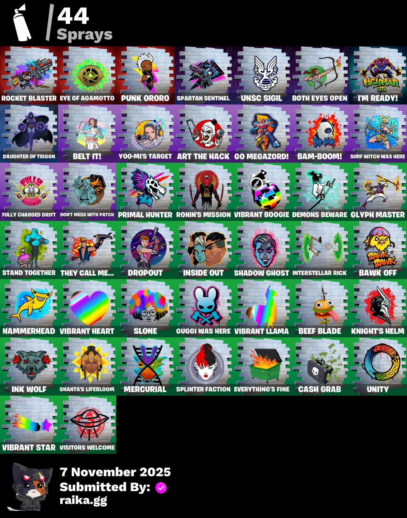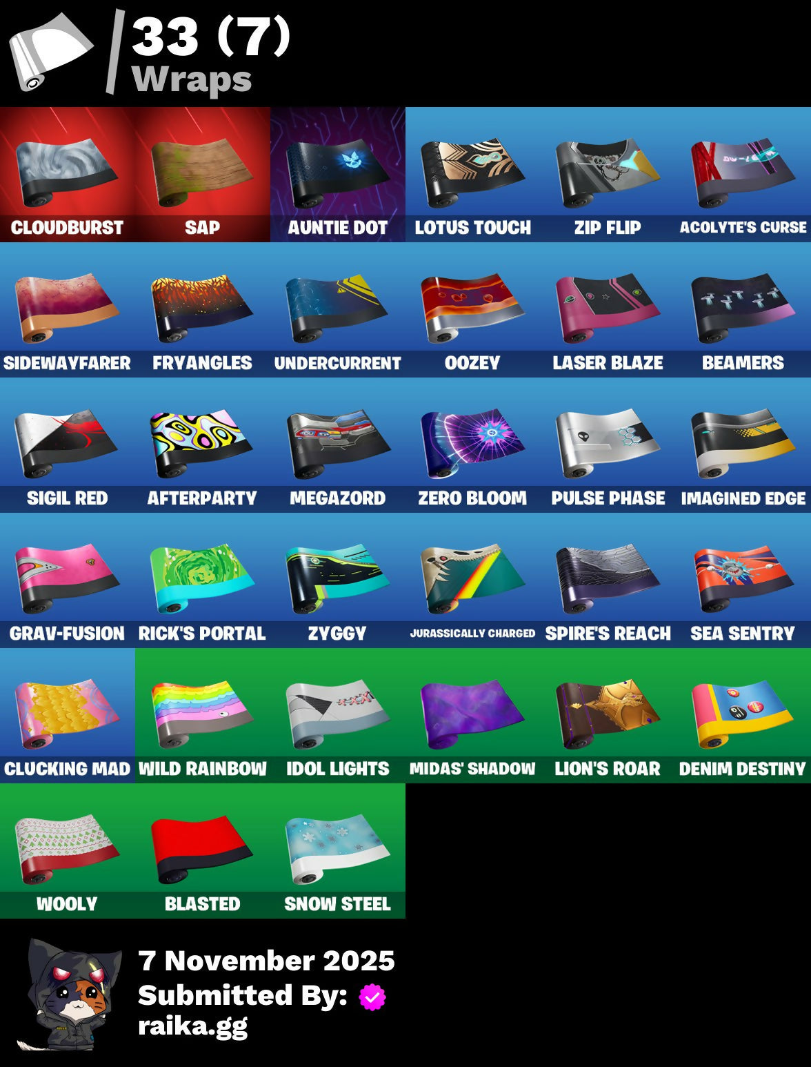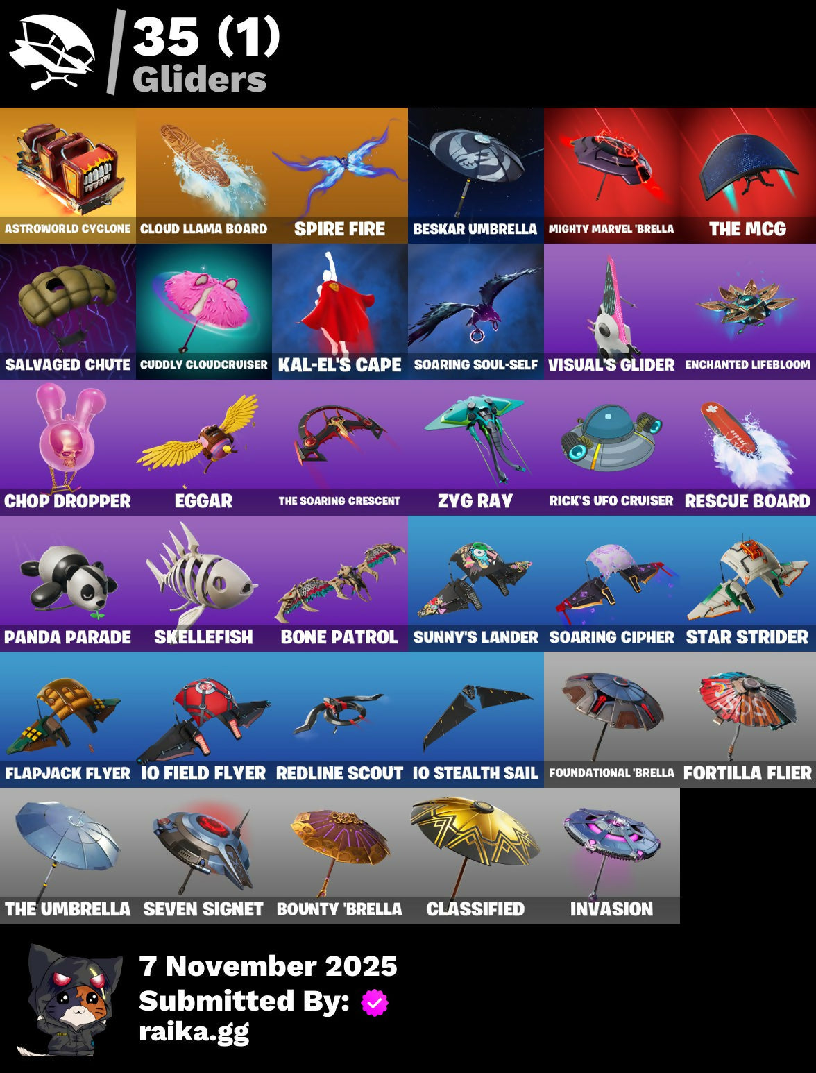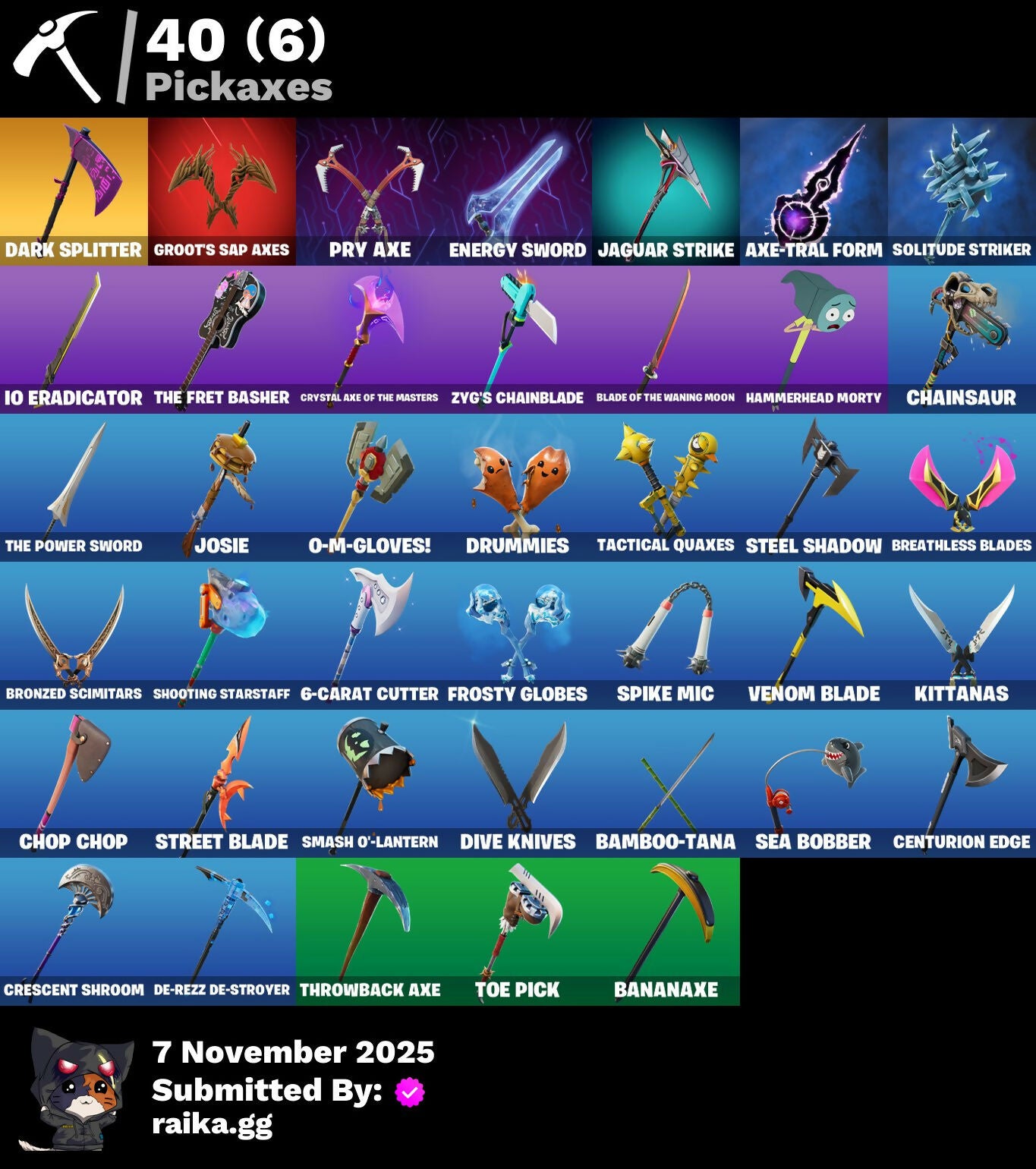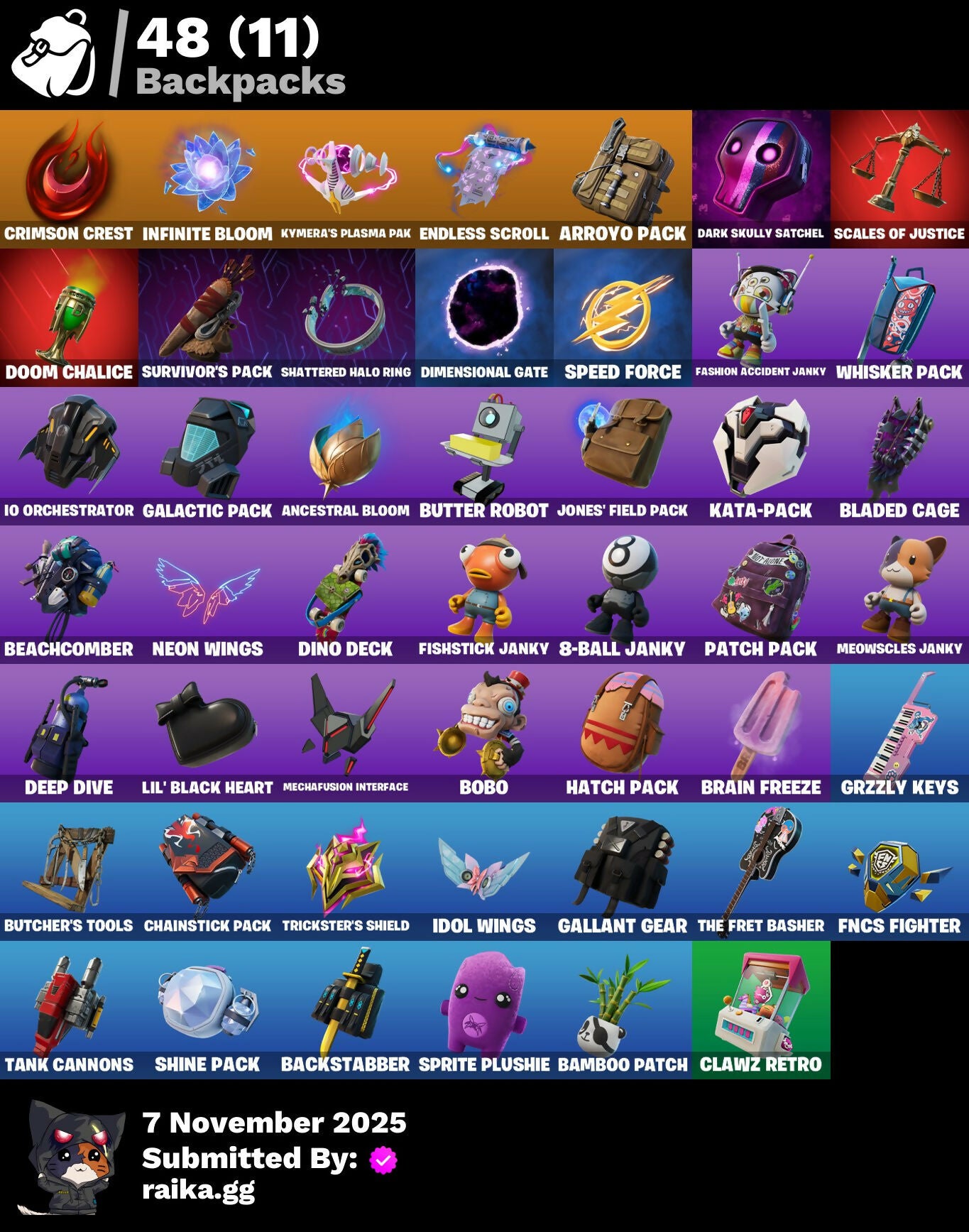 6-Carat Cutter, 8-Ball Janky, Abduction, Acolyte's Curse, Afterparty, Agent Jones, Agent Jones (Jump 31), Agent Patch, Agent Peely, Ancestral Bloom, Arroyo Pack, Art The Hack, Astroworld Cyclone, Auntie Dot, Axe-Tral Form, Azarath Metrion Zinthos!, B.R.U.T.E. Navigator, Backstabber, Bam-Boom!, Bamboo Patch, Bamboo-Tana, Bananaxe, Banner, Bawk Off, Beachcomber, Beamers, Bean Bag, Beef Blade, Beep Beep, Behold!, Belt It!, Beskar Umbrella, Bike To Go, Blade Of The Waning Moon, Bladed Cage, Blasted, Bobo, Bone Patrol, Boogie Down, Boots 'N' Cats, Both Eyes Open, Bounty 'Brella, Brain Freeze, Breathless Blades, Bronzed Scimitars, Butcher's Tools, Butter Robot, Call Me, Cap Kick, Cardistry, Cash Grab, Centurion, Centurion Edge, Chainsaur, Chainstick Pack, Charlotte's Logo, Chop Chop, Chop Dropper, Choppy, Classified, Clawz Retro, Clean Sweep, Cloud Llama Board, Cloudburst, Cluck, Cluck (Slurpy), Clucking Mad, Cowboy Chat, Crescent Shroom, Crimson Crest, Crowning Achievement, Crystal Axe Of The Masters, Cube Marking, Cuddly Cloudcruiser, Dark Skully, Dark Skully Satchel, Dark Splitter, Daughter Of Trigon, De-Rezz De-Stroyer, Deep Dive, Demons Beware, Denim Destiny, Diamond Diva, Dimensional Gate, Dino Deck, Dino Megazord, Dive Knives, Doctor Doom, Doctor Slone, Don't Mess With Patch, Doom Chalice, Droopy, Dropout, Drummies, Eggar, Enchanted Lifebloom, Endless Scroll, Energy Sword, Evasive Maneuvers, Everything's Fine, Eye Of Agamotto, FNCS Fighter, Face Palm, Fashion Accident Janky, Fishstick Janky, Flapjack Flyer, Flippin' Away, Fortilla Flier, Foundational 'Brella, Frosty Globes, Fryangles, Fully Charged Drift, Galactic Pack, Gallant Gear, Glyph Master, Go Megazord!, Good Guy, Grav-Fusion, Grave Feather, Groot's Sap Axes, Grzzly Keys, Guggi Was Here, Guggimon, Gugmon, Hammerhead, Hammerhead Morty, Hatch Pack, Have A Seat, I'm Ready!, IO Eradicator, IO Orchestrator, Idol Lights, Idol Wings, Imagined Edge, Imagined Order, Infinite Bloom, Ink Wolf, Inside Out, Interstellar Rick, Invasion, Io Field Flyer, Io Stealth Sail, Jaguar Strike, Joey, Jones' Field Pack, Josie, Jurassically Charged, Kal-El's Cape, Kata-Pack, Kenshi Yonezu, Kick Back, Kit, Kittanas, Knight's Helm, Kymera, Kymera Swarm, Kymera's Plasma Pak, Lara Croft, Lara Croft (Gold Anniversary), Laser Blaze, Laugh It Up, Lil' Black Heart, Lil' Ghost, Lil' Octane, Lil' Saucer, Lil' Zord Battle Mode, Lion's Roar, Lobby Classic, Lotus Touch, Lunar Charge, Meat Grinder, Mechafusion Interface, Megazord, Menace, Meowscles Janky, Mercurial, Midas' Shadow, Mighty Marvel 'Brella, Mystique, Nailed It, Neon Wings, Neymar Jr, Neymar Jr., O-M-Gloves!, Oozey, Panda Parade, Party Hips, Patch Pack, Planet, Primal Hunter, Pry Axe, Pulse Phase, Punk Ororo, Raven, Raz, Rebirth Raven, Redline Scout, Reese, Reporting For Duty, Rescue Board, Rick, Rick Sanchez, Rick's Portal, Rick's Ufo Cruiser, Rock Paper Scissors, Rocket Blaster, Rollie, Ronin, Ronin's Mission, Salvaged Chute, Sandstone Joey, Sap, Scales of Justice, Sea Bobber, Sea Sentry, Seeker, Seven Signet, Shadow Boxer, Shadow Ghost, Shanta, Shanta's Lifebloom, Shattered Halo Ring, Shine Pack, Shooting Starstaff, Sidewayfarer, Sigil Red, Sing Along, Siona's Helmet, Ska-Stra-Terrestrial, Skellefish, Slone, Smash O'-Lantern, Snow Steel, So Square, Soaring Cipher, Soaring Soul-Self, Solitude Striker, Spartan Sentinel, Speed Force, Spike Mic, Spire Fire, Spire's Reach, Splinter Faction, Sprite Plushie, Stand Together, Star Strider, Steel Shadow, Street Blade, Sunny, Sunny's Lander, Superman, Surf Witch Was Here, Survivor's Pack, Tactical Quaxes, Take A 'Bow, Take The Cake, Tank Cannons, Tarana, Tarana (X-Tinction Armor), The Flash, The Fret Basher, The Mcg, The Power Sword, The Rick Dance, The Soaring Crescent, The Umbrella, They Call Me..., Throwback Axe, Toe Pick, Toon Meowscles, Toona Fish, Trickster's Shield, Undercurrent, Unity, Unsc Sigil, Unsc Spartan, Venom Blade, Verve, Vibrant Boogie, Vibrant Heart, Vibrant Llama, Vibrant Star, Visitors Welcome, Visual's Glider, Vix, Vulcan Salute, Wakandan Salute, Whisker Pack, Wild, Wild Rainbow, Wooly, Xile, Xoxo, Yellowjacket, Yoo-Mi, Yoo-Mi's Target, Zero Bloom, Zip Flip, Zyg, Zyg Ray, Zyg's Chainblade, Zyggy