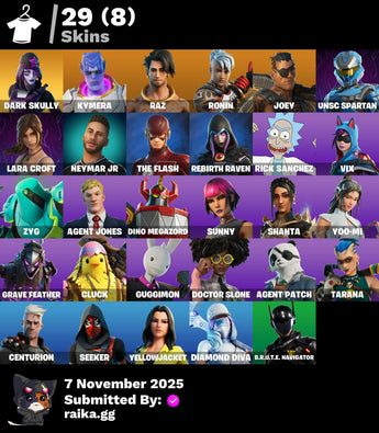 [PC/PSN/XBOX] 29 skins | Dark Skully | Kymera | Raz | Ronin | Joey | UNSC Spartan | Lara Croft | Neymar Jr | The Flash | Rebirth Raven | Rick Sanchez | Vix | 350 VB / FN