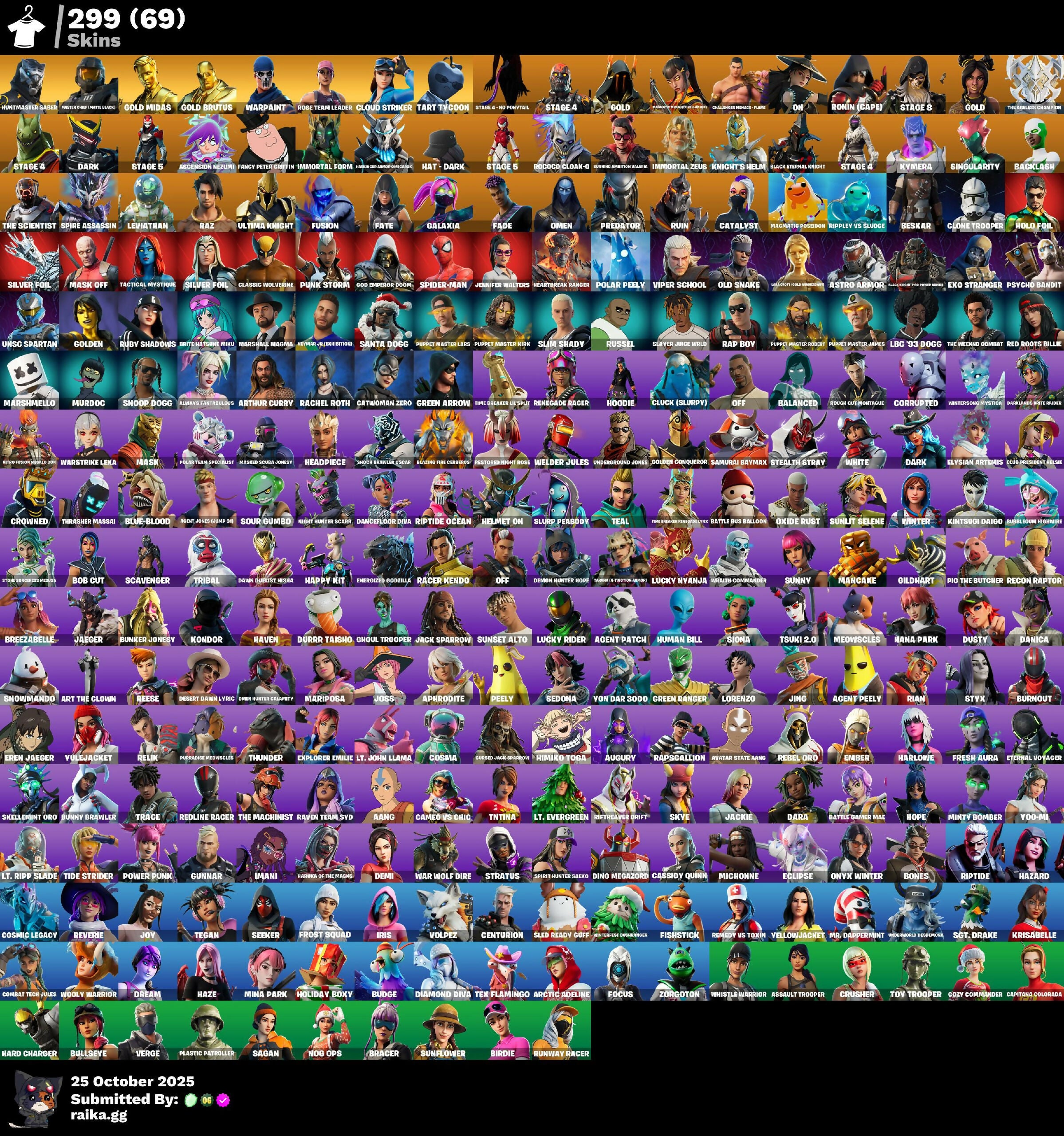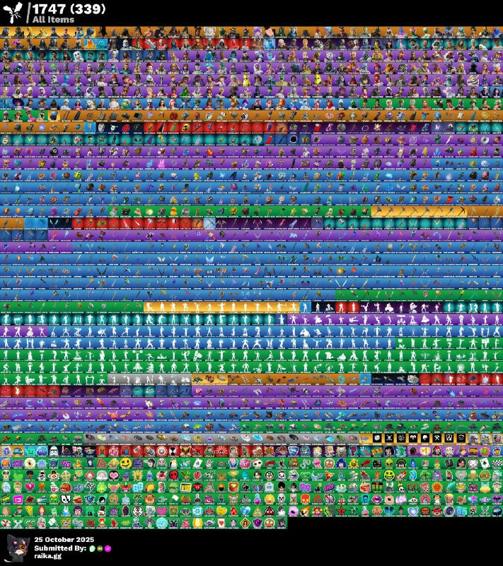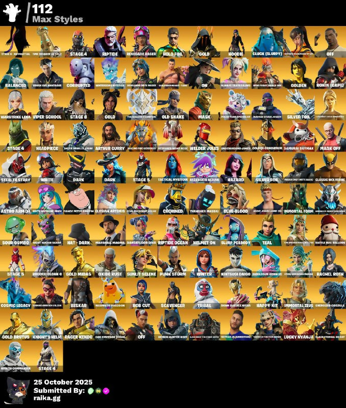 Aang, Agent Jones (Gumbo 59), Agent Patch, Agent Peely, Always Fantabulous, Aphrodite, Arctic Adeline, Art The Clown, Arthur Curry, Ascension Nezumi, Assault Trooper, Astro Antidote, Astro Armor, Astro Jack, Astroworld Cyclone, Augury, Avatar State Aang, Axehammer, Backlash, Balanced, Basic Basher, Battle Bus Balloon, Battle Gamer Mai, Battle Matesune Miku, Beskar, Bhangra Boogie, Birdie, Black Eternal Knight, Blazing Fire Curious, Blue-Blood, Bob Cut, Bones, Bracer, Breezabelle, Bubblegum Highwire, Budge, Bullseye, Bunker Jonesy, Bunny Brawler, Burnout, CCU President Elise, Cameo Vs Chic, Canterbury Overdanger, Capitana Colorada, Cassidy Quinn, Catalyst, Catwoman Zero, Centurion, Challenger Pennacle - Flame, Classic Wolverine, Clone Trooper, Cloud Striker, Cluck (Slurpy), Combat Tech Jules, Constructor, Corrupted, Cosma, Cosmic Legacy, Cozy Commander, Crowned, Crusher, Cursed Jack Sparrow, Dancefloor Diva, Danica, Dara, Dark, Darklands The Reaper, Dawn Duelist Nisha, Demi, Demon Hunter Hope, Desert Dawn Lyric, Diamond Diva, Dino Megazord, Disco Baller, Distraction Dance, Dream, Durr Taisho, Dusty, Eclipse, Elevation, Elysian Artemis, Ember, Energized Godzilla, Eren Jaeger, Eternal Voyager, Exo Stranger, Explorer Emilie, Fade, Fancy Peter Griffin, Fancy Petite Officer, Fate, Fishstick, Focus, Founder's Glider, Founder's Umbrella, Fresh Aura, Frost Squad, Fusion, Galaxia, Ghoul Trooper, Gildhart, God Emperor Doomguy, Gold, Gold Brutus, Gold Midas, Golden, Golden Conqueror, Green Arrow, Green Ranger, Gunnar, Hana Park, Happy Kit, Hard Charger, Harlowe, Haruka Of The Masses, Hat - Dark, Haven, Hazard, Haze, Head Banger, Headpiece, Heartbreaker Ranger, Helmet On, Himiko Toga, Holiday Boxy, Holo Foil, Hoodie, Hope, Human Bill, Hunter Chief (Matte Black), Huntergorn Mystic, Huntmaster Saber, Hydraulic Wrecker, I Sits, Imani, Immortal Form, Immortal Zeus, Iris, It's A Vibe, Jack Sparrow, Jackie, Jaeger, Jennifer Walters, Jing, Joss, Joy, Kintsgui Daigo, Kintsugi Daigo, Knight's Helm, Knights Helm, Kondor, Krisabelle, Kymera, LBC '93 Dogg, Laser Pick, Lastlight Polo Mens, Laugh It Up, Leviathan, Lorenzo, Lt. Evergreen, Lt. John Llama, Lt. Ripp Slade, Lucky Nyanja, Lucky Rider, Made Rises to the Power Armor, Magmatic Poseidon, Mancake, Mariposa, Marshal Magna, Marshall Magna, Marshmello, Mask, Mask Off, Masked Scuba Jonesy, Master Chief (Matte Black), Meowsicles, Michonne, Mina Park, Minty Bomber, Mr. Dappermint, Murdoc, Nanner Ringer, Newman (Exshtrudo), Night Howler Scarr, Nitro Fusion Remix Dxm, Nog Ops, Off, Ol' Woody, Old Snake, Omen, Omen Hunter Calamity, On, Onyx Winter, Outlander, Oxide Rust, Paradise Micscles, Peely, Pig The Butcher, Plankerton Endurance Banner, Plastic Patroller, Point It Out, Polar Peely, Polartum Specialist, Power Punk, Predator, Psycho Bandit, Punk Storm, Puppet Master James, Puppet Master Kirk, Puppet Master Lars, Puppet Master Porky, Racer Kendo, Rachel Roth, Rage, Rap Boy, Rapscallion, Raven Team Syd, Raz, Reaper, Rebel Oro, Recon Raptor, Red Roots Billie, Redline Racer, Reese, Relik, Remedy Vs Toxin, Renegade Racer, Restored Night Rose, Reverie, Rian, Riftbreaker Drift, Rippley Vs Sludge, Riptide, Riptide Ocean, Rl Gg, Rococo Cloak-O, Ronin (Cape), Rose Team Leader, Rough Cut Montague, Ruby Shadows, Ruin, Runway Racer, Russel, Sagan, Samurai Baymax, Santa Dogg, Scavenger, Sedona, Seeker, Sgt. Drake, Shock Trawler Oscar, Silver Foil, Sing Along, Singularity, Siona, Skellemint Oro, Skull, Skye, Slayed Juice World, Sled Ready Guft, Slim Shady, Slurp Peabody, Snoop Dogg, Snowmando, Soldier, Sorry, I can't extract the skin names from this image., Sour Gumbo, Spider-Man, Spire Assassin, Spirit Hunter Saeko, Stage 4, Stage 4 - No Ponytail, Stage 5, Stage 8, Stealth Stray, Steel Wool, Storm Sorceress Missils, Stratus, Styx, Sunflower, Sunlit Selene, Sunny, Sunset Alto, Tabasa (E Thotson Mank), Tactical Mystique, Take The Elf, Tart Tycoon, Teal, Tech Axe, Tegan, Tendrils, Tex Flamingo, The Aeolian Champion, The Breaker Brotherhoodyte, The Machinist, The Scientist, The Weekend Combat, Thrasher Massai, Thunder, Tide Strider, Time Breaker En Spy, Tntina, Tov Trooper, Trace, Tribal, Tsuki 2.0, UNSC Spartan, Ultima Knight, Underground Dissdemona, Underground Jones, Verge, Verve, Vindertech Elite, Viper School, Volpez, Von Da 3000, Voo-Mi, Vulejacket, War Wolf Dire, Warpaint, Warstrike Leka, Warstrike Lexa, Welder Jules, Whistle Warrior, White, Winter, Wooly Warrior, World Cup 2019 Banner, Wraith Commander, Yellowjacket, Zombie Shambles, Zorgoton