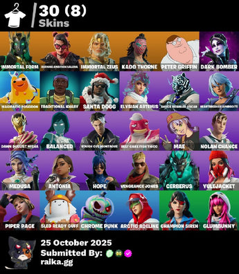 [PC/PSN/XBOX] 30 skins | Immortal Form | Burning Ambition Valeria | Immortal Zeus | Kado Thorne | Peter Griffin | Dark Bomber | Magmatic Poseidon | 450 VB #a74