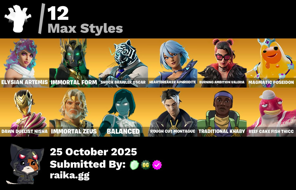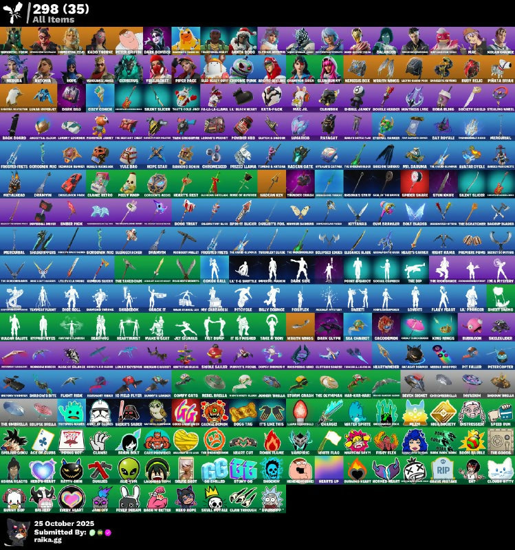 Alien, Ancient Bloom, Animat-Chauss, Anorexy, Antonia, Arche, Arctic Adeline, Avatar Cycle, Awakens Griffin, Back Board, Backup Blades, Badiddy-Janky, Balanced, Ballsy, Battle-Queen, Bay Royale, Billy Bounce, Black N Teeths, Blade Foxes, Boaia, Bone Shard, Bonnie Blue, Brillianta, Bubbleon, Bunny Sup, Burning Ambition Valeria, Burning Heart, Bustier, Cacodemon, Cadillac Scorpion, Care Provider, Celebrity Rock, Cerberus, Champion Siren, Charge, Chickkenrolla, Chrome Punk, Chrome Seed, Ci-Bi, Claude Retro, Cloud Kid, Clutch & Dagger, Complex Stages, Conga Call, Crack It, Cross, Dami Oops, Dark Bomber, Dark Glyph, Dark Side, Darkside Robot, Dawn Duelist Nisha, Demi, Diamond Thorne, Dodgy Treat, Dogs Tag, Dollars, Doom Flame, Double-Leader, Draxyn, Dreamin, Dreaming, Duelist’s Foil, Dune Roll, Eclipse Skull, Eclipsed Gloves, Egg of the Spear, Elegance Blade, Elena Secret, Elysian Artemis, Ember Pick, Enesblack Rag, Fast Dump, Fire Drragon, Flaky Feasy, Flight Pipe, Fodder, Four-Play, Foxxie, Frontier-Jonny, Frosted Feets, Funk Dream, GBBGG, Girl, Glammore, Glitch Technology, Glumbunny, Goom-Camera, Gorgon Mic, Gorham Mocis, Gravy Mataka, Guggly Lambas, Guggly Squid, Har-Har-Har!, Healer’s Working Out, Heart City, Heartbeat, Heartbreaker Aphrodite, Heartburst, Hearts Up, Heart’s Carver, Heart’s Rest, Higknowlt Pistol, Hope, Hope Star, Horror Heart, Hot Bolt, Human Spear, I'm a Mystery, IQ Pan Player, Ice-Cream, Iceblock Betty, Immortal Form, Immortal Zeus, Invasion, It Is Finished, I’m Like This, Jagden Kev, Joint Signals, Jume, Jungle Boots, Kado Thorne, Kats-cap, Kawa Reaches, Kelly King-Boots, Kendall Veers, King Wings, Kingpin’s Crown, Knife, LG-8 Shuttle, Laura Weptard, Legend’s Promise, Liberty Lockbox, Lil John, Lil Ryder-Miller, Lil’ Pancris, Lolth, Love Eart, Lovvett, Luna Rigs, Madean Gate, Mae, Magmatic Poseidon, Make-Up, Maker & Ghost, Mando Trogue, Mandolorian, Matrix Wings, Medusa, Mercurial, Mermichal, Metalhead, Moon Factory, Mr. Daruma, My Challenger, Neko Rope, Nettana, New Skintone, Night Kama, Nolan Chance, Nutcruck’s Life, Omega, Pelly Veep, Peter Griffin, Phanta Brian, Piper Pace, Pity Cycle, Point of Shoot, Powder Bag, Premieres Fangs, Prezzy Llama, Pyro Knight, Quick-T, Quin Brawler, Ragnarok, Raider, Ranking Robin, Raskarr’s Staff, Rat-Cat, Reef Cake Fish Thicc, Reese, Ricklos, Roly Blades, Rough Cut Montague, Ruby Red, Ryean, Safe Shot, Sanguine, Santa Dogg, Santa Droids, Sassy Flies, Scout, Sea Chariot, Secret Scythe, Security Keysets, Sedona Hawke, Shadepiper, Shadow, Shadow Guard, Shadow Sniper, Shadow Wella, Shivleti, Shock Brawler Oscar, Shooty Crash, Silent Slicer, Skelleglider, Skull Royale, Sled Ready Guff, Sledgecracker, Smocker, Sonic Battle Fangs, Sparkplug, Spear Shark, Spirit Dancer, Star Jack, Stealing Medall, Story OG, Stun Knife, Sunny’s Legacy, Sushi, Swift String, Swiggotch, THE MJWanah, Take It Town, Teknique, Tempest Flight, That’s Cool Joe, The Dip, The Hound’s Claw, The Mystery Order, The Rockgame, The Scratcher, The Takedown, The Umbrella, Thunder Dragon, Tomorrow Waves, Tookan, Topino & Kaka, Traditional Khabv, Traditional Khaby, Travis Scott, Twilight Glove, Two-Face, Vader’s Saber, Vampire, Vengeance Jones, Vibes, Vulcan Salute, Water Sprite, White Flag, Yuba Crew or You Crew, Yule Bag, Yule Jacket
