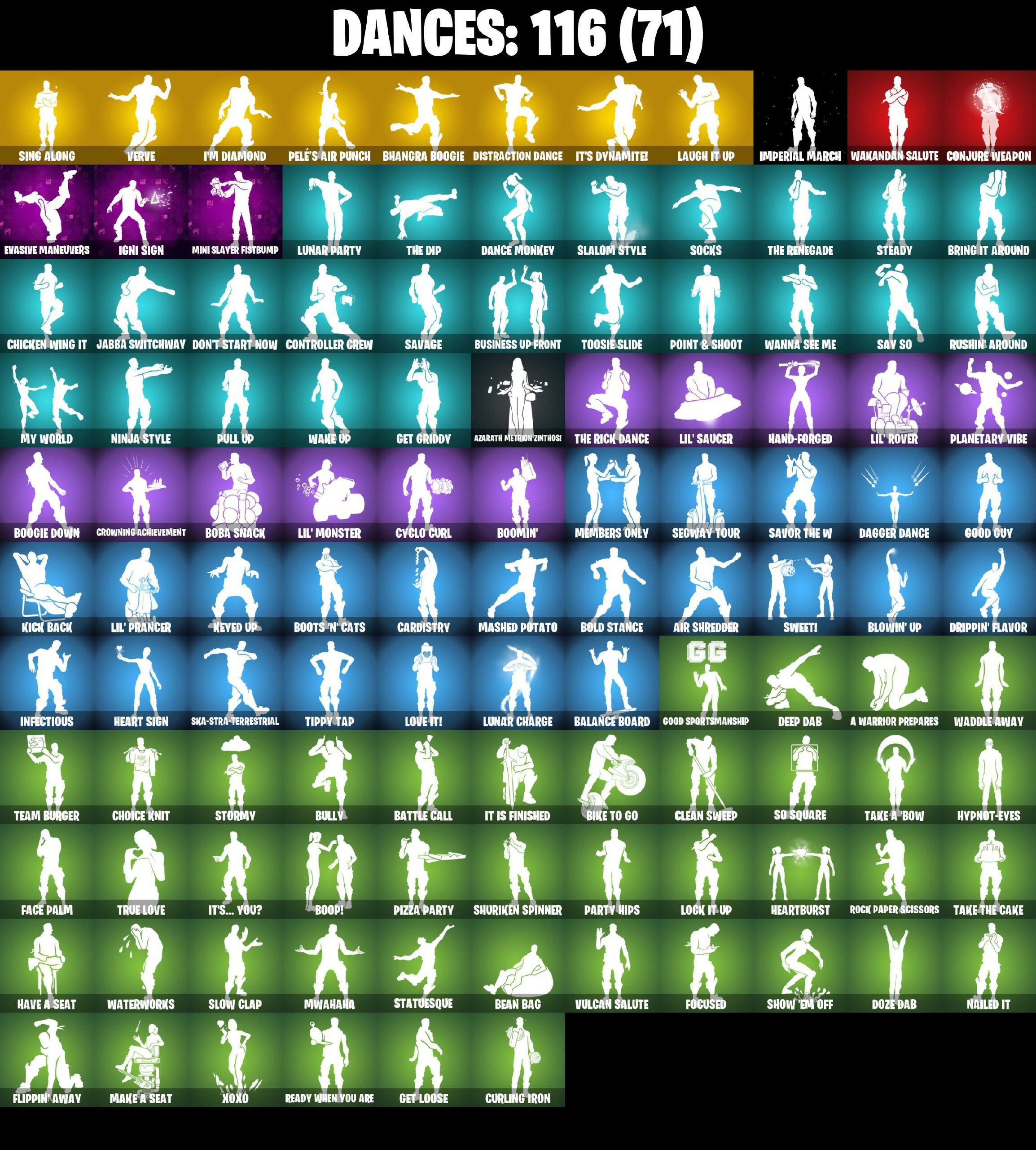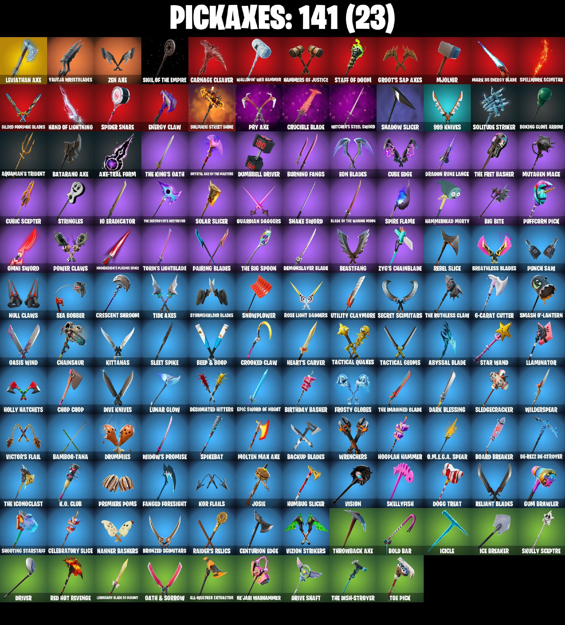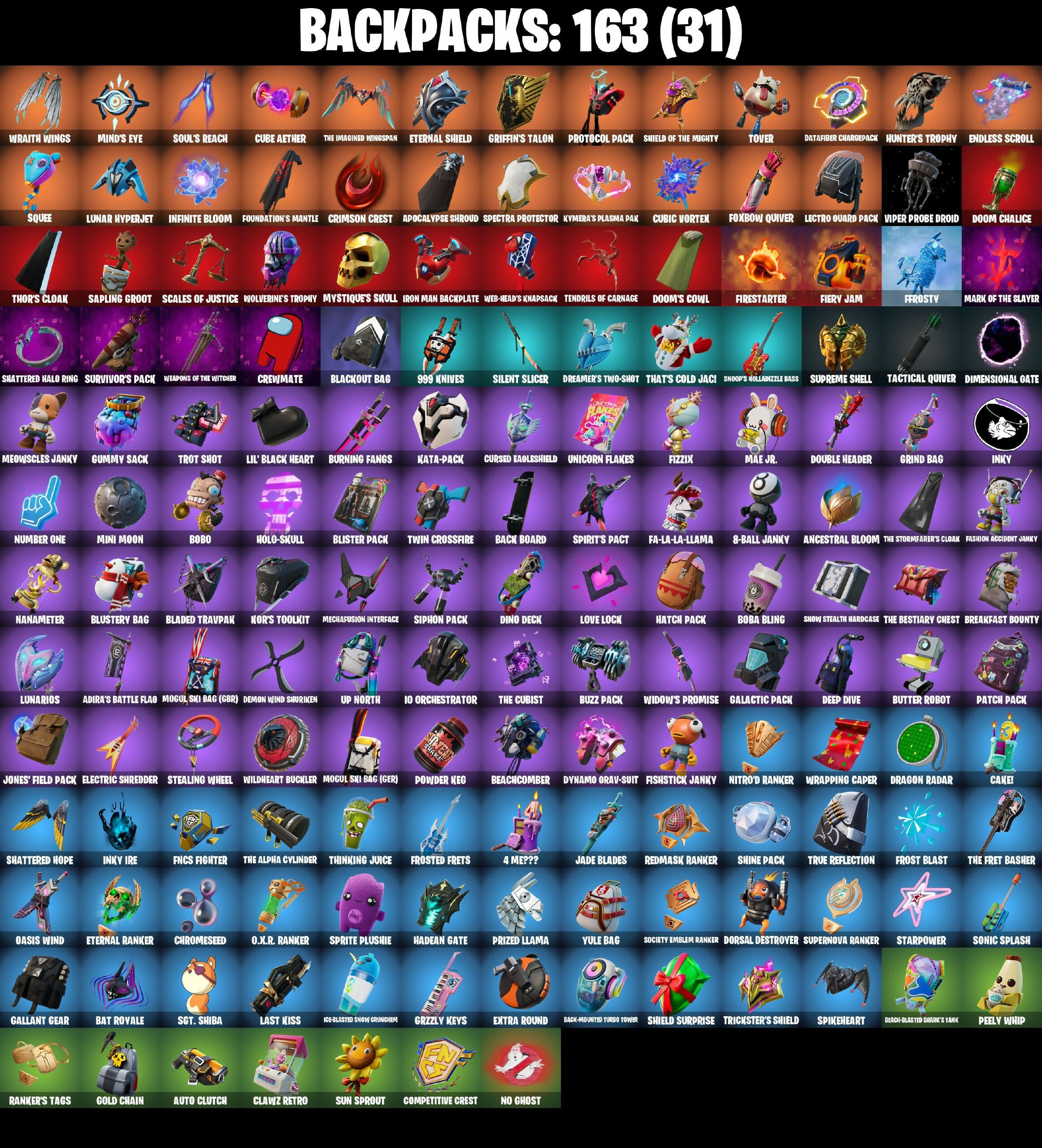 4 Me???, 6-Carat Cutter, 8-Ball Janky, 999 Knives, A Warrior Prepares, AbseNz, Abyssal Blade, Adira, Adira's Battle Flag, Agent Jones, Agent Jones (Jump 31), Air Shredder, All-Weather Extractor, Alli, Ancestral Bloom, Apocalypse Shroud, Aquaman, Aquaman's Trident, Arcane Energy Glider, Arctic Adeline, Arthur Curry, Articulated Blade Wing, Astro Armor, Aura, Auto Clutch, Axe-tral Form, Azarath Metron Zinthos!, Back Board, Back-Mounted Turbo Tower, Backup Blades, Balance Board, Bamboo-Tana, Band Pass, Bat Royale, Batarang Axe, Battle Bloom, Battle Call, Beach-Blasted Shark's Tank, Beachcomber, Bean Bag, Beastfang, Beep & Boop, Beskar, Beskar Umbrella, Bhangra Boogie, Big Bite, Bike To Go, Birthday Basher, Black Eternal Knight, Blackout Bag, Blade Of The Waning Moon, Blade Raven, Bladed Travpak, Blaze, Blister Pack, Blizzabelle, Blowin' Up, Blustery Bag, Board Breaker, Boba Bling, Boba Snack, Bobo, Bold Bar, Bold Stance, Bone Patrol, Boogie Down, Boomin', Boop!, Boots 'N' Cats, Bounty 'Brella, Boxing Glove Arrow, Breakfast Bounty, Breathless Blades, Brella, Bring It Around, Bronzed Scimitars, Bubbloon, Bully, Burning Fangs, Business Up Front, Butter Robot, Buzz Pack, Cacodemon, Cake!, Cardistry, Carnage, Carnage Cleaver, Celebratory Slice, Centurion, Centurion Edge, Chain Surfer, Chainsaur, Challenor Menace - Flame, Chaos Origins, Charlotte, Chicken Wing It, Choice Knit, Chop Chop, Chop Dropper, Chrome Cloudcruiser, Chrome Punk, Chromebrella, Chromeseed, Classic Wolverine, Clawz Retro, Clean Sweep, Cluck, Cluck (Slurpy), Color Crush, Combat Elite, Comet Crasher, Comfy Cats, Competitive Crest, Competitor's Time Brella, Conjure Weapon, Contract Giller, Controller Crew, Convergence, Coral Cruiser, Crescent Shroom, Crewmate, Crimson Crest, Crimson Wish, Crooked Claw, Crowning Achievement, Crucible Blade, Crystal Axe Of The Masters, Cube Aether, Cube Assassin, Cube Cruiser, Cube Edge, Cubic Scepter, Cubic Vortex, Cuddly Cloudcruiser, Curling Iron, Cursed Eagleshield, Cyclo Curl, D'ark, Dagger Dance, Dance Monkey, Dark Blessing, Dark Symbiote, Darth Vader, Datafiber Chargepack, De-Rezz Destroyer, Deep Dab, Deep Dive, Demon Wind Shuriken, Demonslayer Blade, Designated Hitters, Diamond Diva, Dimensional Gate, Dino Deck, Distraction Dance, Dive Knives, Dizzie, Doctor Doom, Doctor Slone, Doctor Slone (Prismatic), Dogg Treat, Don't Start Now, Doom Chalice, Doom Slayer, Doom's Cowl, Dorsal Destroyer, Double Header, Doze Dab, Dragon Radar, Dragon Rider, Dragon Rune Lance, Dreamer's Two-Shot, Drippin' Flavor, Drive Shaft, Driver, Droopy, Drummies, Dumbbell Driver, Dusty, Dynamo Dancer, Dynamo Grav-Suit, Eagle's Form, Echo, Eclipse Brella, Eggar, Electric Shredder, Enchanted Lifebloom, Endless Scroll, Energy Claw, Eon Blades, Epic Sword Of Might, Erisa, Eternal Knight, Eternal Ranker, Eternal Shield, Evasive Maneuvers, Evie, Extra Round, FNCS Fighter, Fa-La-La-Llama, Fabio Sparzalemane, Face Palm, Fade, Fanged Foresight, Fashion Accident Janky, Ffrosty, Fiery Descent, Fiery Jam, Firestarter, Fishstick Janky, Fishy Flier, Fizzix, Flair Fare, Flapjack Flyer, Flavor-Dusted Sparklewings, Flip Flyer, Flippin' Away, Focused, Fortilla Flier, Foundation's Mantle, Foundation's Plasma Spike, Foundational 'Brella, Foxbow Quiver, Frost Blast, Frost Squad, Frostburn, Frosted Frets, Frosty Globes, Galactic Pack, Gallant Gear, Gathering Storm, Geralt Of Rivia, Get Griddy, Get Loose, Gilded Morphic Blades, Gilded Reality, God Emperor Doom, Gold Chain, Golden Look Board, Golden Rune Charlotte, Golden Rune Fabio, Good Guy, Good Sportsmanship, Green Arrow, Griffin's Talon, Grimoire, Grind Bag, Grizzly Keys, Groot, Groot's Sap Axes, Guardian Daggers, Guff Gringle, Guggimon, Guggimon (Prismatic), Gum Brawler, Gumbo, Gummy Sack, Gunn-'Brella, Gunnar, Hadean Gate, Hammerhead Morty, Hammers Of Justice, Hand Of Lightning, Hand-Forged, Happy Kit, Har-Har-Har!, Harlowe, Hatch Pack, Have A Seat, Haven, Headpiece, Heart Sign, Heart's Carver, Heartburst, Helmet, Helsie, Heron Stance Hero, Holly Hatchets, Holo Foil, Holo-Skull, Hooplah Hammer, Humbug Slicer, Hunter's Skyblade, Hunter's Trophy, Hyperboard, Hypnot-Eyes, I'm Diamond, IO Eradicator, IO Field Flyer, IO Orchestrator, IO Stealth Sail, Ice Breaker, Ice-Blasted Snow Cruncher, Icicle, Igni Sign, Imperial March, Infectious, Infield Fly, Infinite Bloom, Inflate-A-Roach, Inky, Inky Ire, Invasion, Iron Man Backplate, It Is Finished, It's Dynamite!, It's... You?, J.B. Chimpanski, Jabba Switchway, Jade Blades, Jennifer Walters, Jingle Wing, Joey, Jolly Jammer, Jones' Field Pack, Josie, Jules, K.O. Club, K.O. Cruiser, Kal-El's Cape, Kata Tech Burstwing, Kata-Pack, Keyed Up, Kiara K.O., Kick Back, Kit, Kittanas, Kondor, Kor, Kor Flails, Krisabelle, Kurama, Kymera, Kymera's Plasma Pak, Lambda-Class Shuttle, Lara Croft, Last Kiss, Laugh It Up, Lectro Guard Pack, Legendary Blade Of Insight, Leviathan Axe, Lexa, Lil' Black Heart, Lil' Monster, Lil' Prancer, Lil' Rover, Lil' Saucer, Llambro, Llaminator, Lock It Up, Love It!, Love Lock, Lt. John Llama, Lunar Charge, Lunar Glow, Lunar Hyperjet, Lunar Party, Lunar Skyspan, Lunarios, Mae Jr., Make A Seat, Malik, Mancake, Mandala Disc, Mandalorian, Manic, Mark 85 Energy Blade, Mark 90 Flight Pack, Mark Of The Slayer, Mashed Potato, Masked Scuba Jonesy, Massai, Mave, Maximum Carnage, Mechafusion Interface, Members Only, Menace, Meowscles Janky, Mighty Marvel 'Brella, Min-Joon, Mina Park, Mind's Eye, Mini Moon, Mini Slayer Fistbump, Mjolnir, Mjolnir's Path, Mogul Master (GBR), Mogul Master (GER), Mogul Ski Bag (GBR), Mogul Ski Bag (GER), Molten Max Axe, Moonglide, Mutagen Mace, Mwahaha, My World, Mystique, Mystique's Skull, Nailed It, Nanameter, Nanner Bashers, Ne'Jari Warhammer, Nezumi, Ninja Style, Nitro'd Ranker, No Ghost, Nor's Toolkit, Null Claws, Number One, O.M.E.G.A. Spear, O.X.R. 'Brella, O.X.R. Ranker, Oasis Wind, Oath & Sorrow, Ocean, Off, Ohm, Omni Sword, On, Oopsy Drones-V, Pairing Blades, Panda Parade, Party Hips, Patch Pack, Peely Wh