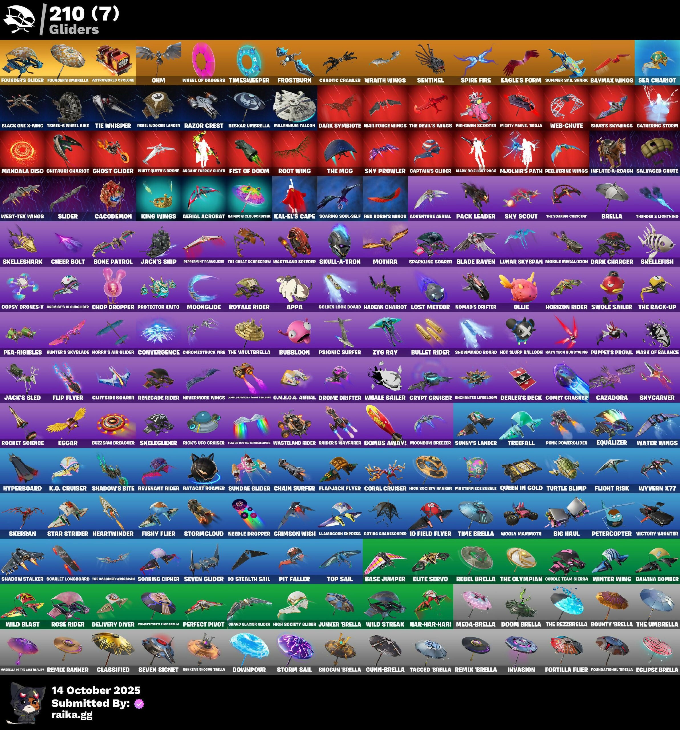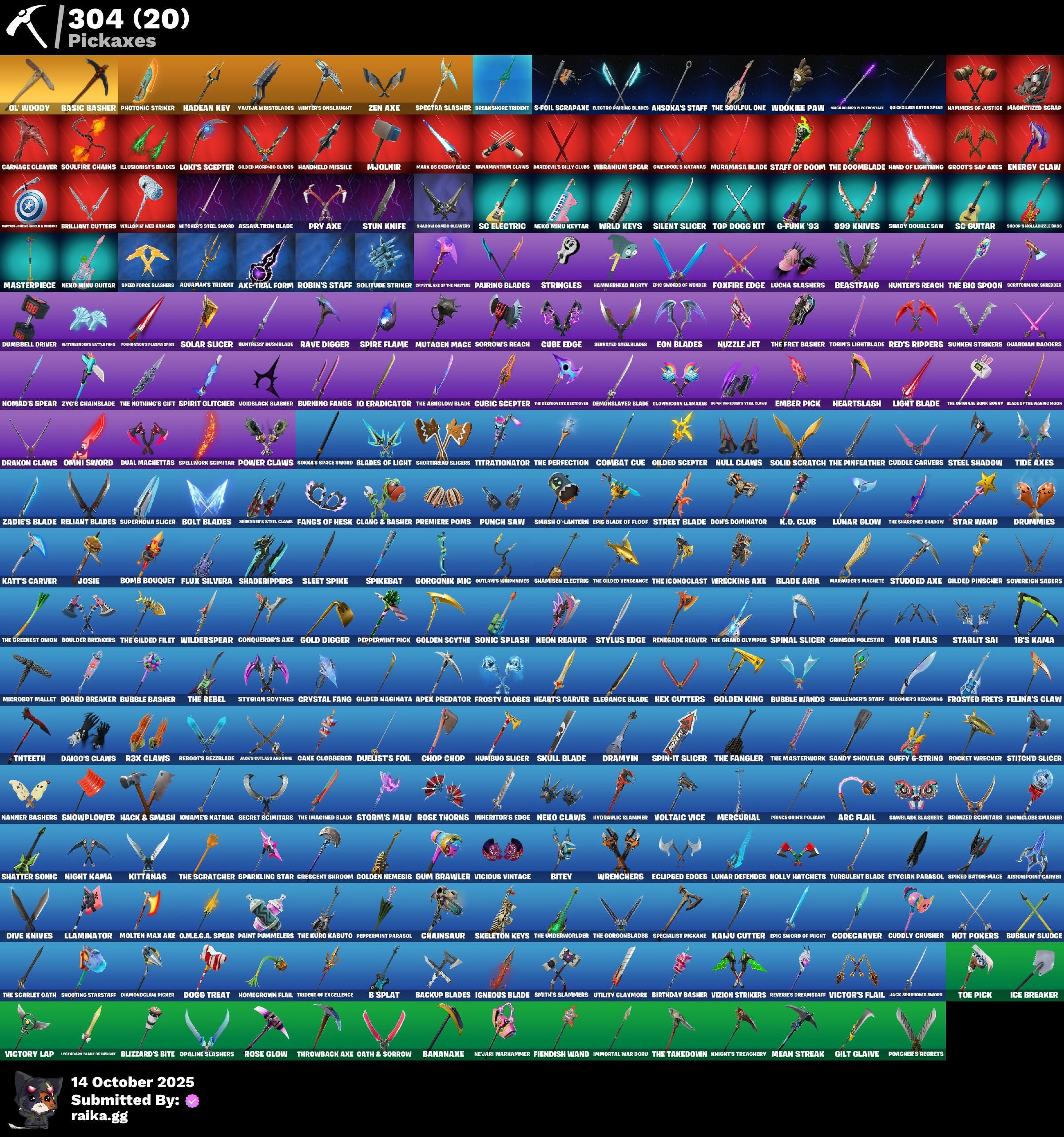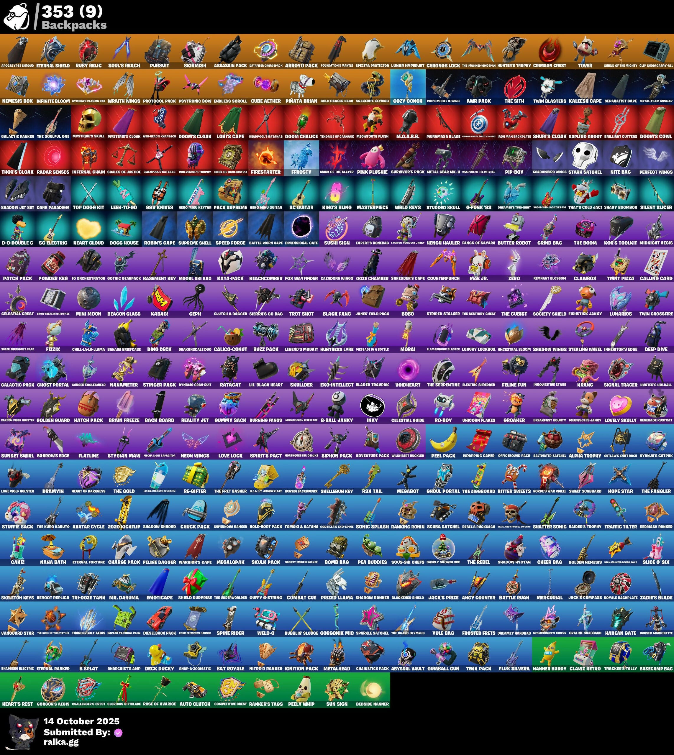 (SN1FT!), 1-Ball, 10 Orchestrator, 18's Kamas, 2.0’s Revenge, 2020 Kickflip, 8-Ball, 8-Ball Janky, 999, 999 Knives, A Warrior Prepares, A.L.T.E.R., AWR Pack, Abduction, Abyssal Vault, Ace Pilot Poe, Acolyte’s Curse, Ad Victoriam!, Adventure Aerial, Adventure Pack, Aerial, Aerial Acrobat, Aerial Assault Bomber, Aerial Assault Captain, Aerial Classic, Aerial Swagger, Afk, Aftermath, Afterparty, Agent Jones, Agent Jones (Jump 31), Agent Nana, Agent Peely, Ahsoka Tano, Ahsoka's Staff, Air Shredder, All-Nighter, Alpha Altimeter, Alpha Trophy, Amazing Cube, Anarchist's Amp, Ancestral Bloom, Andy Fangson, Angry Counter, Antonia, Antonia in Action, Apex Predator, Aphrodite, Apocalypse Shroud, Appa, Apprentice Evie, Aquaman, Aquaman's Trident, Arc Flail, Arcade Cat, Arcane Energy Glider, Arcane Steel, Arctic Achiever, Ares, Ares (Cosmic Legacy), Armored Victory, Array, Arrowpoint Carver, Arroyo Pack, Artemis, Artemis Insignia, Arthur Curry, Assassin Pack, Assassin’s Mark, Assault Tron Blade, Astrea, Astro Jack, Astroworld Cyclone, Auto Clutch, Avatar Cycle, Avatar's Flourish, Aw, Shucks., Axe-Tral Form, Ayla Winn, Azarath Metrion Zinthos!, B Splat, B.E.A.S.T. Armorpilate, B.E.A.S.T. Glove, B.R.U.T.E. Competitor, Babygirl!!!, Back Board, Backup Blades, Balance Board, Balanced, Banana Bomber, Banana Briefcase, Bananaxe, Base Jumper, Basecamp Bag, Basement Key, Basic Basher, Bat Royale, Batman Zero, Battle Ball, Battle Blessing, Battle Mode, Battle Prep, Battle Prep: Super, Battle Ready Era, Battle Ready Poe, Battle Ruan, Battle-Worn Cape, Bawk Off, Baymax Wings, Beach Brutus, Beachcomber, Beacon Glass, Beamers, Bean Bag, Bear Hug, Beastfang, Beatzbunny, Bedside Nanner, Beef Blade, Beep Beep, Berserker Barrage, Beskar Umbrella, Big Guns, Big Haul, Big Smooch, Billy Bounce, Birdarang Flourish, Birthday Basher, Birthday Bud, Birthday Dash, Bitev, Bitter Sweets, Black, Black Fang, Black Hole, Black Knight T-60 Power Armor, Black Leader, Black One X-Wing, Black Panther (Shuri), Black Queen, Blackened Shield, Blade Aria, Blade Raven, Bladed Travpak, Blades of Light, Blasted, Blaze, Blazing Fire Cerberus, Blinding Lights, Blinky, Blizzard's Bite, Blocko, Blowin' Up, Blue Cyclo, Board Breaker, Bobo, Bolt Blades, Bomb Bag, Bomb Bouquet, Bombastic Winterfest, Bombs Away!, Bone Breaker, Bone Patrol, Bones, Boogie Down, Book Of Cagliostro, Boomin', Boommerjumper's Trophy, Boots N' Cats, Both Eyes Open, Boulder Breakers, Bouncer, Bounty 'Brella, Bow Go, Brain Freeze, Breakfast's Bounty, Breakshore Trident, Breezabelle, Brella, Brilliant Cutters, Bring It, Brite & Speedy, Brite Hatsune Miku, Brite Moves, Brite Raider, Bronzed Scimitars, Bruno's Blue Heart, Brutus, Bubble Basher, Bubble Wands, Bubblin' Sludge, Bubbling Sludge, Bubbloon, Buffer Fish, Bullet Rider, Bunny Hop, Bunny of the Meaning Hour, Bunsen Backburner, Burning Ambition Valeria, Burning Dragon, Burning Fangs, Burning UFO, Bushie Bright, Busy, Butter Robot, Buzz Pack, Buzzsaw Breacher, By The Horns, Bytes, Bytes (Lone Traveler), Bytes' Sigil, Cacodemon, Cake Clobberer, Cake!, Cakey, Calico, Calico Holiday, Calico-Conut, Call Me, Calling Card, Camo War Machine, Cap Kick, Captain Blamerica, Captain Jones, Captain Jones (Pen & Ink), Captain Phasma, Captain's Glider, Carbon Fiser Holster, Carbon Scarlet, Card Drop, Cardistry, Carnage, Carnage (Maximum), Carnage Cleaver, Cash Grab, Cassidy Quinn, Cattitude, Cauldron Chill, Cazadora, Cazadora Wings, Celestial Crest, Celestial Guide, Ceph, Cerberus, Cerberus Bite, Cerberus Medallion, Chain Surfer, Chainsaur, Chainstick Pack, Chalked Up 1-Ball, Challenger Cerberus, Challenger's Crest, Challenger's Staff, Champion Kyra, Champion Siren, Chaos Agent, Chaos Directive, Chaos Director, Chaos Origins, Chaos Origins (Shadow), Chaotic Crawler, Charge Pack, Charlotte, Charlotte's Logo, Cheer Bag, Cheer Bolt, Chef's Special, Chemist's Cloudglider, Chibi, Chili-La-a-Llama, Chillshot, Chimichanga!, Chimp Fans Wants You, Chitauri Chariot, Choice Knit, Chomp Cudi!!, Choose Naughty, Chop Chop, Chop Dropper, Choppy, Chrome Marked, Chromestruck Fire, Chronos Lock, Chuck Pack, Chugga-Chugga, Clang & Basher, Clark Kent, Clash, Classic Age, Classic Peelveine, Classified, Clawbox, Clawz Retro, Clean Sweep, Cliffside Soarer, Clip Show Carry-All, Cloaked Shadow, Cloudburst, Cluck, Cluck (Slurpy), Clucking Mad, Clutch & Dagger, Codecarver, Coin Flip, Collector Kado Thorne, Combat Cue, Combat Giller, Comet, Comet Crasher, Competitive Crest, Competitor Medusa, Competitor's Time Brella, Conch Call, Confetti, Confident Iridia, Conjure Weapon, Conjuring Mysterio, Conqueror's Axe, Conqueror's Charge, Conqueror's Claim, Conqueror's Stare, Constructor, Contour Camo, Controlled Chaos, Convergence, Copper Wasp, Coral Cruiser, Coral Crush, Corrosive Stripe, Corrosive Tag, Cosmic Sun, Count It!, Counterpunch, Courageous Mikasa, Cowboy Chat, Cozy Conch, Crabby King, Crack It, Crashed Chiller, Crashed Shield, Crescent Shroom, Crimson Crest, Crimson Polestar, Crimson Wish, Crypt Cruiser, Crystal Fang, Cube Aether, Cube Assassin, Cube Edge, Cube Marking, Cubed, Cubic Scepter, Cuddle Carvers, Cuddle Mech, Cuddle Team Sierra, Cuddly Crusher, Cursed Eagleshield, Cursed Jack Sparrow, Cursed Marionette, Cyclo Curl, D-O-Double G, D.C. 63, Da Bomb, Dagger Dance, Dahlia, Daigo, Daigo's Claws, Daigo's Stance, Dali, Dali (Cosmic Legacy), Dance Therapy, Dancefloor Diva, Dancin' Domino, Daredevil, Daredevil's Billy Clubs, Dark Charger, Dark Gwenpool, Dark Paradigm, Dark Symbiote, Darklands Brite Raider, Databarf Chargpack, Datafiber Chargepack, Daughter of Troggon, Dawn Duelist Nisha, Deadpool, Deadpool Stilz, Hybrid (Cosmic Legacy), Deadpool Unmasked, Deadpool's Katanas, Dealer's Deck, Deck Ducky, Deep Dab, Deep Dive, Deep Future, Deimos, Delivery Diver, Demon Hunter Hope, Demons Beware, Demonslayer Blade, Denim Destiny, Destroyer Signature, Determined Kendo, Determined Korra, Determined Renegade, Diamond Throne, Diamondclaw Picker, Dice Roll, Die Wit