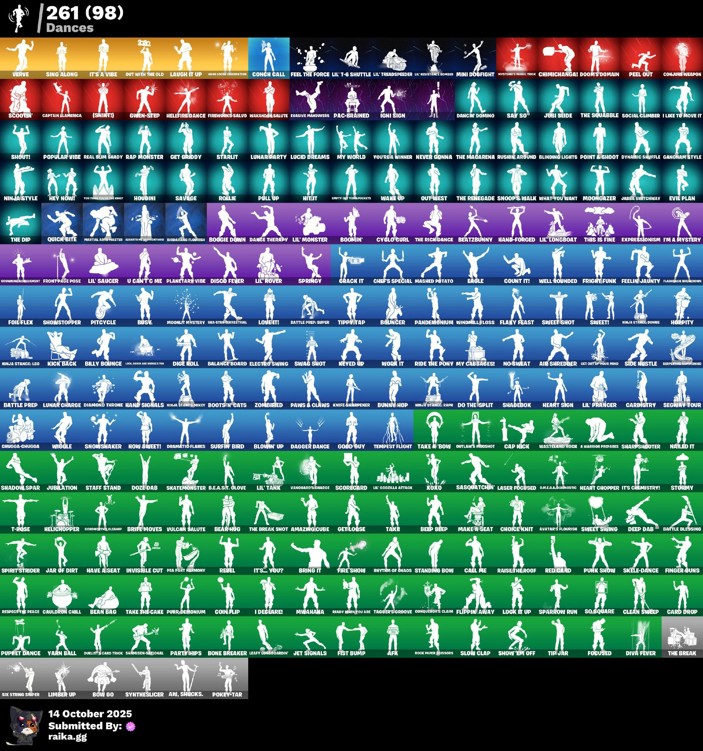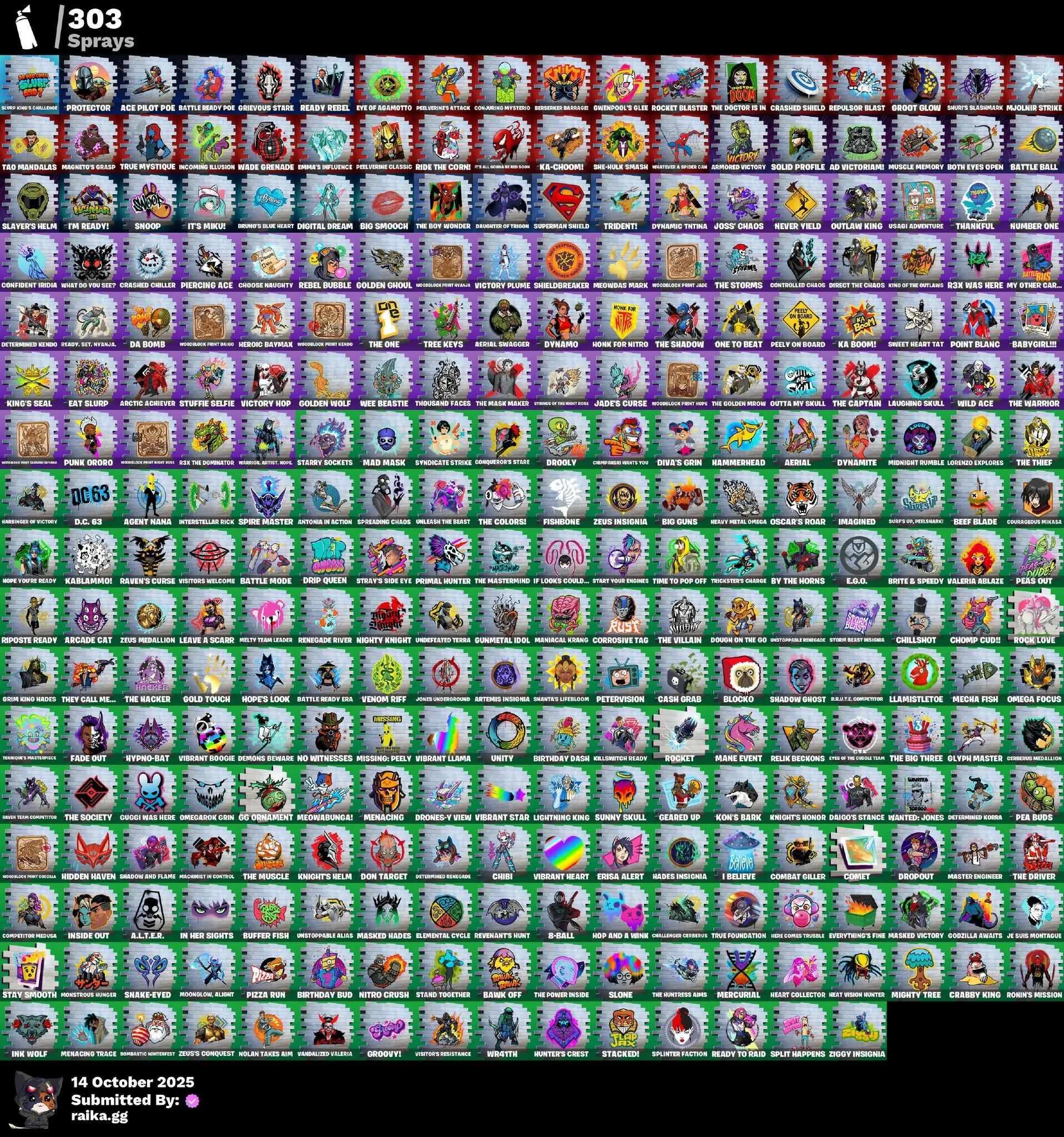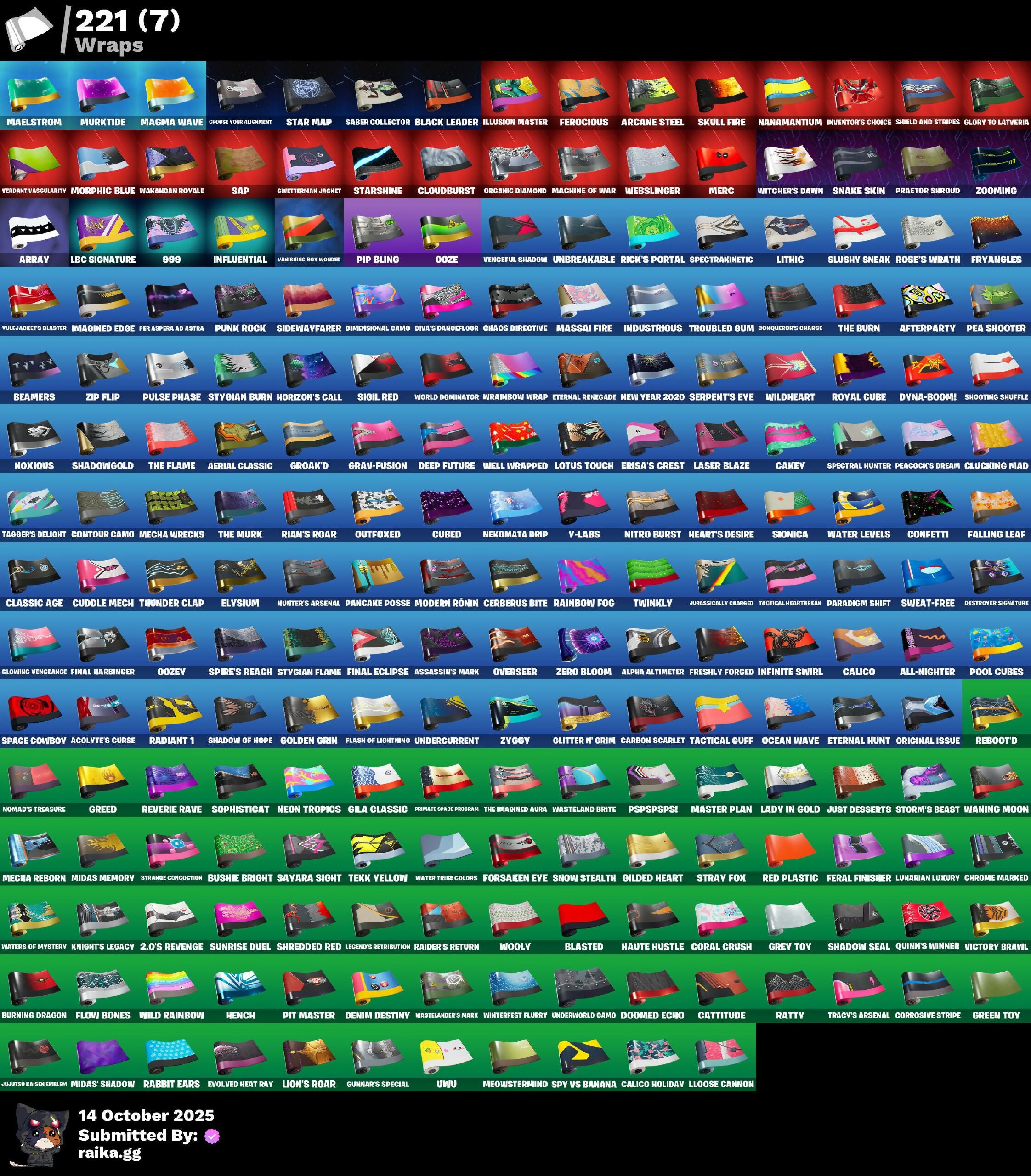 (SN1FT!), 1-Ball, 10 Orchestrator, 18's Kamas, 2.0’s Revenge, 2020 Kickflip, 8-Ball, 8-Ball Janky, 999, 999 Knives, A Warrior Prepares, A.L.T.E.R., AWR Pack, Abduction, Abyssal Vault, Ace Pilot Poe, Acolyte’s Curse, Ad Victoriam!, Adventure Aerial, Adventure Pack, Aerial, Aerial Acrobat, Aerial Assault Bomber, Aerial Assault Captain, Aerial Classic, Aerial Swagger, Afk, Aftermath, Afterparty, Agent Jones, Agent Jones (Jump 31), Agent Nana, Agent Peely, Ahsoka Tano, Ahsoka's Staff, Air Shredder, All-Nighter, Alpha Altimeter, Alpha Trophy, Amazing Cube, Anarchist's Amp, Ancestral Bloom, Andy Fangson, Angry Counter, Antonia, Antonia in Action, Apex Predator, Aphrodite, Apocalypse Shroud, Appa, Apprentice Evie, Aquaman, Aquaman's Trident, Arc Flail, Arcade Cat, Arcane Energy Glider, Arcane Steel, Arctic Achiever, Ares, Ares (Cosmic Legacy), Armored Victory, Array, Arrowpoint Carver, Arroyo Pack, Artemis, Artemis Insignia, Arthur Curry, Assassin Pack, Assassin’s Mark, Assault Tron Blade, Astrea, Astro Jack, Astroworld Cyclone, Auto Clutch, Avatar Cycle, Avatar's Flourish, Aw, Shucks., Axe-Tral Form, Ayla Winn, Azarath Metrion Zinthos!, B Splat, B.E.A.S.T. Armorpilate, B.E.A.S.T. Glove, B.R.U.T.E. Competitor, Babygirl!!!, Back Board, Backup Blades, Balance Board, Balanced, Banana Bomber, Banana Briefcase, Bananaxe, Base Jumper, Basecamp Bag, Basement Key, Basic Basher, Bat Royale, Batman Zero, Battle Ball, Battle Blessing, Battle Mode, Battle Prep, Battle Prep: Super, Battle Ready Era, Battle Ready Poe, Battle Ruan, Battle-Worn Cape, Bawk Off, Baymax Wings, Beach Brutus, Beachcomber, Beacon Glass, Beamers, Bean Bag, Bear Hug, Beastfang, Beatzbunny, Bedside Nanner, Beef Blade, Beep Beep, Berserker Barrage, Beskar Umbrella, Big Guns, Big Haul, Big Smooch, Billy Bounce, Birdarang Flourish, Birthday Basher, Birthday Bud, Birthday Dash, Bitev, Bitter Sweets, Black, Black Fang, Black Hole, Black Knight T-60 Power Armor, Black Leader, Black One X-Wing, Black Panther (Shuri), Black Queen, Blackened Shield, Blade Aria, Blade Raven, Bladed Travpak, Blades of Light, Blasted, Blaze, Blazing Fire Cerberus, Blinding Lights, Blinky, Blizzard's Bite, Blocko, Blowin' Up, Blue Cyclo, Board Breaker, Bobo, Bolt Blades, Bomb Bag, Bomb Bouquet, Bombastic Winterfest, Bombs Away!, Bone Breaker, Bone Patrol, Bones, Boogie Down, Book Of Cagliostro, Boomin', Boommerjumper's Trophy, Boots N' Cats, Both Eyes Open, Boulder Breakers, Bouncer, Bounty 'Brella, Bow Go, Brain Freeze, Breakfast's Bounty, Breakshore Trident, Breezabelle, Brella, Brilliant Cutters, Bring It, Brite & Speedy, Brite Hatsune Miku, Brite Moves, Brite Raider, Bronzed Scimitars, Bruno's Blue Heart, Brutus, Bubble Basher, Bubble Wands, Bubblin' Sludge, Bubbling Sludge, Bubbloon, Buffer Fish, Bullet Rider, Bunny Hop, Bunny of the Meaning Hour, Bunsen Backburner, Burning Ambition Valeria, Burning Dragon, Burning Fangs, Burning UFO, Bushie Bright, Busy, Butter Robot, Buzz Pack, Buzzsaw Breacher, By The Horns, Bytes, Bytes (Lone Traveler), Bytes' Sigil, Cacodemon, Cake Clobberer, Cake!, Cakey, Calico, Calico Holiday, Calico-Conut, Call Me, Calling Card, Camo War Machine, Cap Kick, Captain Blamerica, Captain Jones, Captain Jones (Pen & Ink), Captain Phasma, Captain's Glider, Carbon Fiser Holster, Carbon Scarlet, Card Drop, Cardistry, Carnage, Carnage (Maximum), Carnage Cleaver, Cash Grab, Cassidy Quinn, Cattitude, Cauldron Chill, Cazadora, Cazadora Wings, Celestial Crest, Celestial Guide, Ceph, Cerberus, Cerberus Bite, Cerberus Medallion, Chain Surfer, Chainsaur, Chainstick Pack, Chalked Up 1-Ball, Challenger Cerberus, Challenger's Crest, Challenger's Staff, Champion Kyra, Champion Siren, Chaos Agent, Chaos Directive, Chaos Director, Chaos Origins, Chaos Origins (Shadow), Chaotic Crawler, Charge Pack, Charlotte, Charlotte's Logo, Cheer Bag, Cheer Bolt, Chef's Special, Chemist's Cloudglider, Chibi, Chili-La-a-Llama, Chillshot, Chimichanga!, Chimp Fans Wants You, Chitauri Chariot, Choice Knit, Chomp Cudi!!, Choose Naughty, Chop Chop, Chop Dropper, Choppy, Chrome Marked, Chromestruck Fire, Chronos Lock, Chuck Pack, Chugga-Chugga, Clang & Basher, Clark Kent, Clash, Classic Age, Classic Peelveine, Classified, Clawbox, Clawz Retro, Clean Sweep, Cliffside Soarer, Clip Show Carry-All, Cloaked Shadow, Cloudburst, Cluck, Cluck (Slurpy), Clucking Mad, Clutch & Dagger, Codecarver, Coin Flip, Collector Kado Thorne, Combat Cue, Combat Giller, Comet, Comet Crasher, Competitive Crest, Competitor Medusa, Competitor's Time Brella, Conch Call, Confetti, Confident Iridia, Conjure Weapon, Conjuring Mysterio, Conqueror's Axe, Conqueror's Charge, Conqueror's Claim, Conqueror's Stare, Constructor, Contour Camo, Controlled Chaos, Convergence, Copper Wasp, Coral Cruiser, Coral Crush, Corrosive Stripe, Corrosive Tag, Cosmic Sun, Count It!, Counterpunch, Courageous Mikasa, Cowboy Chat, Cozy Conch, Crabby King, Crack It, Crashed Chiller, Crashed Shield, Crescent Shroom, Crimson Crest, Crimson Polestar, Crimson Wish, Crypt Cruiser, Crystal Fang, Cube Aether, Cube Assassin, Cube Edge, Cube Marking, Cubed, Cubic Scepter, Cuddle Carvers, Cuddle Mech, Cuddle Team Sierra, Cuddly Crusher, Cursed Eagleshield, Cursed Jack Sparrow, Cursed Marionette, Cyclo Curl, D-O-Double G, D.C. 63, Da Bomb, Dagger Dance, Dahlia, Daigo, Daigo's Claws, Daigo's Stance, Dali, Dali (Cosmic Legacy), Dance Therapy, Dancefloor Diva, Dancin' Domino, Daredevil, Daredevil's Billy Clubs, Dark Charger, Dark Gwenpool, Dark Paradigm, Dark Symbiote, Darklands Brite Raider, Databarf Chargpack, Datafiber Chargepack, Daughter of Troggon, Dawn Duelist Nisha, Deadpool, Deadpool Stilz, Hybrid (Cosmic Legacy), Deadpool Unmasked, Deadpool's Katanas, Dealer's Deck, Deck Ducky, Deep Dab, Deep Dive, Deep Future, Deimos, Delivery Diver, Demon Hunter Hope, Demons Beware, Demonslayer Blade, Denim Destiny, Destroyer Signature, Determined Kendo, Determined Korra, Determined Renegade, Diamond Throne, Diamondclaw Picker, Dice Roll, Die Wit