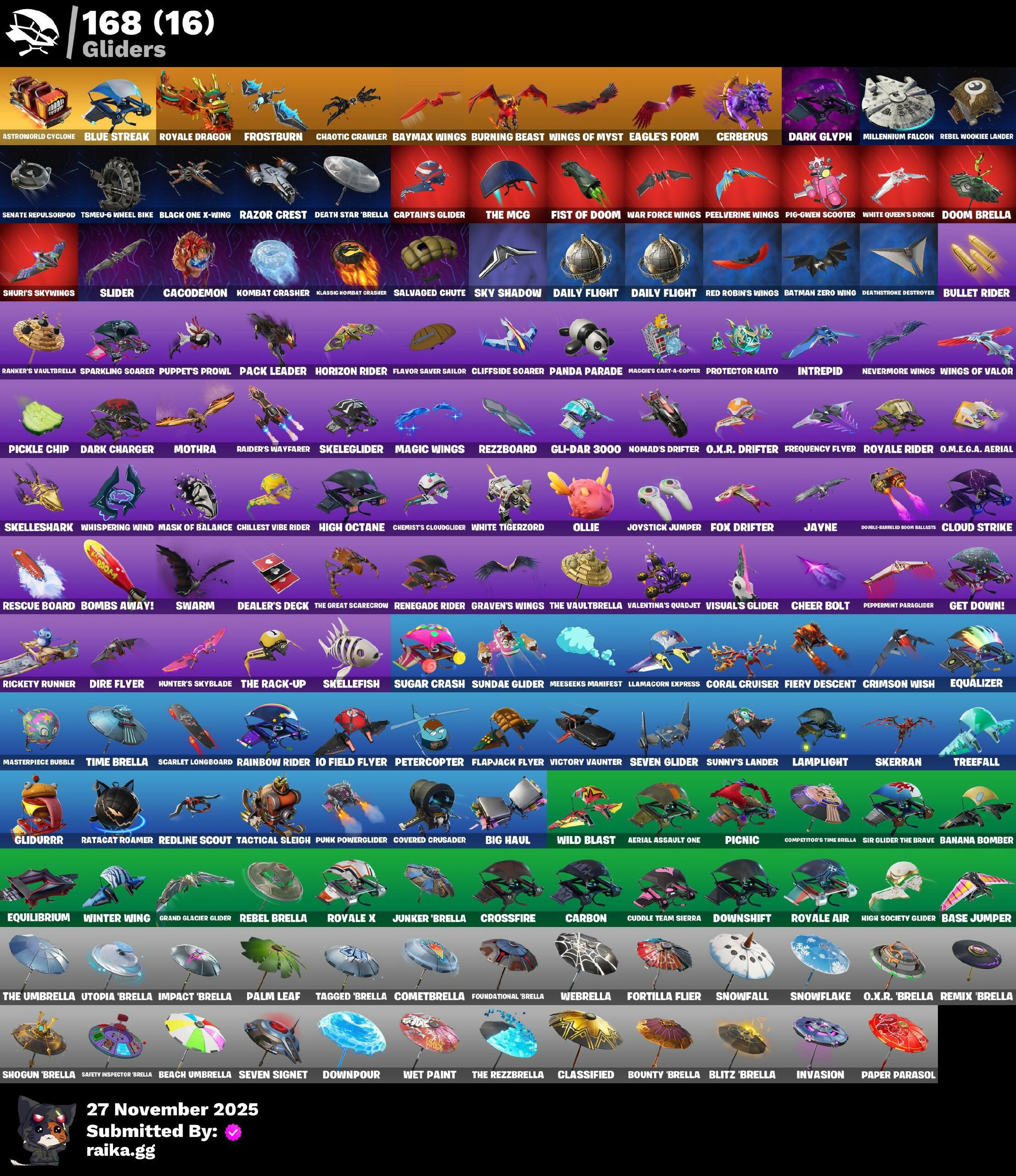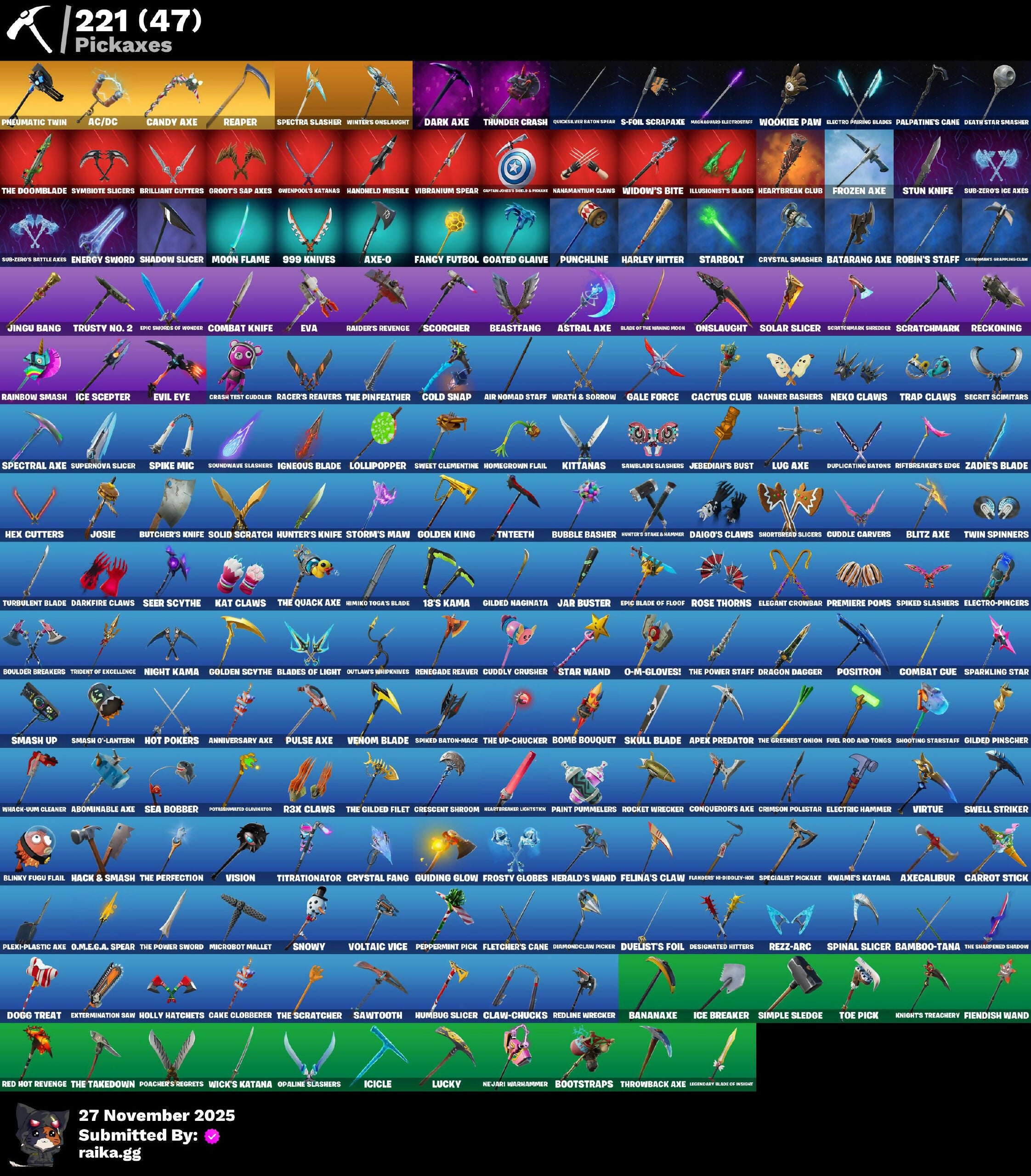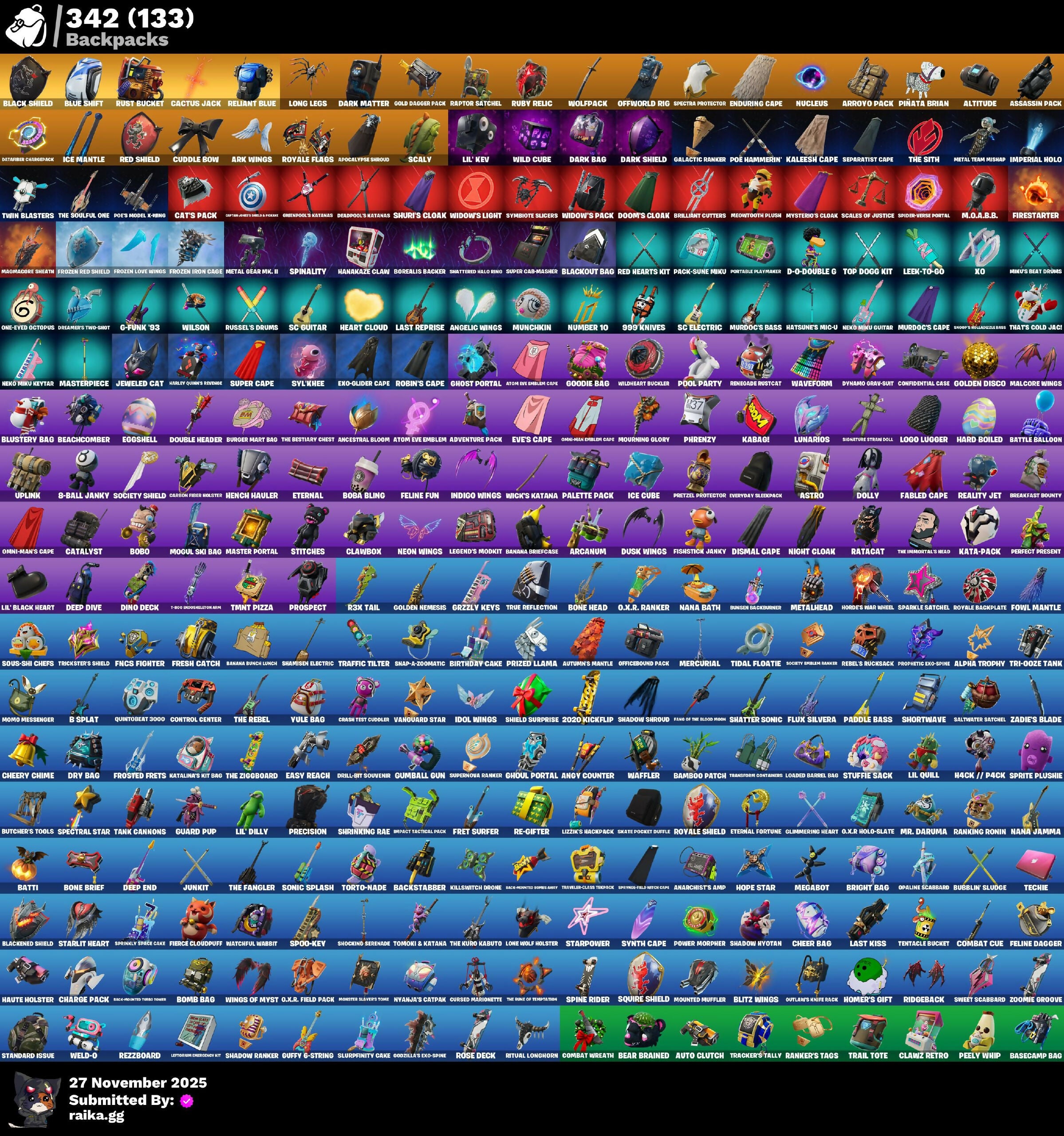 #1 Fan Llama, (Snip!), 1-Ball, 18's Kama, 2+2=4, 2020 Kickflip, 8-Ball Janky, 999 Knives, AC/DC, Aang, Abominable Axe, Ace Academic, Adventure Pack, Aerial Assault Bomber, Aerial Assault One, Aerial Assault Trooper, Afk, Agent Patch, Agent Peely, Agora Hills, Air Nomad Staff, All I Want For Christmas Is You, Alpha Trophy, Altitude, Anarchist’s Amp, Ancestral Bloom, Andy Fangerson, Angelic Wings, Angry Counter, Anniversary Axe, Apex Predator, Apocalypse Shroud, Apprentice Evie, Apt., Arachne, Arcane Research, Arcanum, Ark, Ark Wings, Armored Batman Zero, Arroyo Pack, Ascend!, Asmr Keys, Assassin Pack, Assault Trooper, Astral Axe, Astro, Astroworld Cyclone, Athlesiur Assassin, Atom Eve, Atom Eve Emblem, Atom Eve Emblem Cape, Attraction, Augury, Aura, Auto Clutch, Autumn’s Mantle, Avatar State Aang, Aw, Shucks., Axe-O, Axecalibur, Ayla Winn, B Splat, B.R.U.T.E. Gunner, Back On 74, Back-Woodland, Backstabber, Bamboo Patch, Bamboo-Tana, Banana Bomber, Banana Briefcase, Banana Bunch Lunch, Bananaxe, Band of the Blood Moon, Baron's Hoard, Base Jumper, Basecamp Bag, Batarang Axe, Batman Zero Wing, Batti, Battle Balloon, Battle Blessing, Battle Gamer Mac, Battlehawk, Baymax Wings, Be Seeing You, Beach Umbrella, Beachcomber, Bear Brained, Bear Hug, Beastfang, Beep Beep, Bernie, Best Mates, Big Dill, Big Haul, Bike To Go, Billy Bounce, Billy's Tricycle, Bim Bam Boom, Bird Call, Birdarang Flourish, Birdie, Birds Of A Feather, Birthday Cake, Bizcochito, Black Cat, Black Knight, Black One X-Wing, Black Shield, Black Widow Outfit, Blackened Shield, Blacklight, Blackout Bag, Blade of the Waning Moon, Blades of Light, Blah Blah Blah, Blaze, Blinding Lights, Blinky Fishstick, Blinky Fugu Flail, Blitz 'Brella, Blitz Axe, Blitz Wings, Blue Shift, Blue Squire, Blue Streak, Blue Striker, Blue Team Leader, Blustery Bag, Boba Bling, Bobo, Bold Stance, Bomb Bag, Bomb Bouquet, Bombs Away!, Bone Breaker, Bone Brief, Bone Head, Bones, Boogie Down, Boomin', Bootstraps, Borealis Backer, Boulder Breakers, Bounty 'Brella, Bow Go, Bozdek Bandai Beam, Breakfast Bounty, Breakin', Bright Bag, Brilliant Cutters, Brite Bomber, Brutus, Bubble Basher, Bubblin’ Sludge, Bullet Rider, Bullseye, Bunny Brawler, Bunsen Backburner, Burger Mart Bag, Burning Beast, Burnoff, Butcher's Knife, Butcher’s Tools, Buzz Beat, Bye Bye Bye, Cacodemon, Cactus Club, Cactus Jack, Caffeinated, Cake Clobberer, Calamity, Calculated, Call Me, Cammy, Candy Axe, Captain America, Captain America's Shield, Captain America's Shield & Pickaxe, Captain Jones, Captain Phasma, Captain's Glider, Carbide, Carbon, Carbon Fiber Holster, Carmine Rosso, Carrot Stick, Cassidy Quinn, Cat Flip, Catalyst, Catrina, Catwoman Comic Dog Dad, Catwoman Zero, Catwoman's Grappling Claw, Cat’s Pack, Cauldron Chill, Celeste, Cerberus, Chaos Director, Chaotic Crawler, Charge Pack, Cheer Bag, Cheer Bolt, Cheery Chime, Chemist's Cloudglider, Chigusa, Chillest Vibe Rider, Chun-Li, Classified, Classy, Claw-Chucks, Clawbox, Clawz Retro, Clean Sweep, Cliffside Soarer, Clinical Crosser, Cloud Strike, Coin Flip, Cold Snap, Combat Cue, Combat Knife, Combat Wreath, Comet, Cometbrella, Committed, Competitor's Time Brella, Confidential Case, Confused, Conqueror's Axe, Conqueror's Claim, Control Center, Coral Cruiser, Covered Crusader, Crash Test Cooler, Crash Test Cuddler, Crescent Shroom, Crimson Polestar, Crimson Wish, Crossfire, Crowning Achievement, Crystal Fang, Crystal Smasher, Cuddle Bow, Cuddle Carvers, Cuddle Team Leader, Cuddle Team Sierra, Cuddle Team Specialist, Cuddly Crusher, Cursed Marionette, D-O-Double G, Dab, Daigo, Daigo's Claws, Daily Flight, Dali, Danica, Dare, Dark Axe, Dark Bag, Dark Bomber, Dark Charger, Dark Doggo, Dark Glyph, Dark Jonesy, Dark Matter, Dark Red Knight, Dark Shield, Dark Voyager, Dark Wild Card, Darkfire Claws, Databiner Chargerpack, Daydream, Deadpool, Deadpool's Katanas, Dealer's Deck, Death Star 'Brella, Death Star Smasher, Deathstroke Destroyer, Deep Dive, Deep End, Designated Hitters, Desirable, Devastator, Diamond Throne, Diamondclaw Picker, Die With A Smile, Die With A Smile Bruno, Dill With It, Dino Deck, Dino Megazord, Dire, Dire Flyer, Dismal Cape, Diva Fever, Dj Yonder, Do The Split, Dogg Treat, Dolly, Doom, Doom Brella, Doom's Domain, Doom’s Cloak, Double Header, Double-Barreled Boom Ballasts, Downpour, Downshift, Doze Dab, Dragon Dagger, Dragon Dagger's Song, Dream Feet, Dreamer’s Two-Shot, Drill-Bit Souvenir, Dry Bag, Duelist's Card Trick, Duelist's Foil, Dupli-Kate, Duplicating Batons, Duplikates, Durr Taisho, Dusk, Dusk Knight, Dusk Wings, Dynamic Dribbler, Dynamo Grav-Suit, Dynamo Tntina, Eagle's Form, Easy Reach, Echo, Eggshell, Electric Hammer, Electro Pairing Blades, Electro Shuffle, Electro Swing, Electro-Pincers, Elegant Crowbar, Elite Agent, Emma Frost, Emperor Palpatine, Enduring Cape, Energy Sword, Epic Blade of Floof, Epic Swords of Wonder, Equalizer, Equilibrium, Eternal, Eternal Fortune, Eva, Everyday Sleekpack, Eve’s Cape, Evil Eye, Exo-Glider Cape, Extermination Saw, FNCS Fighter, Fable, Fabled Cape, Fancy Futbol, Fashion Banshee, Feel It, Feel The Force, Felina, Felina's Claw, Feline Dagger, Feline Fun, Fiendish Wand, Fierce Cloudpuff, Fiery Descent, Finesse Finisher, Firestarter, Fireworks Salvo, Fishstick, Fishstick Janky, Fishy Flourish, Fist Bump, Fist Of Doom, Flamenco, Flander's Hi-Diddley-Hoe, Flapjack Flyer, Flashback Breakdown, Flatfoot, Flavor Saver Sailor, Fletcher Kane, Fletcher's Cane, Flippin' Away, Flippin' Sexy, Floss, Flux Silvera, Fly To Tokyo, Focused, Foil Flex, For D.X.R!, Force Lightning, Fortilla Flier, Foundational 'Brella, Fowl Mantle, Fox Drifter, Free Flow, Frequency Flyer, Fresh, Fresh Catch, Fret Surfer, Front Page Pose, Frost Squad, Frostburn, Frosted Frets, Frosty Globes, Frozen Axe, Frozen Iron Cage, Frozen Love Ranger, Frozen Love Wings, Frozen Raven, Frozen Red Knight, Frozen Red Shield, Frozen Treat Cart, Fuel Rod and Tongs, Funk Ops, G-Funk ‘93, Galactic Ranker, Galaxy 