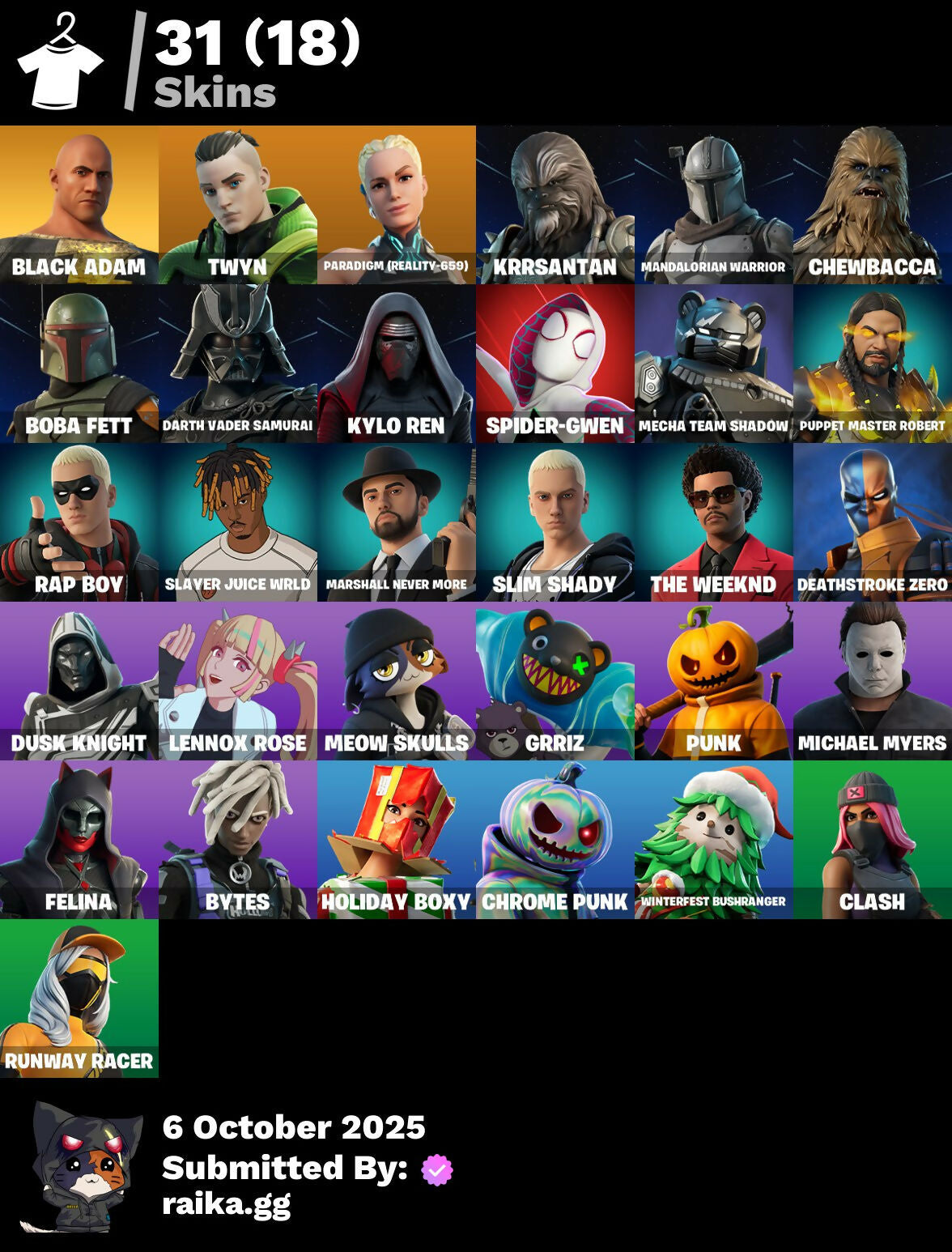 [PC/PSN/XBOX] 31 skins | Black Adam | Twyn | Paradigm (Reality-659) | Krrsantan | Mandalorian Warrior | Chewbacca | Boba Fett | Darth Vader Samurai | 400 VB / FN