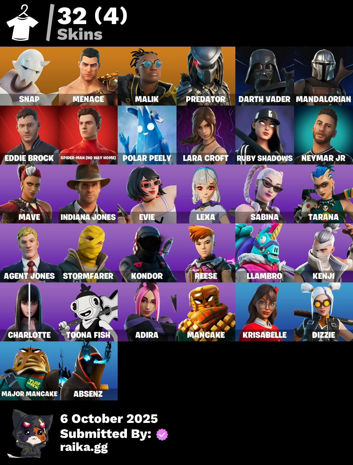 [PC/PSN/XBOX] 32 skins | Snap | Menace | Malik | Predator | Darth Vader | Mandalorian | Eddie Brock | Spider-Man (No Way Home) | Polar Peely | Lara Croft | 150 VB / FN